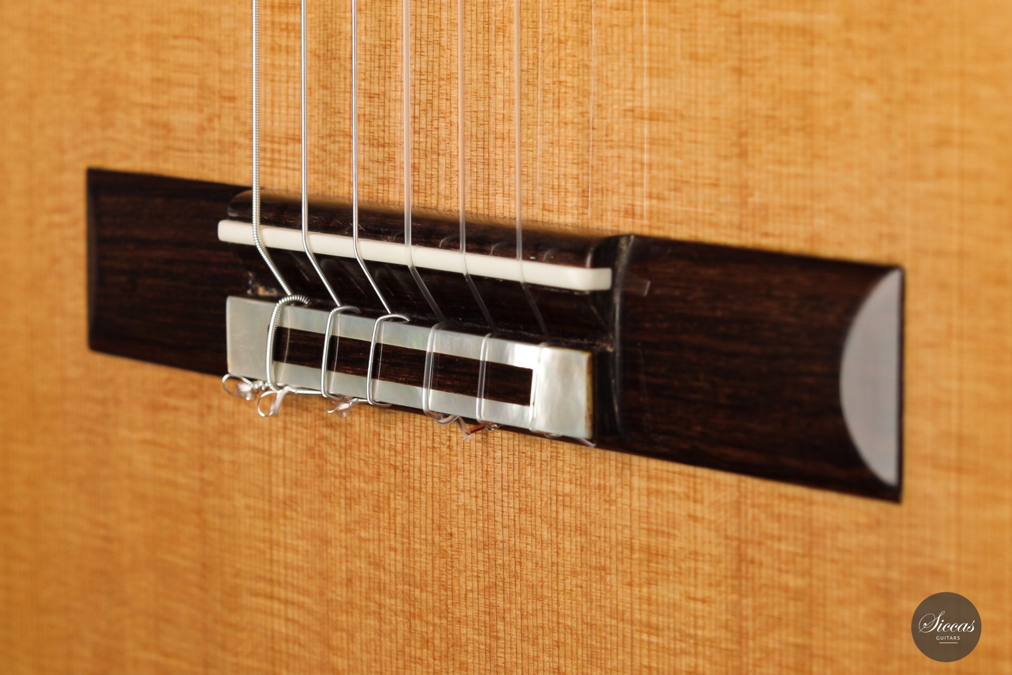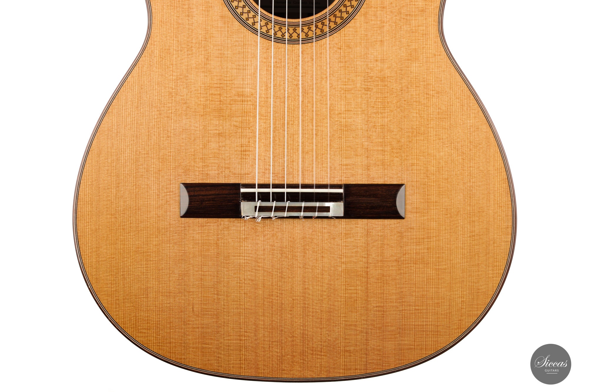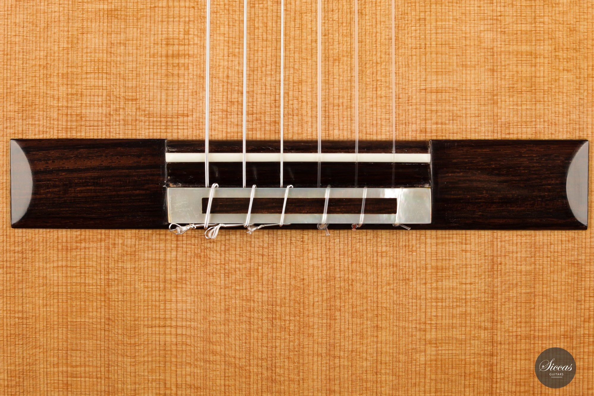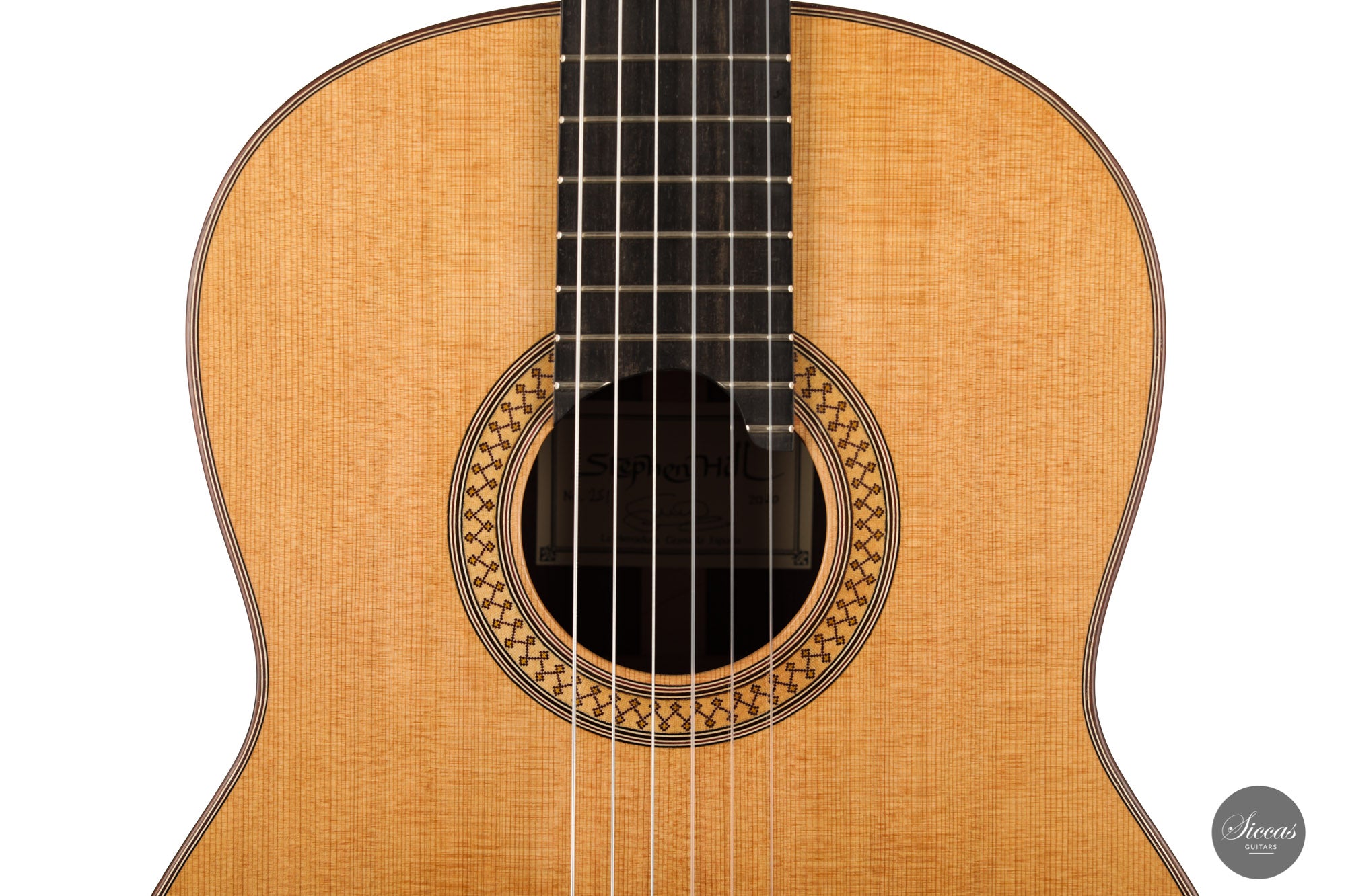Stephen Hill has dedicated most of his career to building traditional guitars, but most recently he has been developing double top instruments, with an amazing sense for this construction method. We are very impressed by the natural-sounding tone of this instrument, which gets an extra boost due to the double top construction, making the guitar sound in the best way imaginable. This model with a cedar top and beautiful Madagascar back and sides is very lightly built. Stephen Hill combines modern construction with Spanish tradition to perfection.