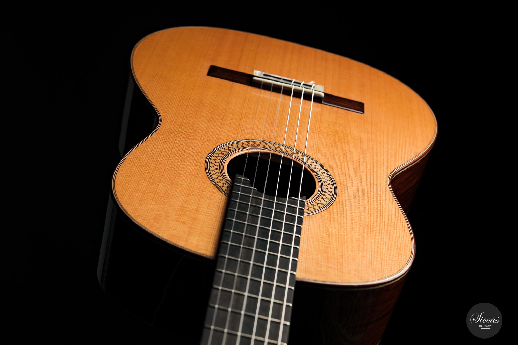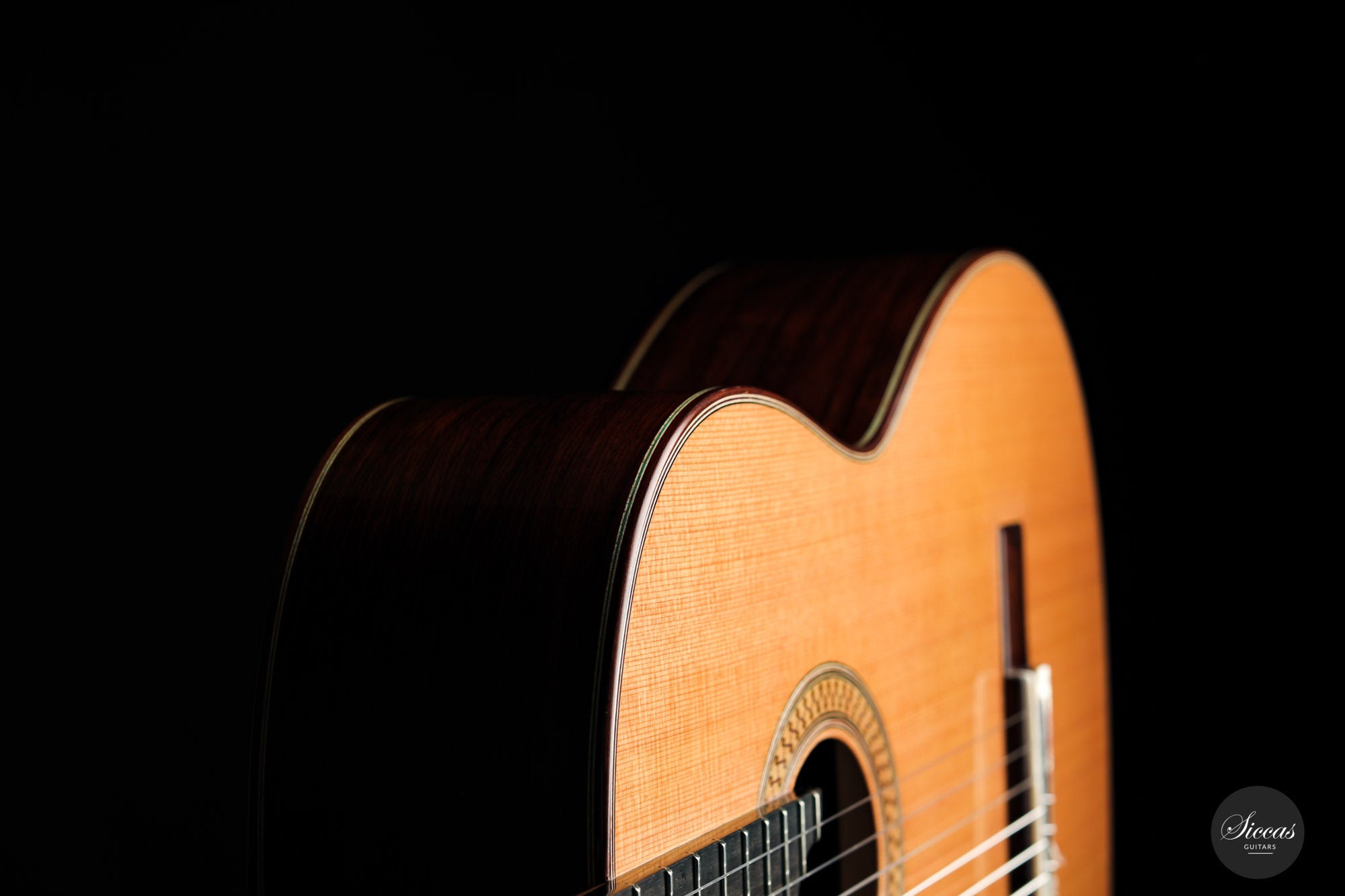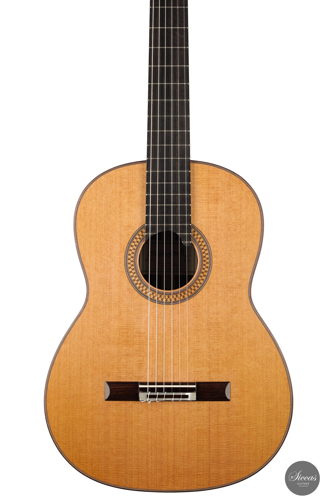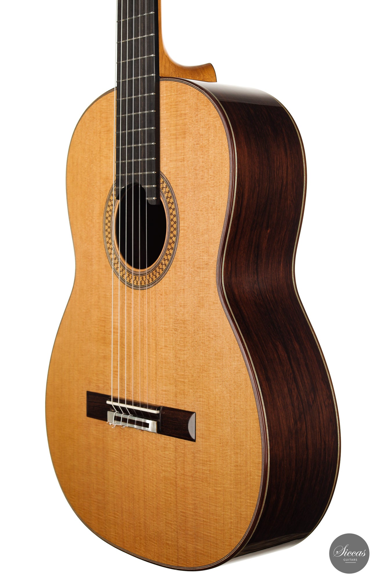Stephen Hill has dedicated most of his career to building traditional guitars, but most recently he has been developing double top instruments, with an amazing sense for this construction method. We are very impressed by the natural-sounding tone of this instrument, which gets an extra boost due to the double top construction, making the guitar sound in the best way imaginable. This model with a cedar top and beautiful Madagascar back and sides is very lightly built. Stephen Hill combines modern construction with Spanish tradition to perfection.