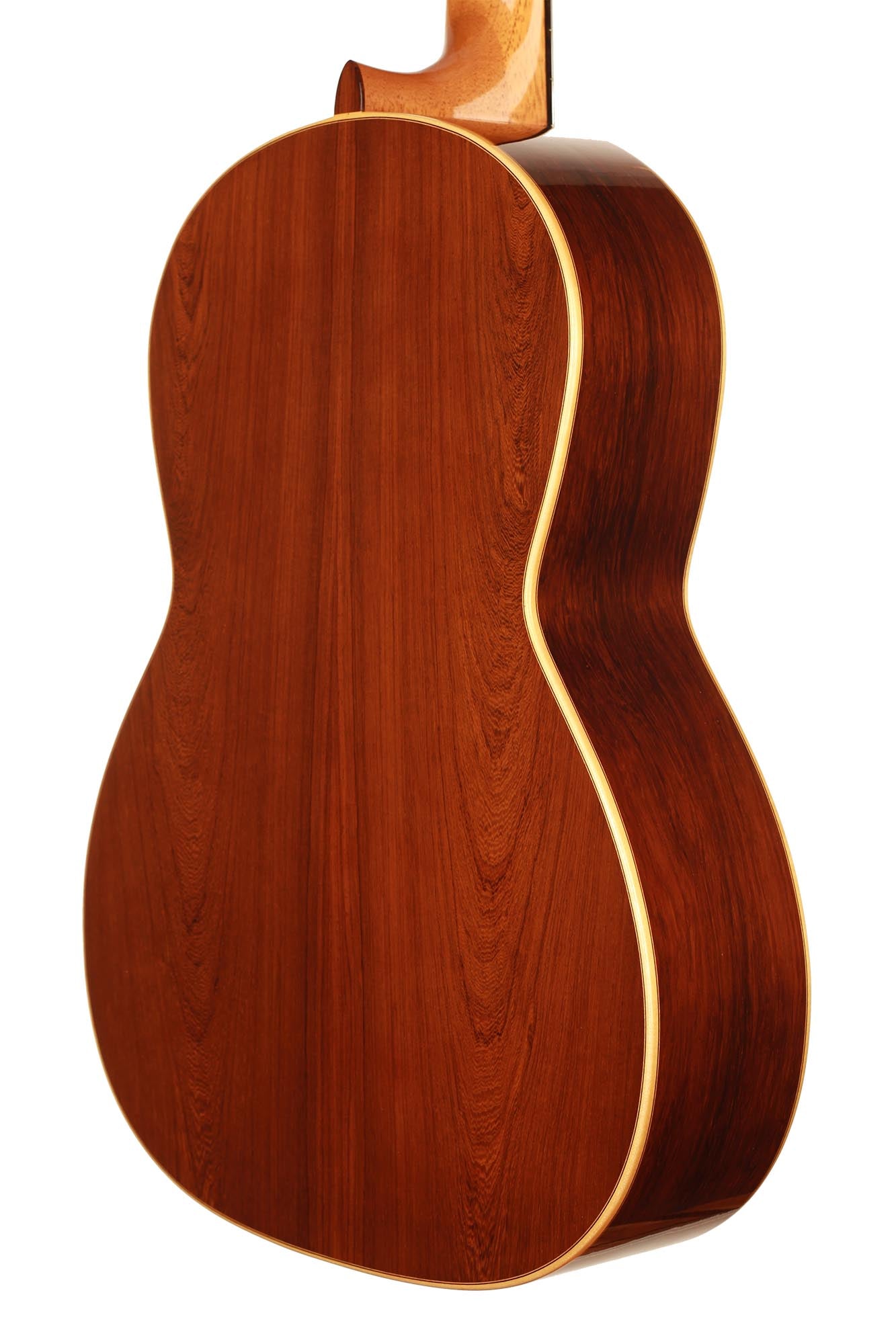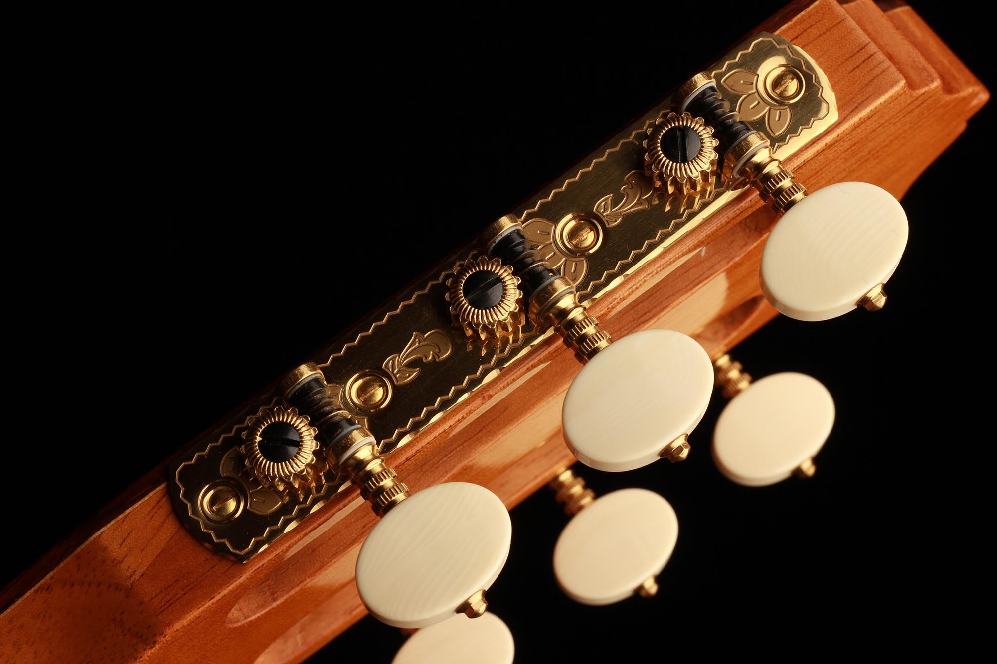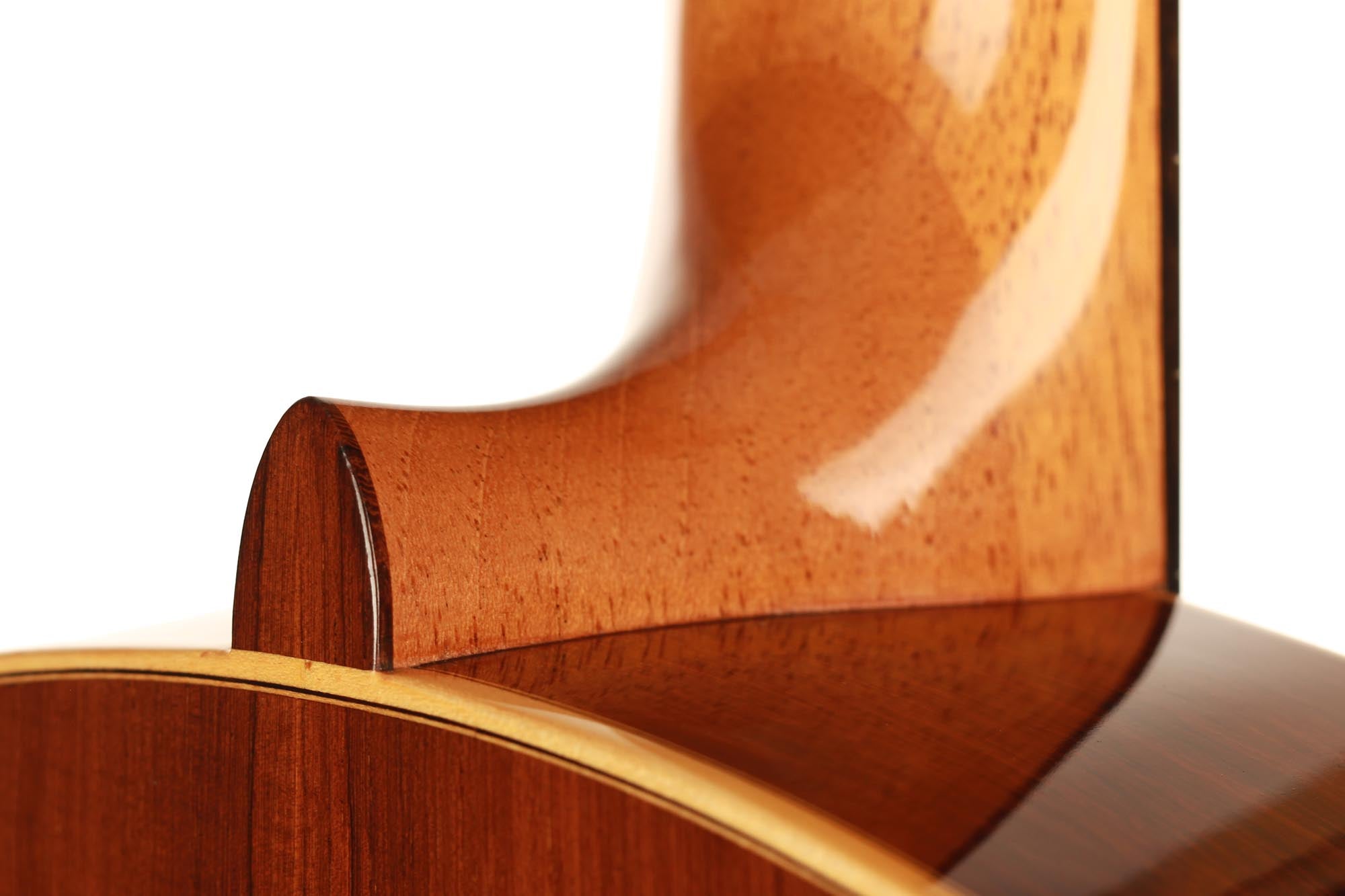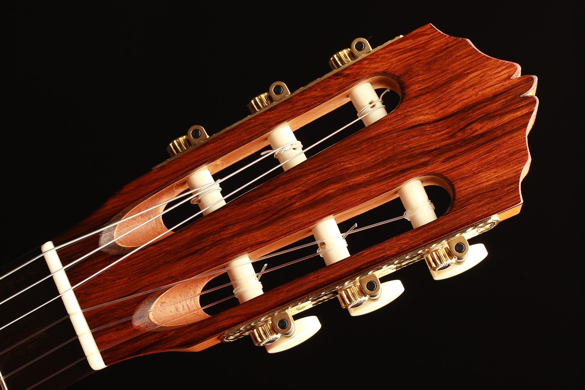 This beautiful guitar has a very traditional Spanish appearance, and one must say that the very mature tone also reminds of the warm singing Spanish guitars of the late nineteenth / early twentieth century. The round sweet trebles are very spontaneous and go very well along with the sustain-full traditional basses. A thinly worked neck as well as a 51,5 mm wide nut enhance the playability of this guitar and make it both a very comfortable and generously sounding instrument.