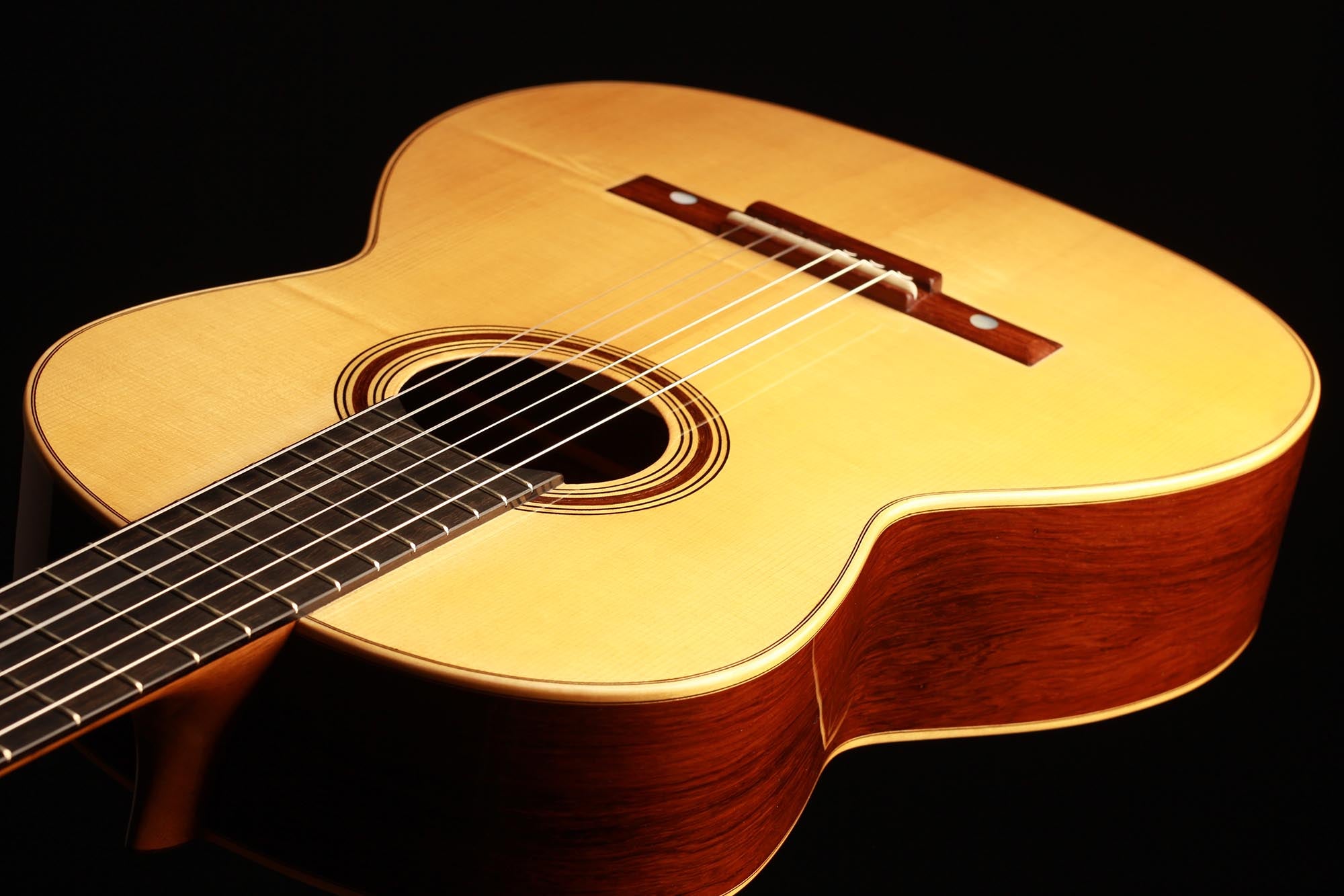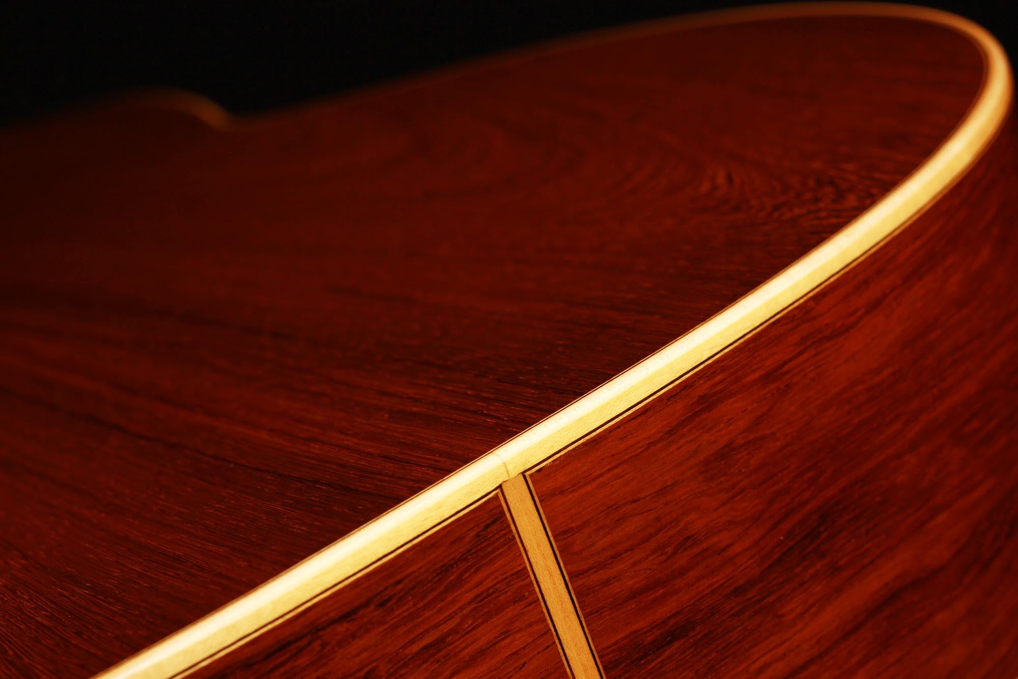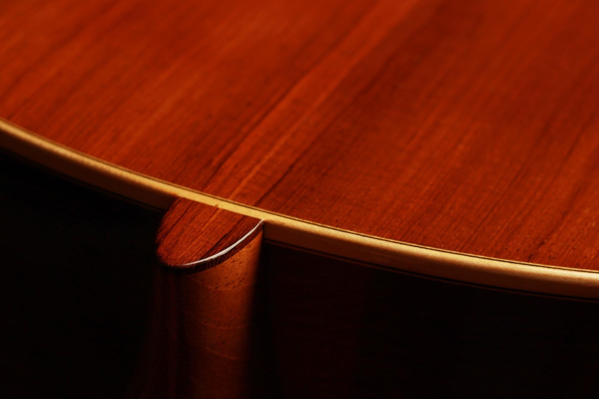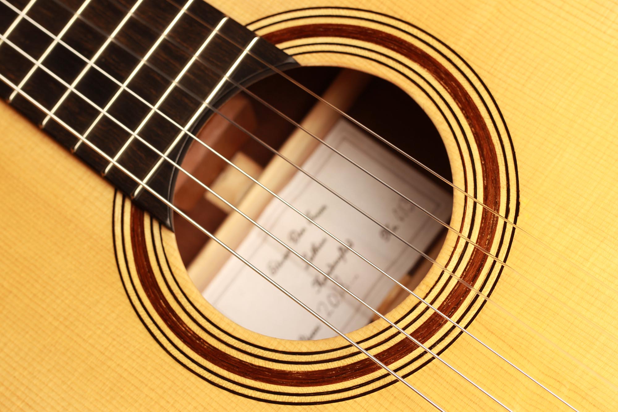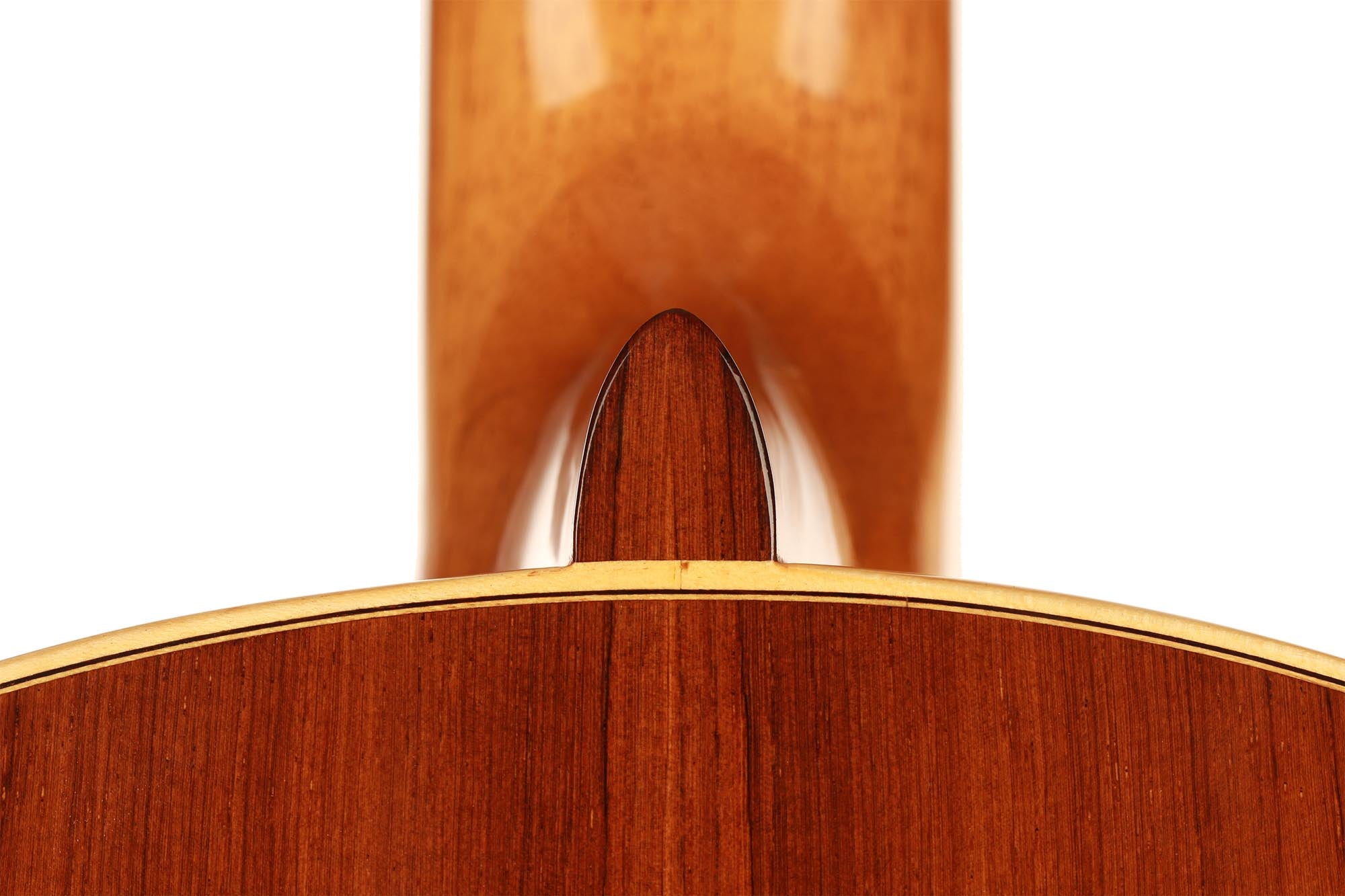 This beautiful guitar has a very traditional Spanish appearance, and one must say that the very mature tone also reminds of the warm singing Spanish guitars of the late nineteenth / early twentieth century. The round sweet trebles are very spontaneous and go very well along with the sustain-full traditional basses. A thinly worked neck as well as a 51,5 mm wide nut enhance the playability of this guitar and make it both a very comfortable and generously sounding instrument.
