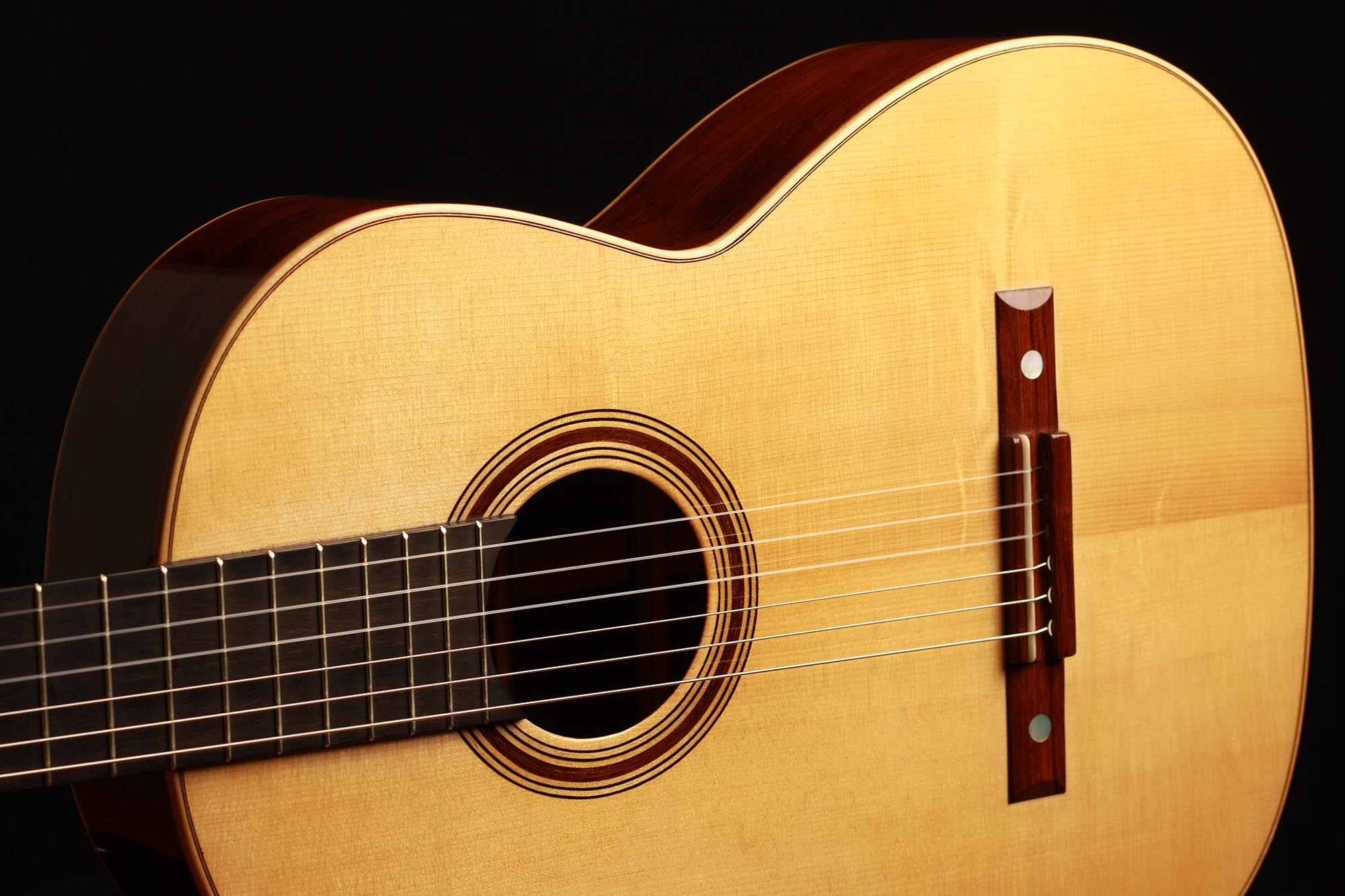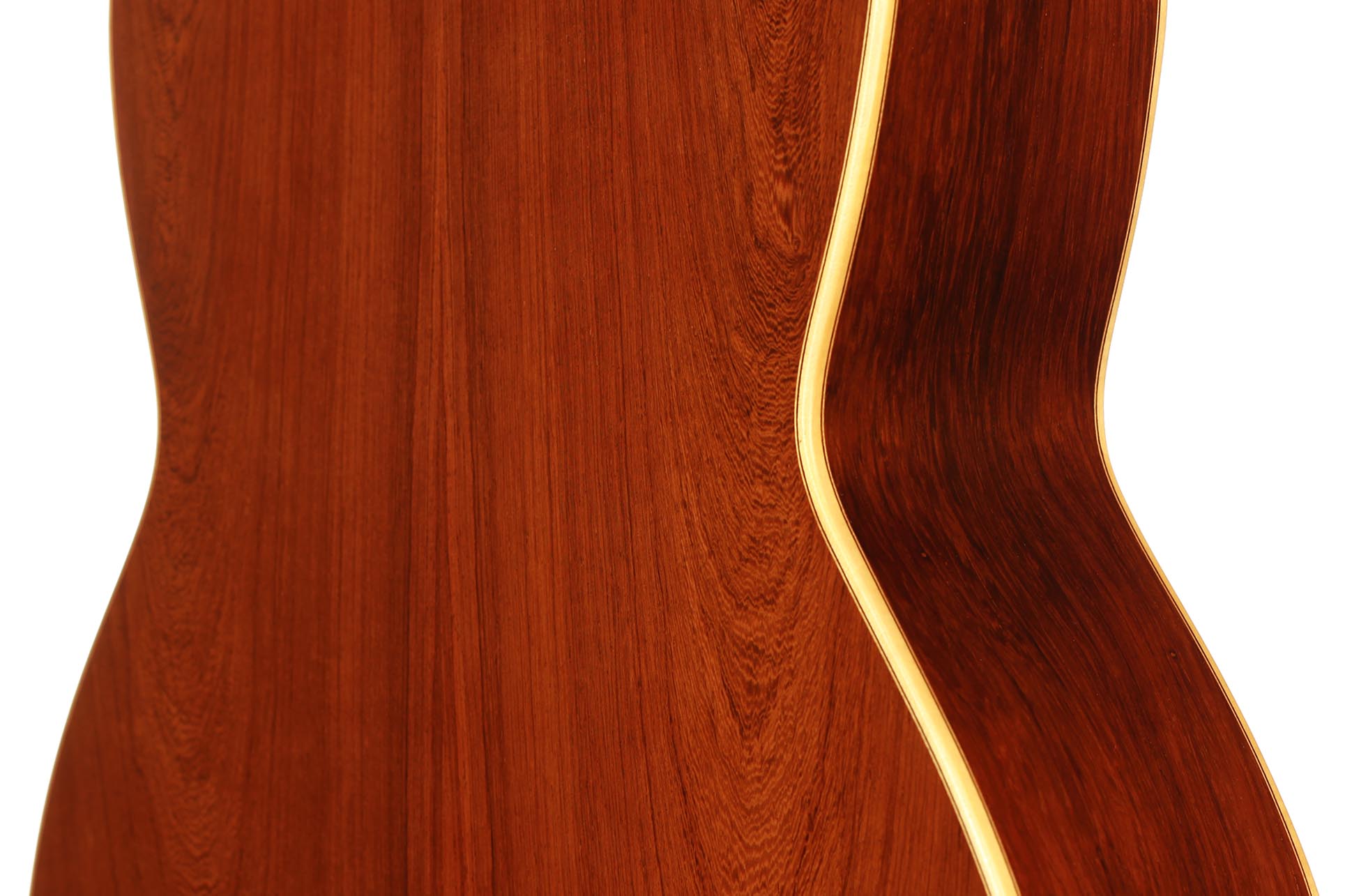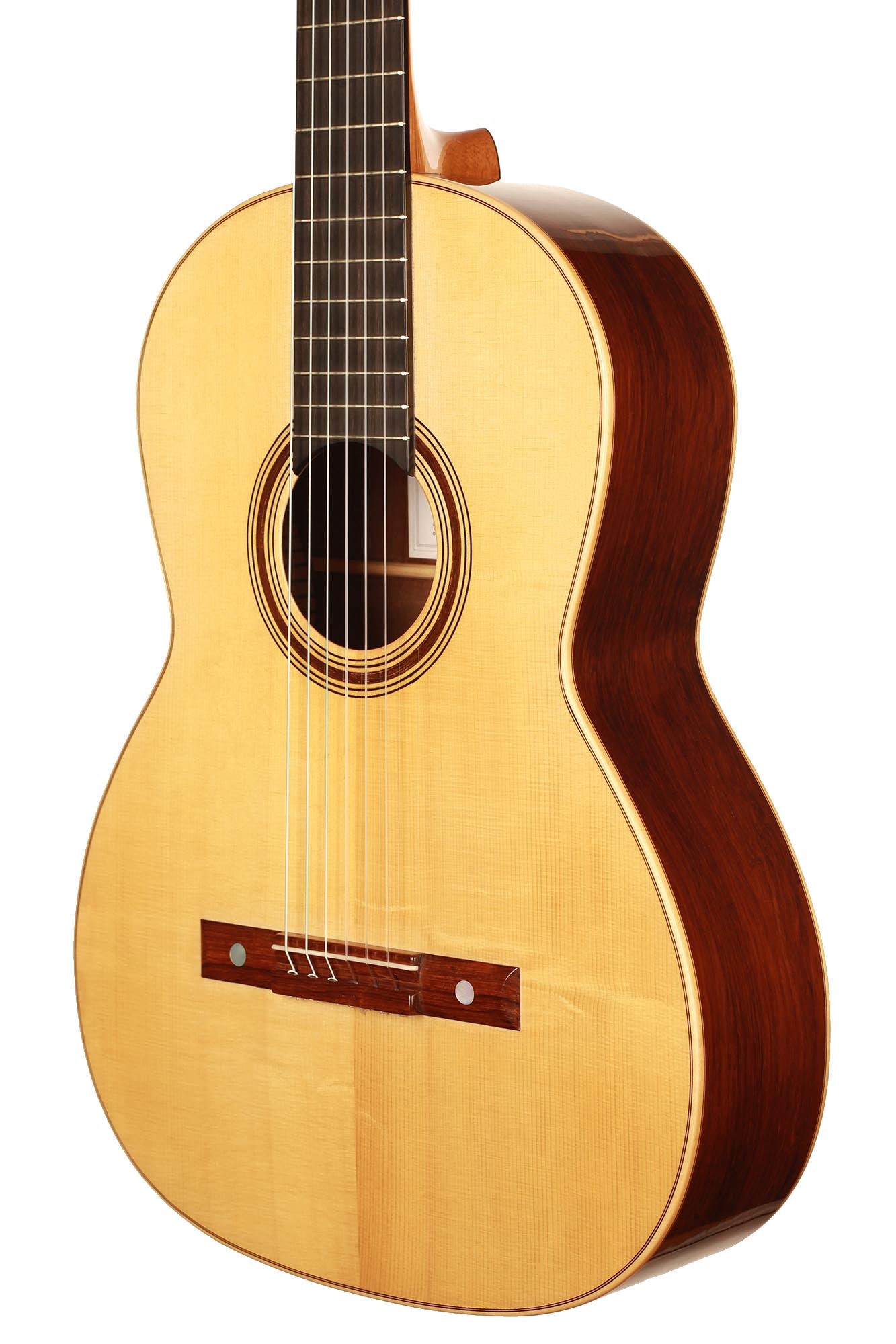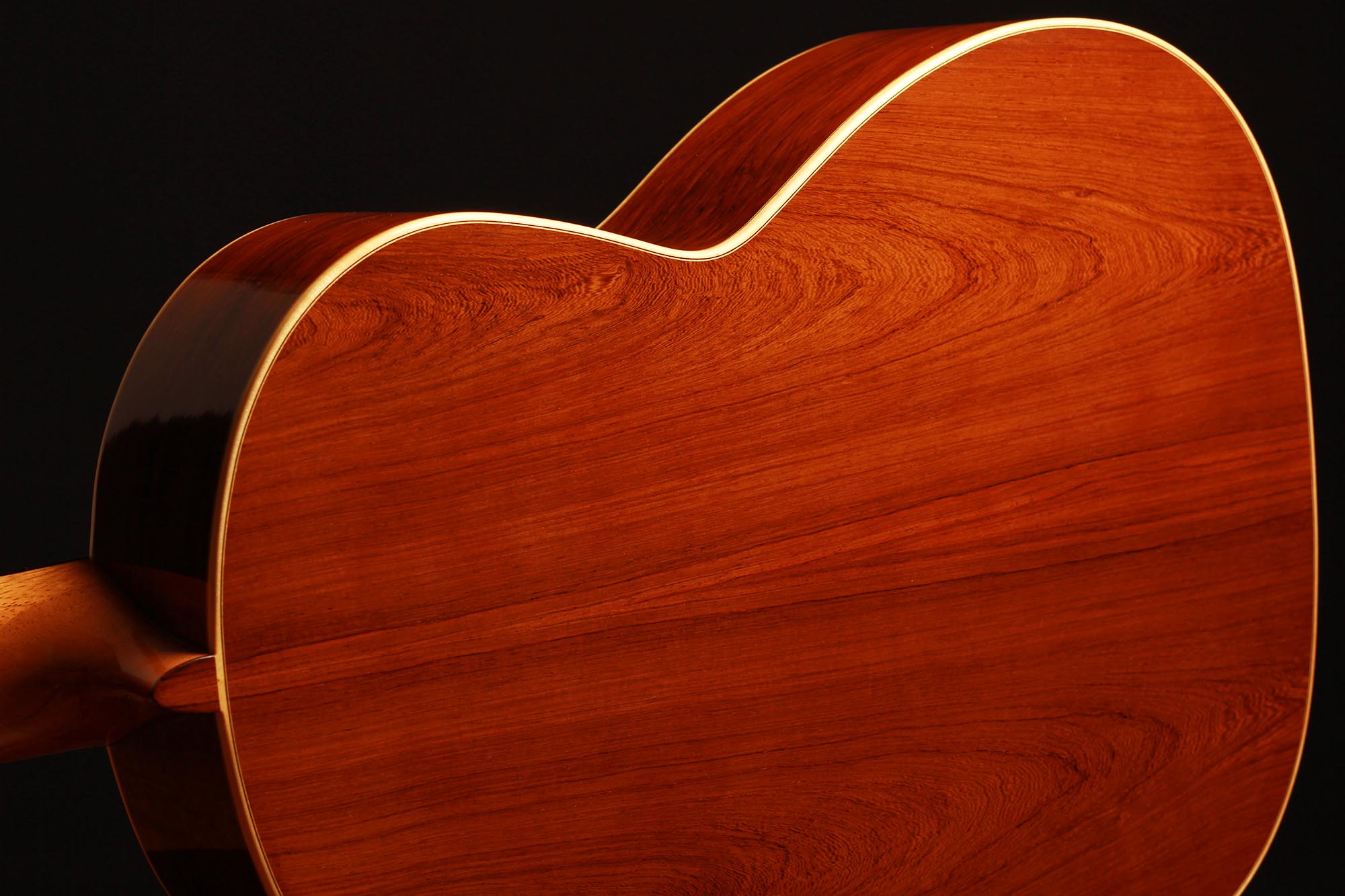 This beautiful guitar has a very traditional Spanish appearance, and one must say that the very mature tone also reminds of the warm singing Spanish guitars of the late nineteenth / early twentieth century. The round sweet trebles are very spontaneous and go very well along with the sustain-full traditional basses. A thinly worked neck as well as a 51,5 mm wide nut enhance the playability of this guitar and make it both a very comfortable and generously sounding instrument.