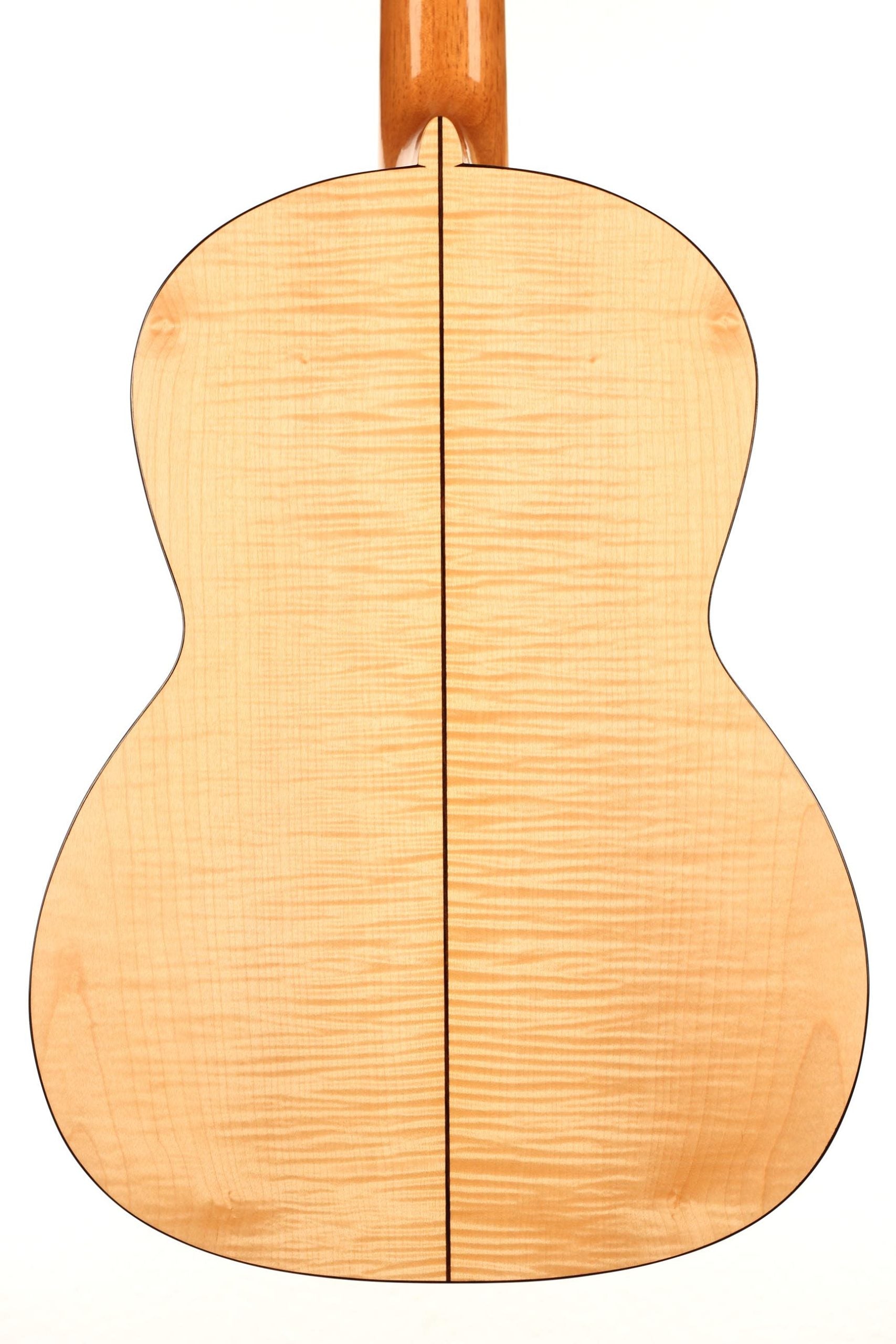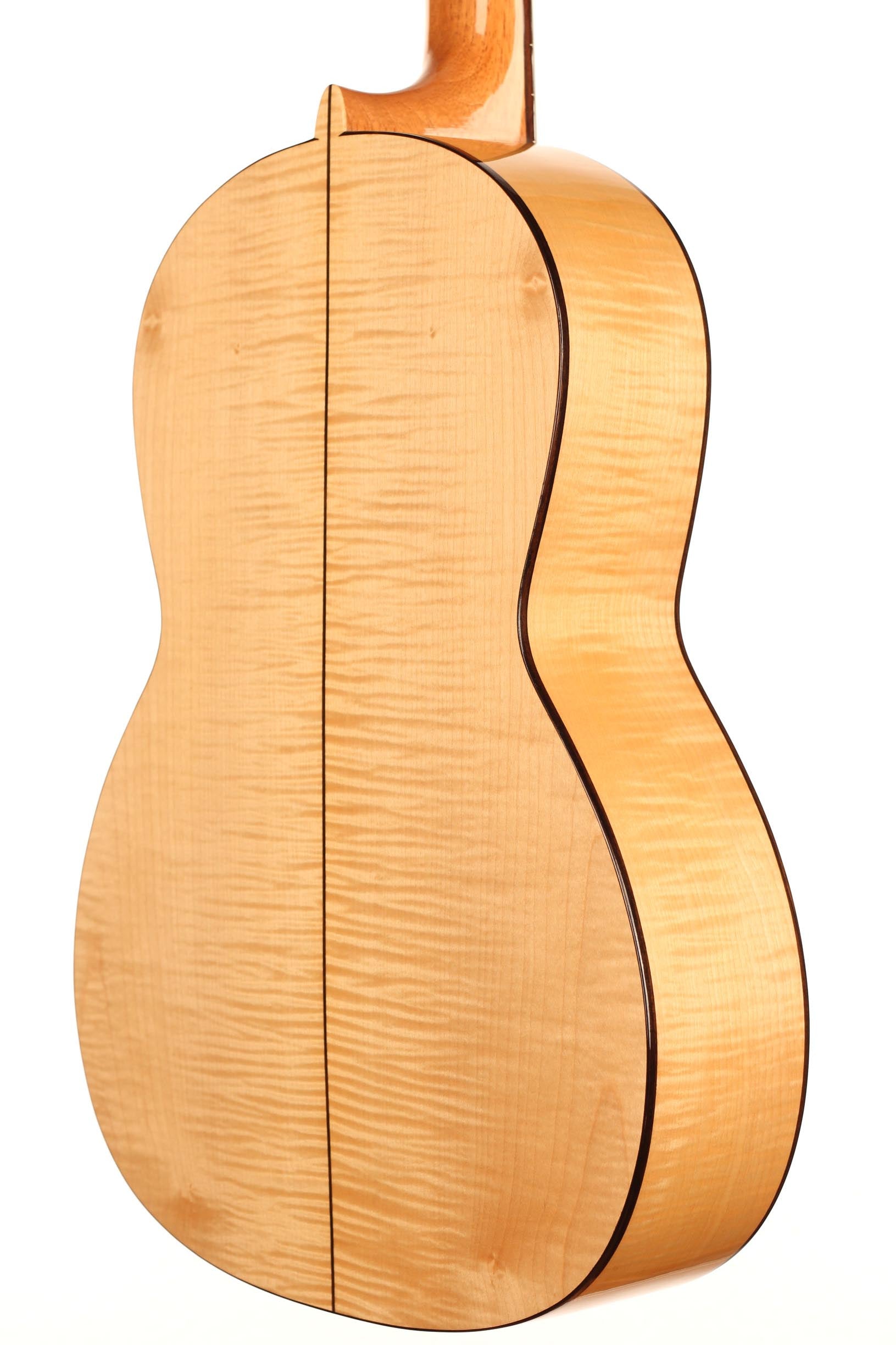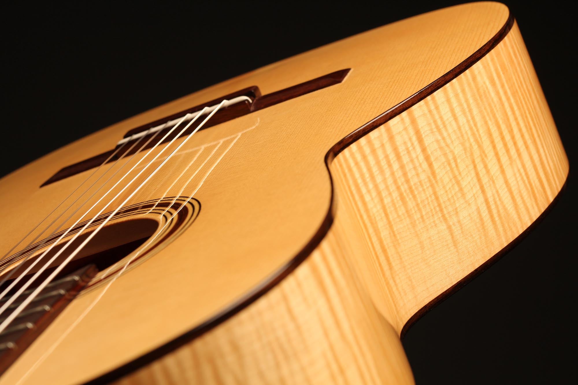 This refined and delicate maple guitar is built incredibly light. It is amazingly sensitive and has an immediate response. Built on a slightly smaller plantilla, this guitar has a 50 mm nut width, what makes it easy and lovely to play. Finally, the thin maple back and sides bring something authentic and true to the timbre as well as some beautiful tone colours.