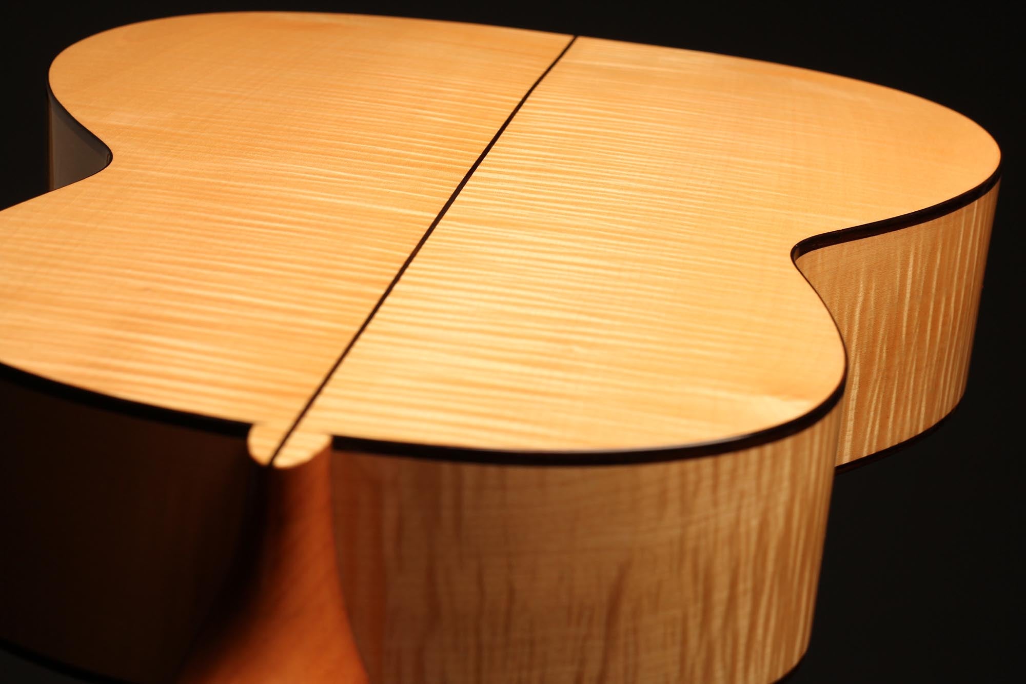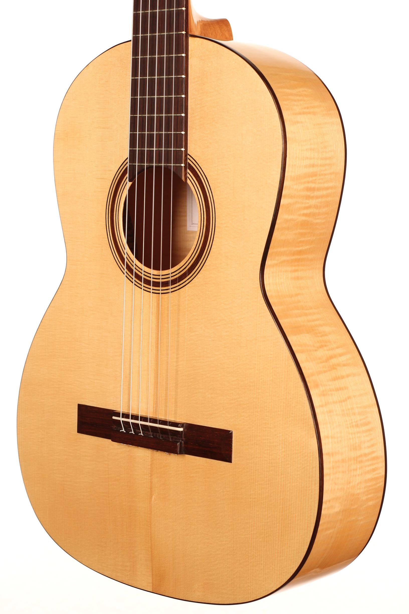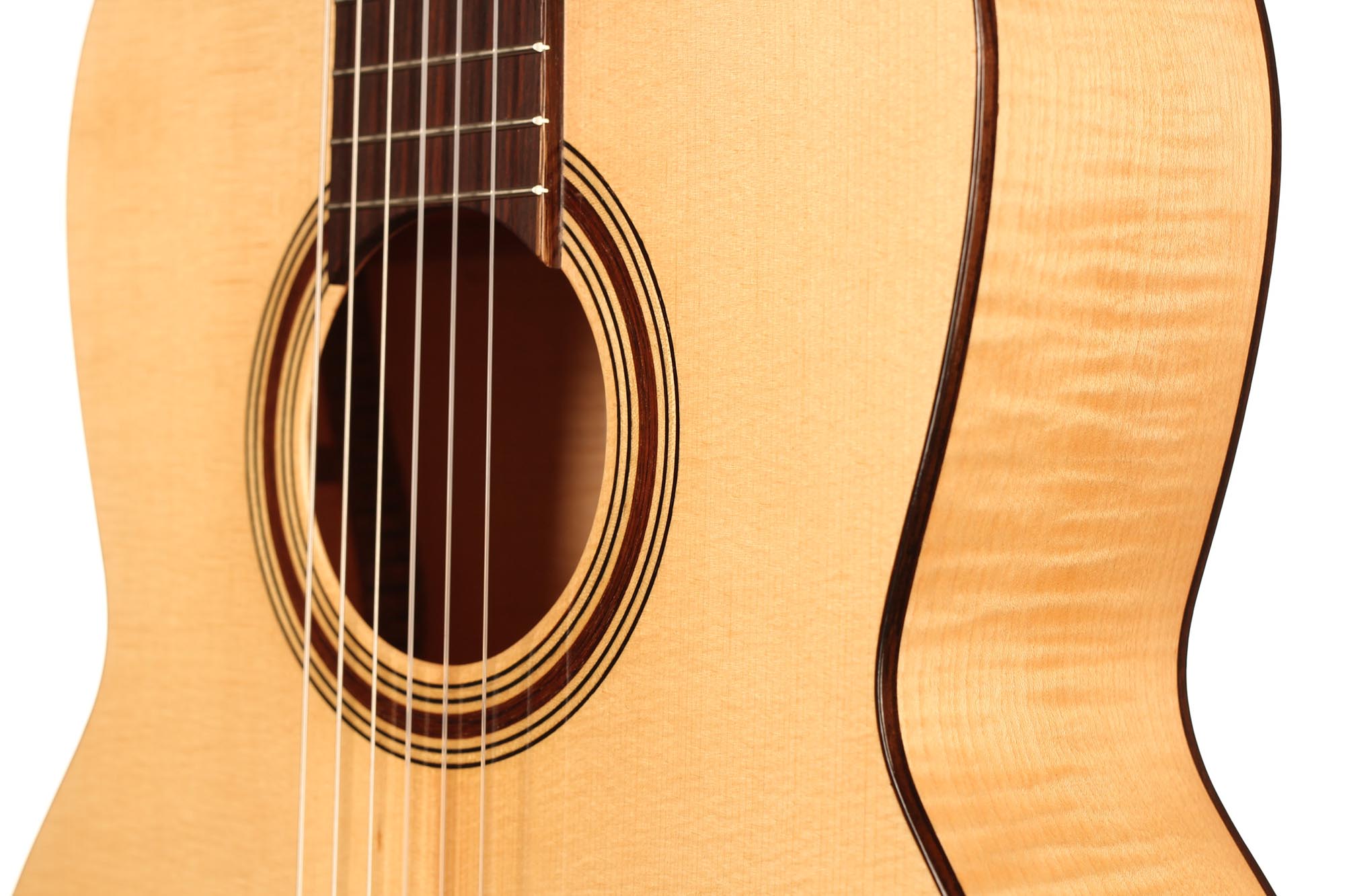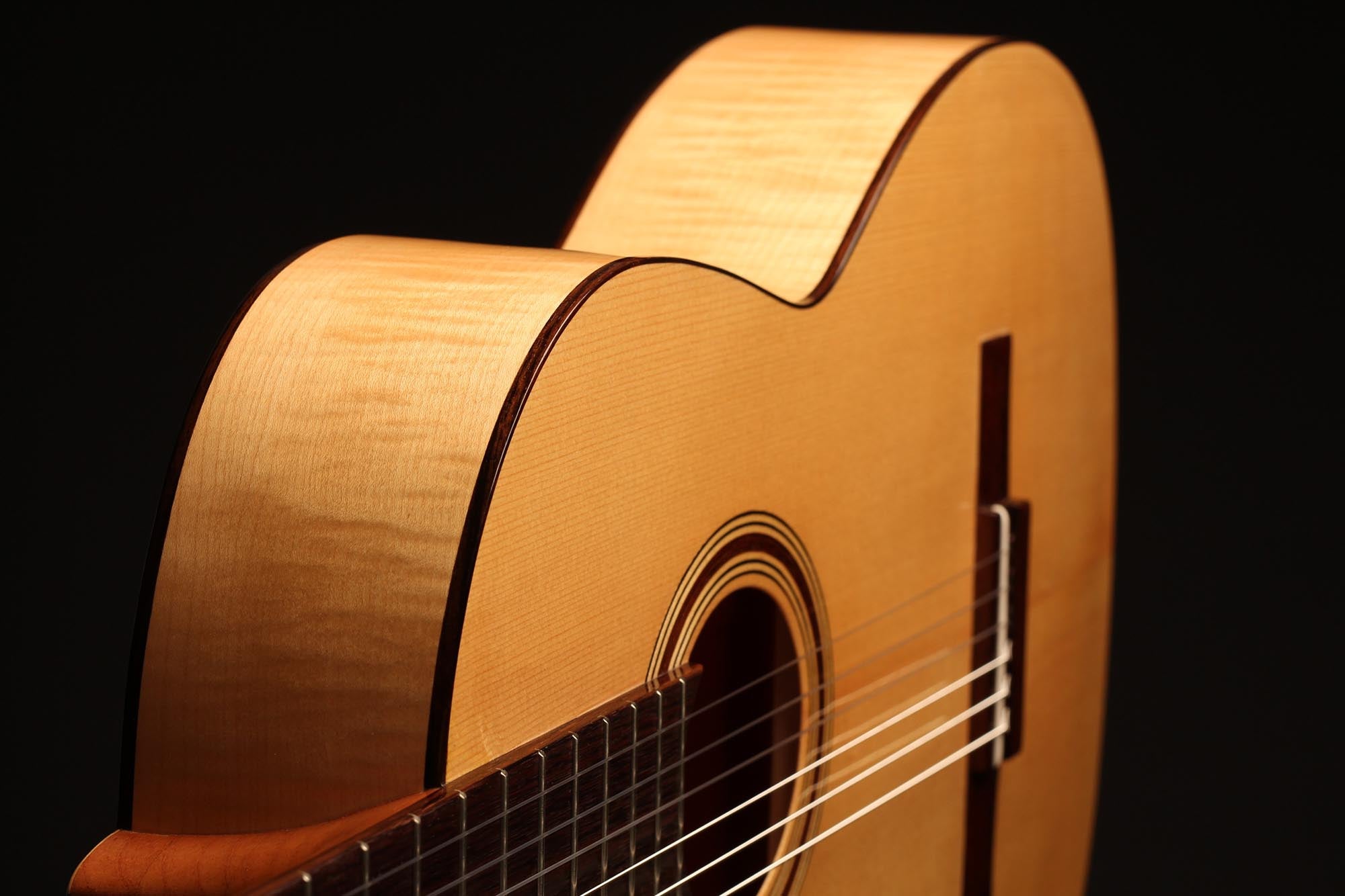This refined and delicate maple guitar is built incredibly light. It is amazingly sensitive and has an immediate response. Built on a slightly smaller plantilla, this guitar has a 50 mm nut width, what makes it easy and lovely to play. Finally, the thin maple back and sides bring something authentic and true to the timbre as well as some beautiful tone colours.