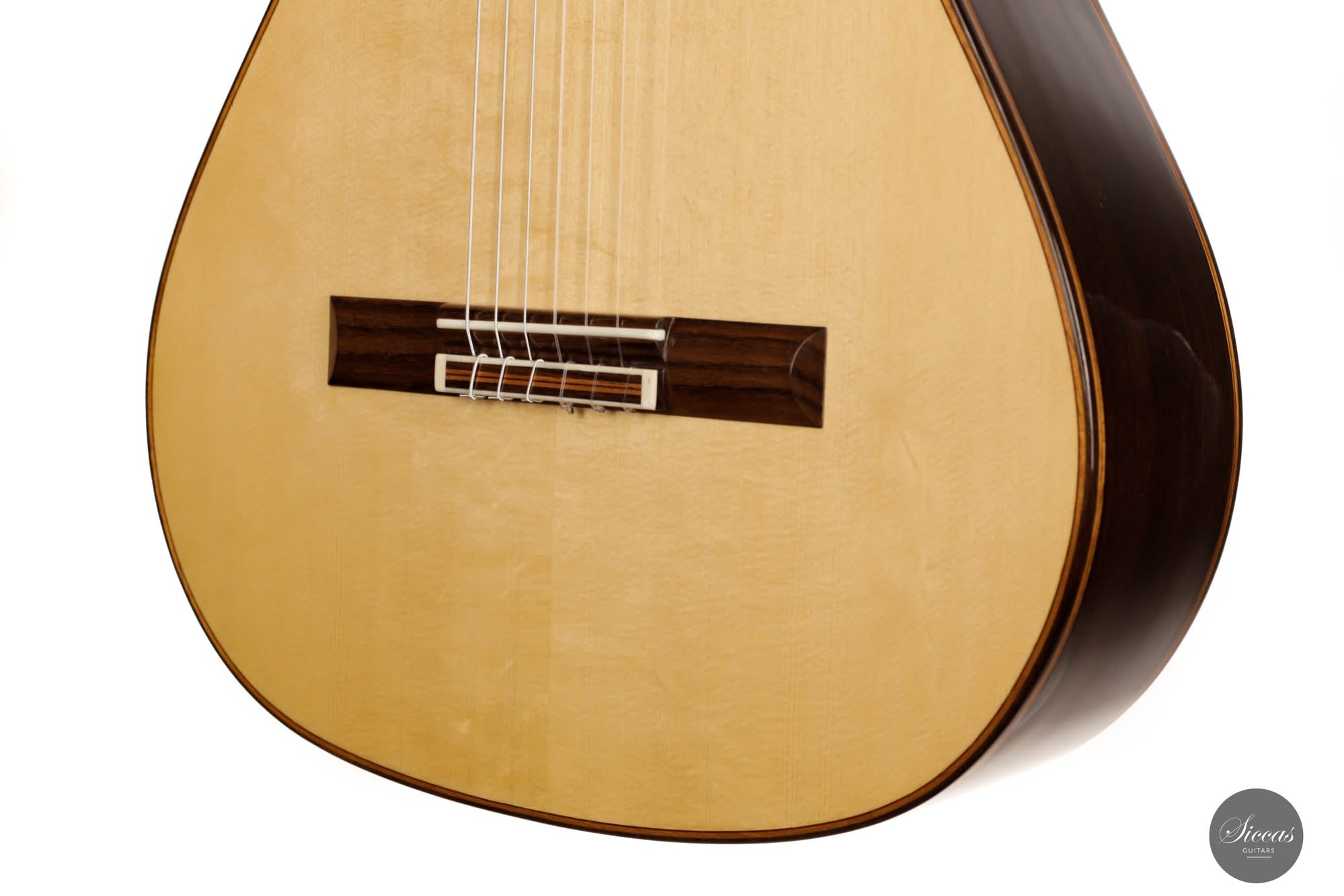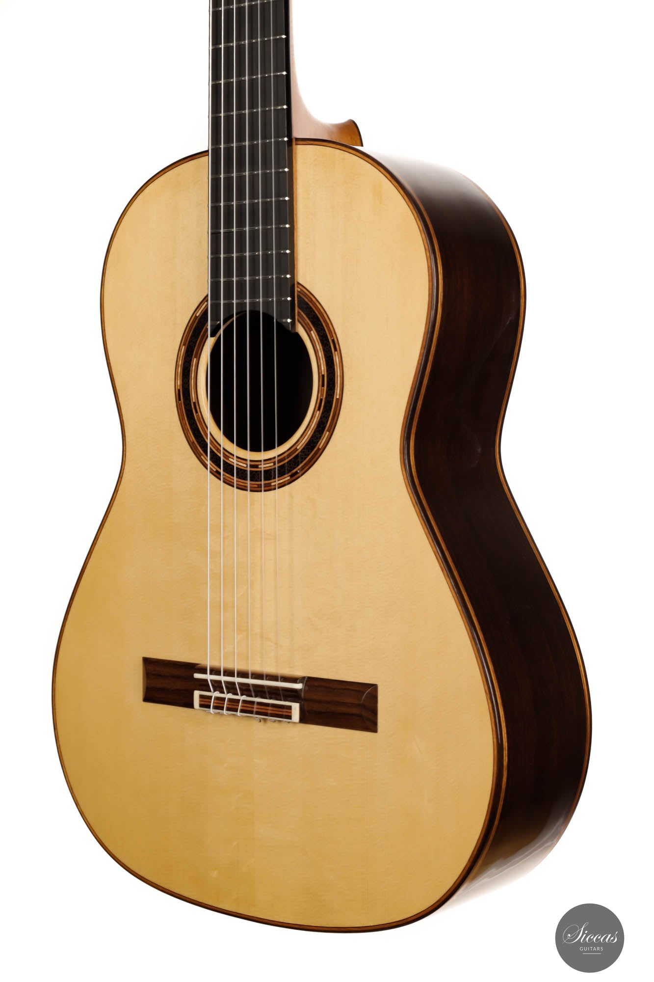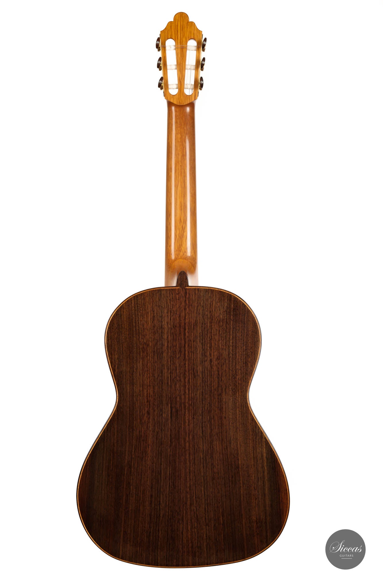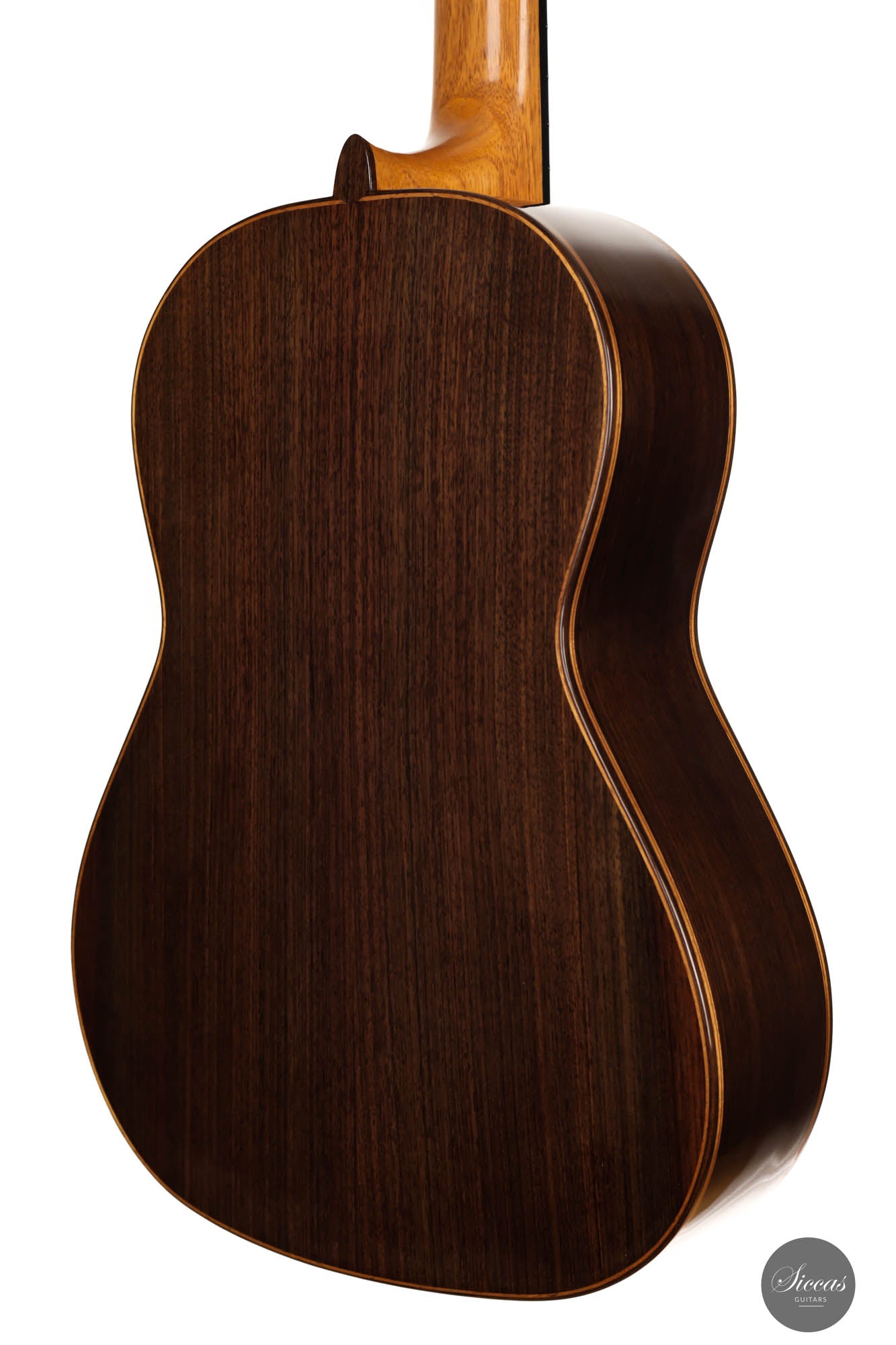 This fine instrument has a spruce soundboard and Indian rosewood back and sides that express warmth and balance in its acoustic properties. Although this guitar has modern features, such as an elevated fingerboard to improve its playability, it still maintains the art of traditional Spanish guitar-making at its finest. This instrument shows firm, thick basses matched with bright and glossy trebles with a lot of alluring sustain. Also, the coherence between the voices is in perfect balance. This guitar is highly responsive, with enough power for all kinds of concert situations, and quite vigorous without being overpowering. Considering all aspects of this instrument, it is a true bargain for the player who looks not only for the impeccable sound, but also the pure beauty of exquisite craftsmanship, or in this case, craftswomanship.