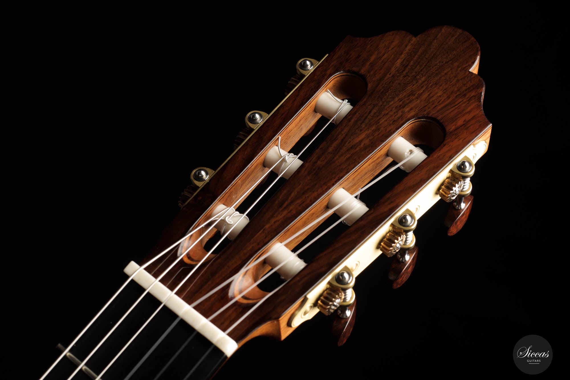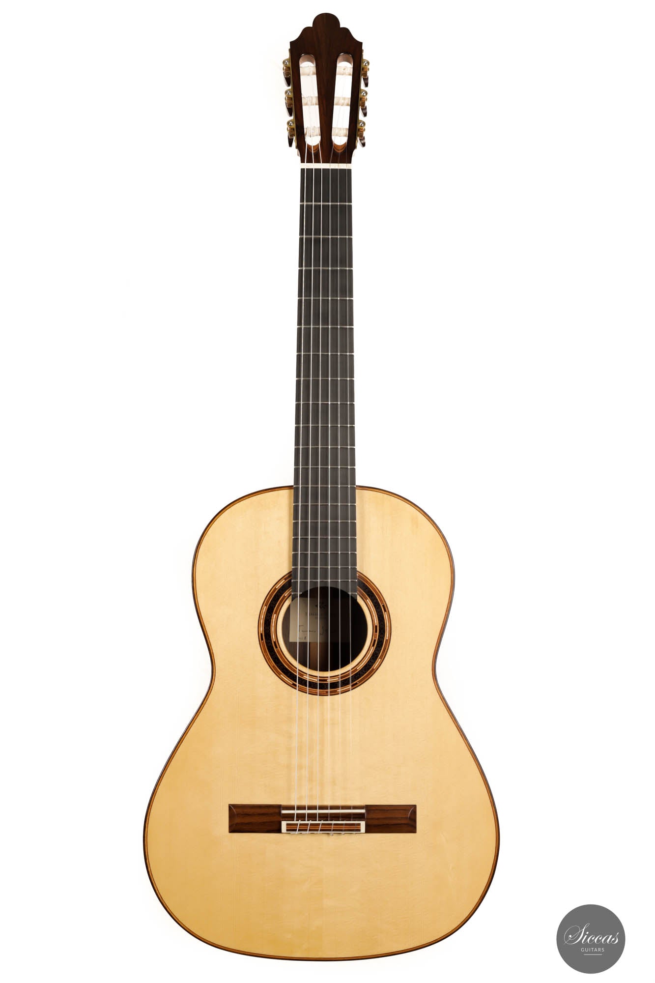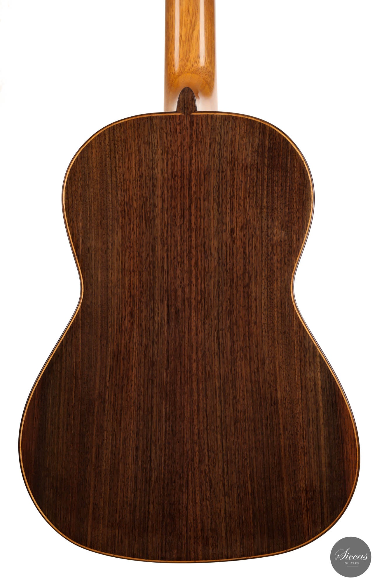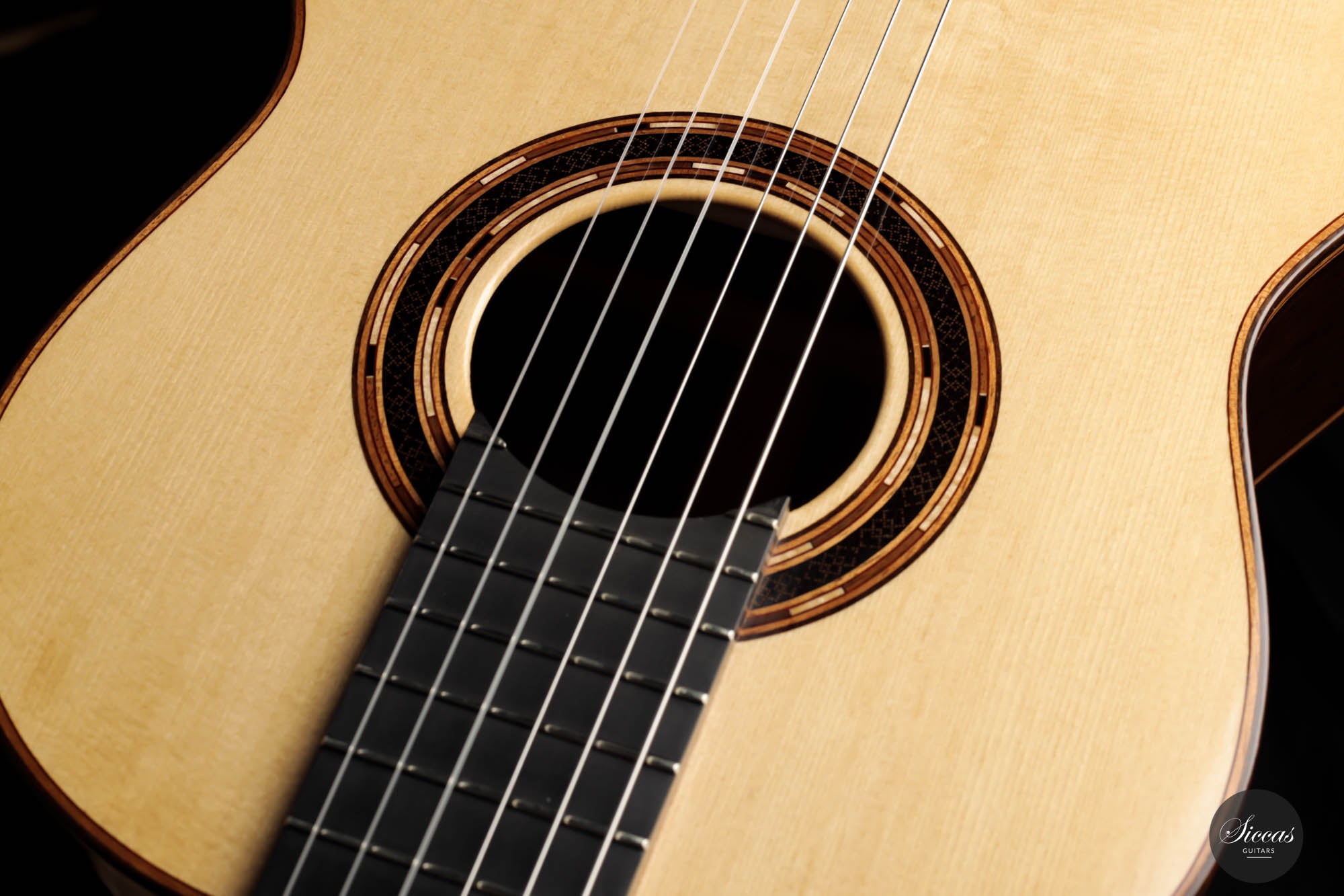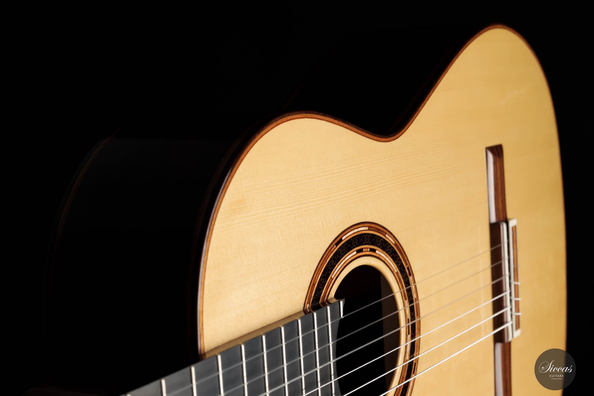 This fine instrument has a spruce soundboard and Indian rosewood back and sides that express warmth and balance in its acoustic properties. Although this guitar has modern features, such as an elevated fingerboard to improve its playability, it still maintains the art of traditional Spanish guitar-making at its finest. This instrument shows firm, thick basses matched with bright and glossy trebles with a lot of alluring sustain. Also, the coherence between the voices is in perfect balance. This guitar is highly responsive, with enough power for all kinds of concert situations, and quite vigorous without being overpowering. Considering all aspects of this instrument, it is a true bargain for the player who looks not only for the impeccable sound, but also the pure beauty of exquisite craftsmanship, or in this case, craftswomanship.