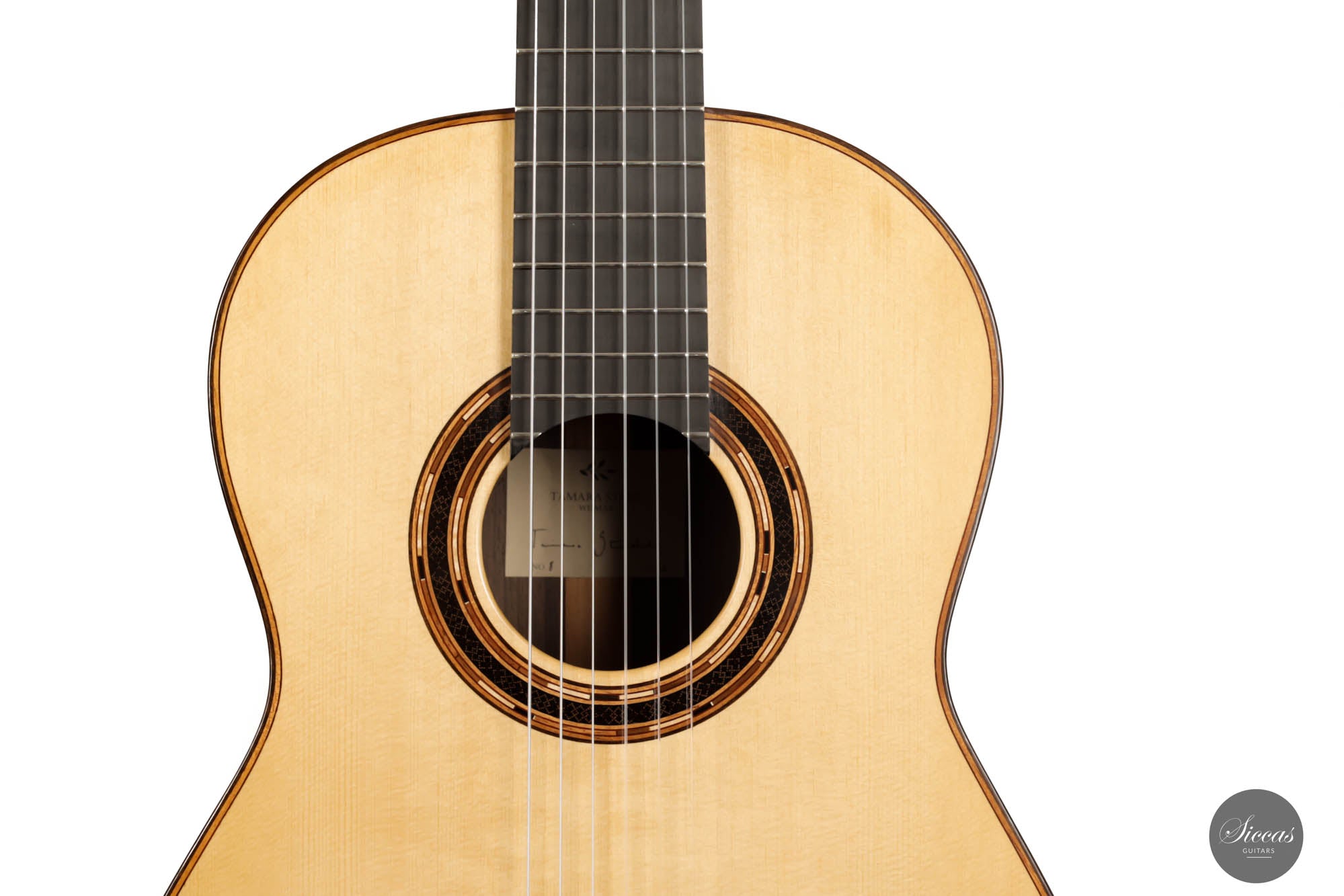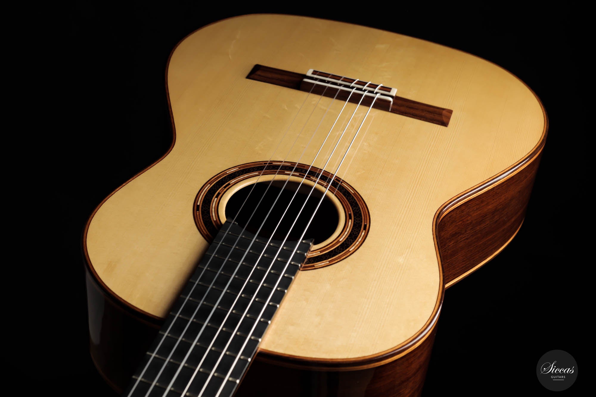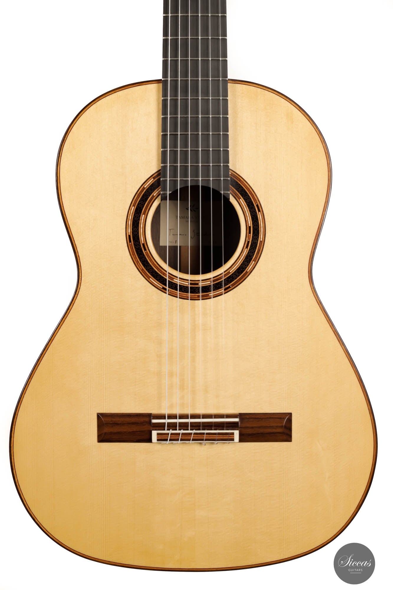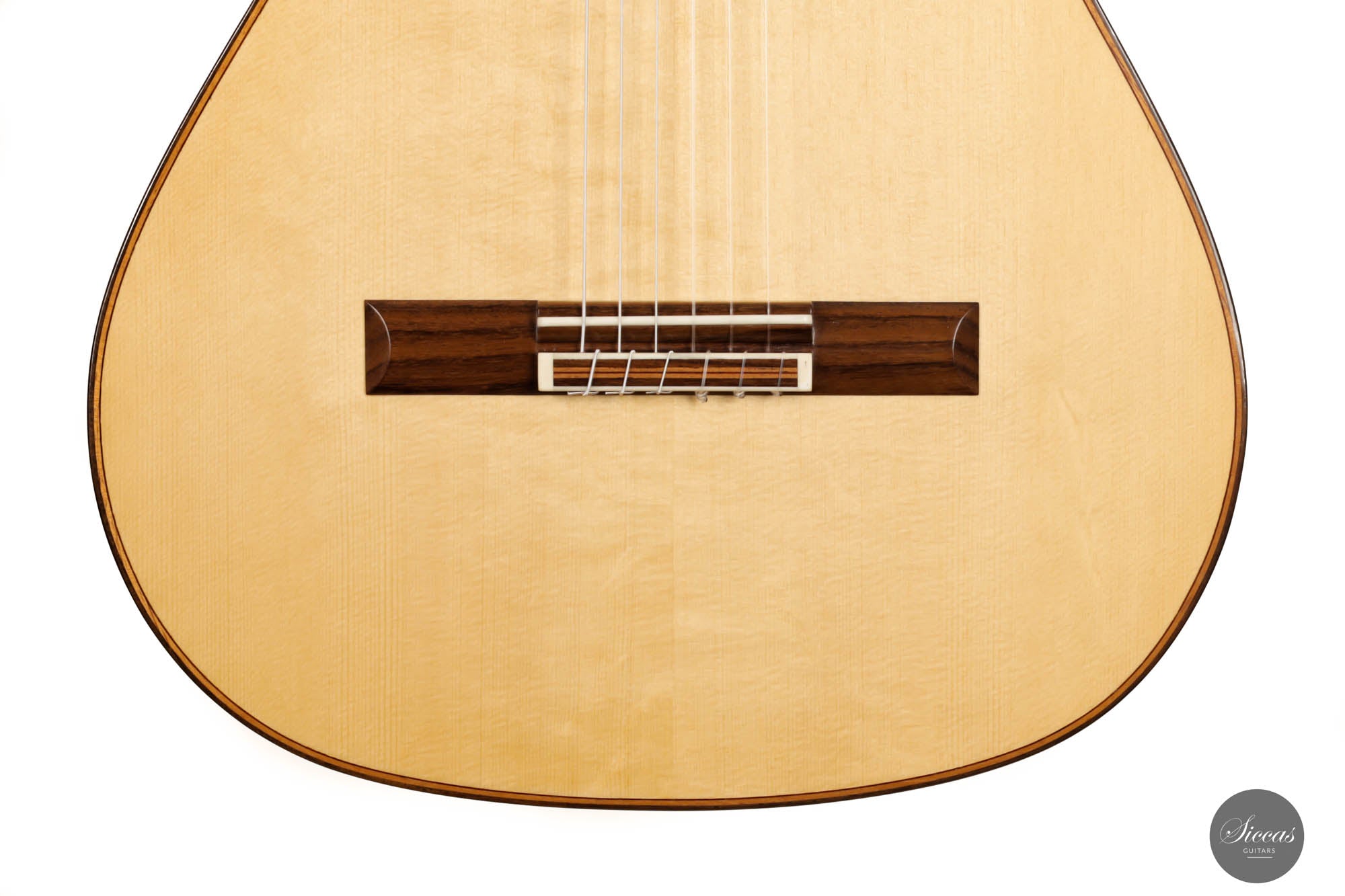 This fine instrument has a spruce soundboard and Indian rosewood back and sides that express warmth and balance in its acoustic properties. Although this guitar has modern features, such as an elevated fingerboard to improve its playability, it still maintains the art of traditional Spanish guitar-making at its finest. This instrument shows firm, thick basses matched with bright and glossy trebles with a lot of alluring sustain. Also, the coherence between the voices is in perfect balance. This guitar is highly responsive, with enough power for all kinds of concert situations, and quite vigorous without being overpowering. Considering all aspects of this instrument, it is a true bargain for the player who looks not only for the impeccable sound, but also the pure beauty of exquisite craftsmanship, or in this case, craftswomanship.