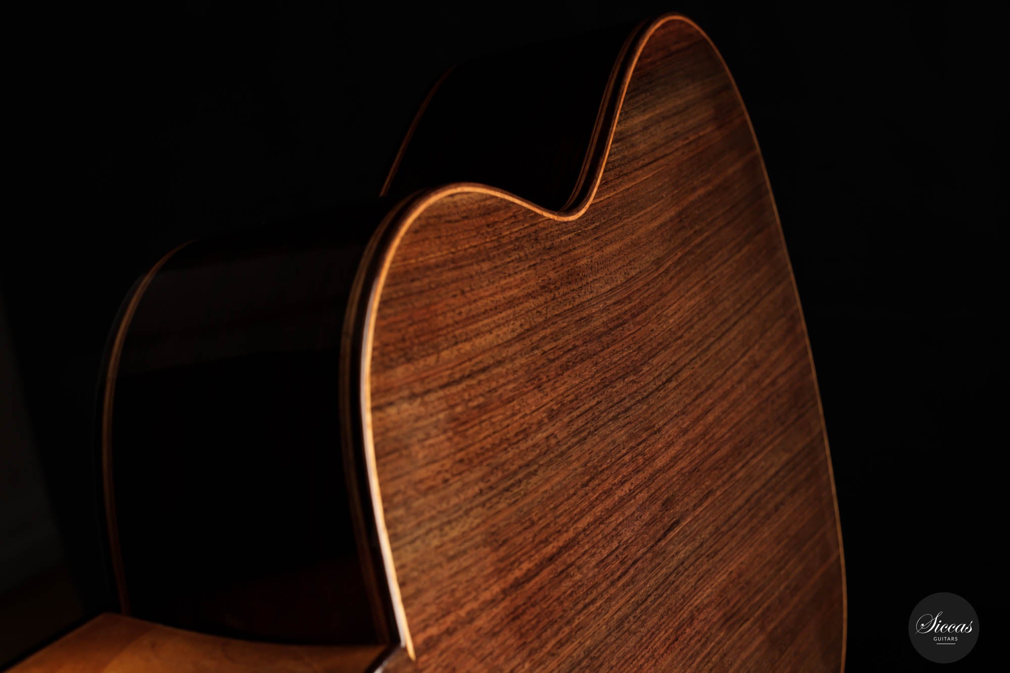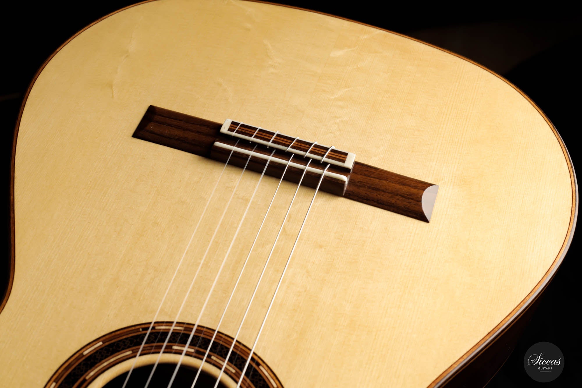 "To give the guitar power and sustain, I decided not to make the top and back too delicate. By adding a slightly heavier bridge, the top does not lose its ability to vibrate, resulting in a singing, powerful sound. Meanwhile, the neck is reinforced by an ebony strip."