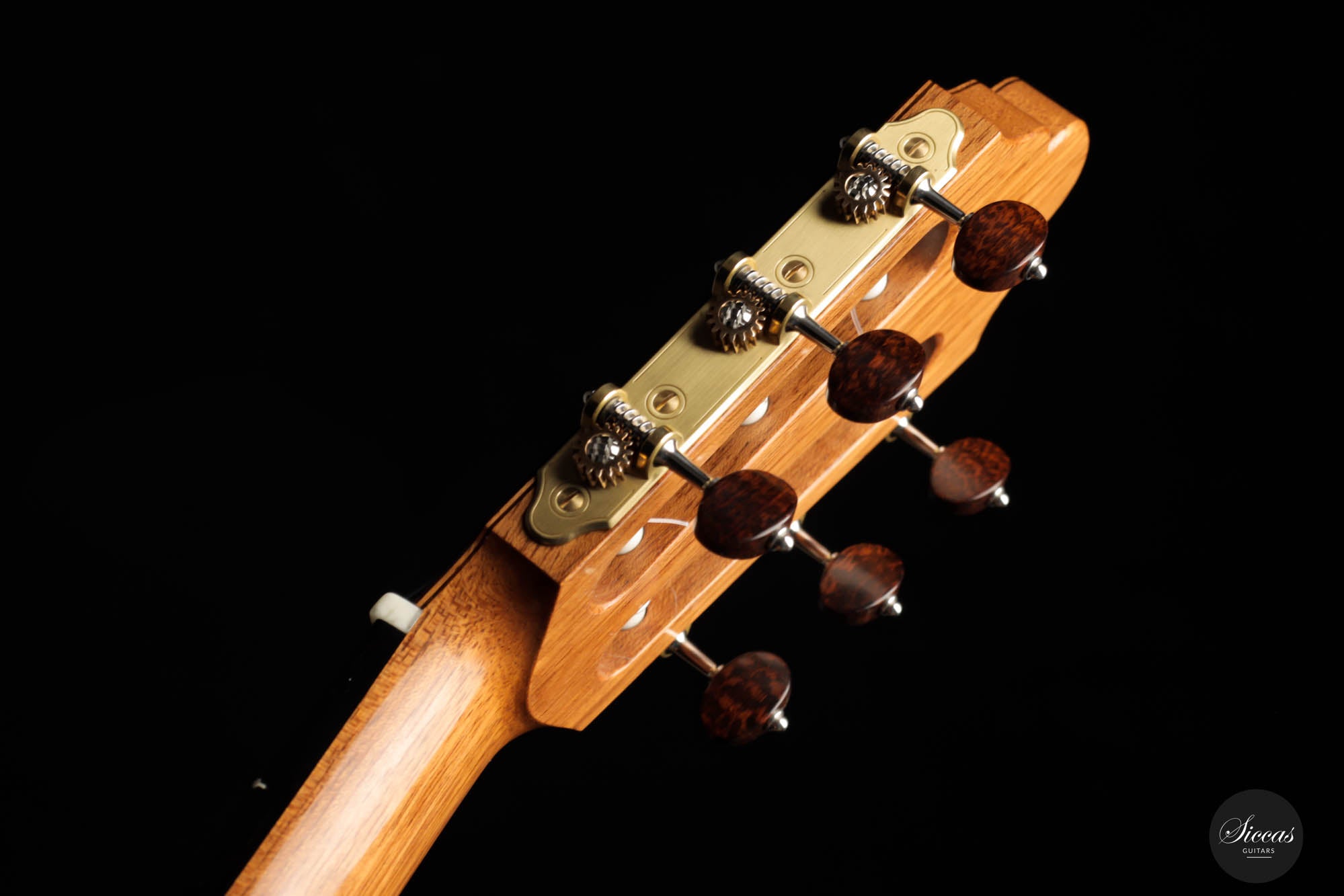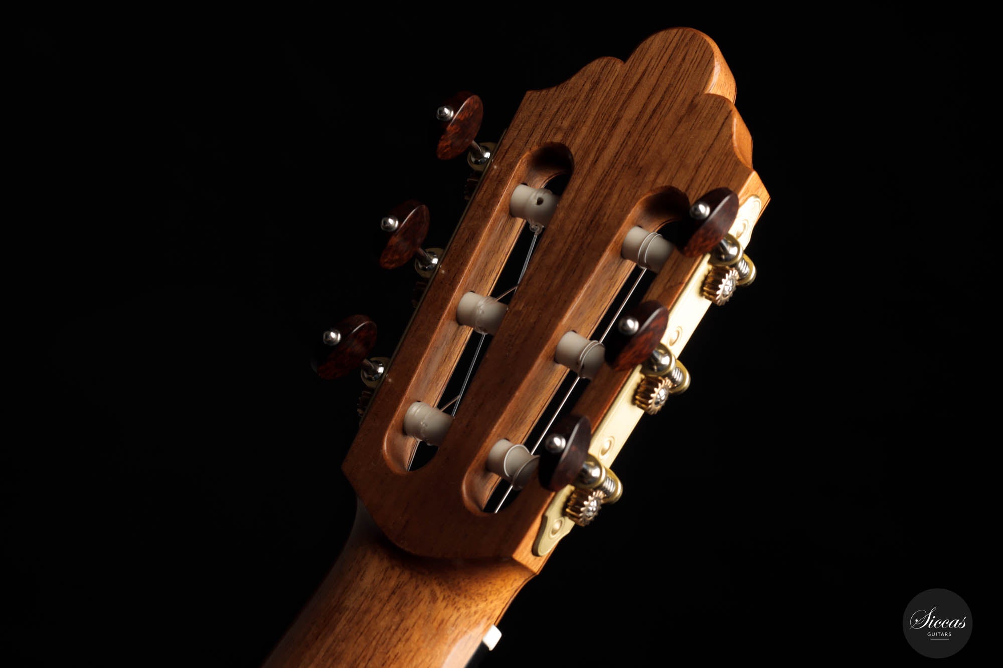 Tamara Stahl is a young and very talented luthier who completed her apprenticeship at the instrument-making school in Mittenwald. Her model is a classical guitar, created through experience and guidance with various guitar builders and the study of numerous instruments. The construction of the top is a seven-fan bracing with a continuous arching which gives the thinly crafted soundboard the necessary stiffness and is also aesthetically in harmony with the raised fingerboard, which facilitates playing in the high registers.