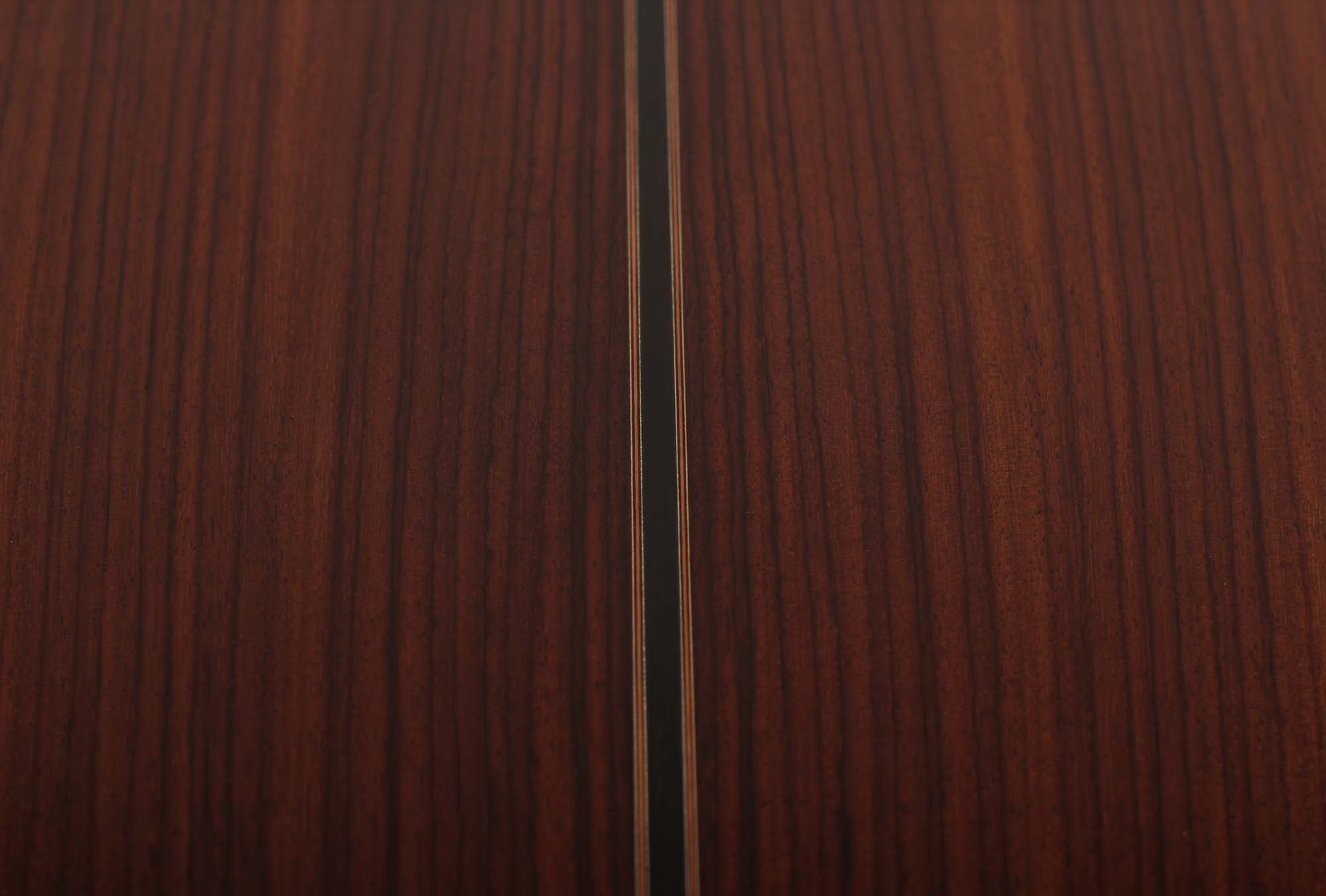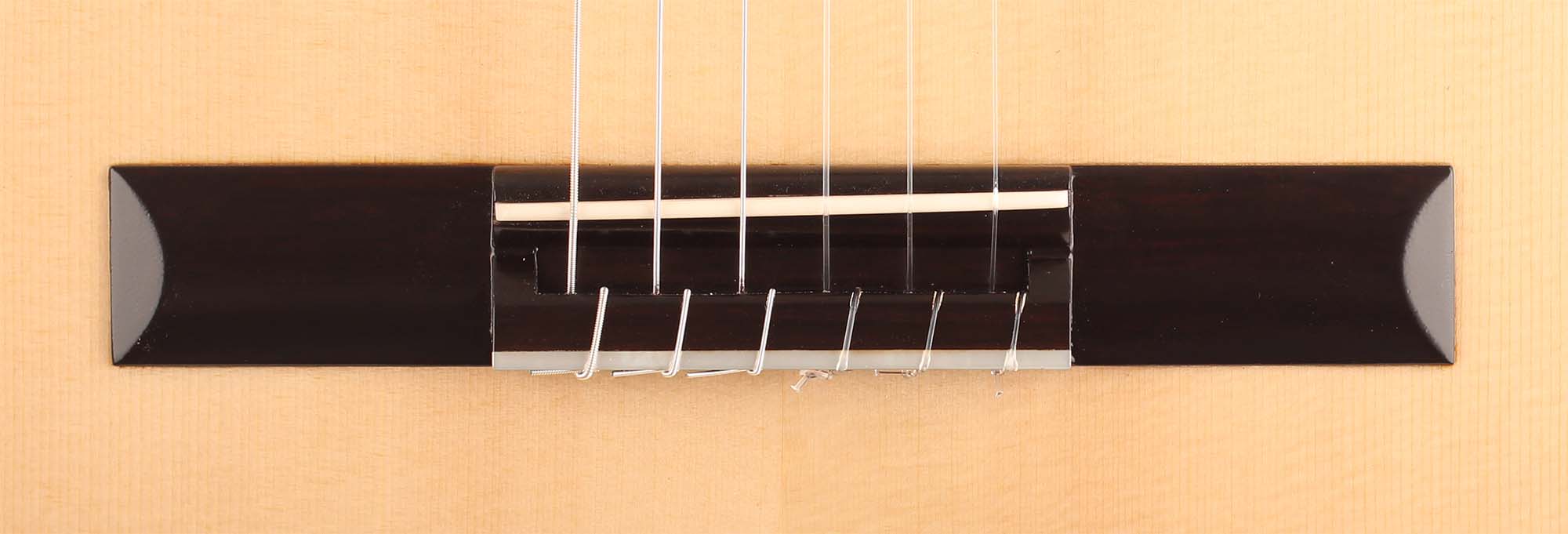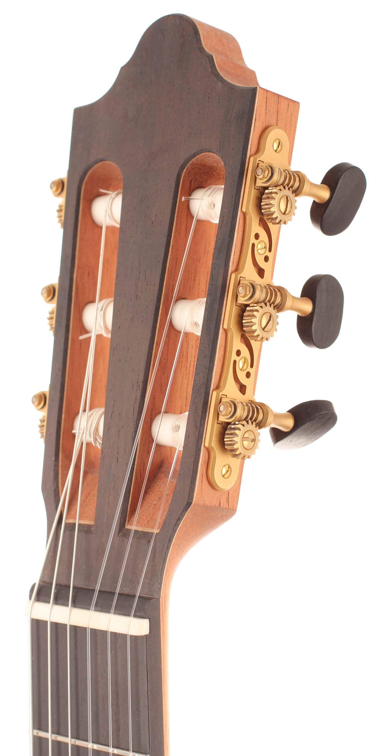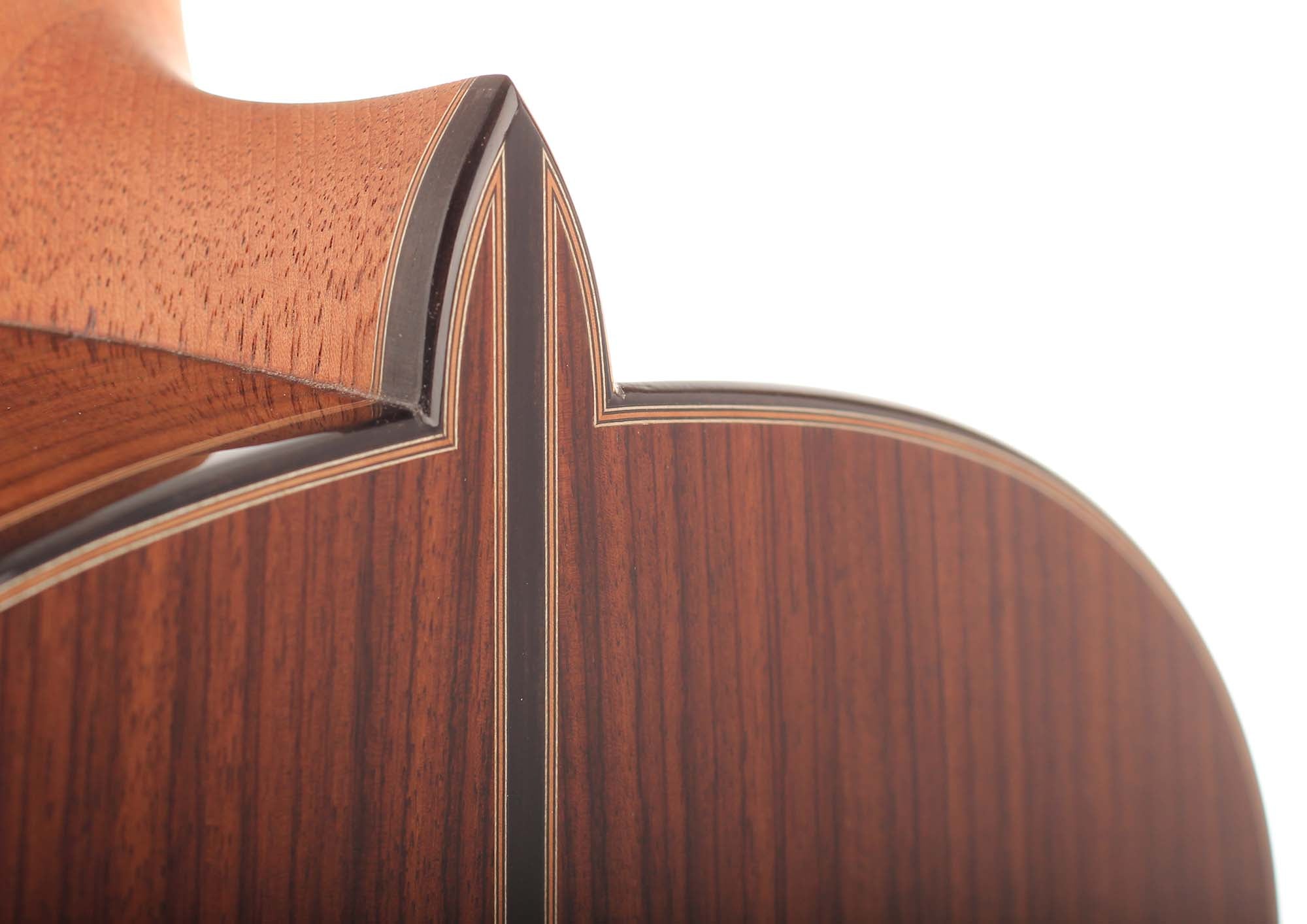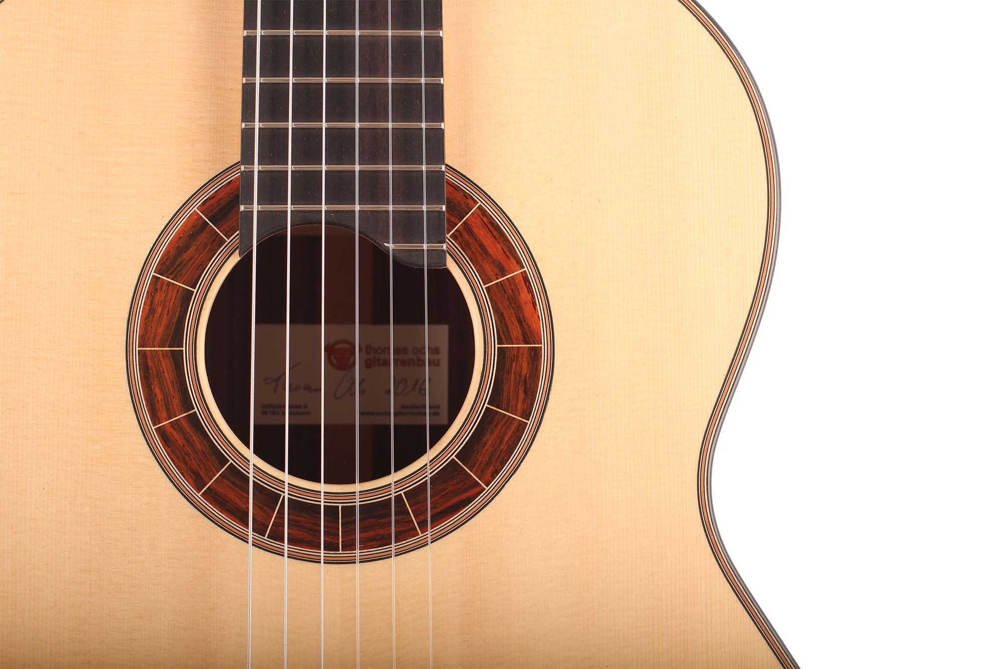 The construction of the spruce top with its seven symmetrical and fan-like arranged struts and a transverse batten beneath the sound hole transposes the sustain of the sound reflection and the volume of basses. A stiffening of the guitar’s top above the sound hole supports the tone duration in the descant. Both, the top as well as the back, which is made of African rosewood, are arched. Four transverse struts stiffen the back and together with the stiffened ribs, they ensure that the top is able to swing like a firmly clamped membrane. Those characteristics of construction increase the instrument’s projection. The neck, which is stiffened with carbon rods, consists of cedro with a shafted headstock. It is connected with the guitar’s body in Spanish design. The top nut made of bone is not located directly at the end of the fingerboard, but is inserted into the fingerboard. By this technique, Thomas Ochs achieves an more stiffening of the neck-head junction. The ornamentation of the instrument is classically elegant and it is kept very simple. A handmade sound hole inlay surrounds the sound hole and the body is framed by decorative purfling with precious woods, which harmonize with the sound hole inlay.