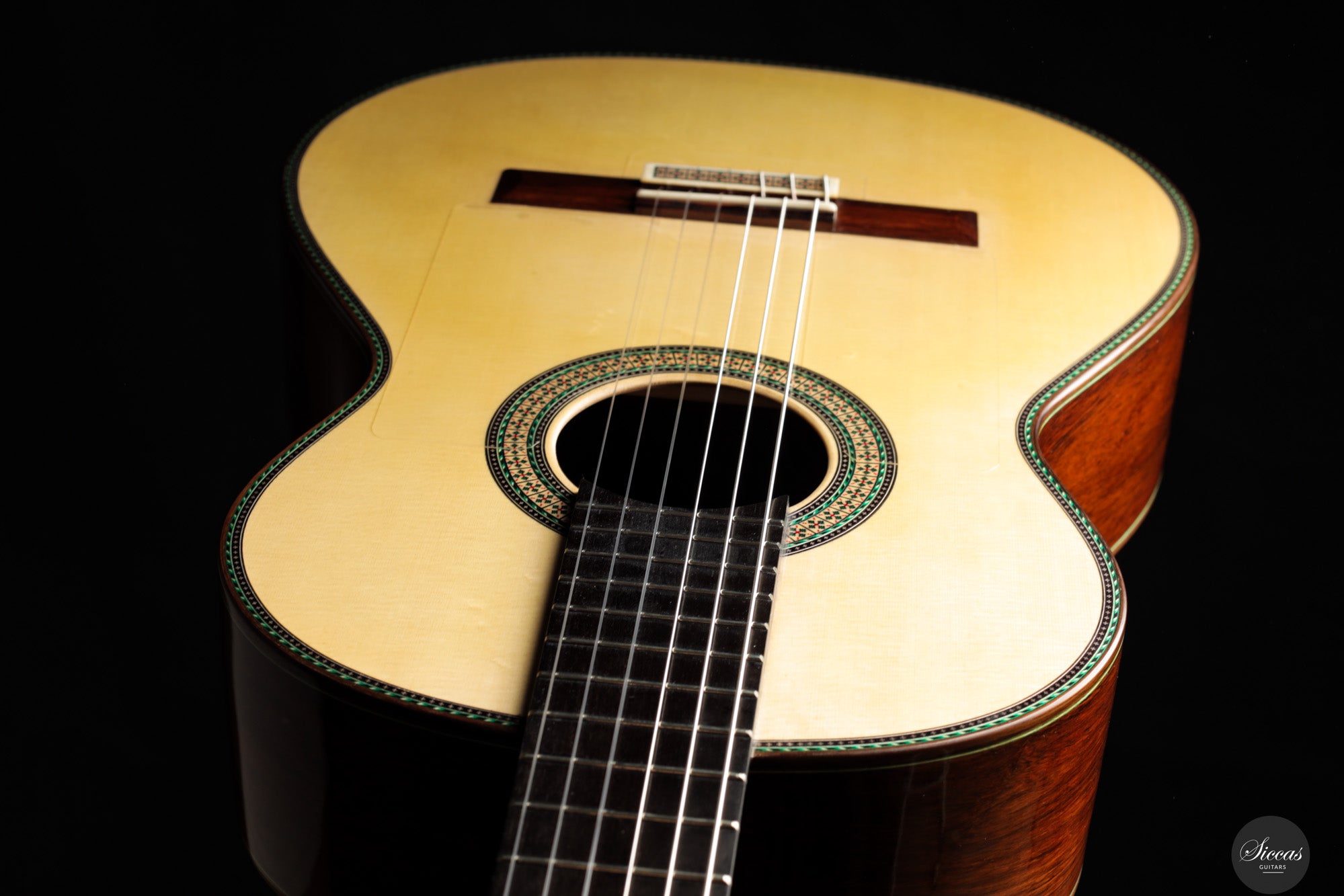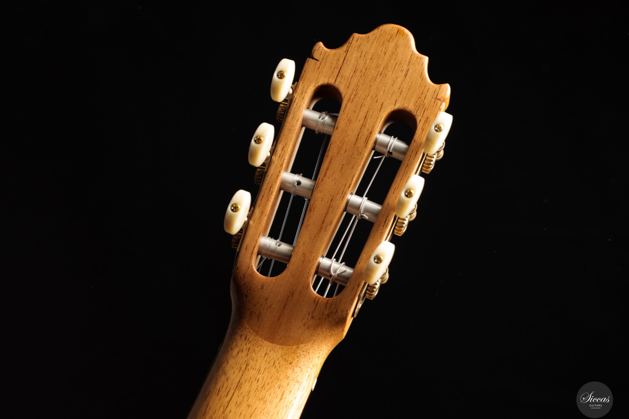 The Maestro N.X. model, developed in collaboration with Gernot Wagner, is a double-top guitar with a Nomex honeycomb core sandwiched between outer spruce layers. The back and sides are made from visually striking Madagascar rosewood. This model is designed to deliver high projection, tonal balance, and a wide dynamic range. With a 640 mm scale, the instrument offers a slightly reduced string length for increased comfort without sacrificing response. The French polish finish ensures acoustic transparency. Notably, the instrument is described as reducing finger noise and mechanical interference, favoring tonal purity. Its tonal character is soft and rounded, with immediate response, making it well suited for fluid, technically intricate repertoire.