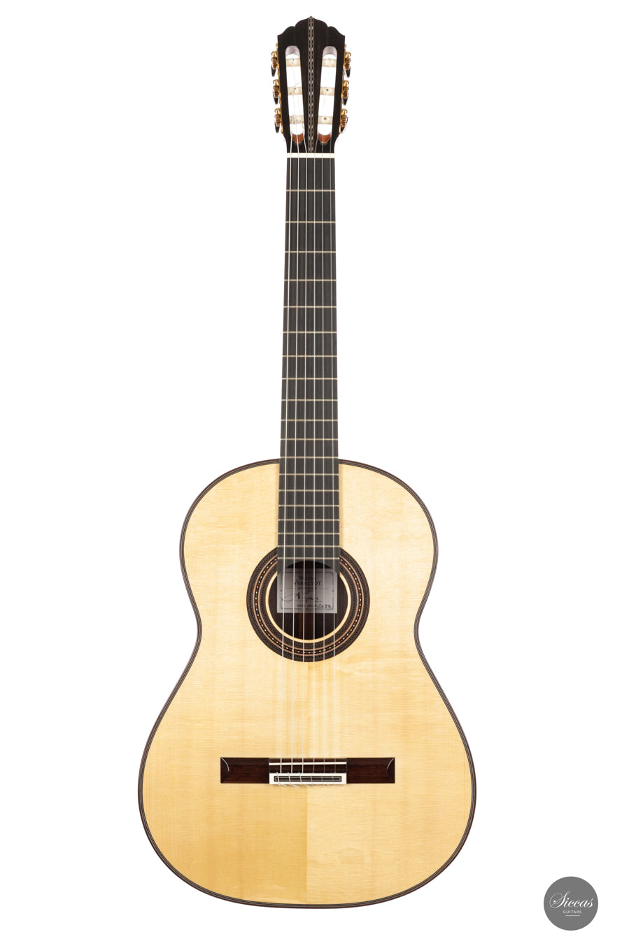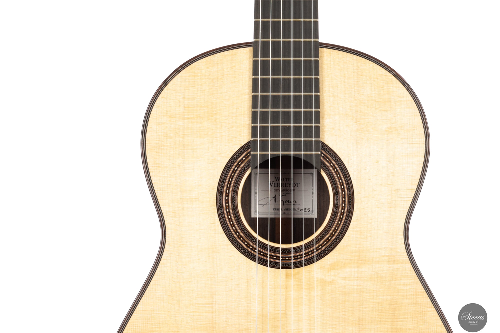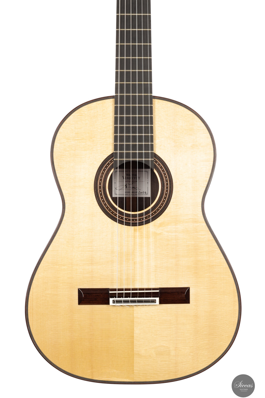 This new lattice model from 2025 shows the refined craftsmanship for which Walter Verreydt is admired. The spruce top and Indian rosewood body are finished throughout with French polish and the guitar is remarkably lightweight. Its construction invites the player to listen closely to the evolution of each note. Klaus Scheller tuning machines complete the instrument with dependable mechanical accuracy.