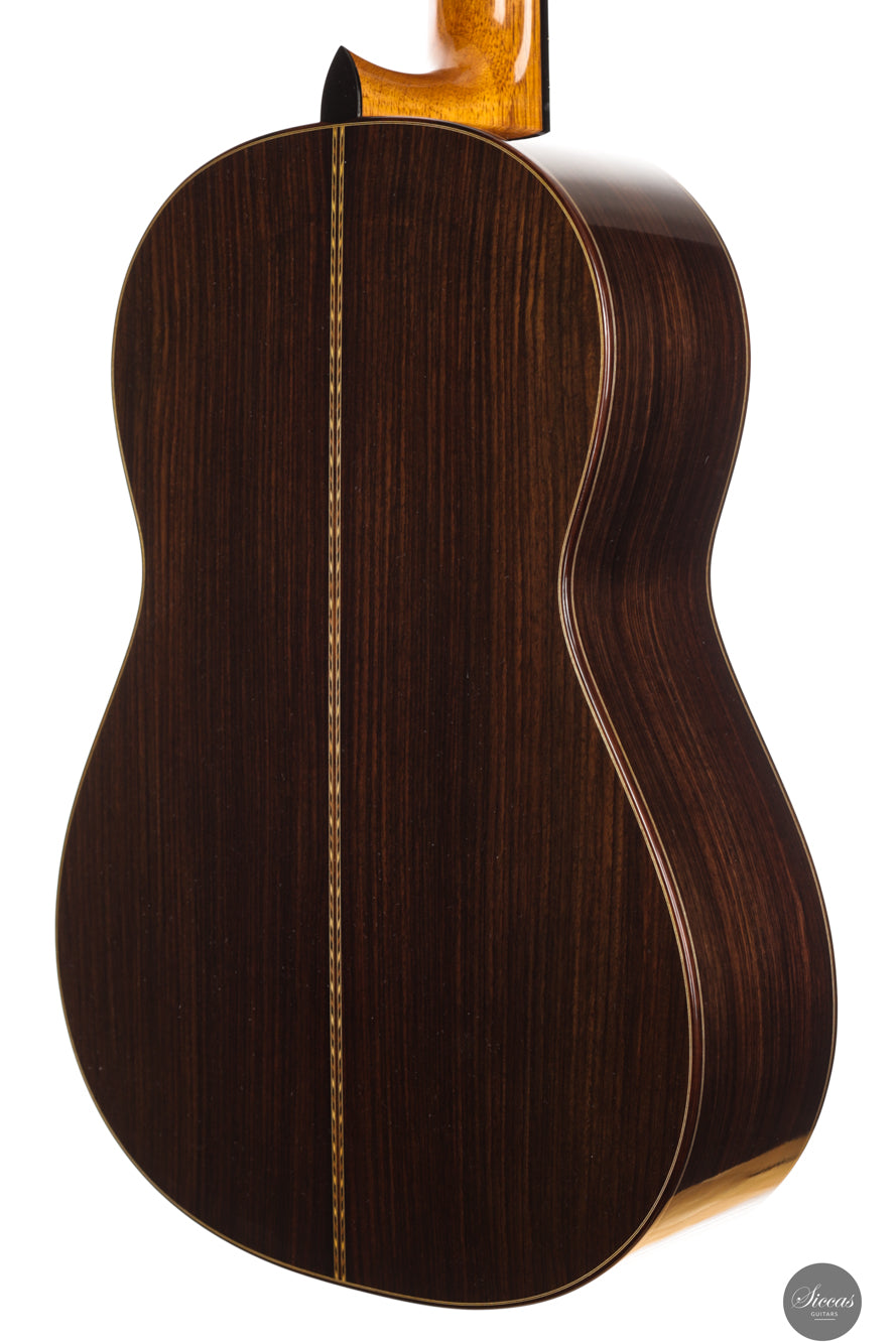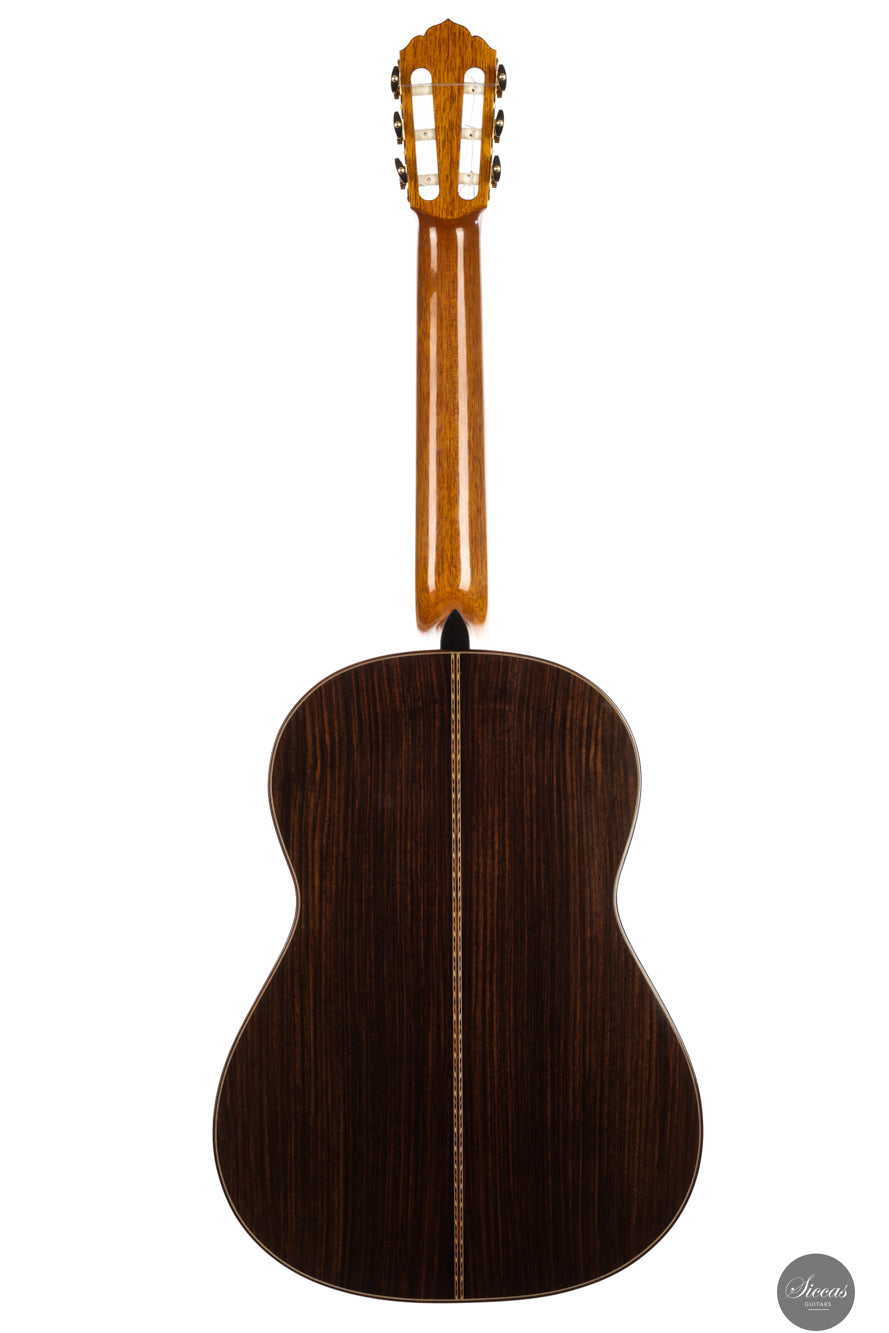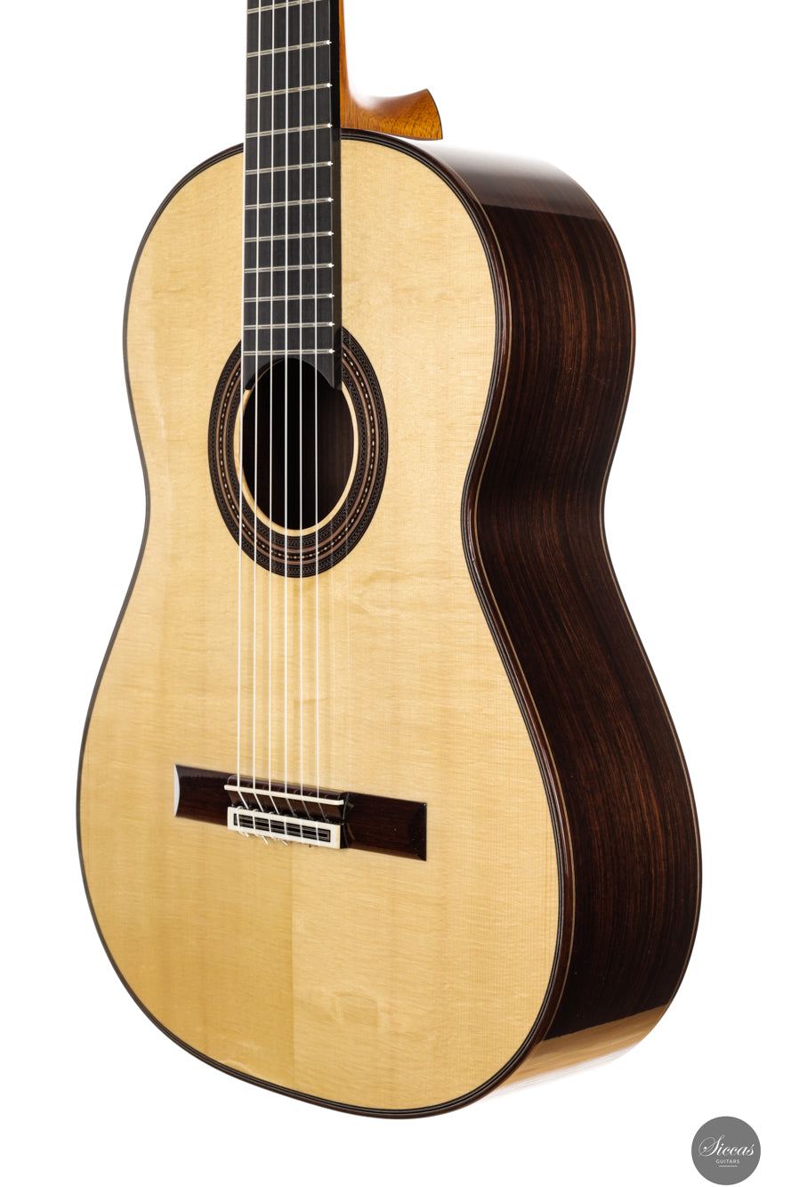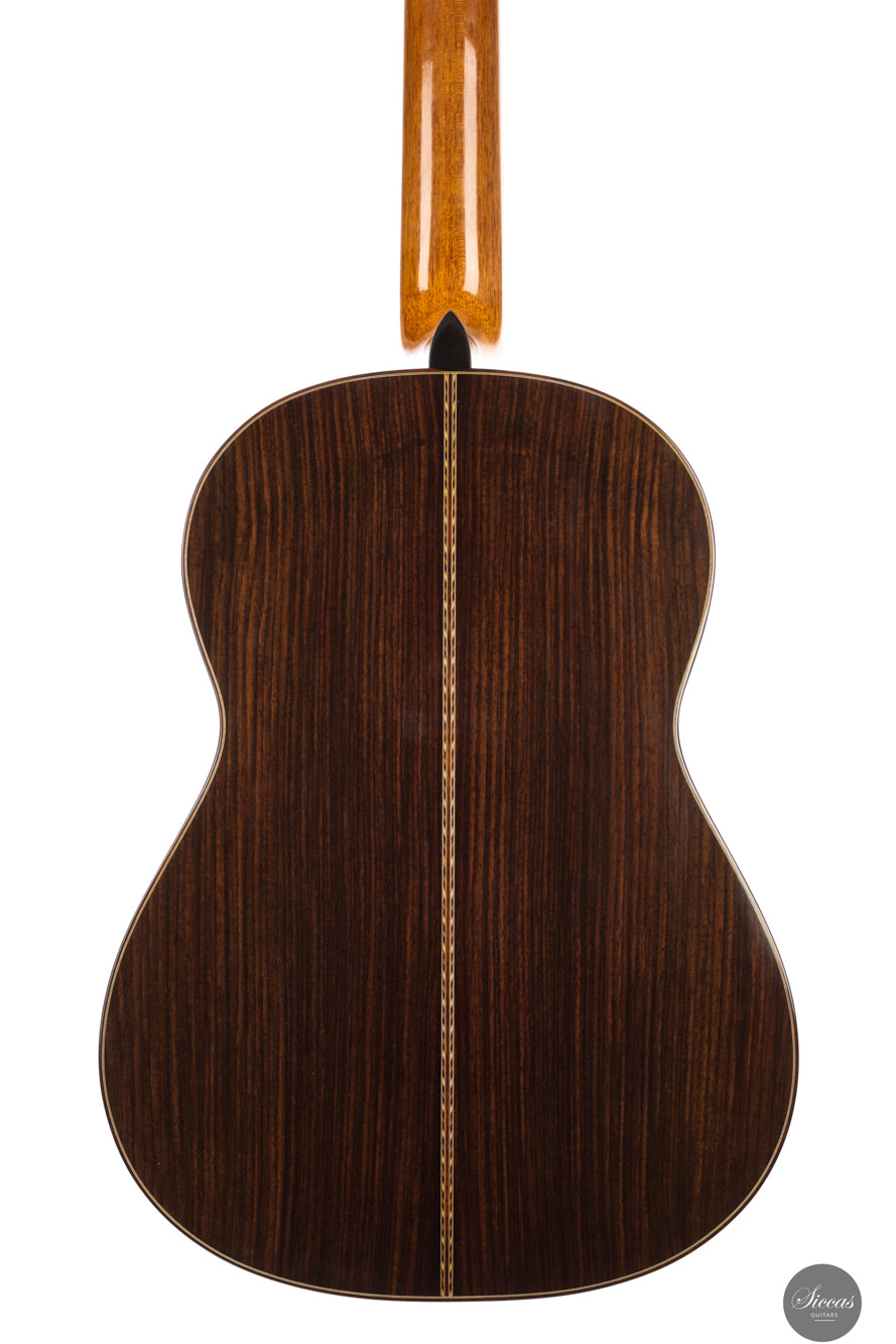 This new lattice model from 2025 shows the refined craftsmanship for which Walter Verreydt is admired. The spruce top and Indian rosewood body are finished throughout with French polish and the guitar is remarkably lightweight. Its construction invites the player to listen closely to the evolution of each note. Klaus Scheller tuning machines complete the instrument with dependable mechanical accuracy.