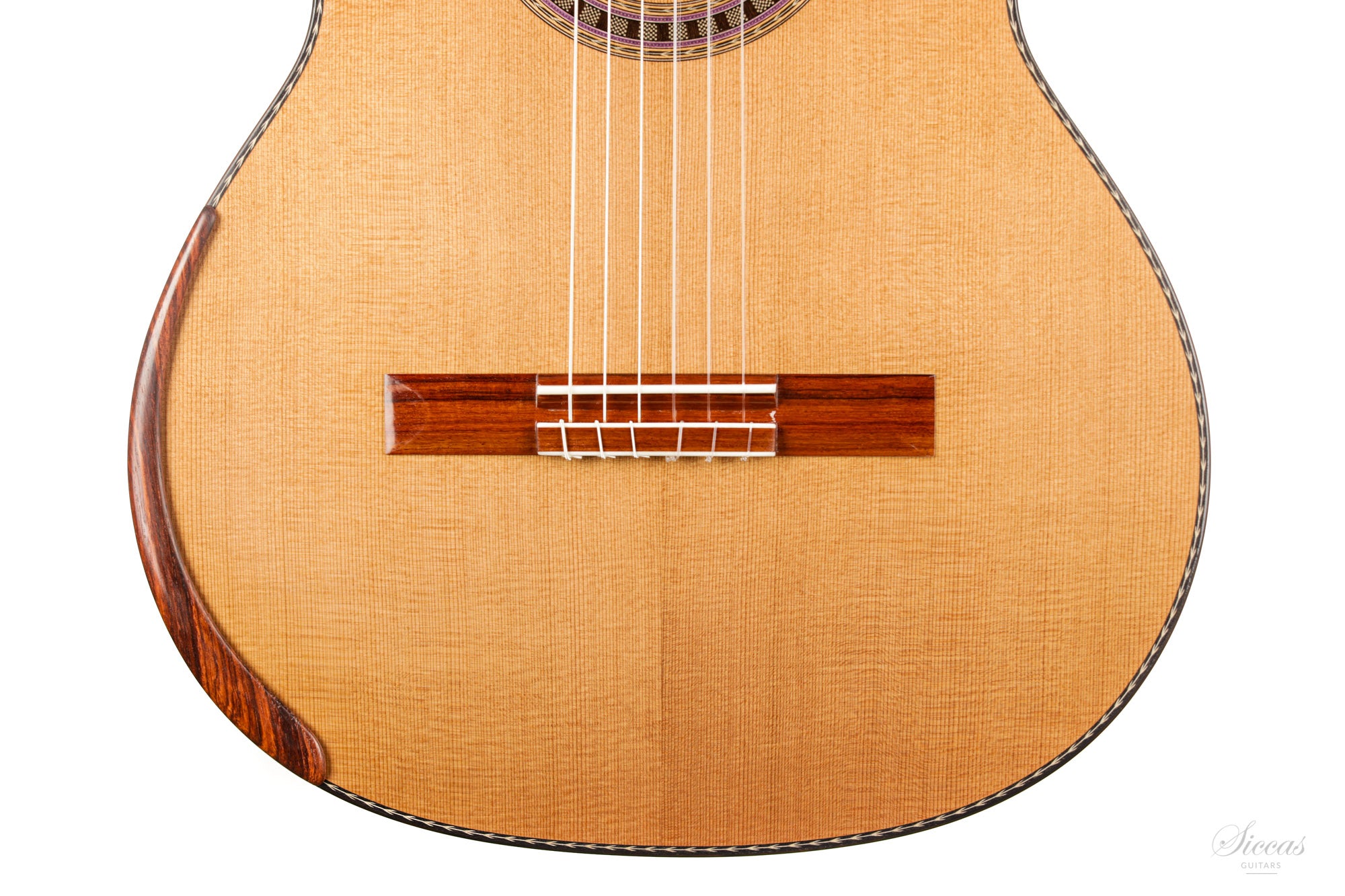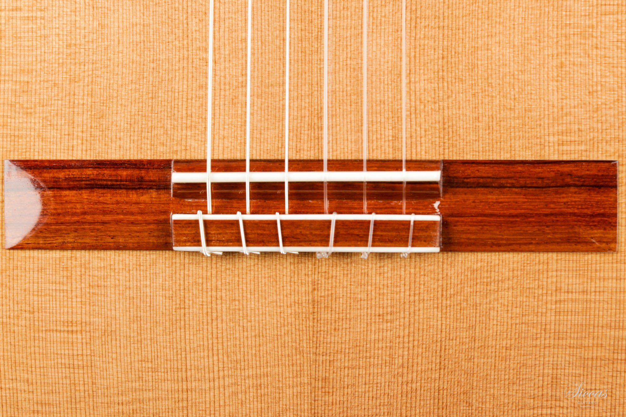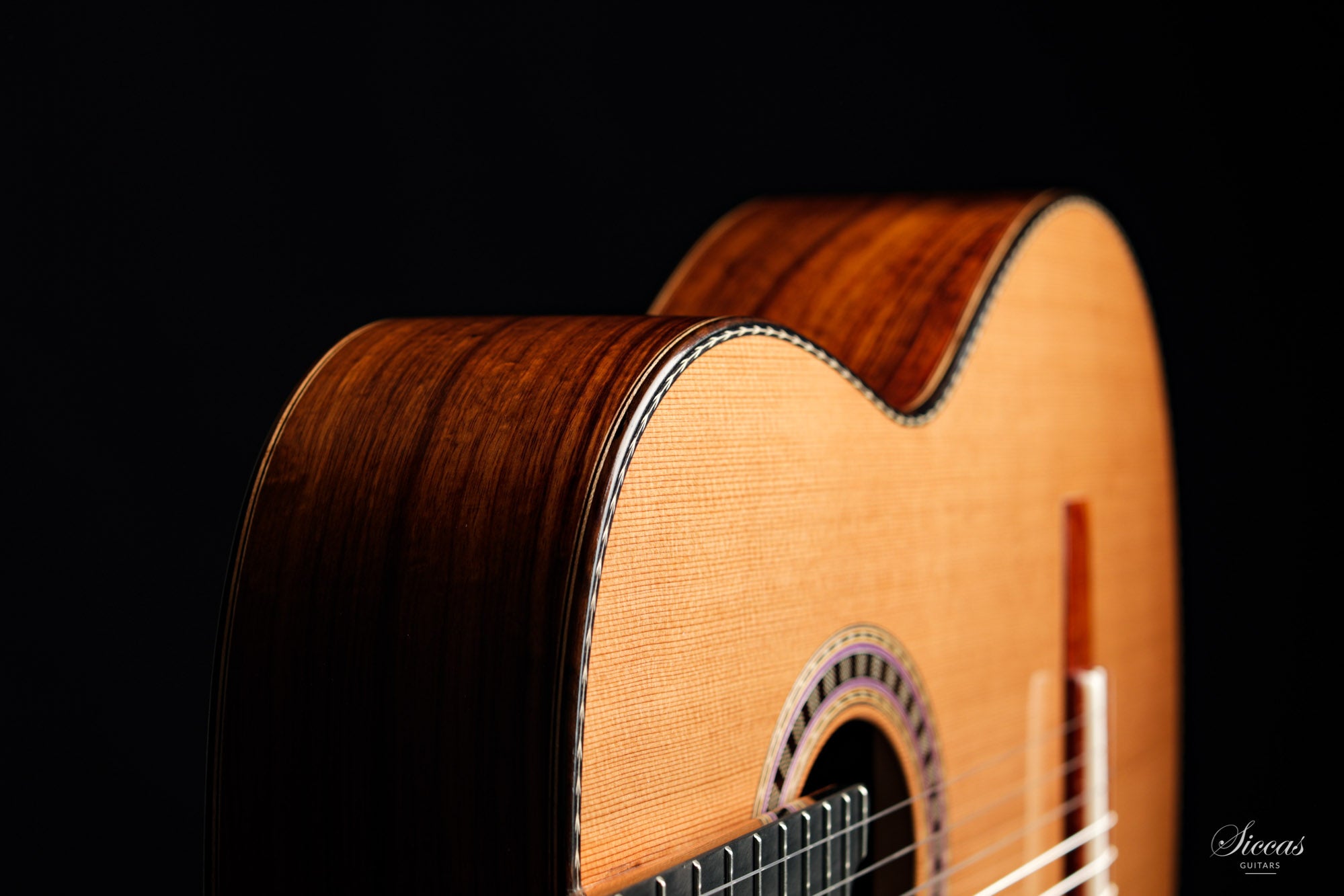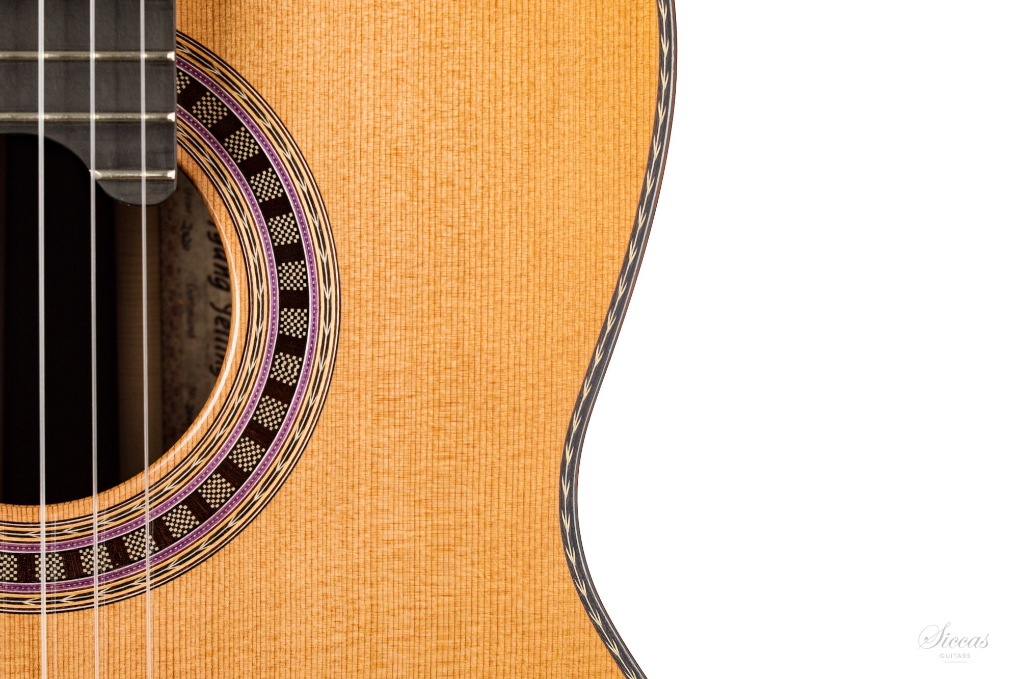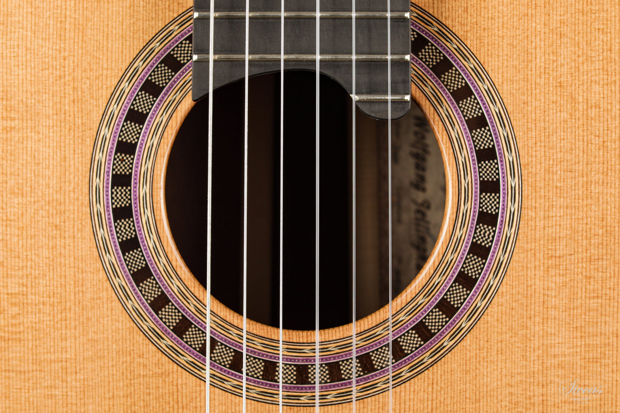 His latest series is the Wolfgang Jellinghaus Signature. This is a very modern guitar with some interesting features, such as the floating fingerboard, which is not fixed to the top, so this part of the top vibrates freely and contributes to the overall sound. The sound volume becomes very powerful, also thanks to the very light double-top construction. This makes it possible to produce a very full and room-filling tone with little effort of the right hand, which is very pleasant for the right hand. The armrest also contributes to the overall comfort. The guitar is finished with shellac which completes the overall picture of this instrument very nicely. In this price category, the guitar is more than convincing.