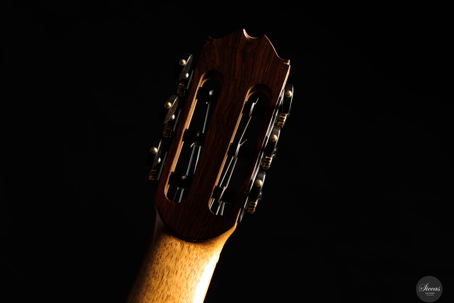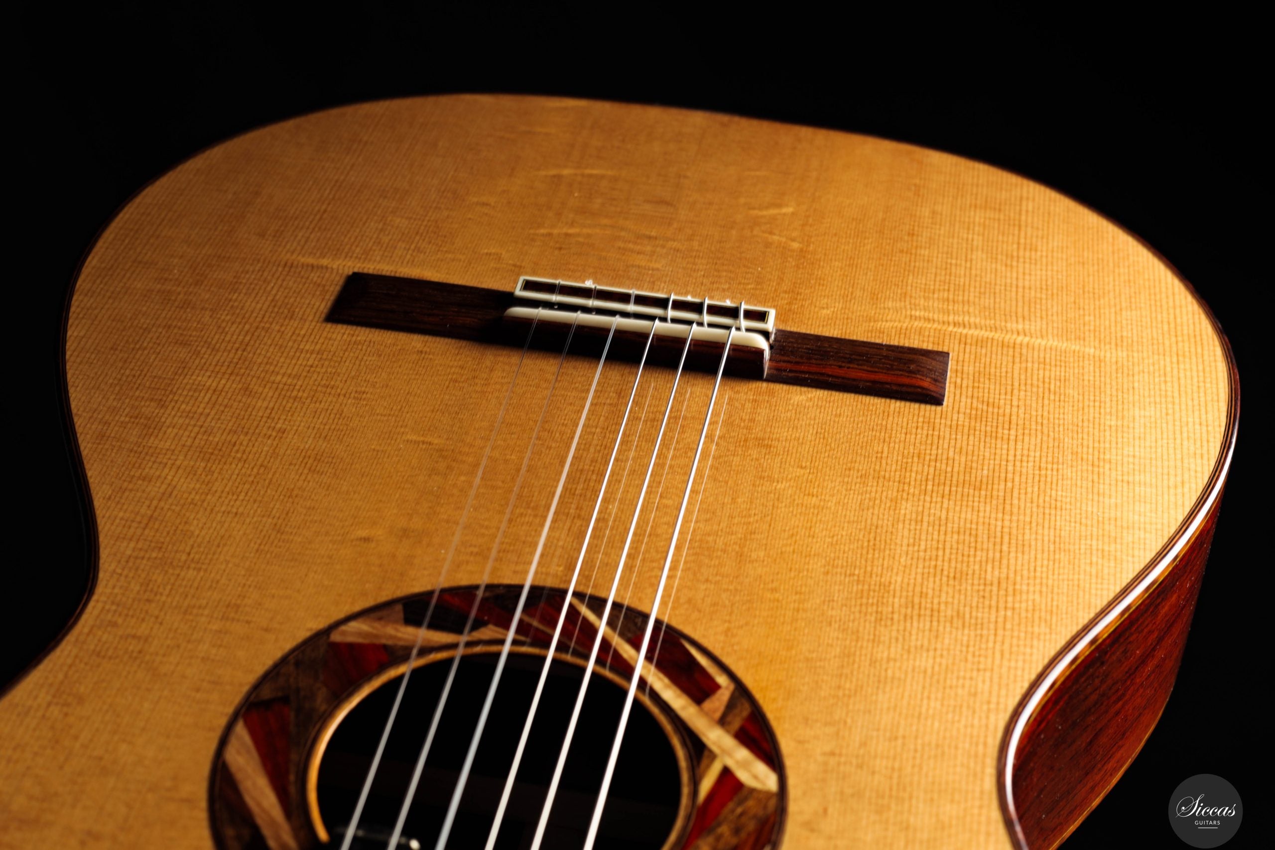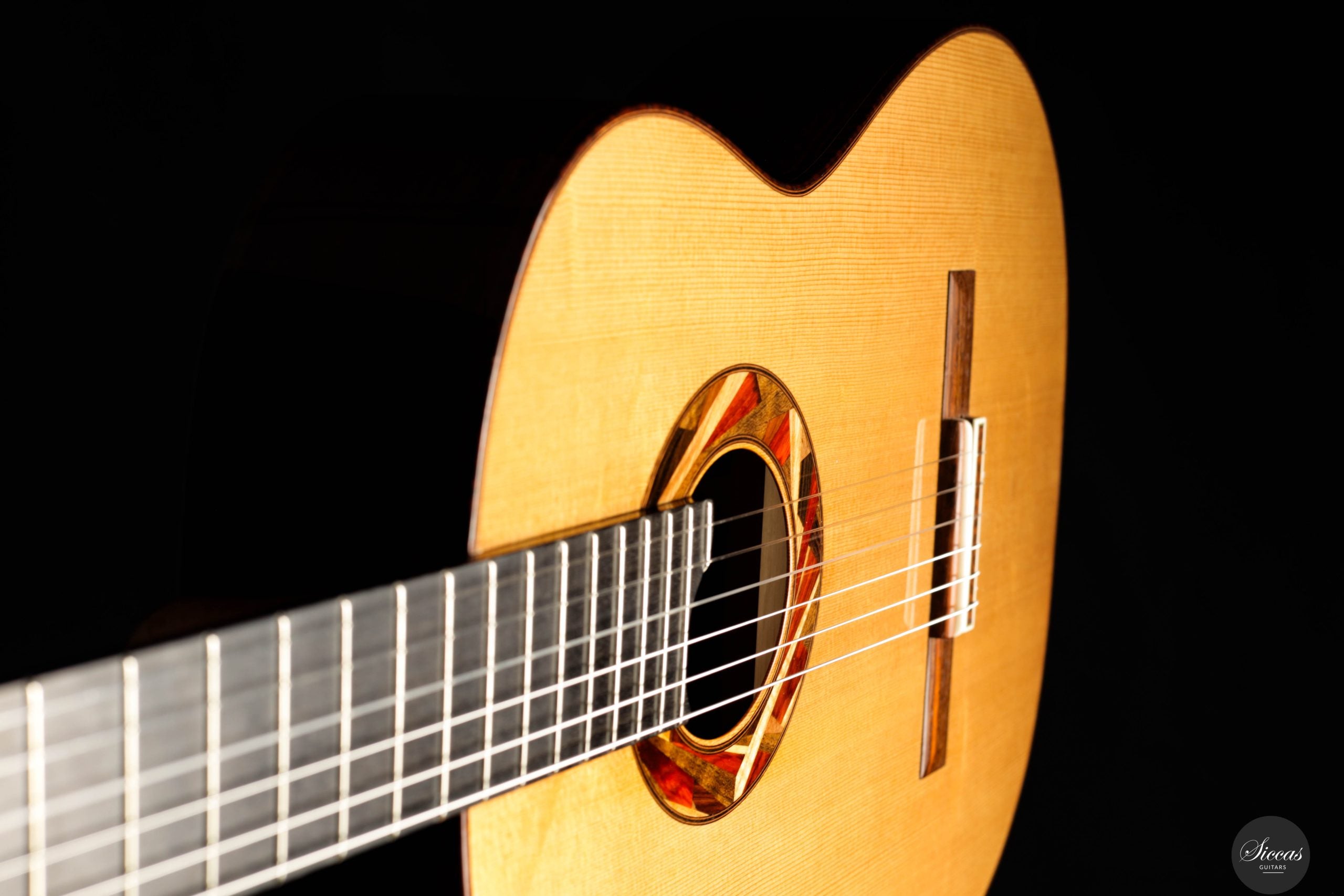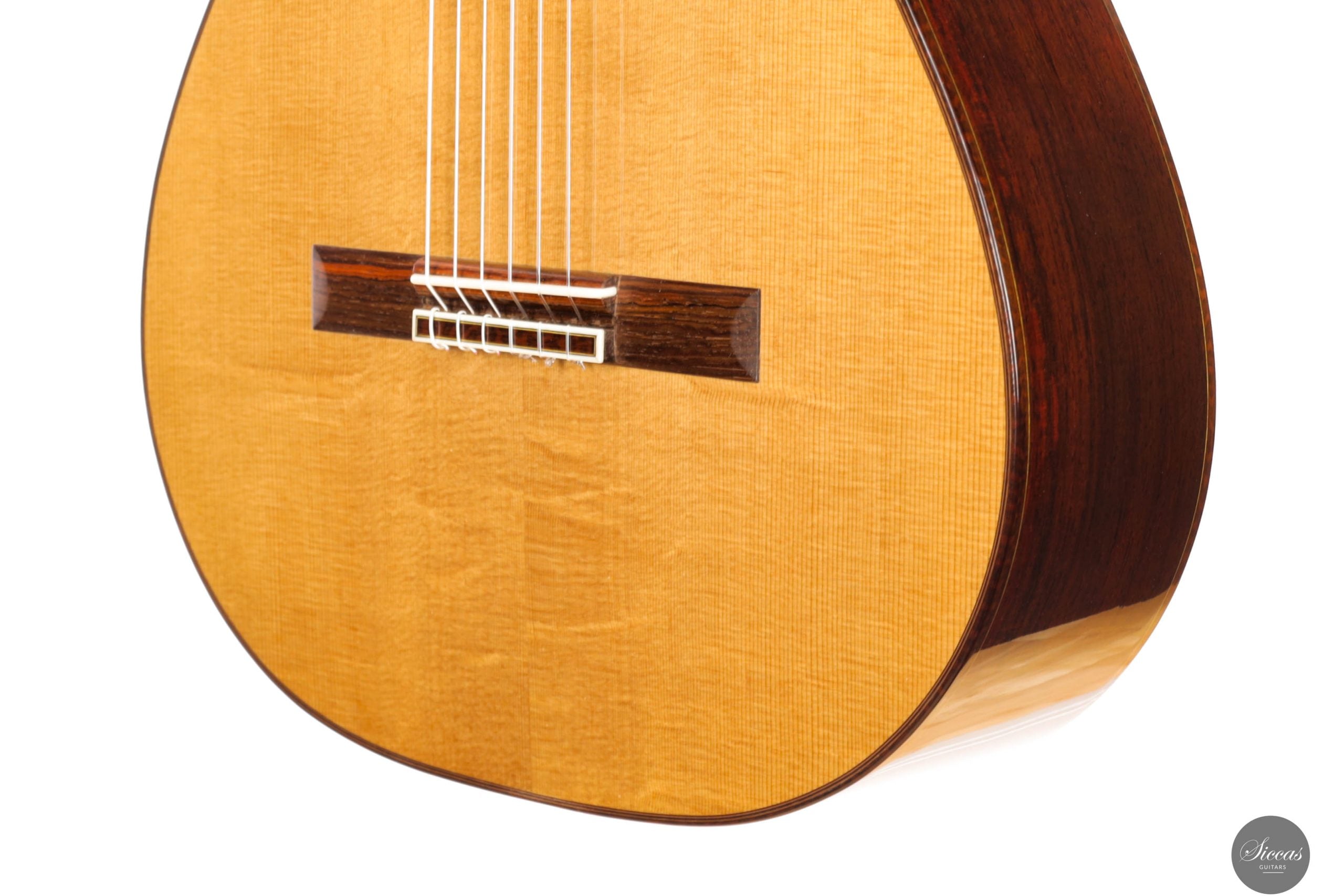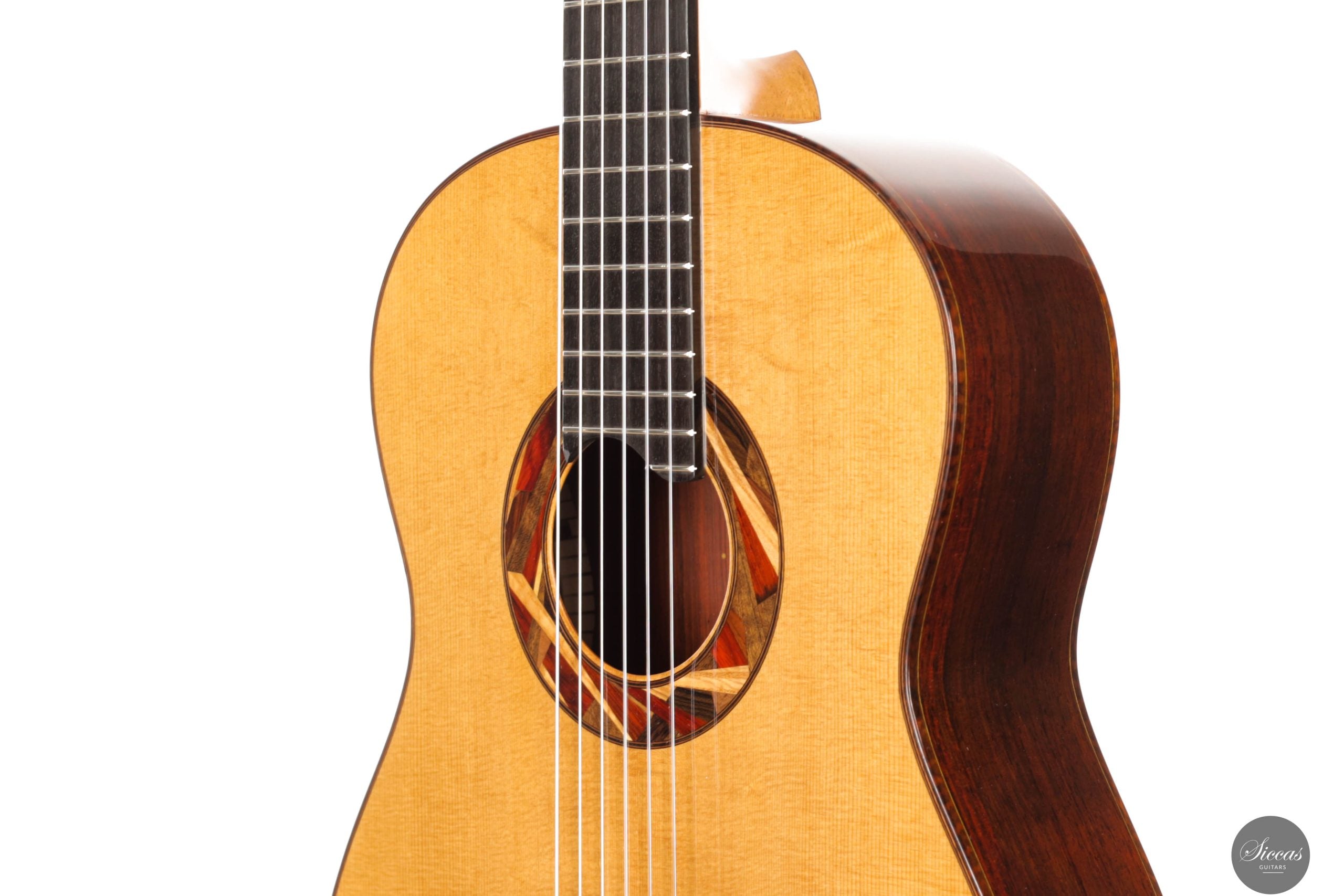 Die Gitarre ist mit einer Lattice-Beleistung ausgestattet, die eine starke Projektion mit einer traditionell inspirierten Klangfarbe verbindet. Die einzigartige Rosette besteht aus kleinen Holzfragmenten verschiedenster edler Tonhölzer, die aus dem Bau anderer Instrumente stammen. Dadurch erhält jede Gitarre eine individuelle und charaktervolle Ästhetik, die Aldos respektvollen Umgang mit Materialien und seine kreative Herangehensweise widerspiegelt. Das Instrument ist vollständig von Hand mit Schellack poliert und mit Mechaniken von Alessi sowie Knobloch EDC 34.0 Saiten ausgestattet.