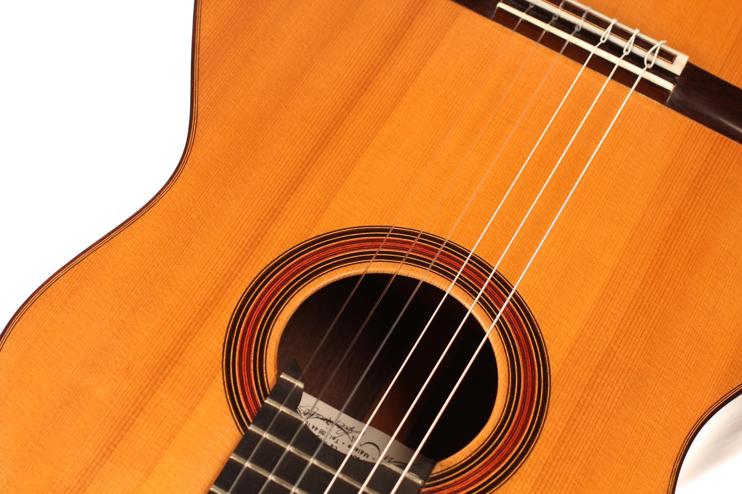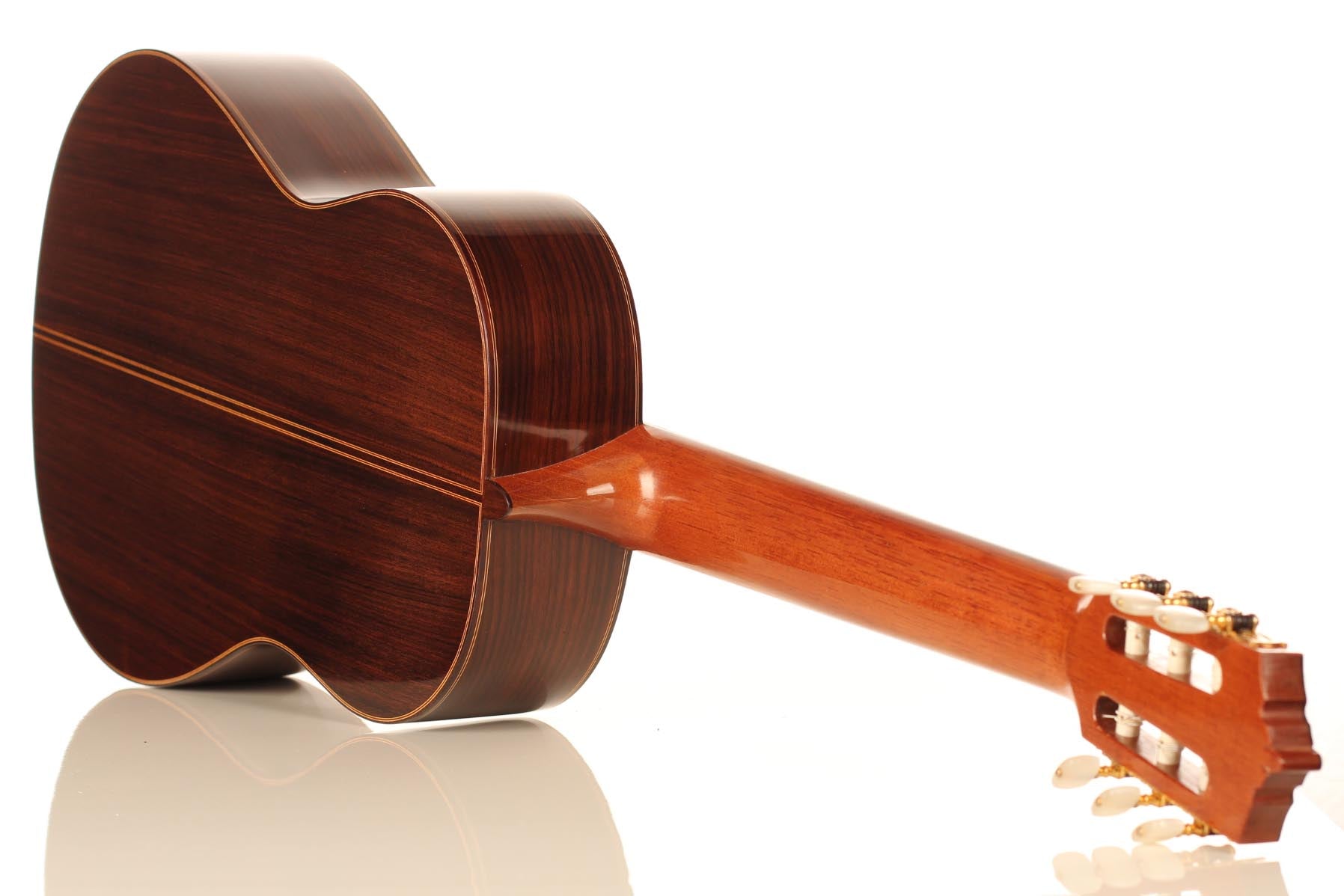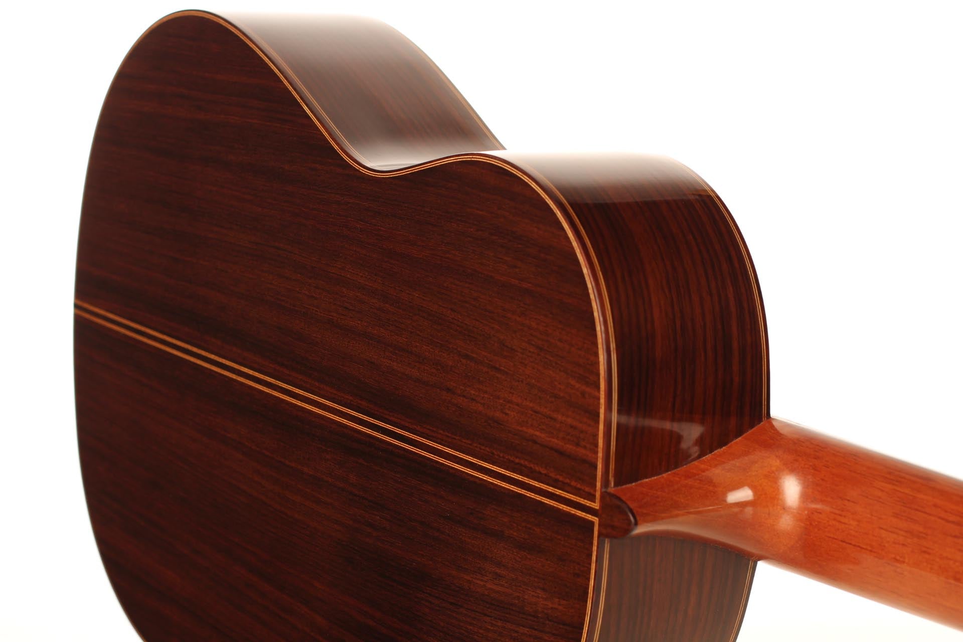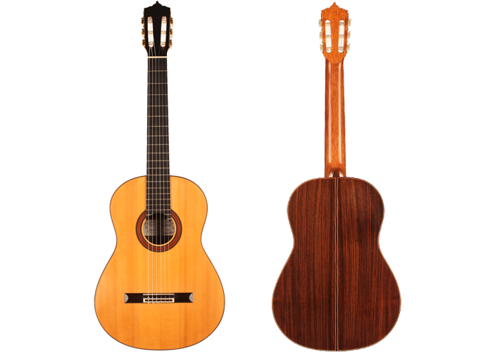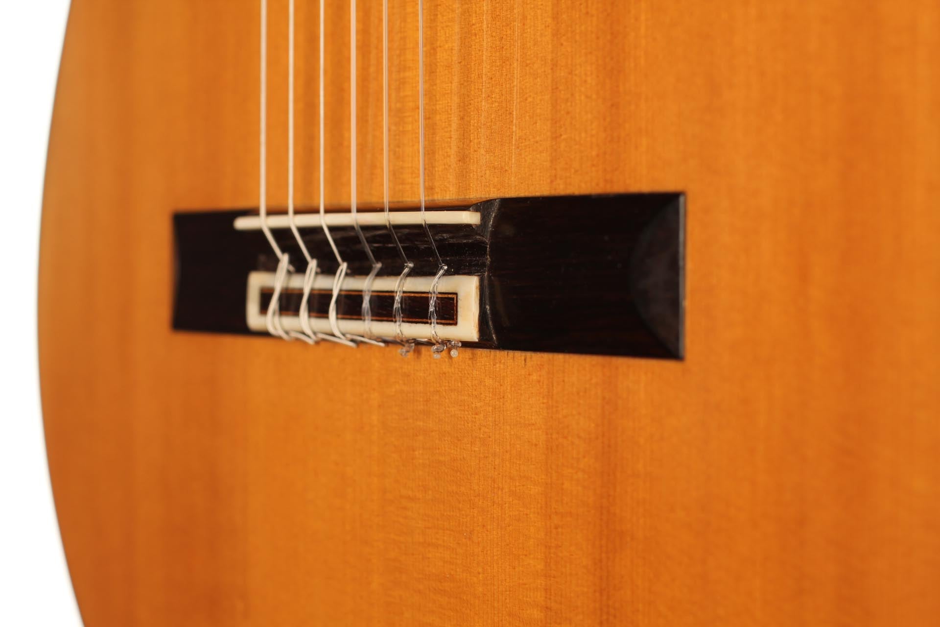 This beautiful guitar was built in 1987 and is in extraordinary good condition. It is in pristine condition and wears only a few superficial marks of playing. It is a fine and sober instrument with a very feminine plantilla. Several details such as the heel, the rosette and the choice of tone woods show very refined aesthetic taste. This guitar is a real pleasure to play and is perfectly set up, so the articulation of musical phrases comes out clear and transparent. It is a very balanced instrument, with a real soul and a strong personality. The tuning machines are made by Fustero. A hard-shell case is included.