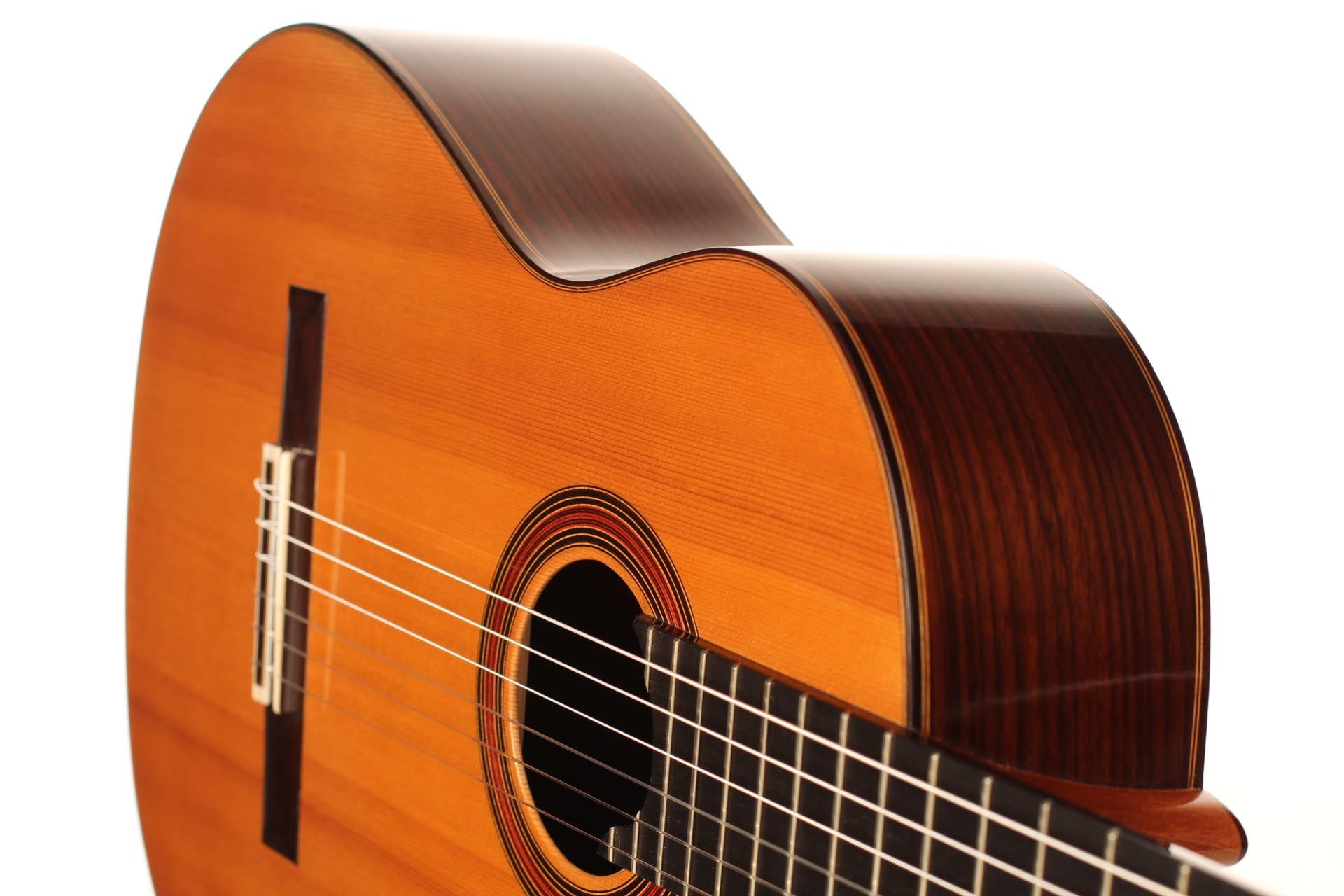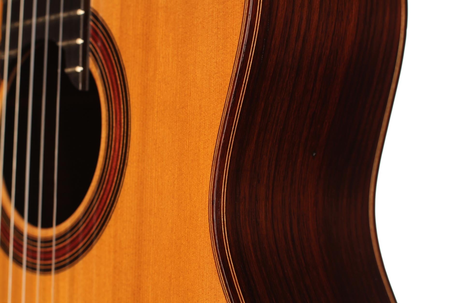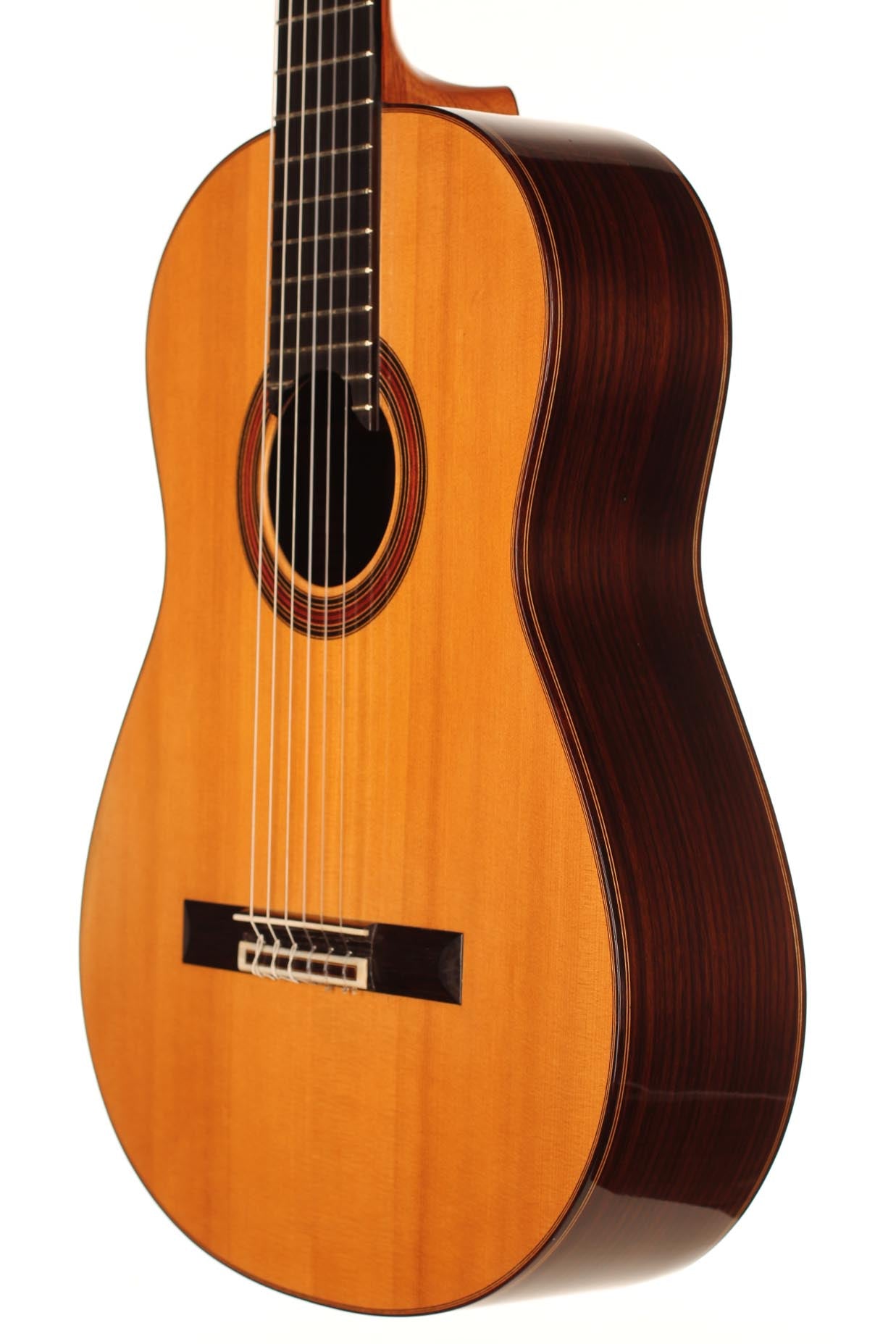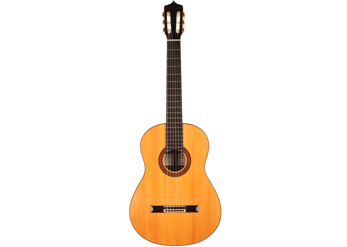 This beautiful guitar was built in 1987 and is in extraordinary good condition. It is in pristine condition and wears only a few superficial marks of playing. It is a fine and sober instrument with a very feminine plantilla. Several details such as the heel, the rosette and the choice of tone woods show very refined aesthetic taste. This guitar is a real pleasure to play and is perfectly set up, so the articulation of musical phrases comes out clear and transparent. It is a very balanced instrument, with a real soul and a strong personality. The tuning machines are made by Fustero. A hard-shell case is included.