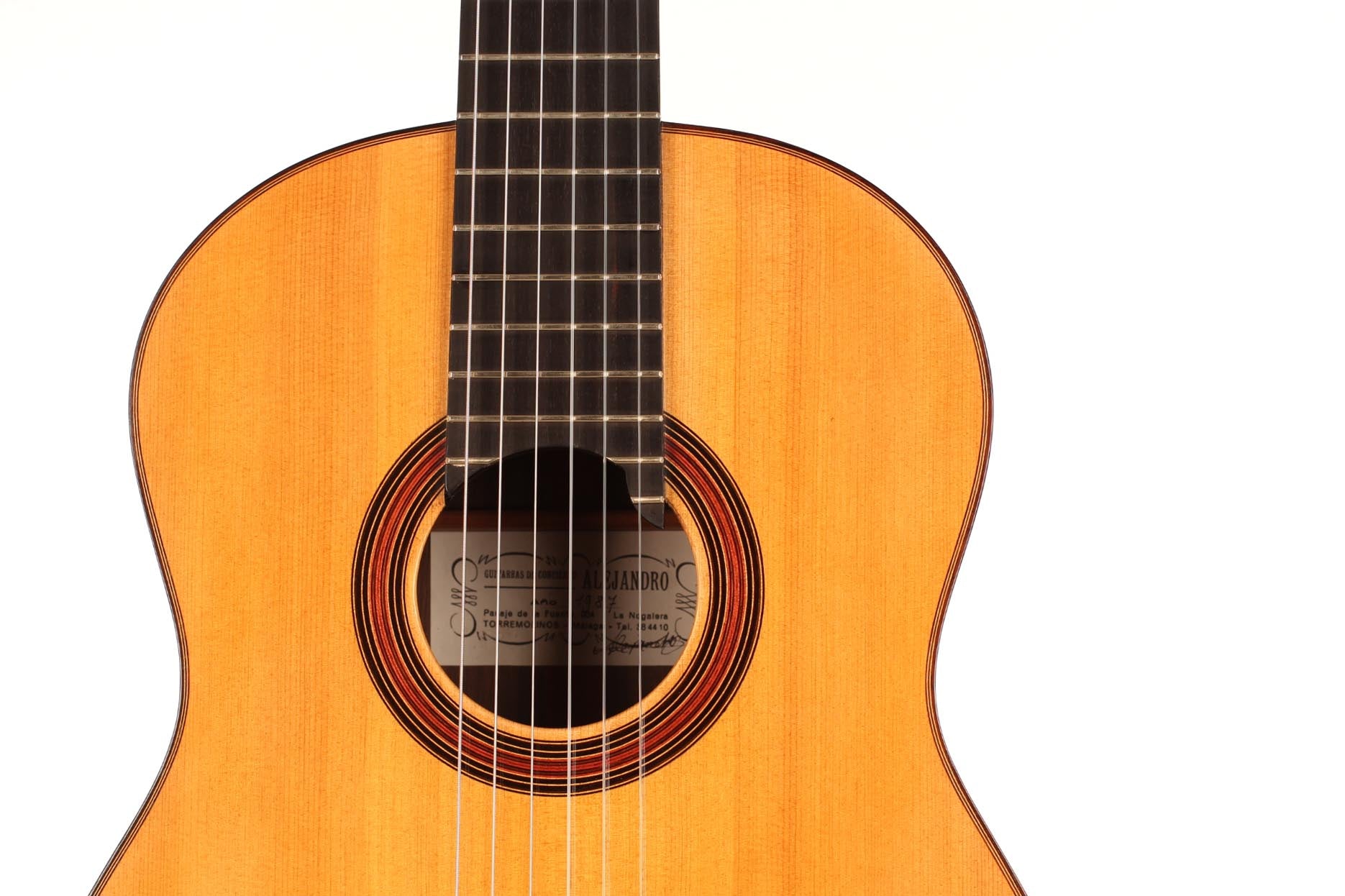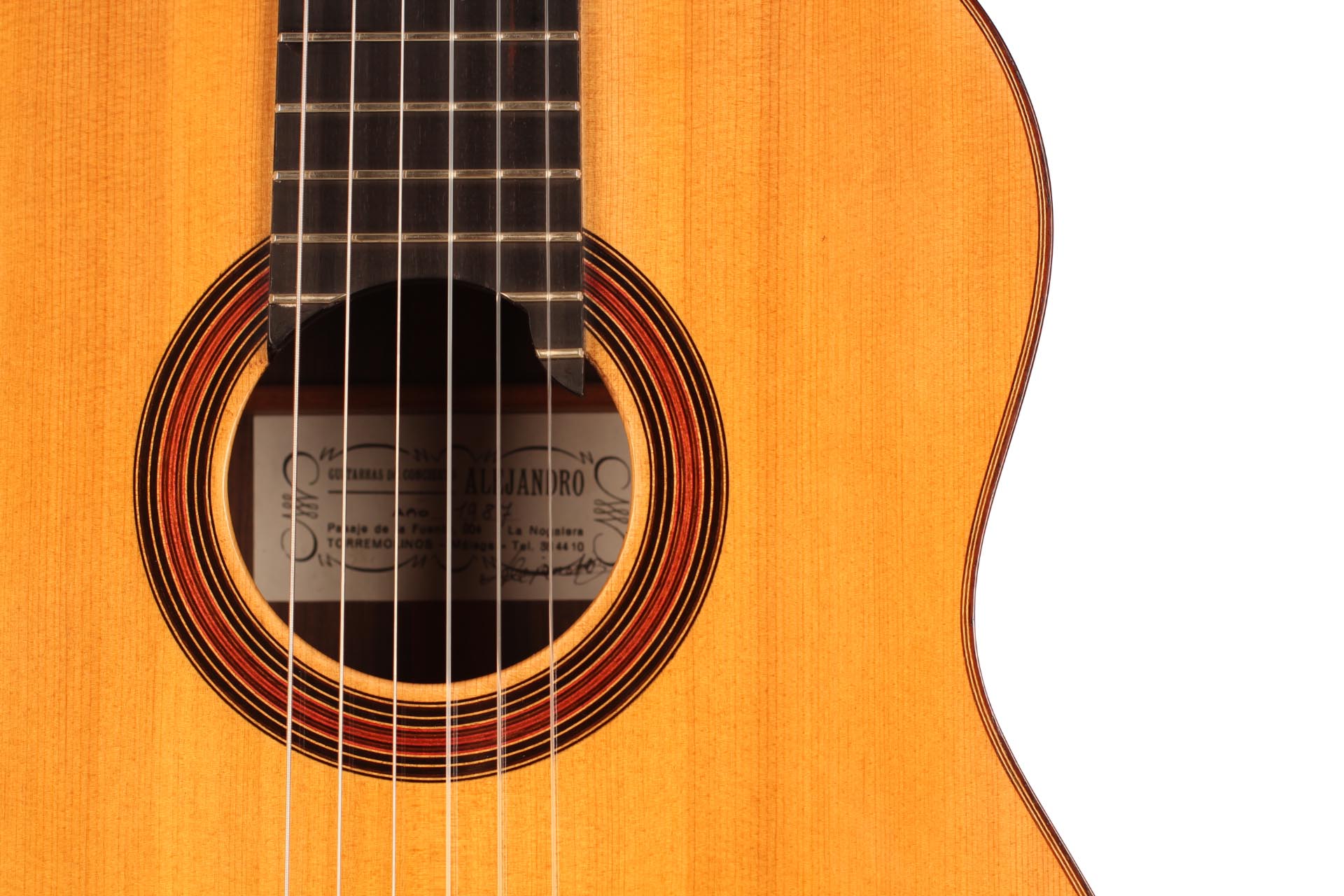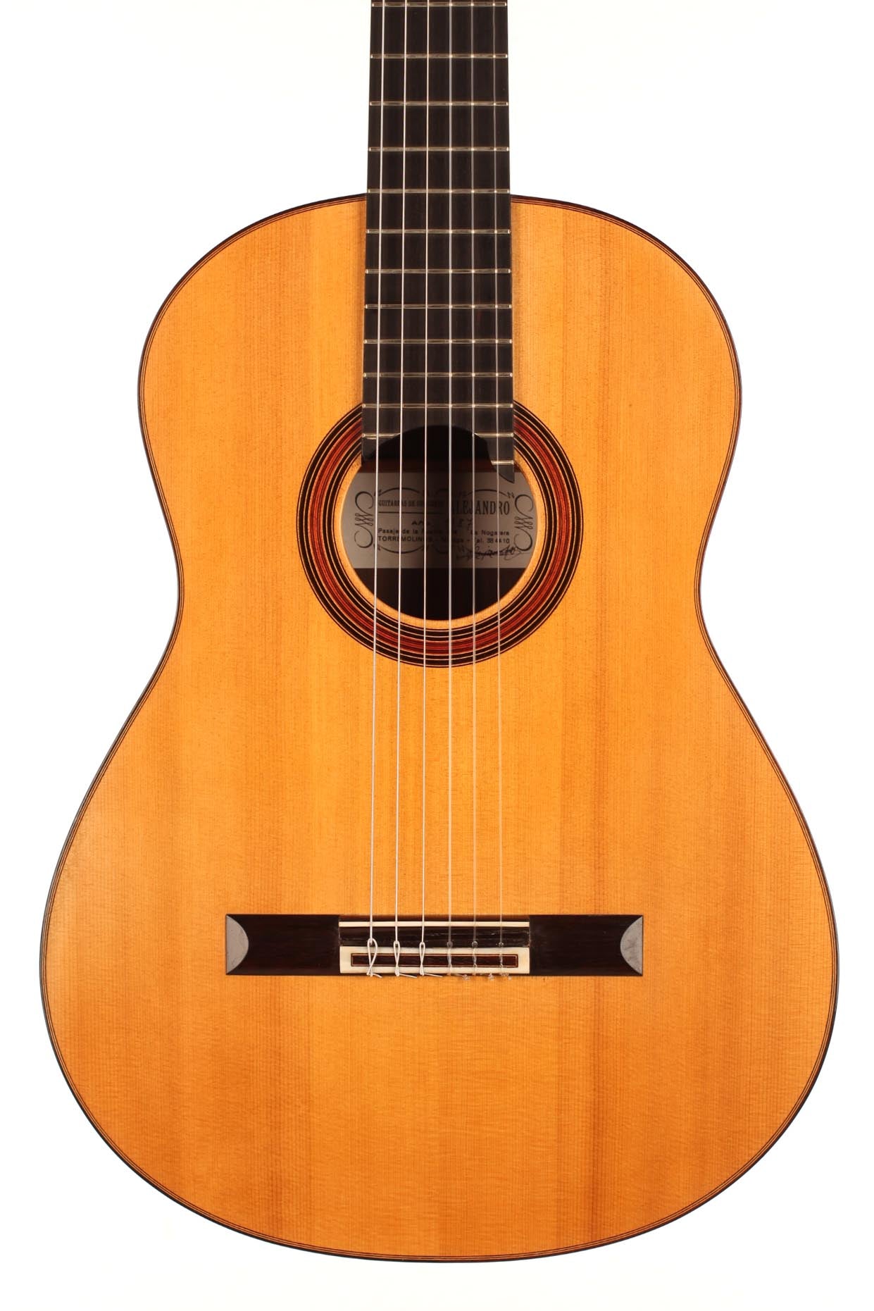 This classical guitar was built by the Dutch guitar maker Alex van der Horst who built guitars under the pseudonym “Alejandro” in Malaga, Spain. Alejandro was building very light and responsive instruments with a traditional fan bracing. His instruments are generally small bodied with an immediate answer and great projection. His instruments are really made for sound lovers and great guitarists such as Marco Socias regularly play concerts on his guitars.