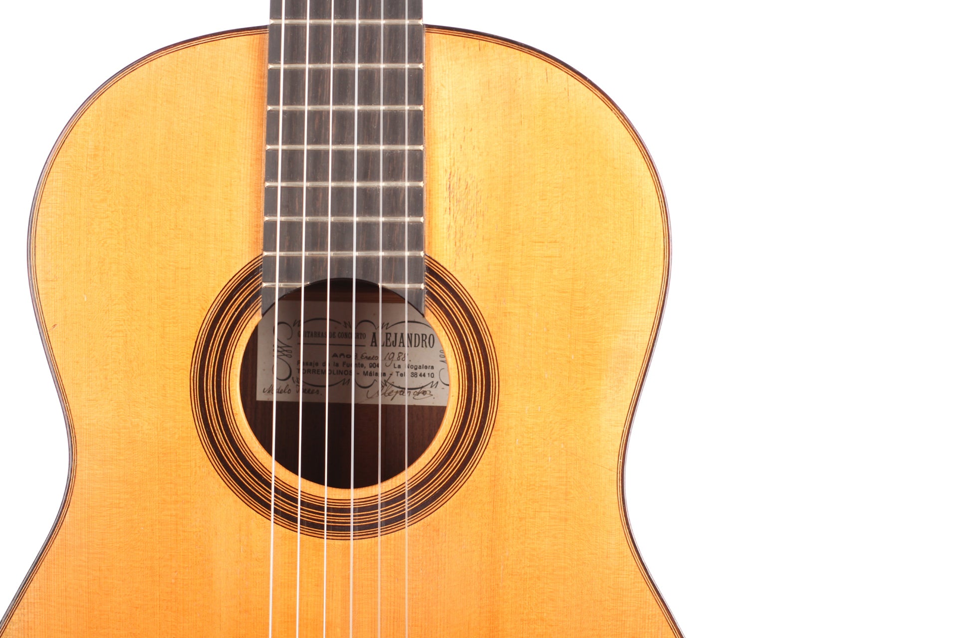Alex van der Horst, ein gebürtiger Niederländer, baute unter dem Pseudonym "Alejandro" Gitarren in Malaga. Diese Gitarre wurde im Jahr 1988 gebaut und befindet sich in einem guten Zustand. Lediglich kleinere Spielspuren sind auf der Fichtendecke und dem aus indischen Palisander gefertigten Boden und den Zargen sichtbar. Unter dem Steg befindet sich eine kleine Macke (siehe Foto). Die Verarbeitung, die Wahl der Materialien, das Schellackfinish sind allererster Güte. Die Mechaniken sind von Fustero. Ein Hartschalenkoffer ist inklusive.