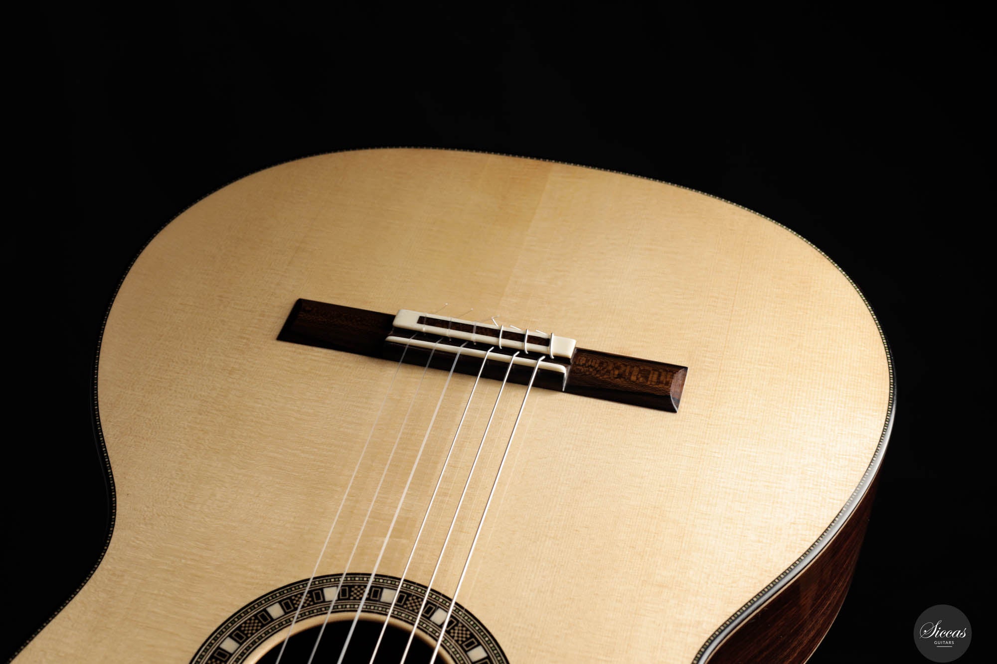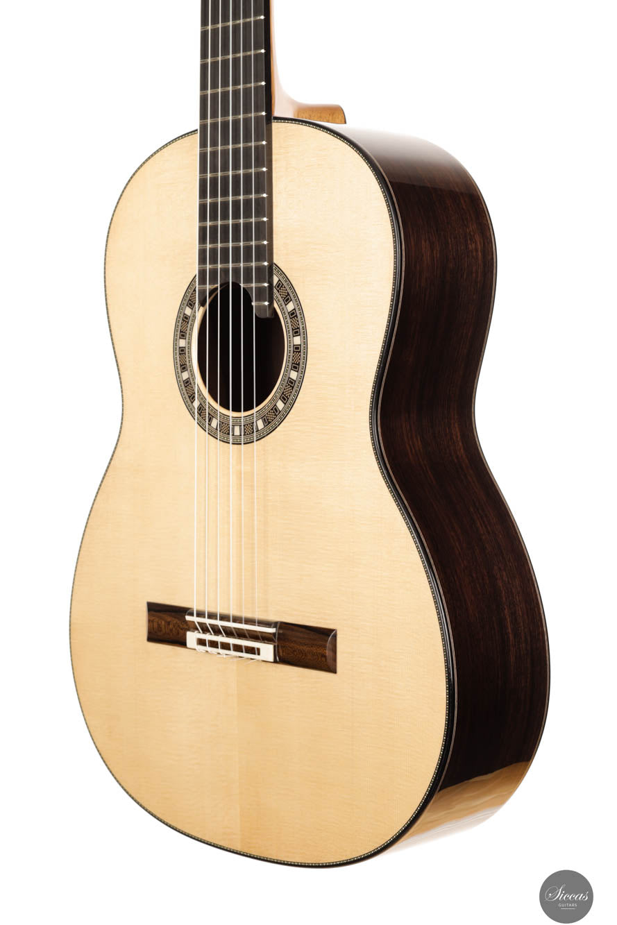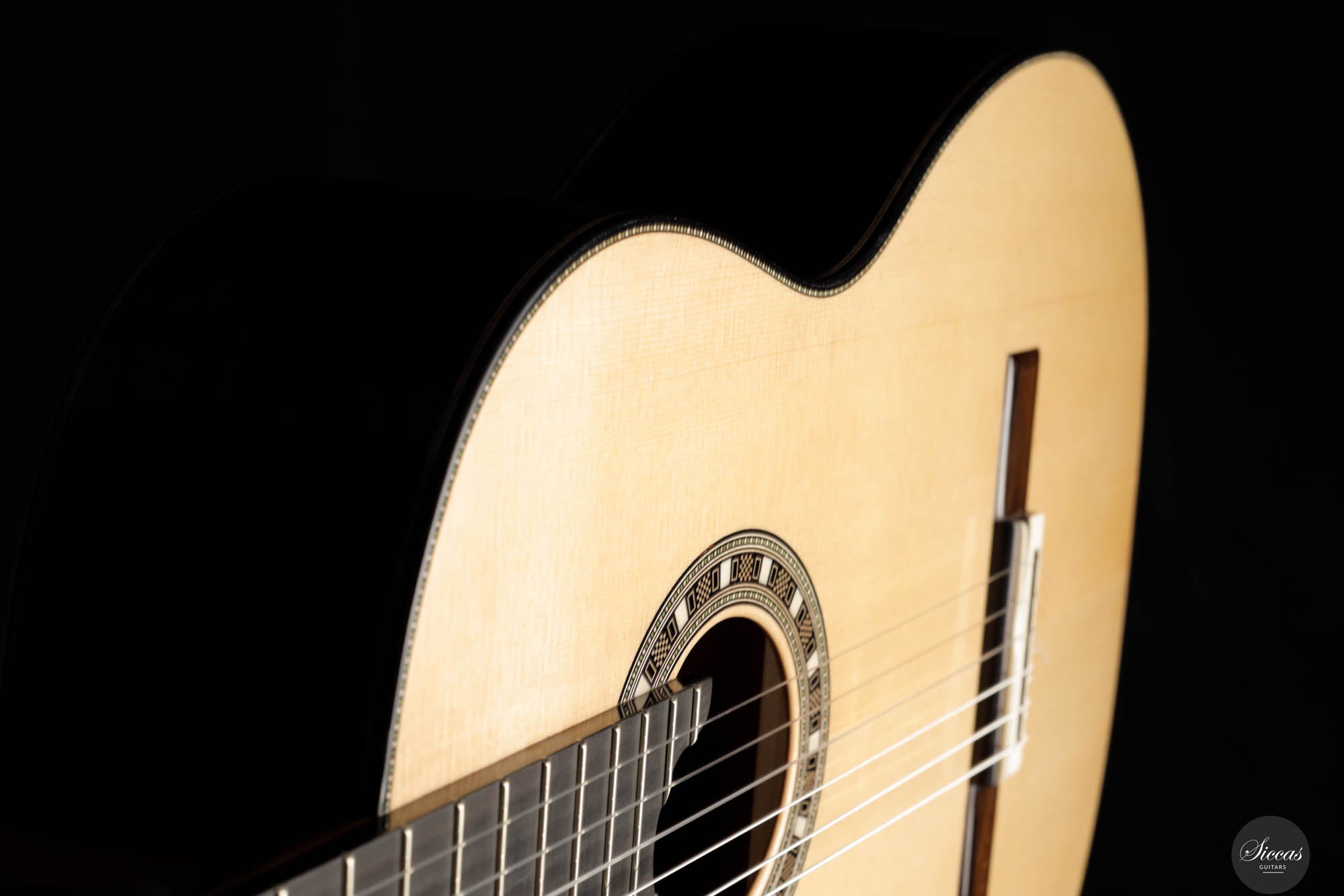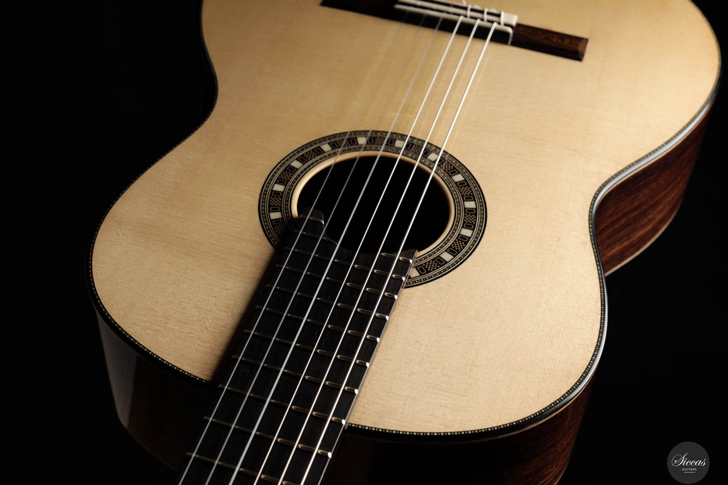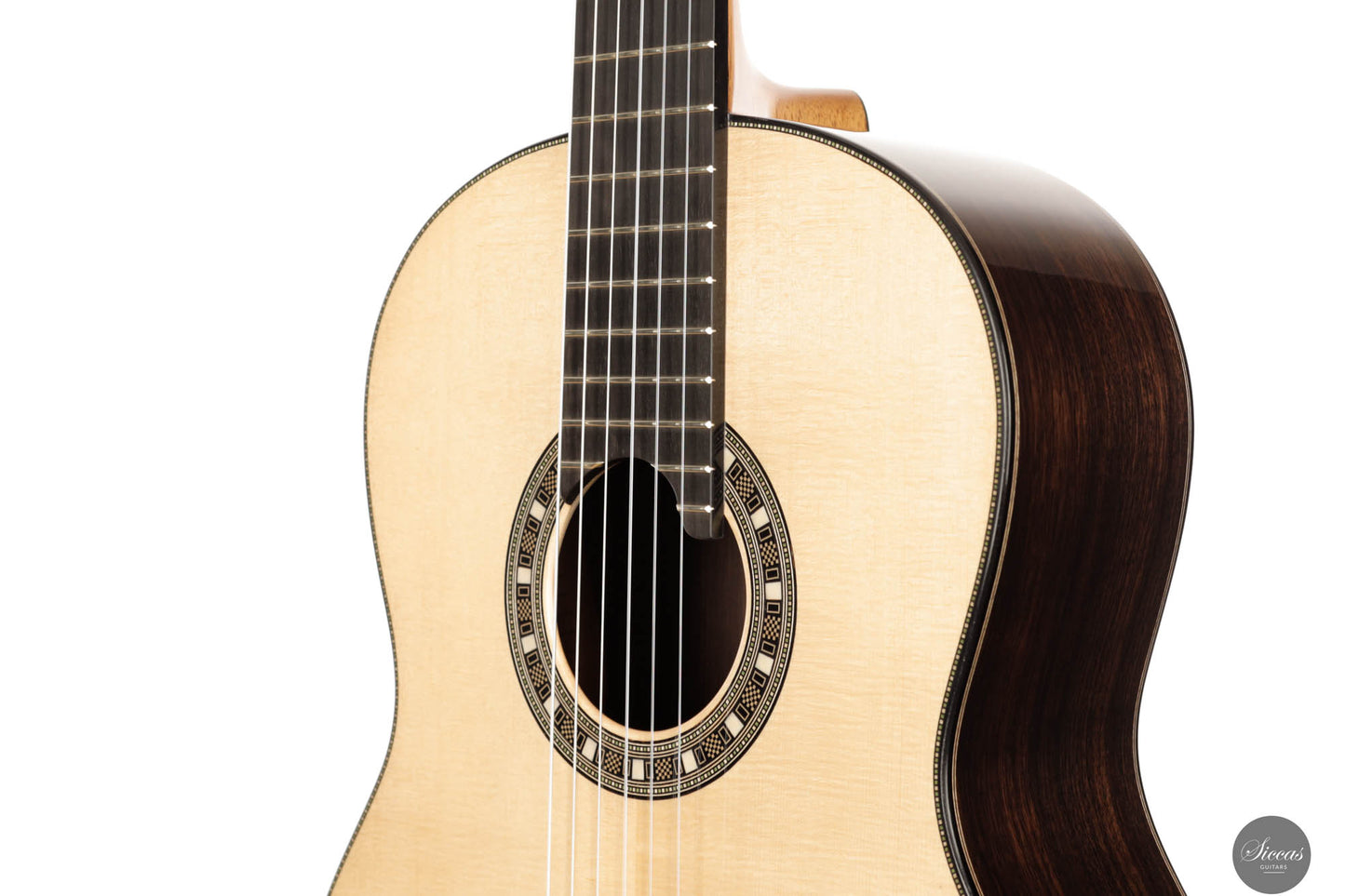 Die 2023er Gitarre von Alessandro Perciaccante verkörpert das Wesen des traditionellen spanischen Gitarrenbaus und fängt die Aufmerksamkeit der Musiker mit ihrer Schönheit und außergewöhnlichen Klangqualität ein. Sorgfältig gefertigt aus hochwertigen Materialien, verfügt diese Gitarre über eine Fichtenschalldecke in Kombination mit auffälligem Indische-Palisander für Rücken und Seiten, eine Kombination, die einen reichen, harmonisch lebendigen spanischen Klang erzeugt. Besonders beeindruckend sind die Bässe der Gitarre, die eine tiefe und resonante Qualität bieten und die gesamte klangliche Tiefe bereichern. Im Gegensatz dazu sind die Höhen süß und raffiniert, was einen reizvollen Ausgleich zu den robusten Bässen bietet und ein wunderschön harmonisches Klangprofil ergibt.
