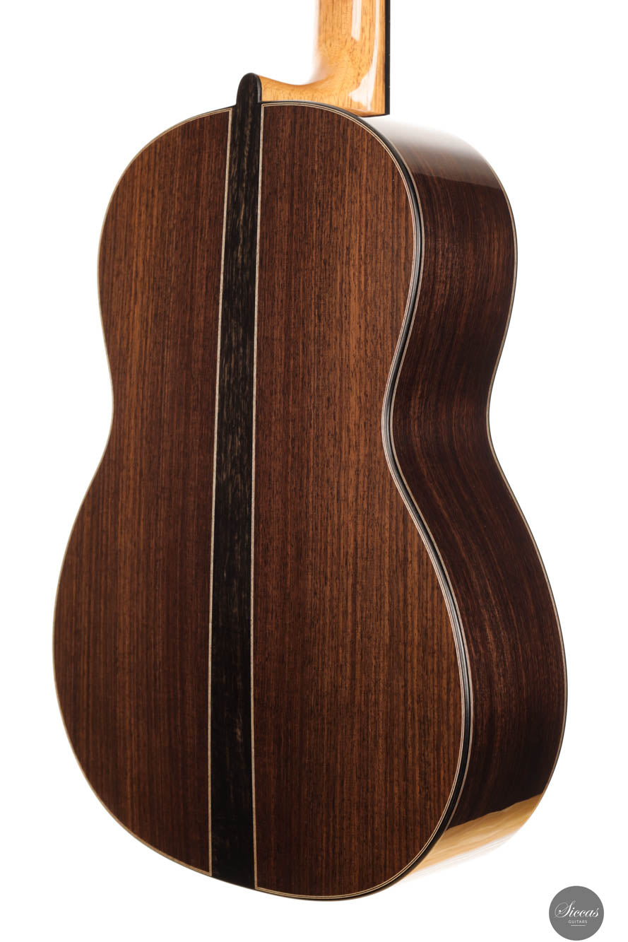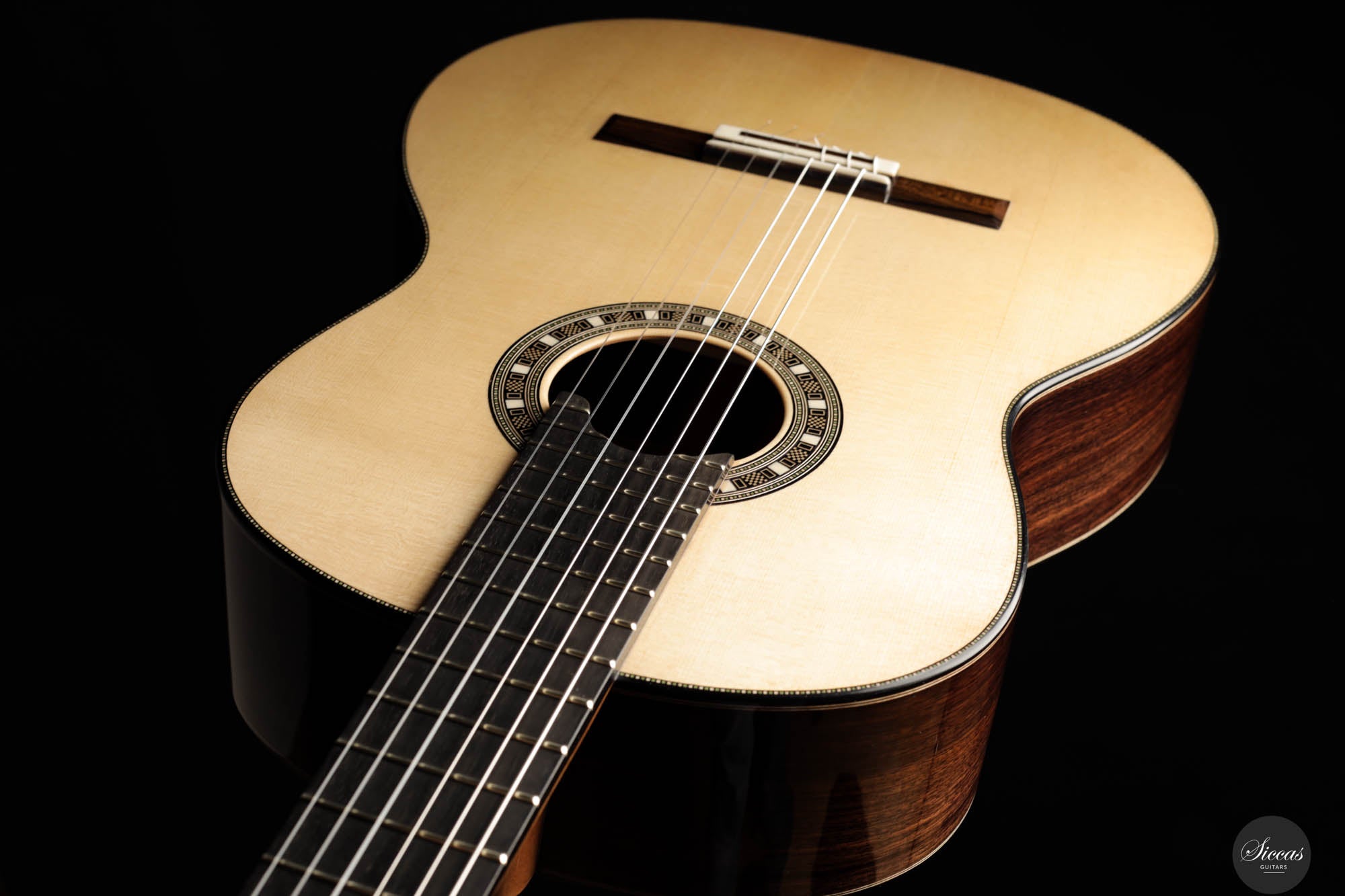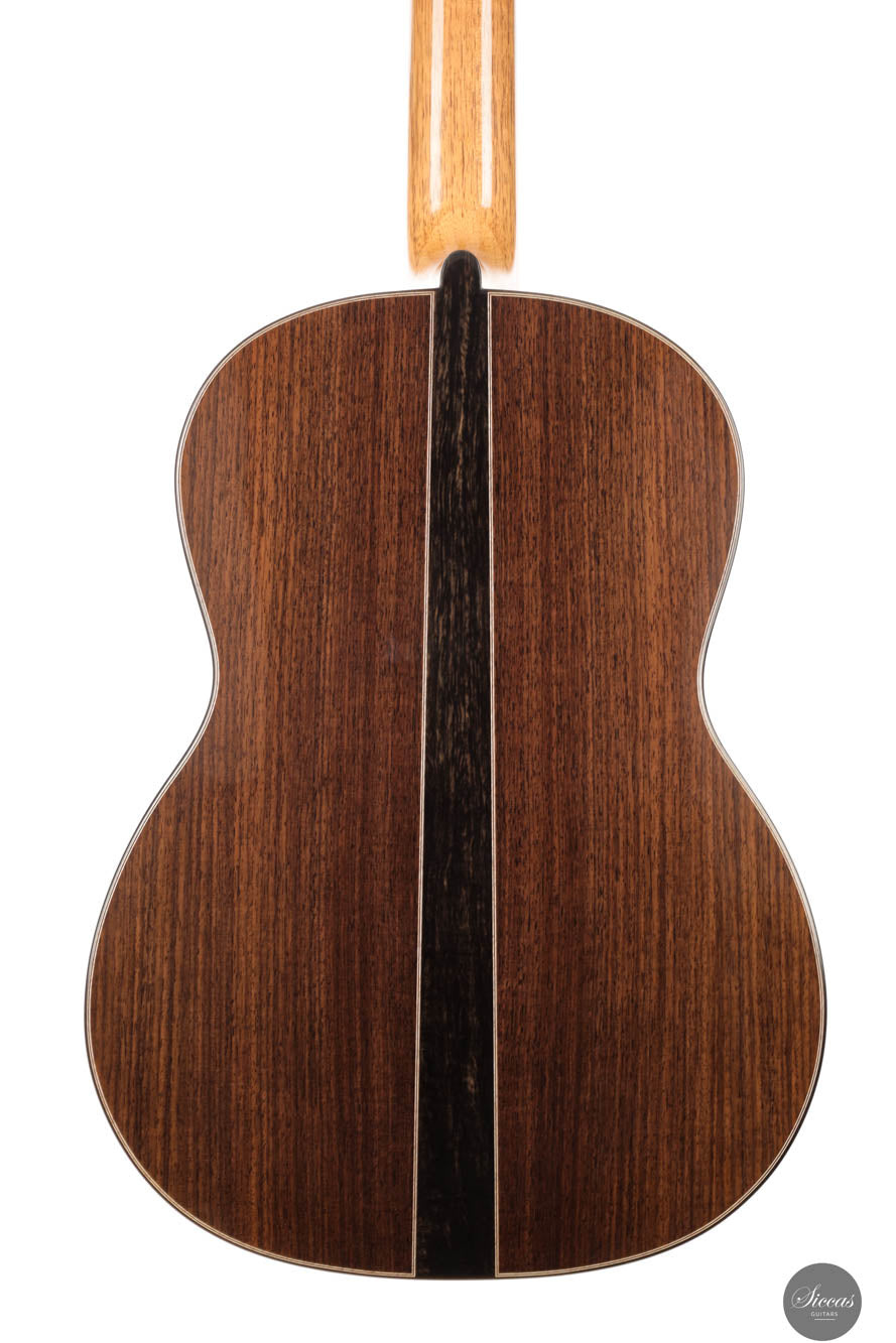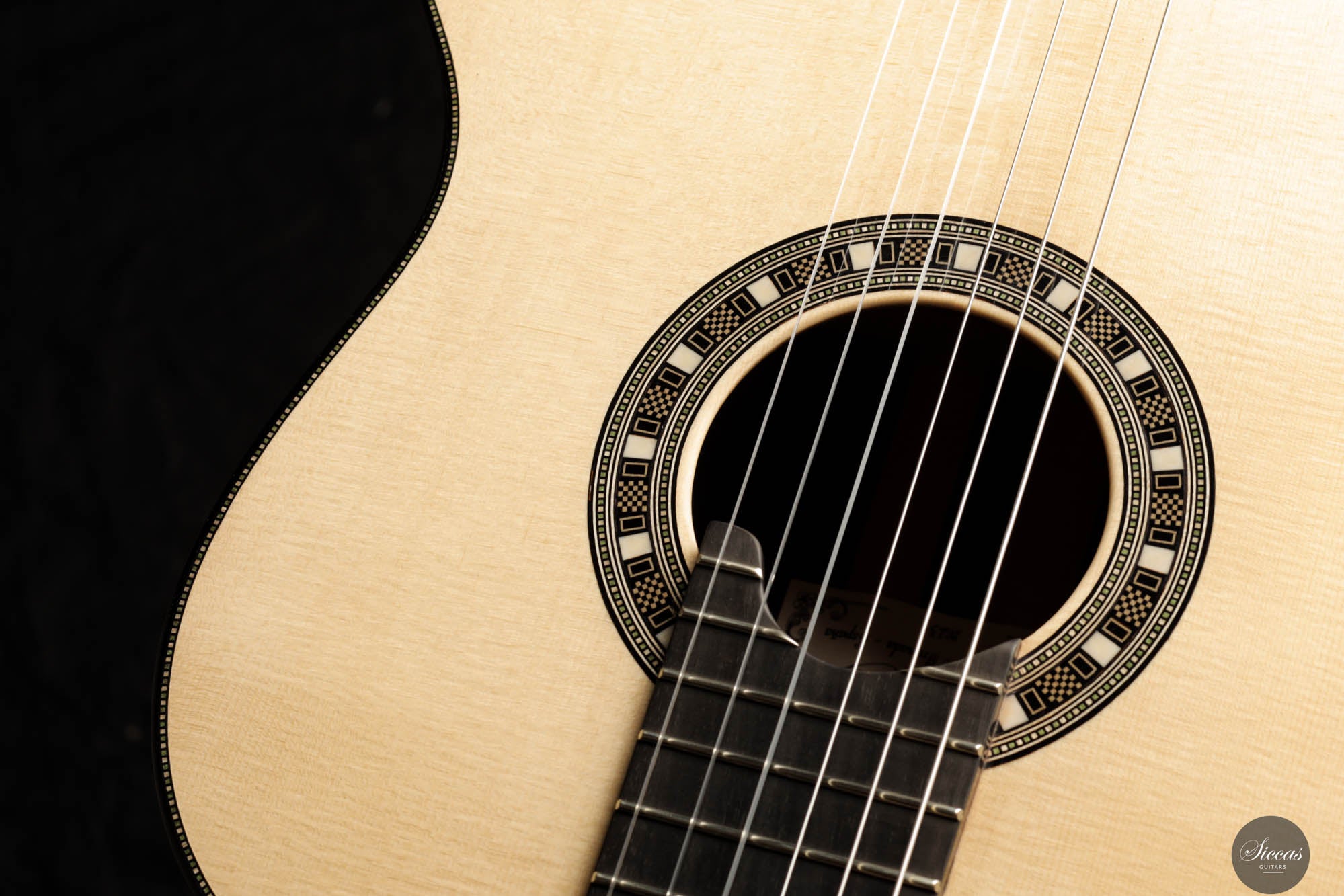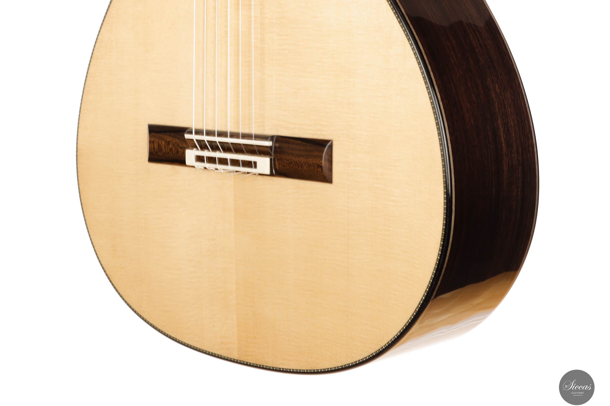 Die 2023er Gitarre von Alessandro Perciaccante verkörpert das Wesen des traditionellen spanischen Gitarrenbaus und fängt die Aufmerksamkeit der Musiker mit ihrer Schönheit und außergewöhnlichen Klangqualität ein. Sorgfältig gefertigt aus hochwertigen Materialien, verfügt diese Gitarre über eine Fichtenschalldecke in Kombination mit auffälligem Indische-Palisander für Rücken und Seiten, eine Kombination, die einen reichen, harmonisch lebendigen spanischen Klang erzeugt. Besonders beeindruckend sind die Bässe der Gitarre, die eine tiefe und resonante Qualität bieten und die gesamte klangliche Tiefe bereichern. Im Gegensatz dazu sind die Höhen süß und raffiniert, was einen reizvollen Ausgleich zu den robusten Bässen bietet und ein wunderschön harmonisches Klangprofil ergibt.