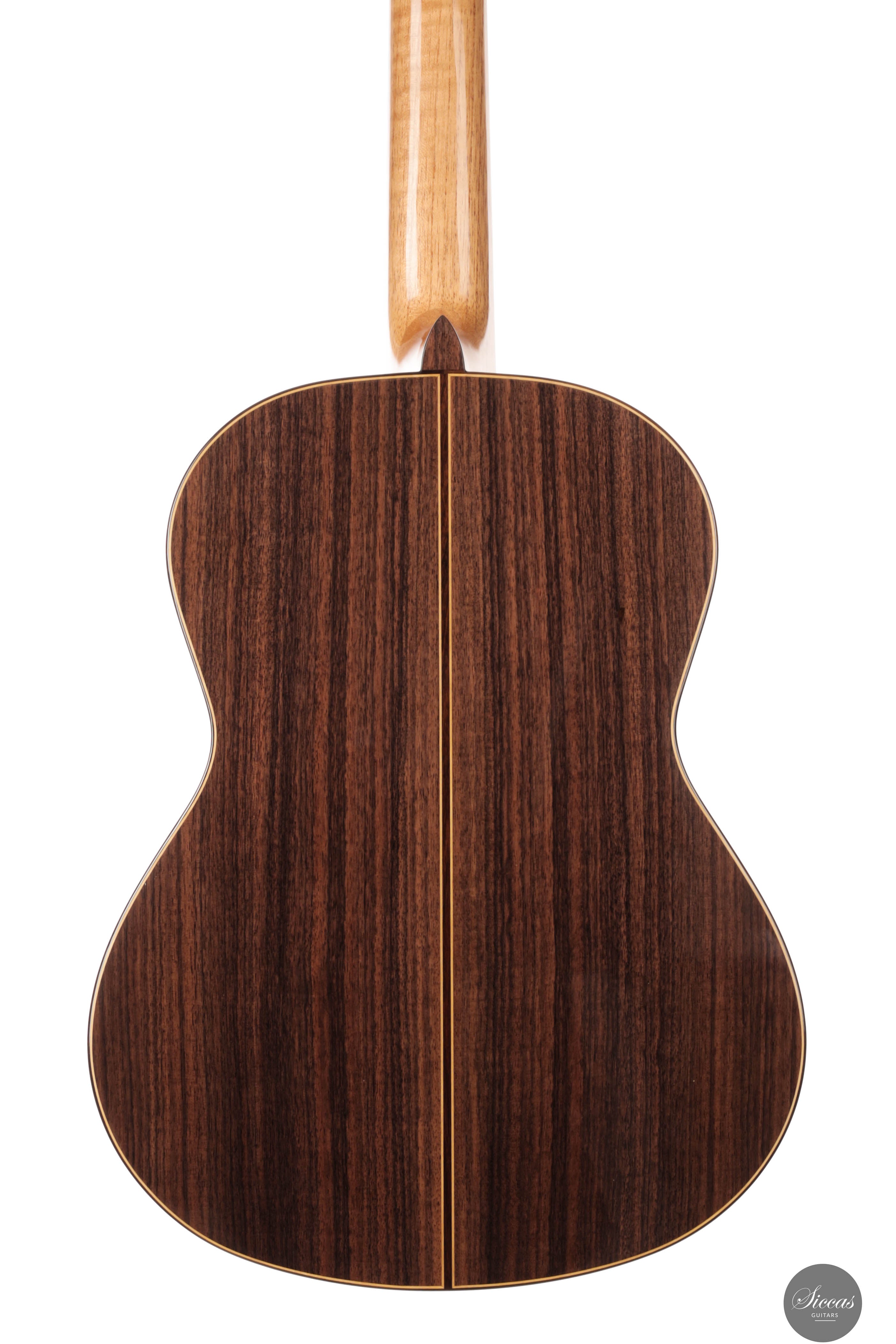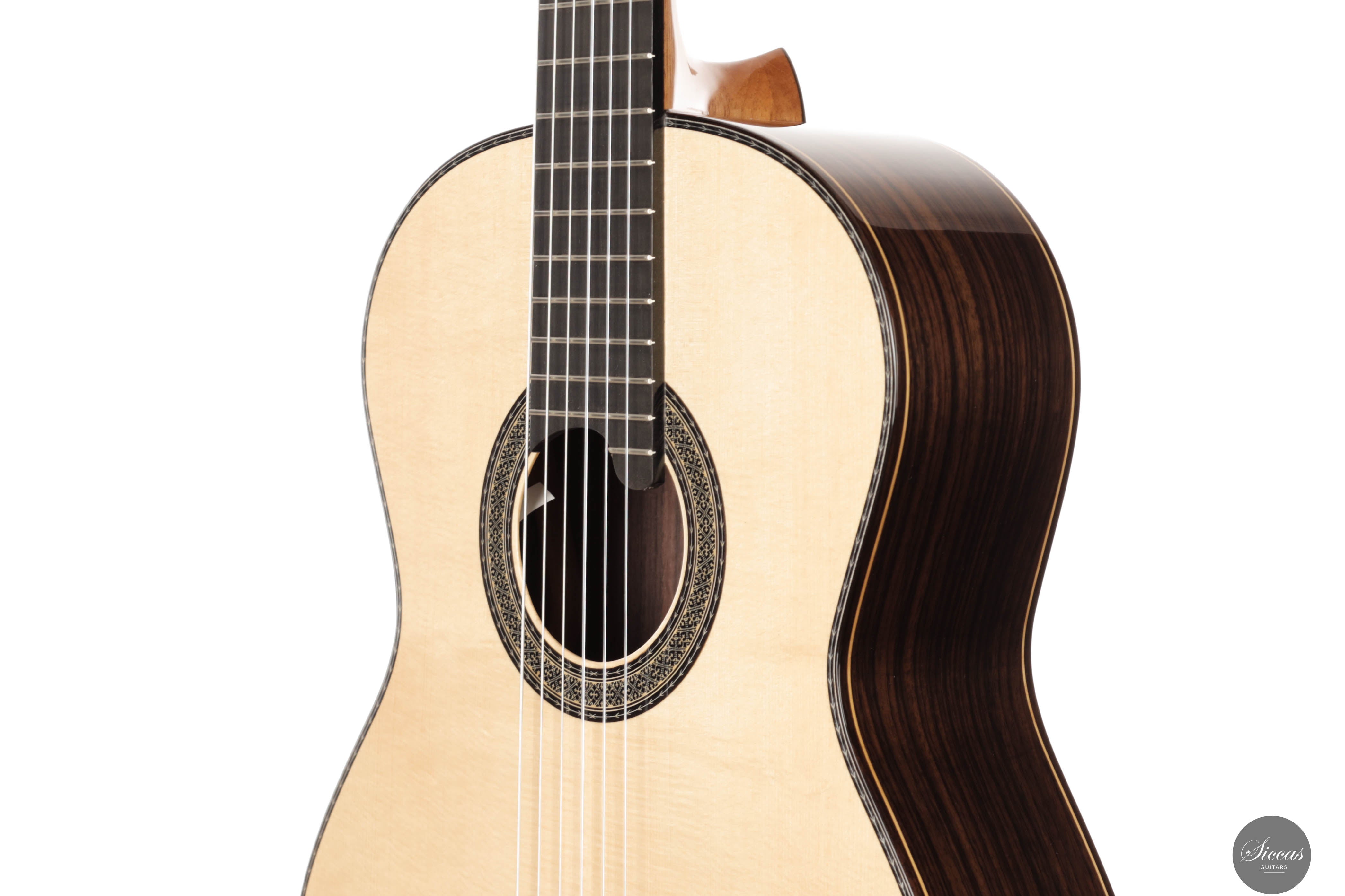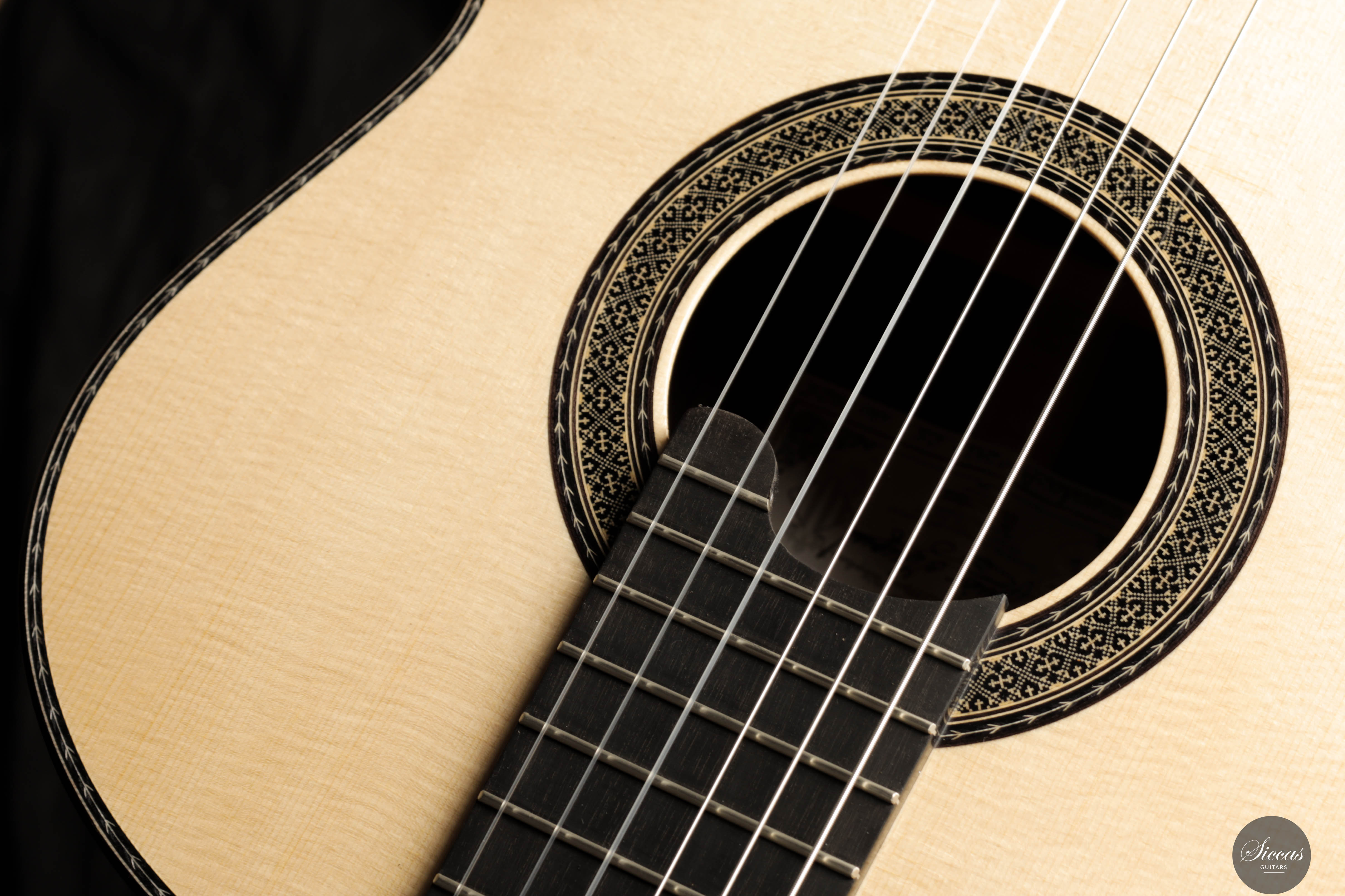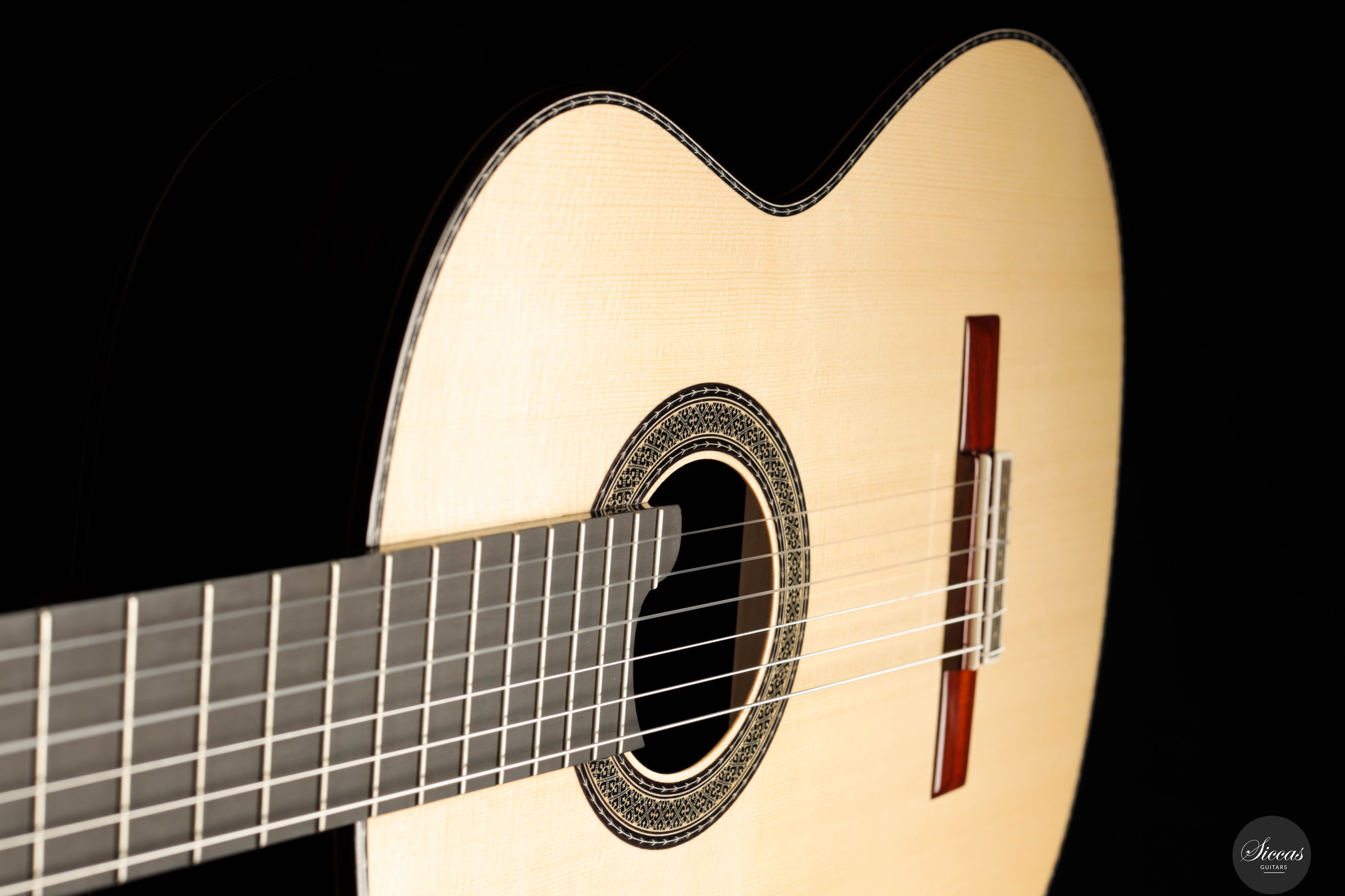 This 2025 Deseada, numbered 241, is a special edition built exclusively for Siccas Guitars. It is distinguished by a custom rosette designed specifically for this series, adding a unique visual identity to an already celebrated model. Crafted using traditional Spanish construction techniques, it features a spruce top paired with Indian rosewood back and sides, offering a warm, rich tonal character with clear projection and excellent balance across the registers. The guitar delivers a full, melodic voice with strong overtones and a resonant core, ideal for both intimate settings and large concert venues. The instrument’s lightweight design and precise neck profile contribute to exceptional playing comfort, allowing extended performance sessions without fatigue. Its powerful sound and refined aesthetic make it equally suited for recording and live performance. Equipped with Alessi tuners, a 650 mm scale length, and a 51 mm nut, the guitar offers a smooth and responsive playing experience. The nitrocellulose finish on the body enhances durability while the shellac-polished soundboard ensures maximum freedom of the top. With thoughtful features and a strong artistic identity, this special edition of the Deseada represents the pinnacle of Javier Mengual’s craftsmanship and a great opportunity for enthusiasts and performers alike.Regelmäßige Pflege verlängert die Lebensdauer des Instruments