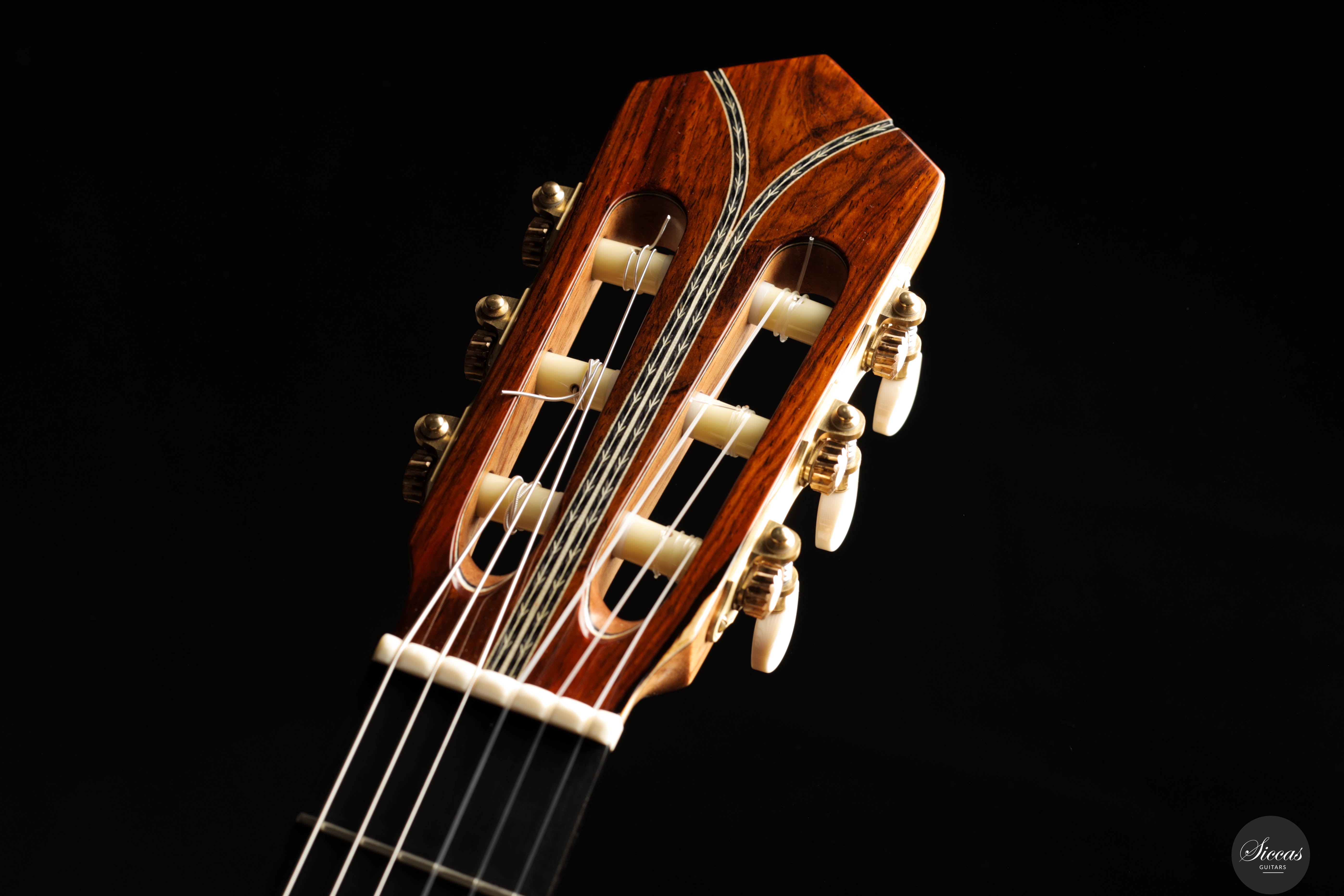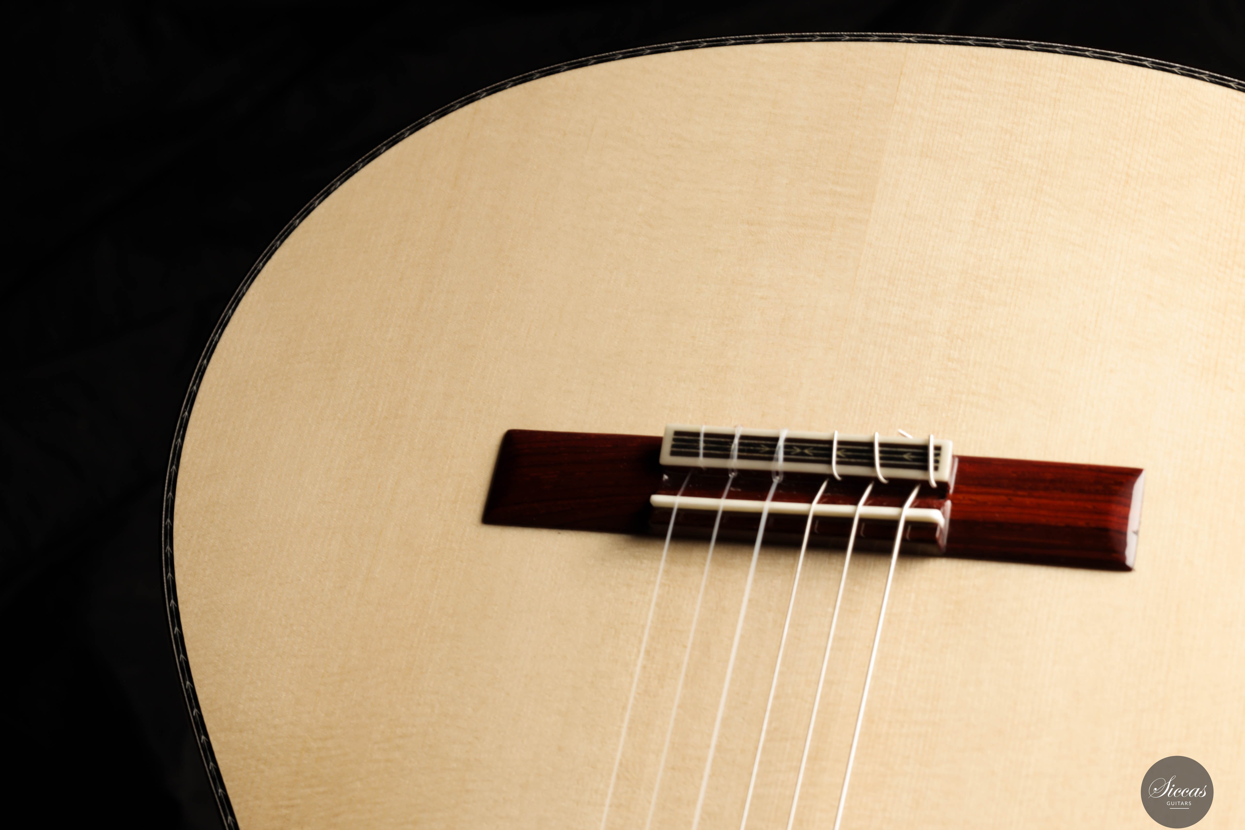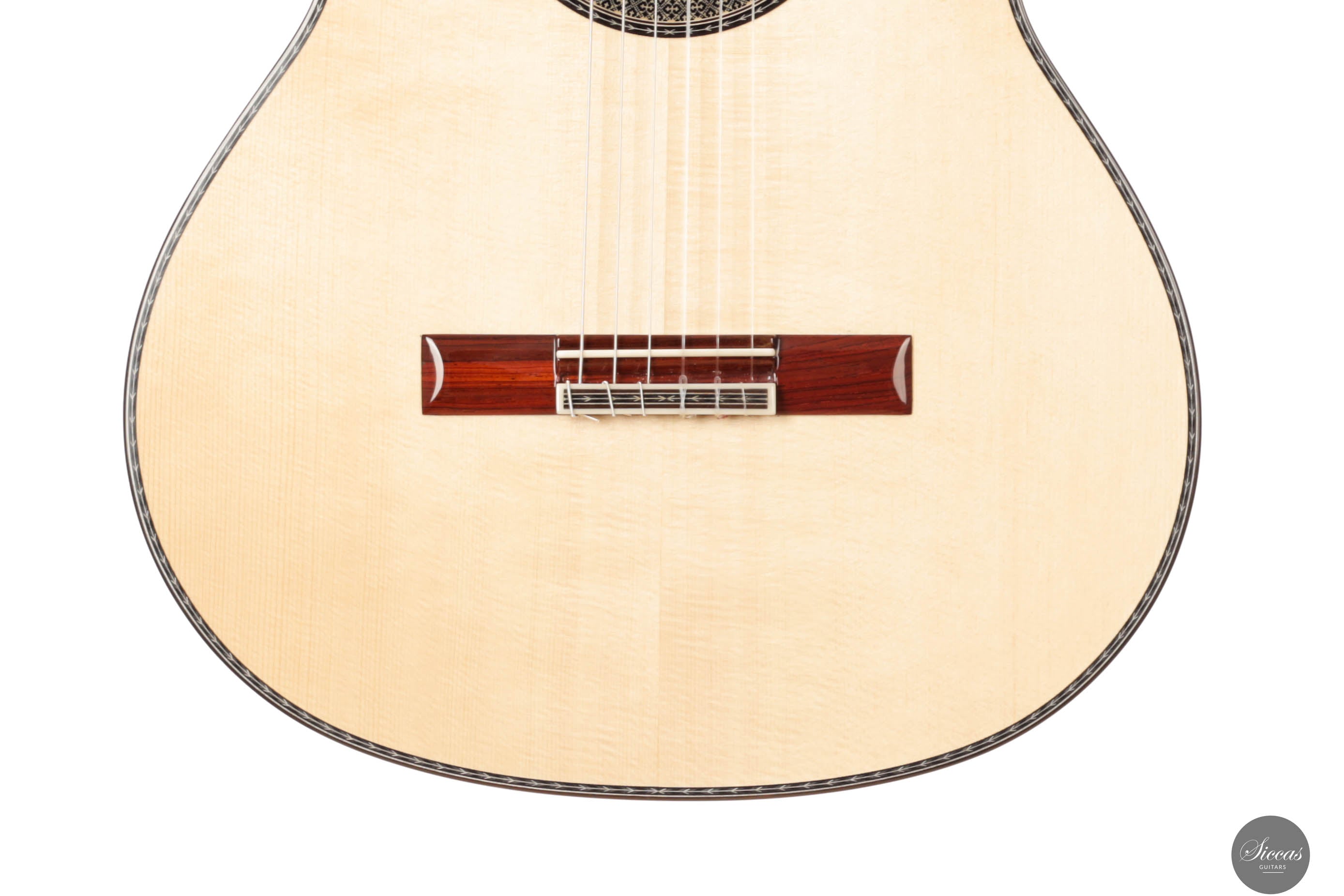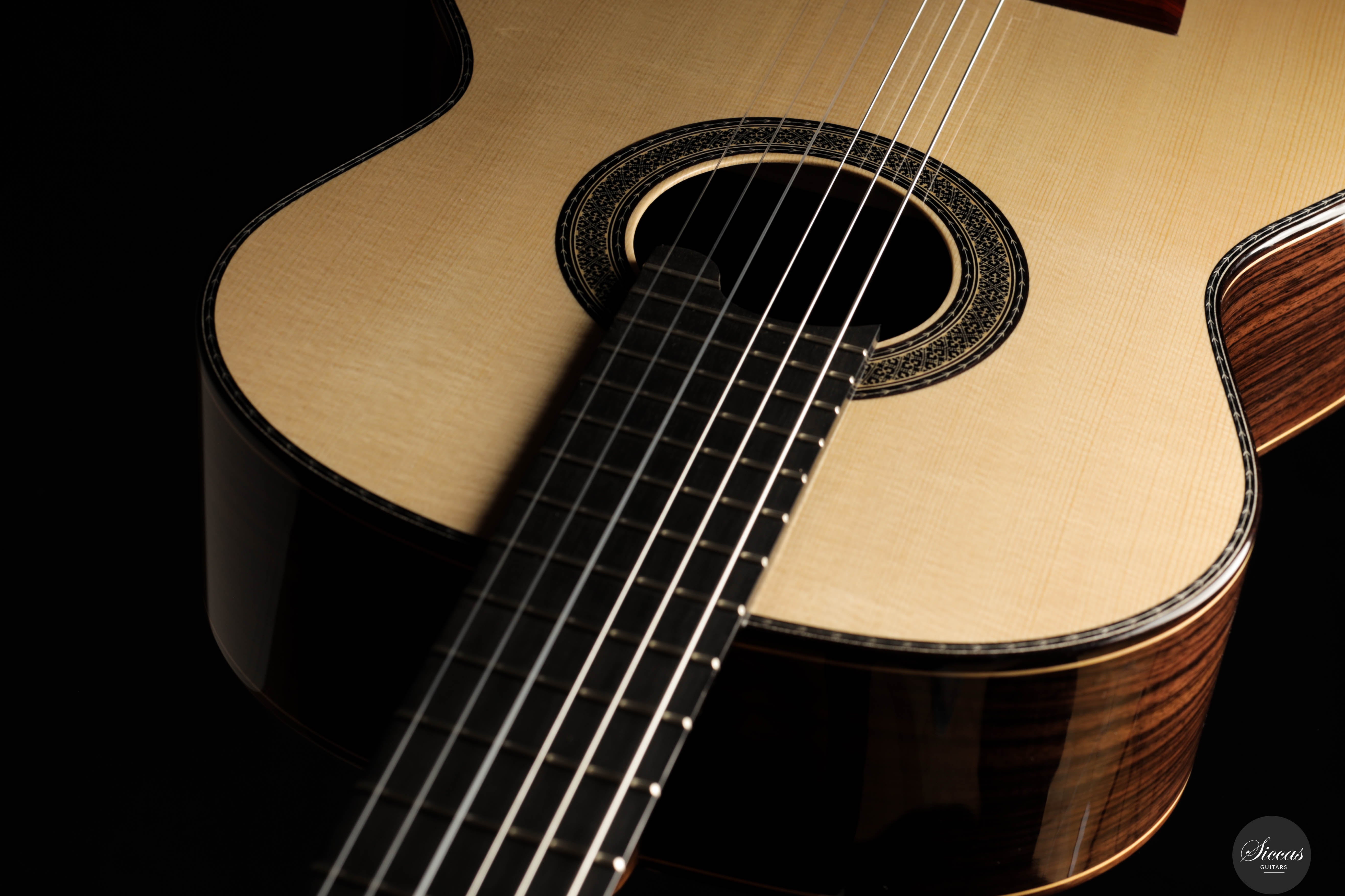 This 2025 Deseada, numbered 241, is a special edition built exclusively for Siccas Guitars. It is distinguished by a custom rosette designed specifically for this series, adding a unique visual identity to an already celebrated model. Crafted using traditional Spanish construction techniques, it features a spruce top paired with Indian rosewood back and sides, offering a warm, rich tonal character with clear projection and excellent balance across the registers. The guitar delivers a full, melodic voice with strong overtones and a resonant core, ideal for both intimate settings and large concert venues. The instrument’s lightweight design and precise neck profile contribute to exceptional playing comfort, allowing extended performance sessions without fatigue. Its powerful sound and refined aesthetic make it equally suited for recording and live performance. Equipped with Alessi tuners, a 650 mm scale length, and a 51 mm nut, the guitar offers a smooth and responsive playing experience. The nitrocellulose finish on the body enhances durability while the shellac-polished soundboard ensures maximum freedom of the top. With thoughtful features and a strong artistic identity, this special edition of the Deseada represents the pinnacle of Javier Mengual’s craftsmanship and a great opportunity for enthusiasts and performers alike.Regelmäßige Pflege verlängert die Lebensdauer des Instruments