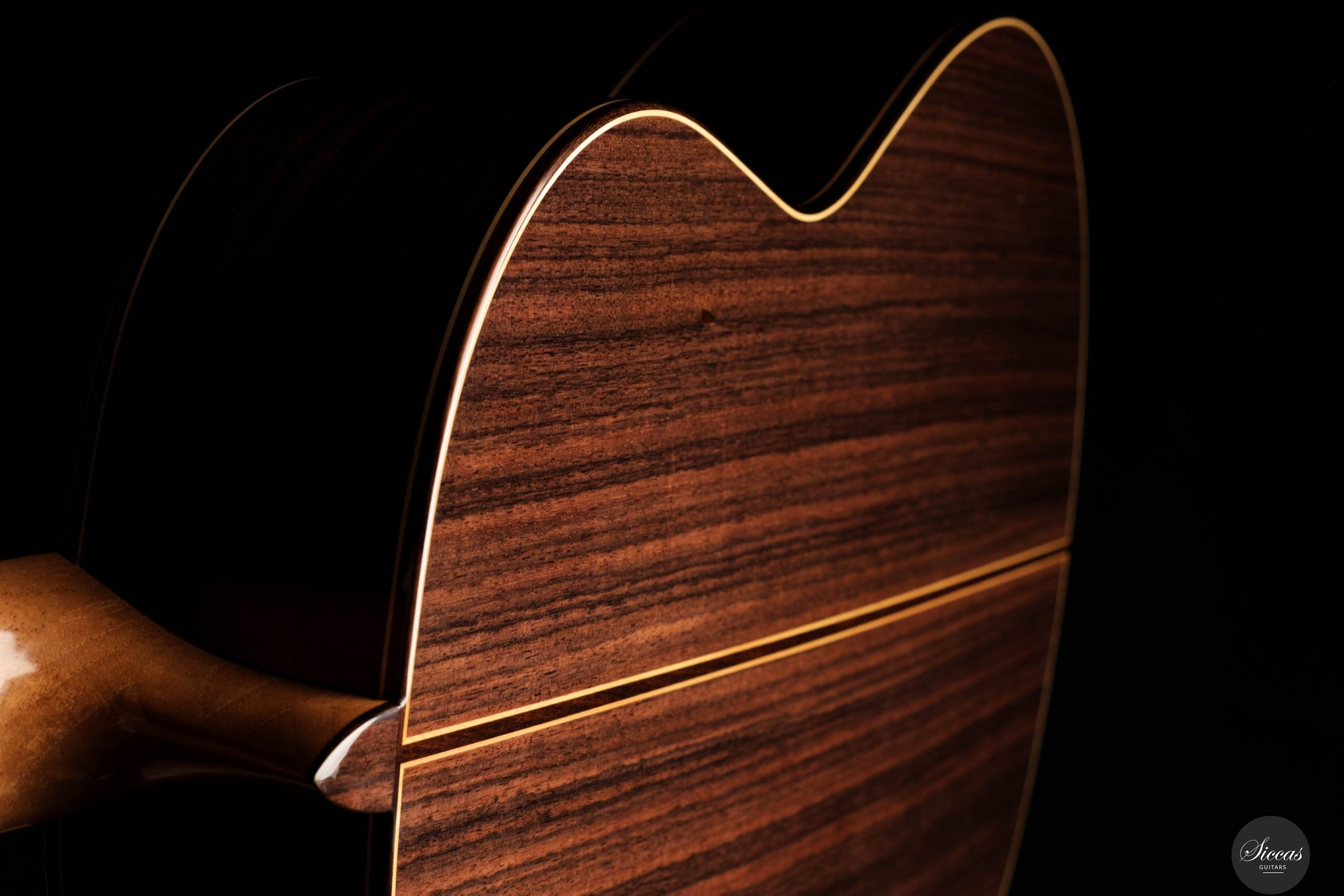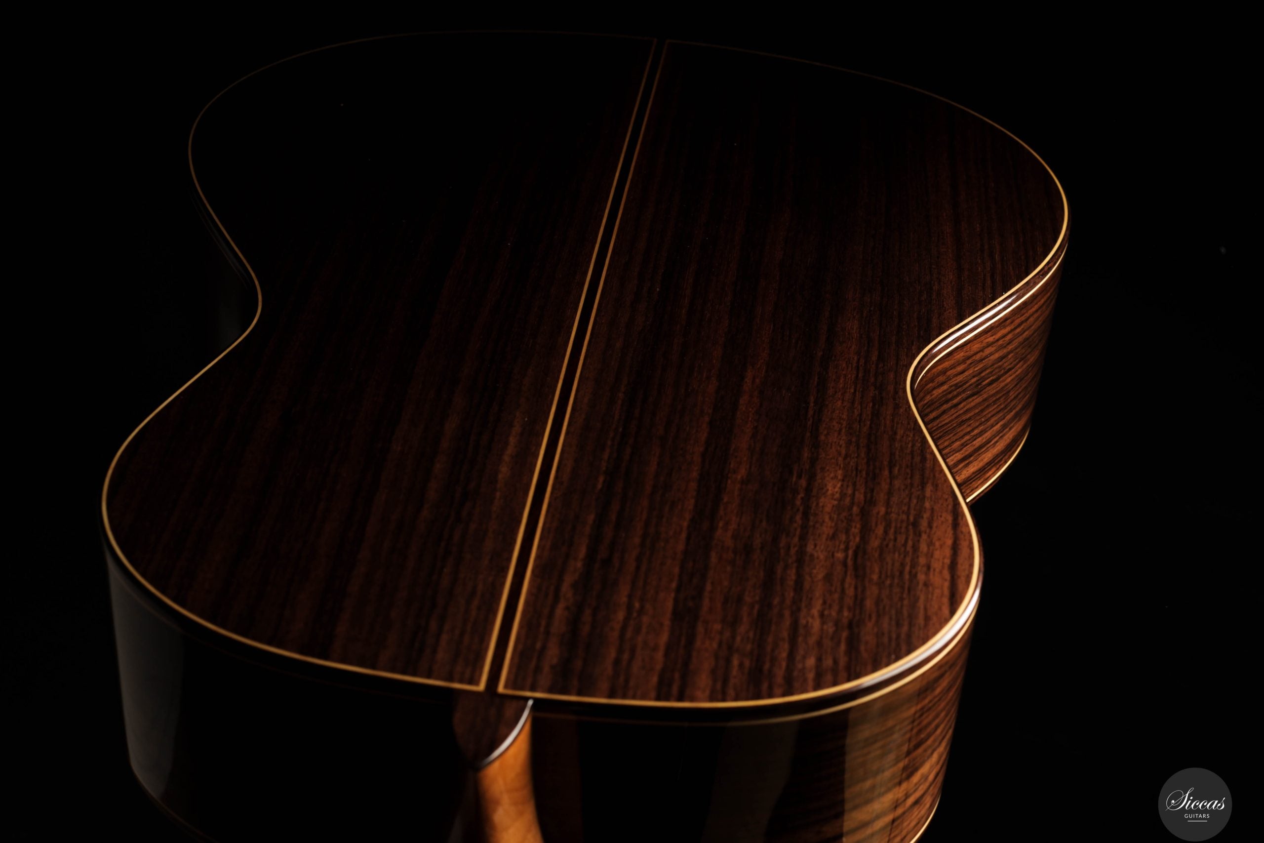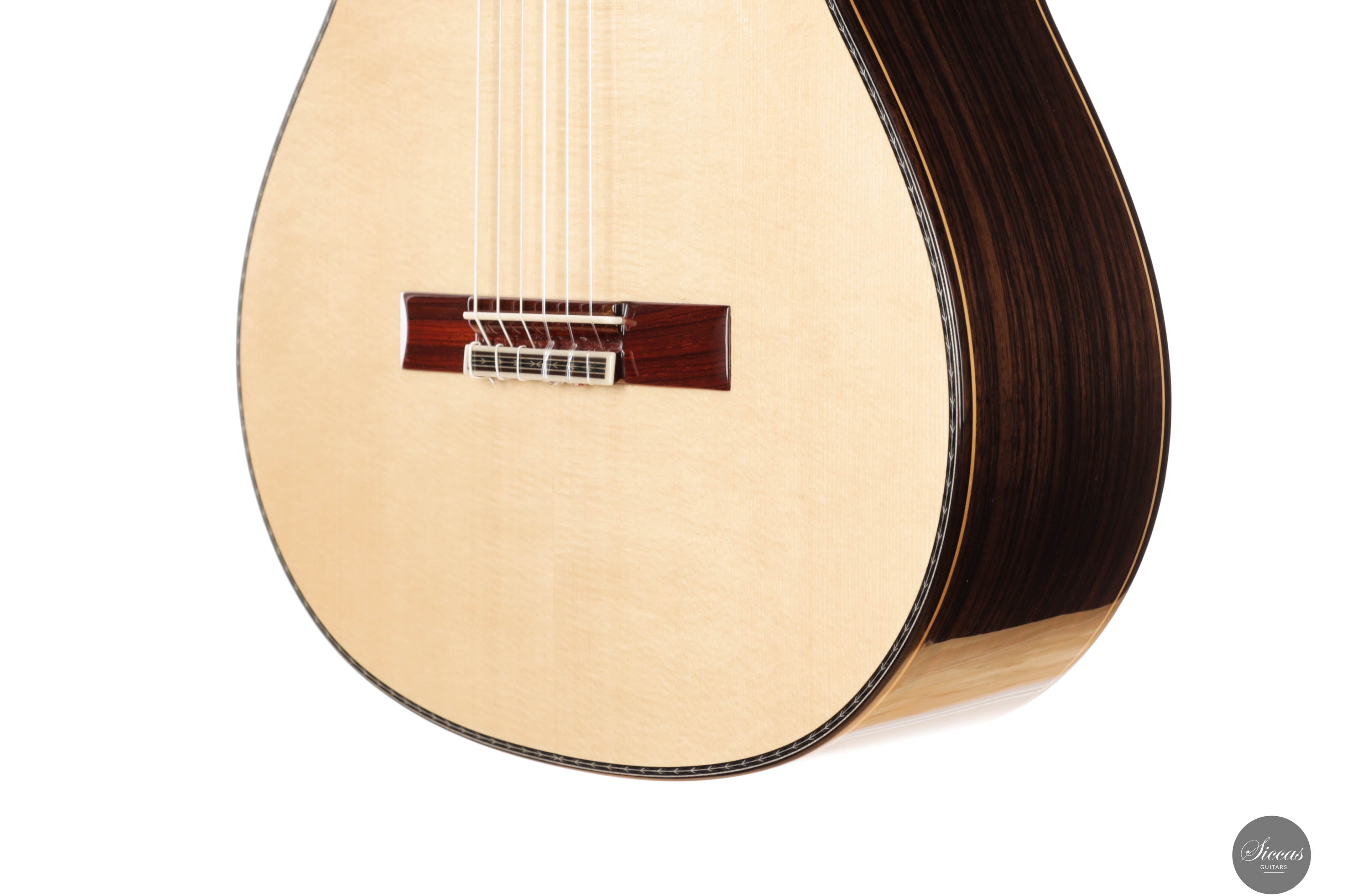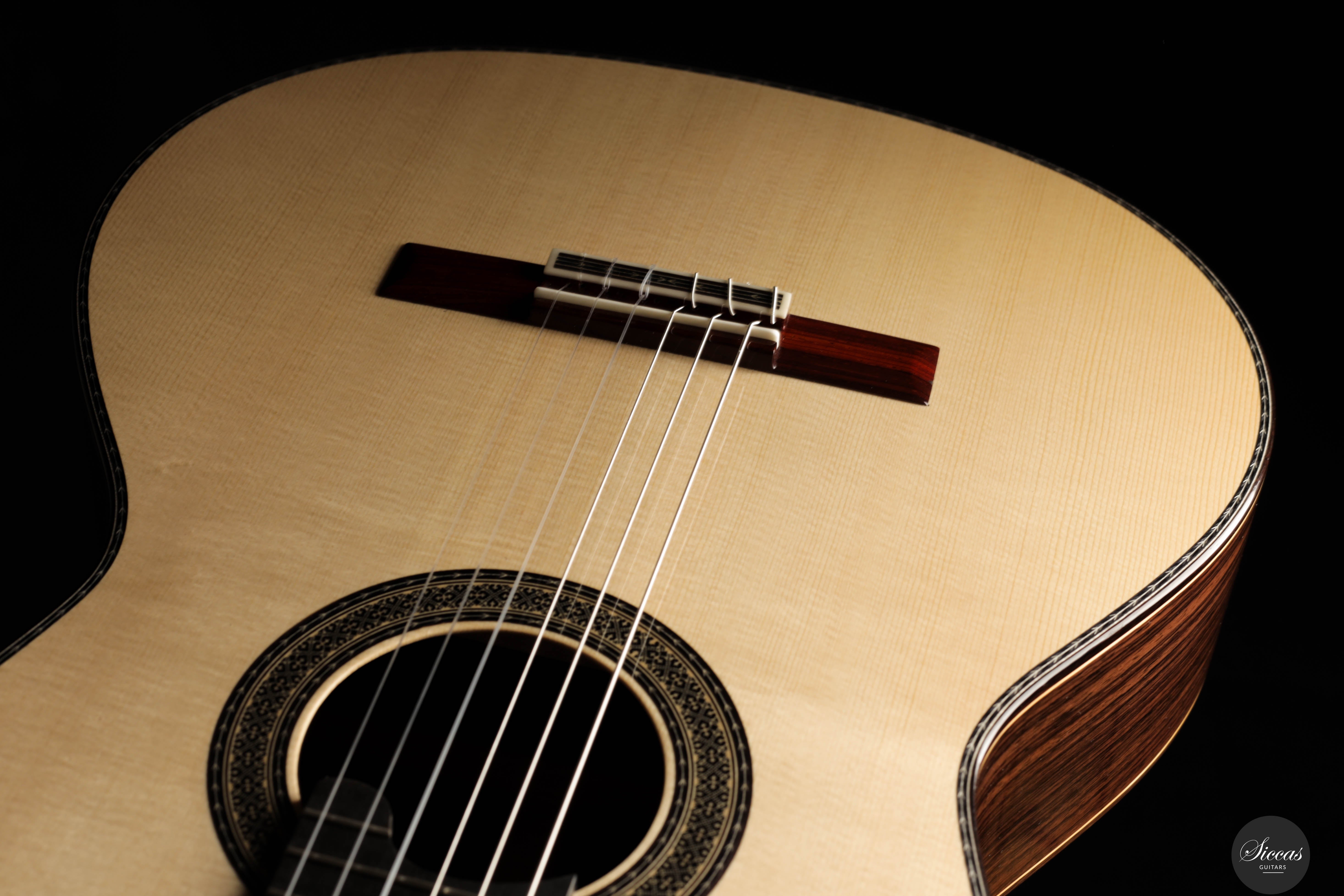 This 2025 Deseada, numbered 241, is a special edition built exclusively for Siccas Guitars. It is distinguished by a custom rosette designed specifically for this series, adding a unique visual identity to an already celebrated model. Crafted using traditional Spanish construction techniques, it features a spruce top paired with Indian rosewood back and sides, offering a warm, rich tonal character with clear projection and excellent balance across the registers. The guitar delivers a full, melodic voice with strong overtones and a resonant core, ideal for both intimate settings and large concert venues. The instrument’s lightweight design and precise neck profile contribute to exceptional playing comfort, allowing extended performance sessions without fatigue. Its powerful sound and refined aesthetic make it equally suited for recording and live performance. Equipped with Alessi tuners, a 650 mm scale length, and a 51 mm nut, the guitar offers a smooth and responsive playing experience. The nitrocellulose finish on the body enhances durability while the shellac-polished soundboard ensures maximum freedom of the top. With thoughtful features and a strong artistic identity, this special edition of the Deseada represents the pinnacle of Javier Mengual’s craftsmanship and a great opportunity for enthusiasts and performers alike.Regelmäßige Pflege verlängert die Lebensdauer des Instruments