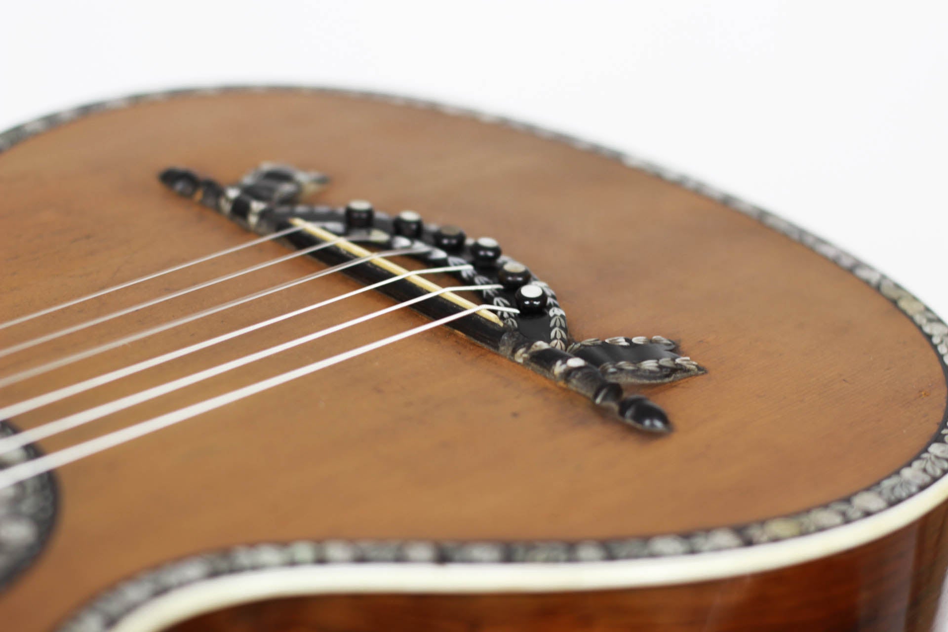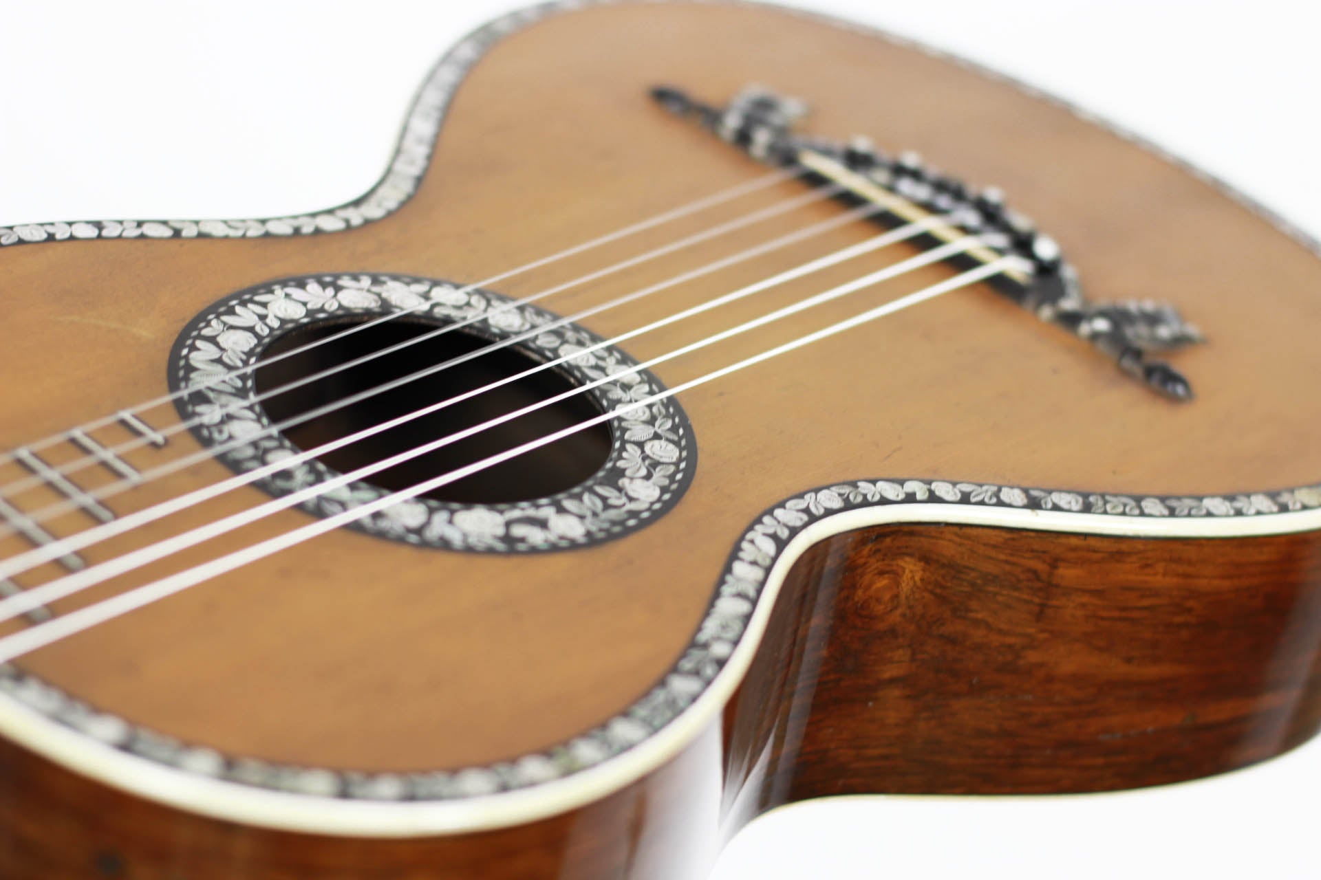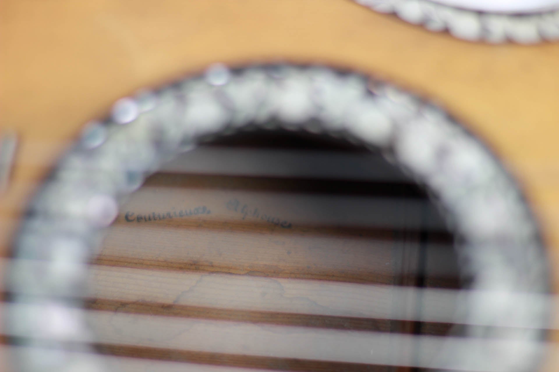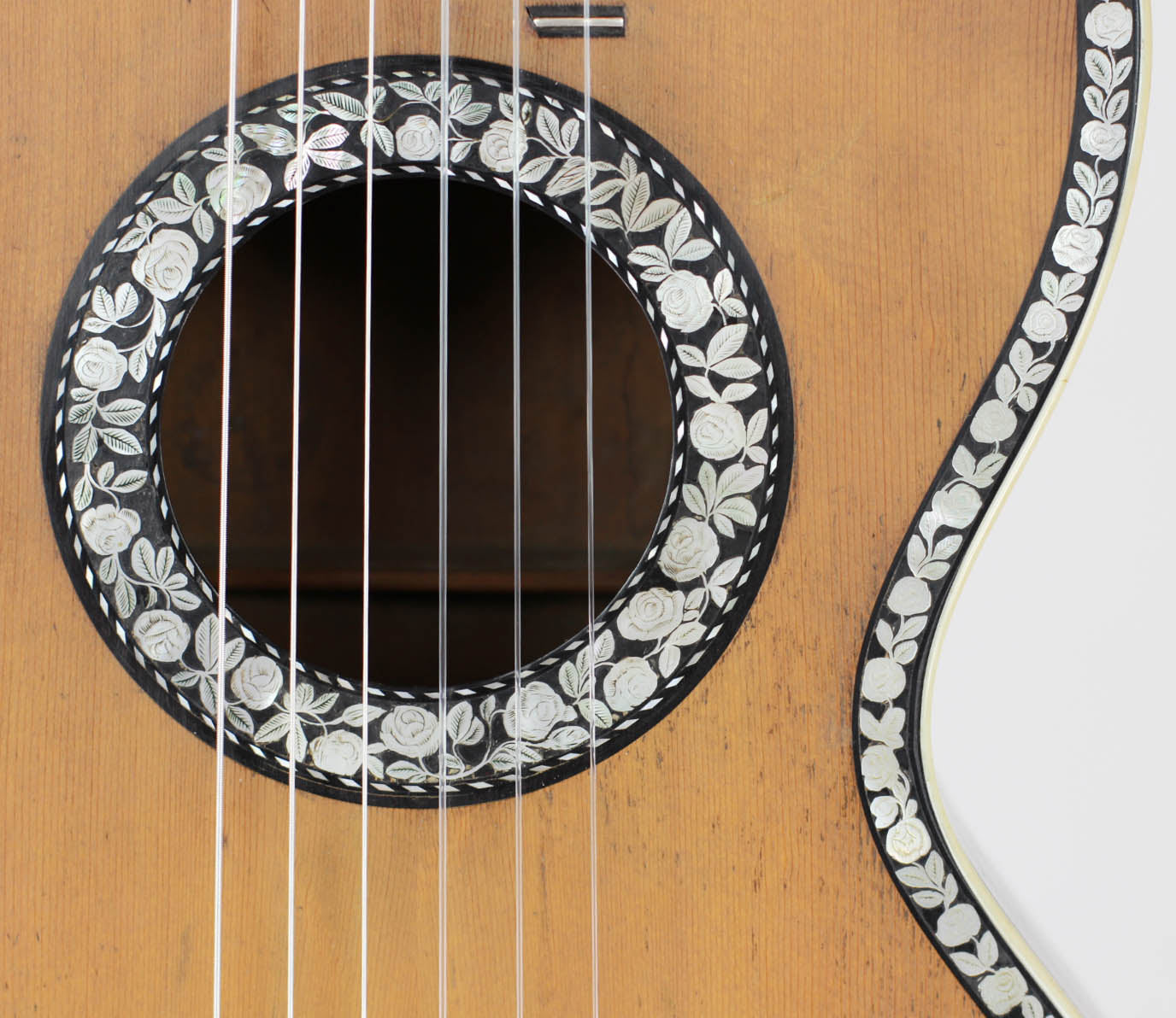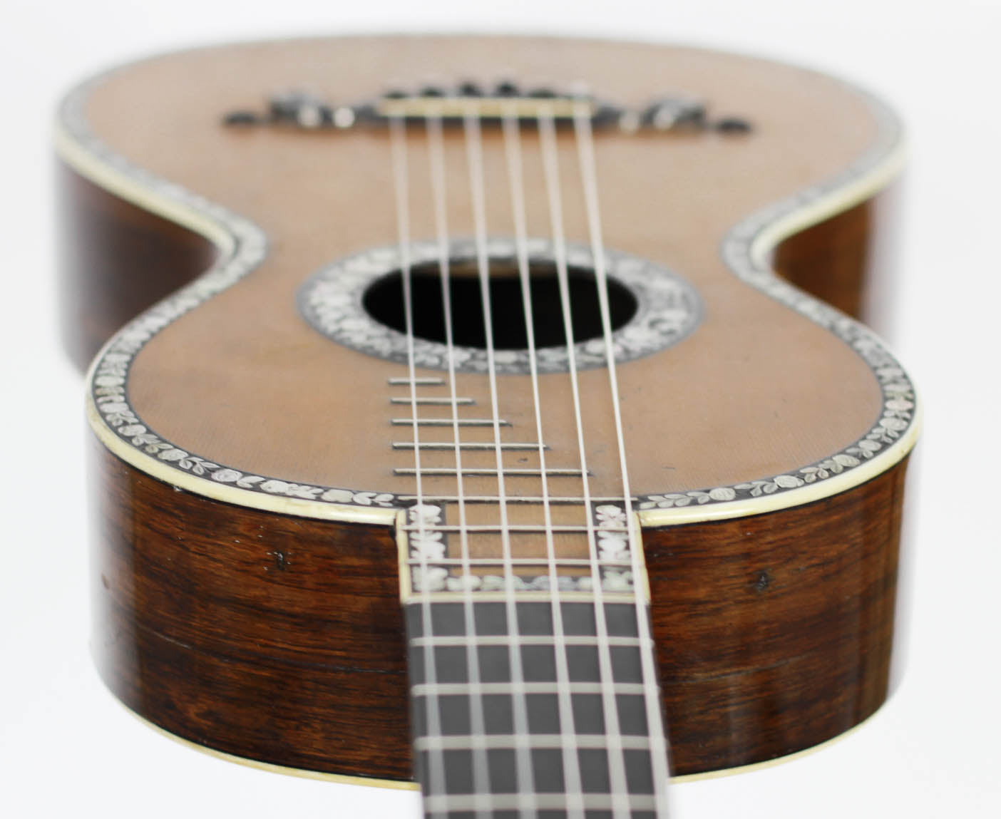 Diese Gitarre stammt aus der Werkstatt von Alphonse Couturieux (siehe Stempel auf dem Boden)und wurde circa 1830 gebaut. Die reichlich mit Perlmutt verzierte Gitarre erinnerte an die Gitarren aus dem Workshop Aubry-Maire. Die Decke ist aus feinjähriger Fichte, der Boden und die Zargen sind aus Palisander. Der Boden ist im Inneren mit einem Fichtenfurnier belegt. Bis auf leichte Gebrauchspuren ist die Gitarre in einem sehr guten Zustand und perfekt spielbar.
