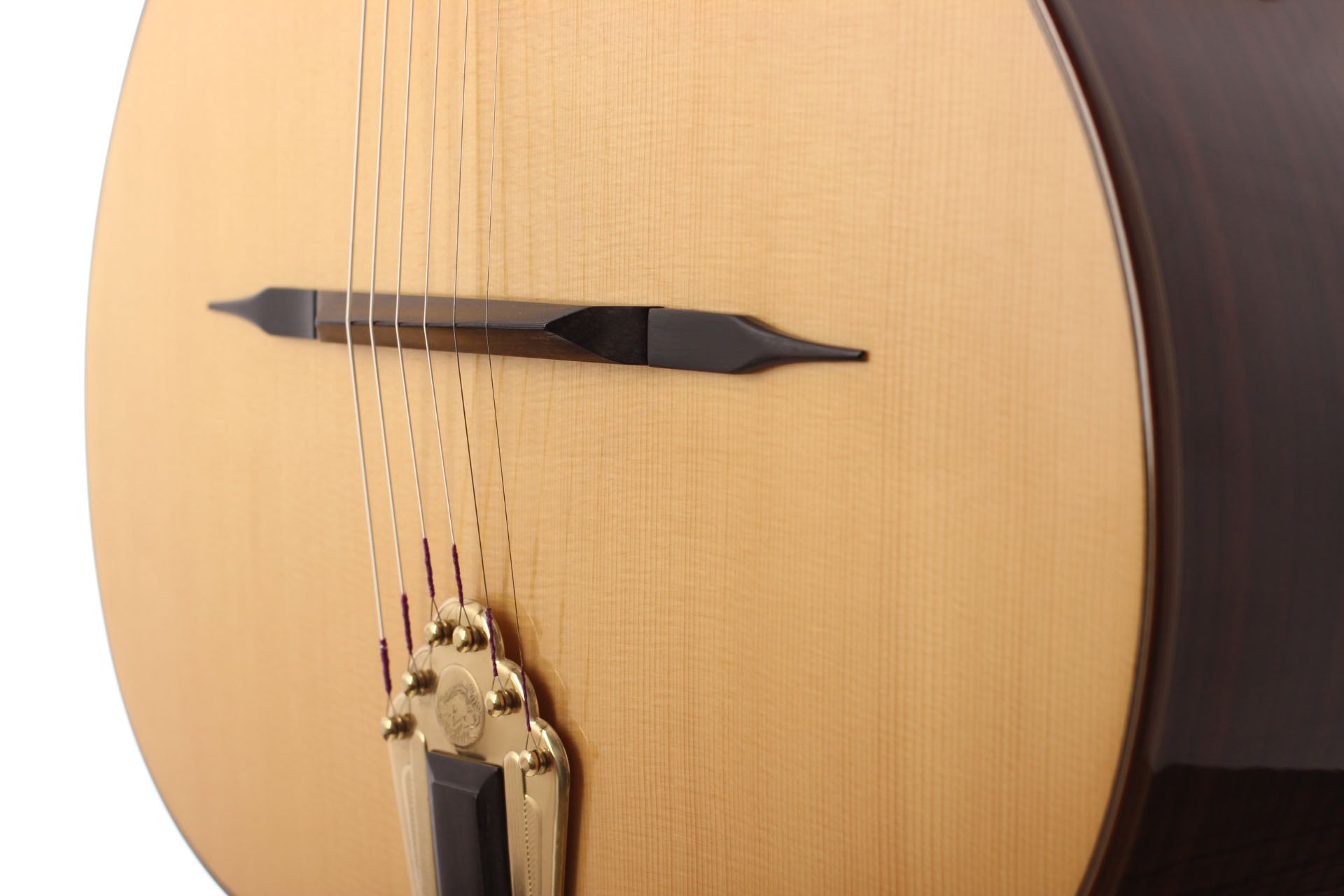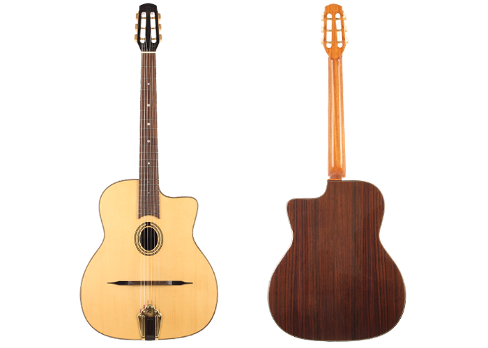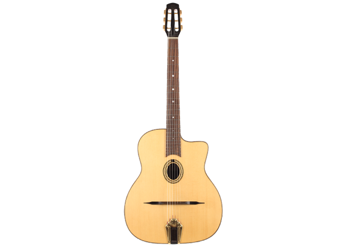 Das "M" steht für die Initialen des legendären Gitarrenbauers Mario Maccaferri, der diese Art Gitarre entwickelte und die in Zusammenarbeit mit dem französischen Hersteller Selmer von 1932 bis etwa 1952 gebaut wurde. Obwohl Maccaferris Zusammenarbeit mit Selmer 1934 endete, stellte die Firma noch bis 1952 mehrere Modelle dieser Gitarre her. Es war Django Reinhard, der die Selmer-Maccaferri-Gitarren mit ihrem typischen perkussiven Ton und seiner Spielweise populär gemacht hat. Somit ist das Selmer Maccaferri-Modell mit seinem relativ großen Korpus und dem entweder ovalen "Petite Bouche"- oder D-förmigen "Grande Bouche"-Schallloch ein unverzichtbares Element für jeden Gitarristen, der das inspirierende und faszinierende Repertoire des Gypsy Jazz erkunden möchte.