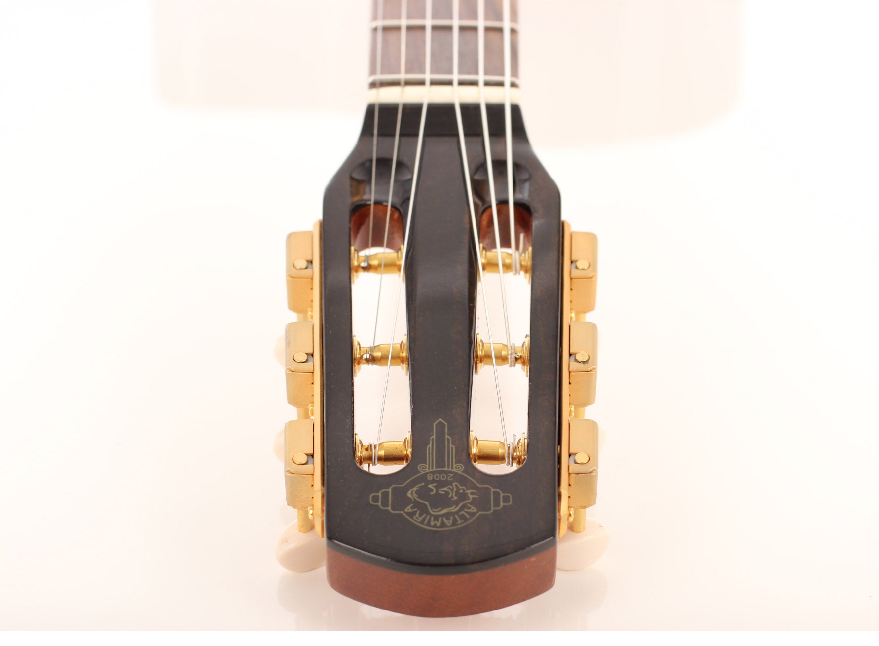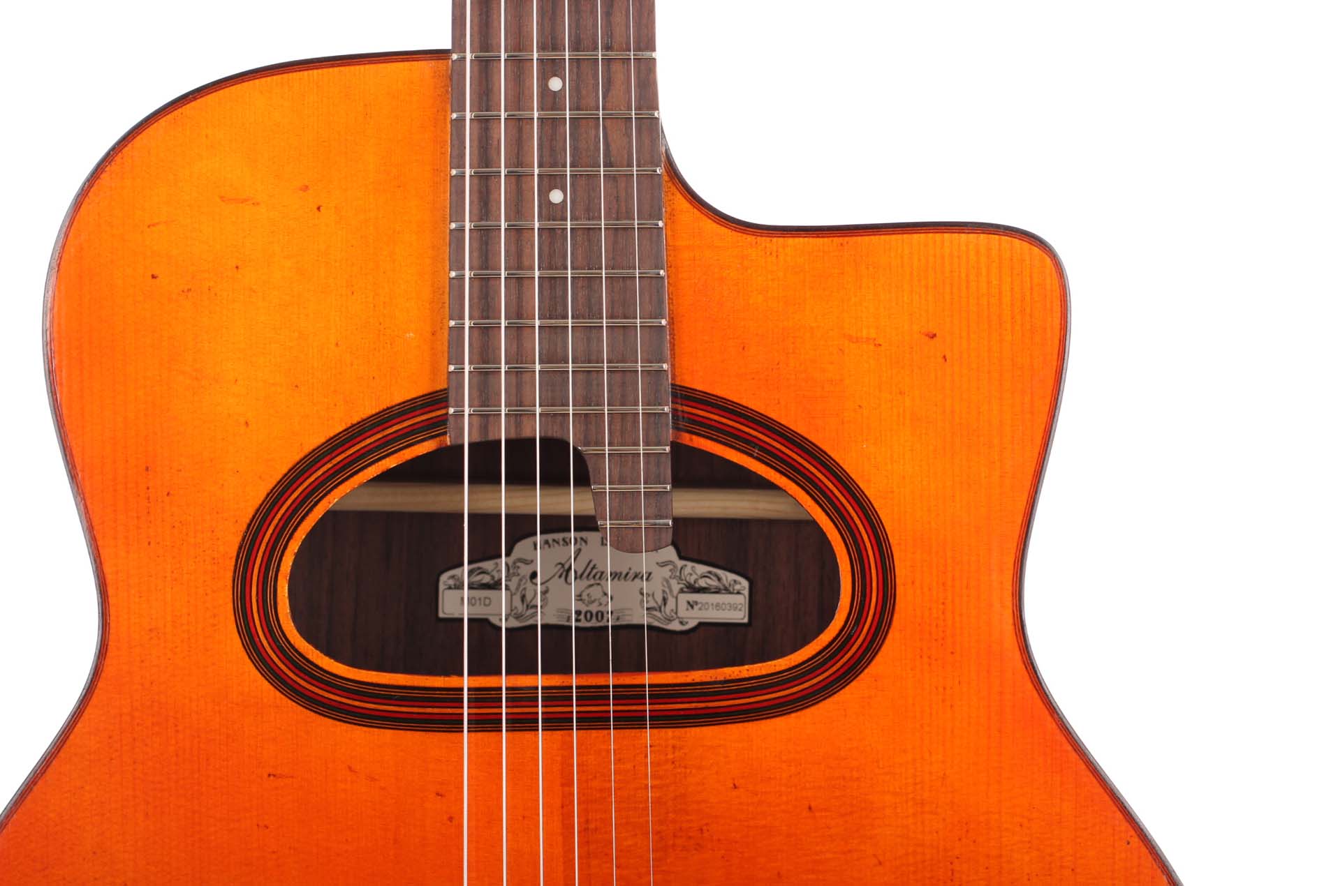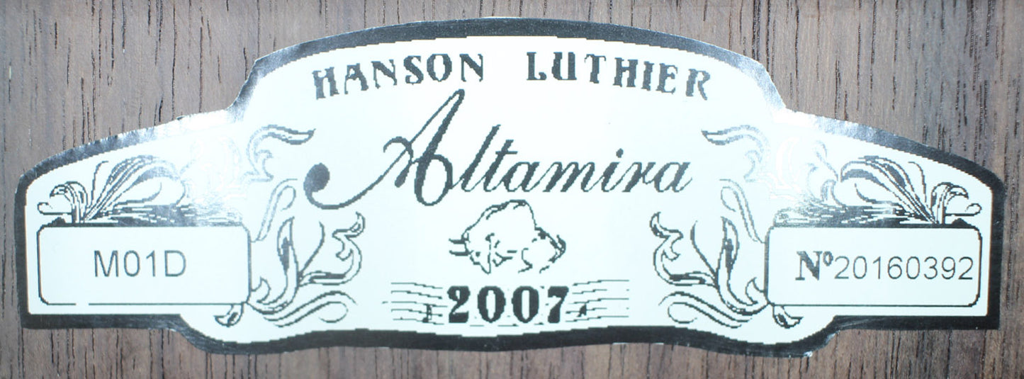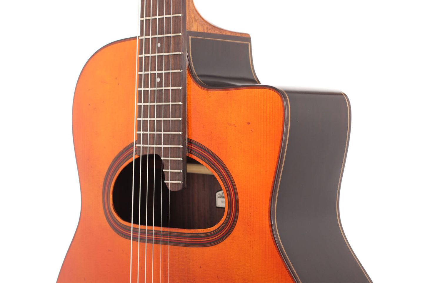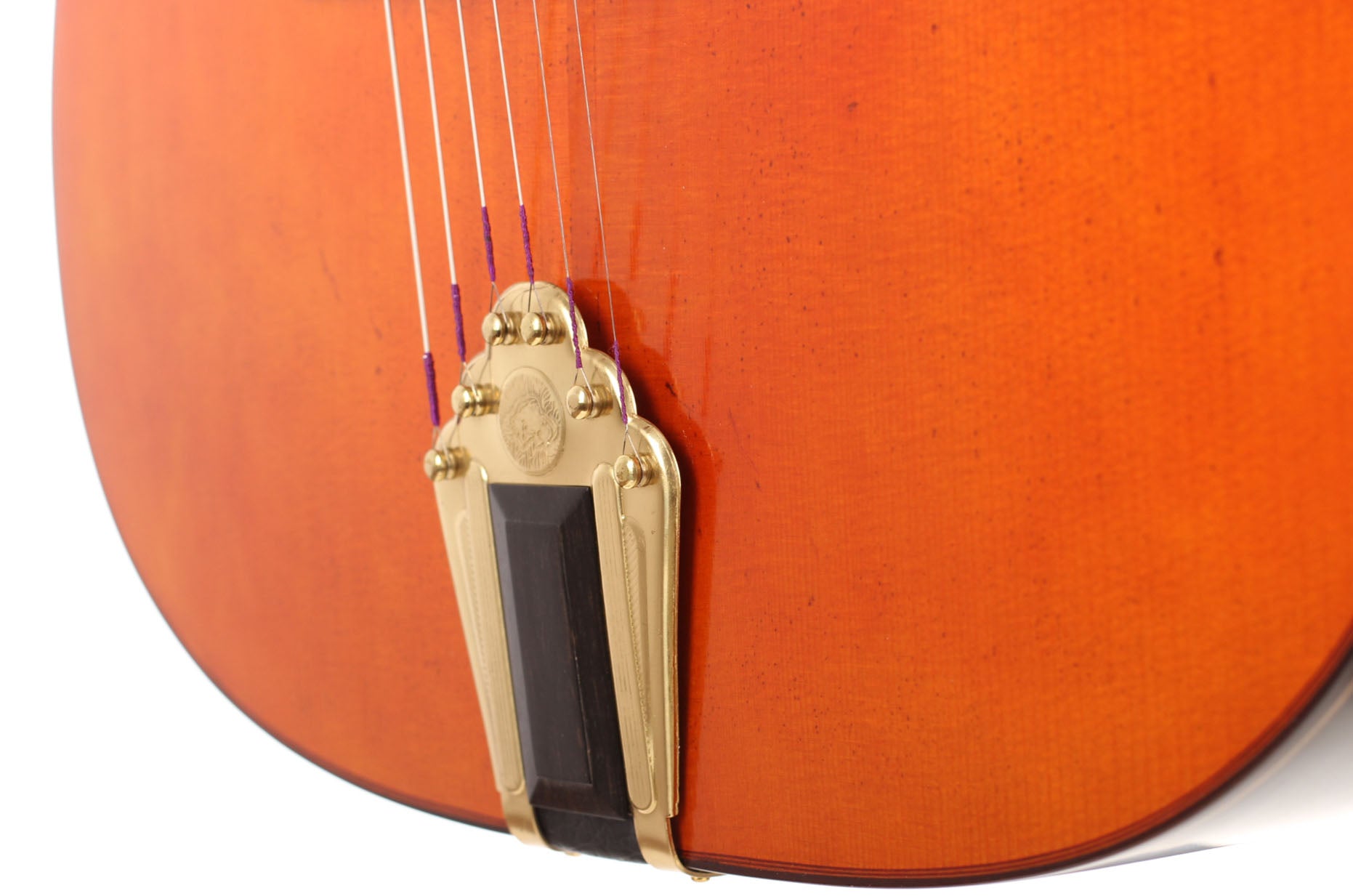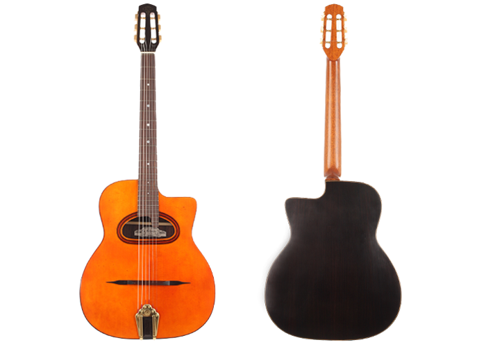 This is a M01D Antique Maccaferri style D-hole gypsy jazz guitar by Altamira with solid spruce top, in antique finish. A very fine guitar that sounds really great with a nice old fashionned look. Great woods were choosen to make this guitar: the finest German Spruce top and very fine laminated Indian rosewood back and sides. A Gewa Prestige hardshell case is included.