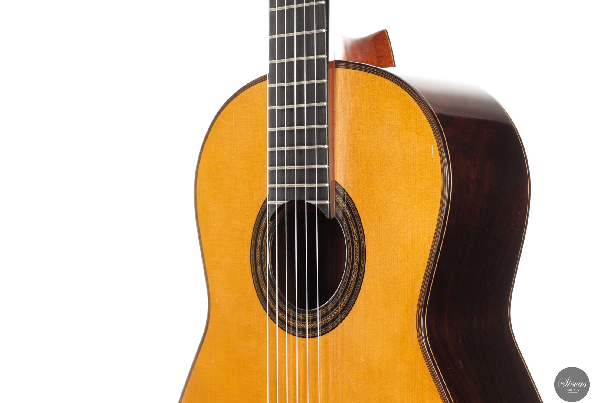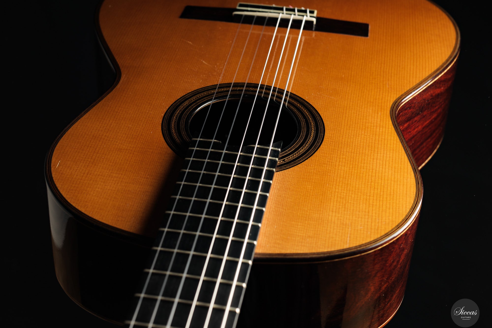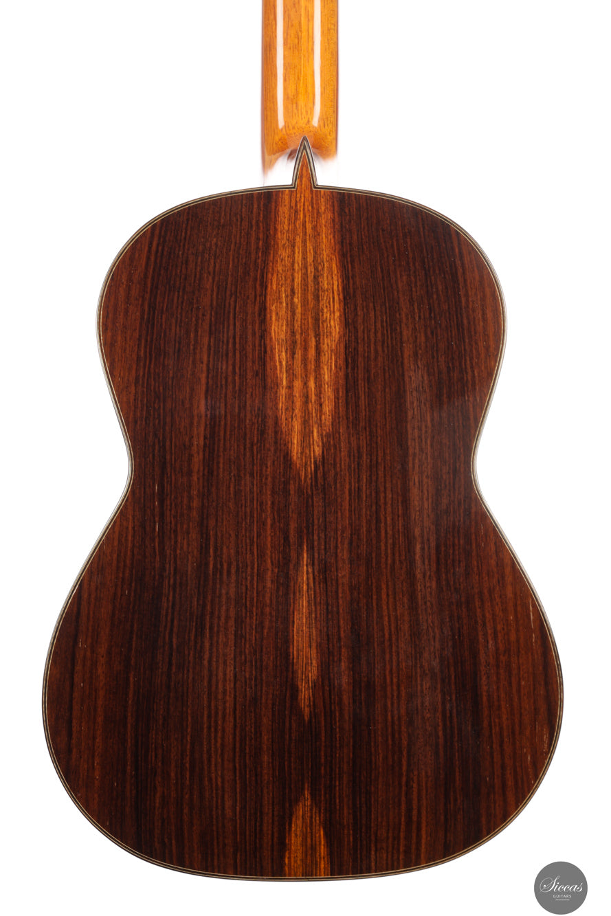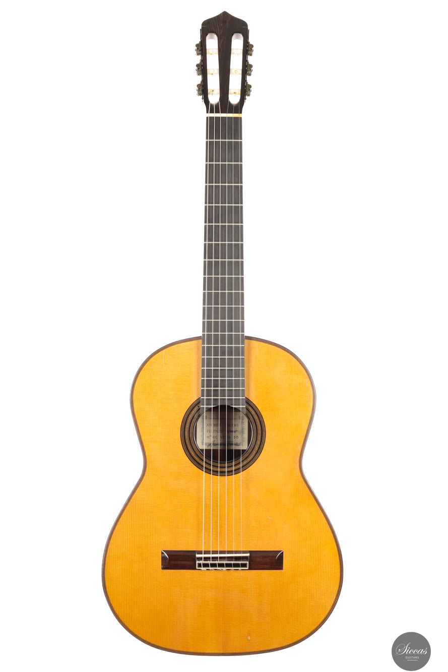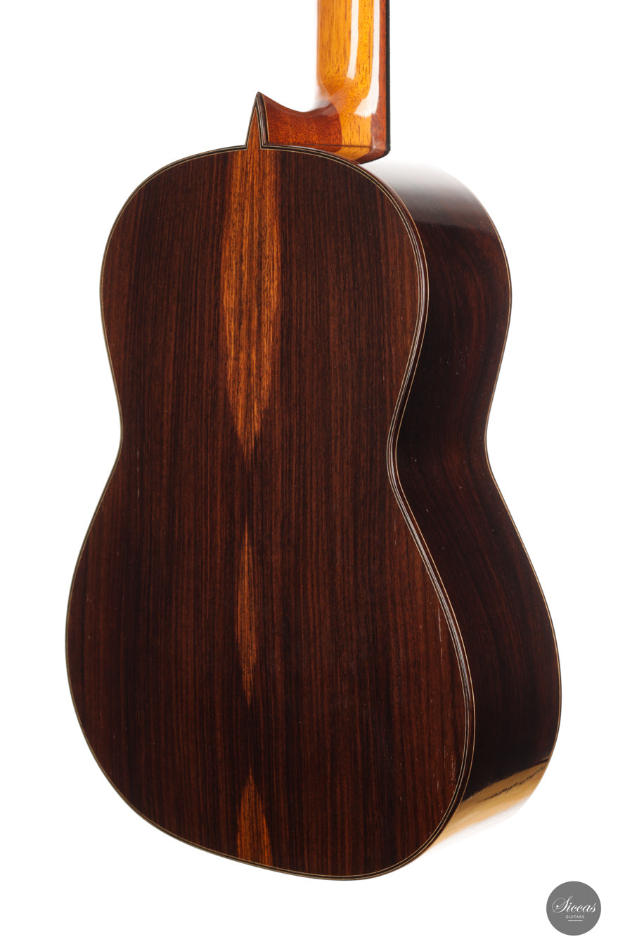 Diese wunderschöne Gitarre aus dem Jahr 1994 ist ein sehr gelungenes Beispiel des frühen Coclea-Modells von Andrea Tacchi. Schon damals zeigt sich, dass Andrea von Anfang an großen Erfolg bei der Entwicklung dieses Modells hatte. Die Gitarre weist alle typischen Merkmale seiner Instrumente auf. Durch ihr Alter ist sie hervorragend eingespielt und reagiert sehr schnell auf den Anschlag der rechten Hand. Die Höhen sind klar, gleichmäßig und haben einen samtigen Charakter. Die Zargen sind innen mit Zypresse gedoppelt, was wesentlich zur hervorragenden Projektion der Gitarre beiträgt. Die Gitarre befand sich ihr gesamtes Leben lang im Besitz einer einzigen Person, was ihren besonders gepflegten Zustand unterstreicht.Zustand