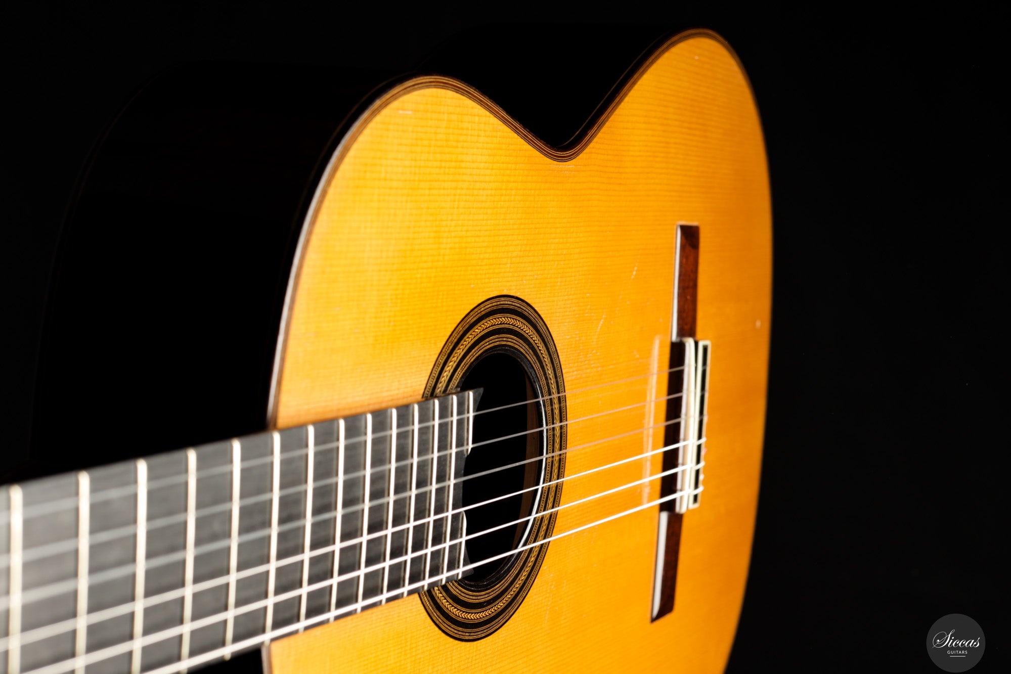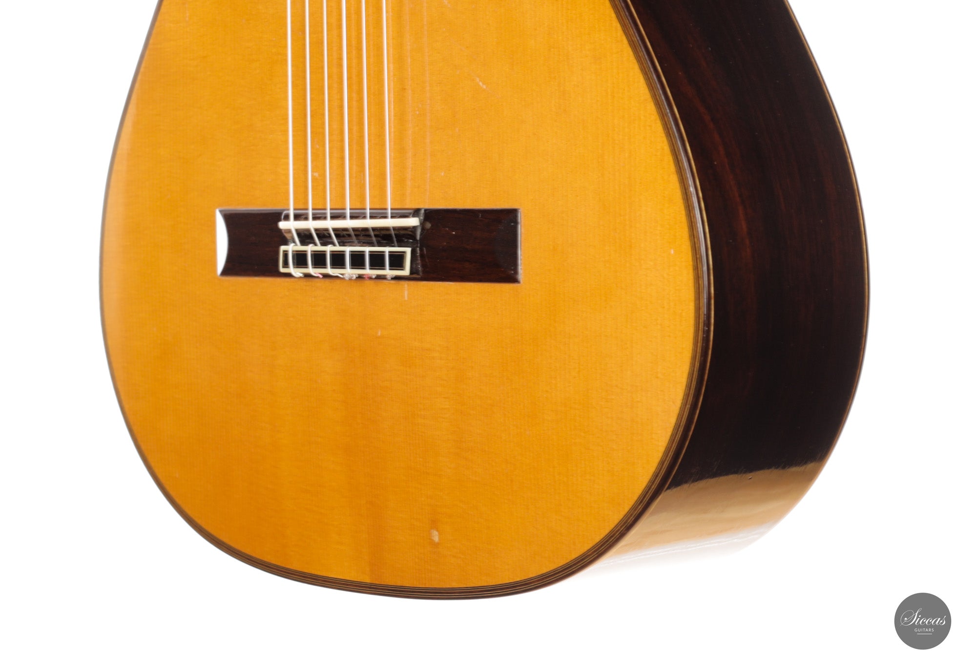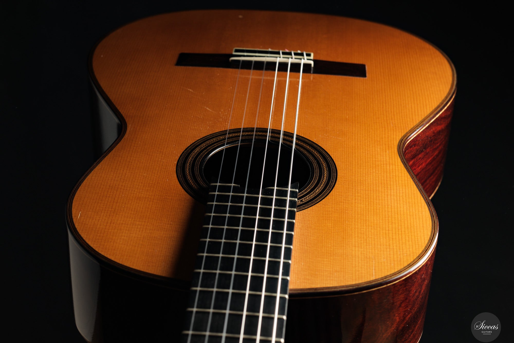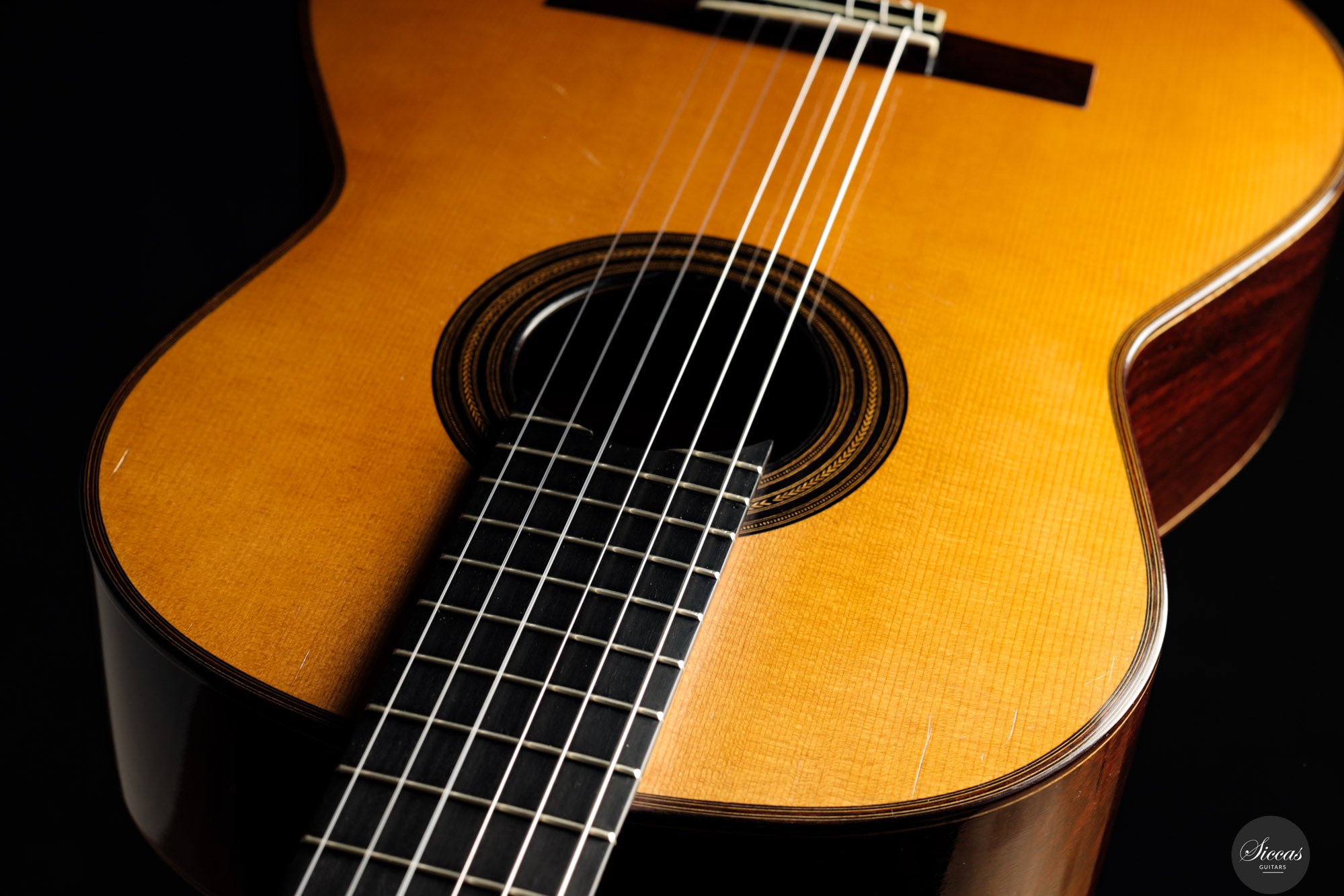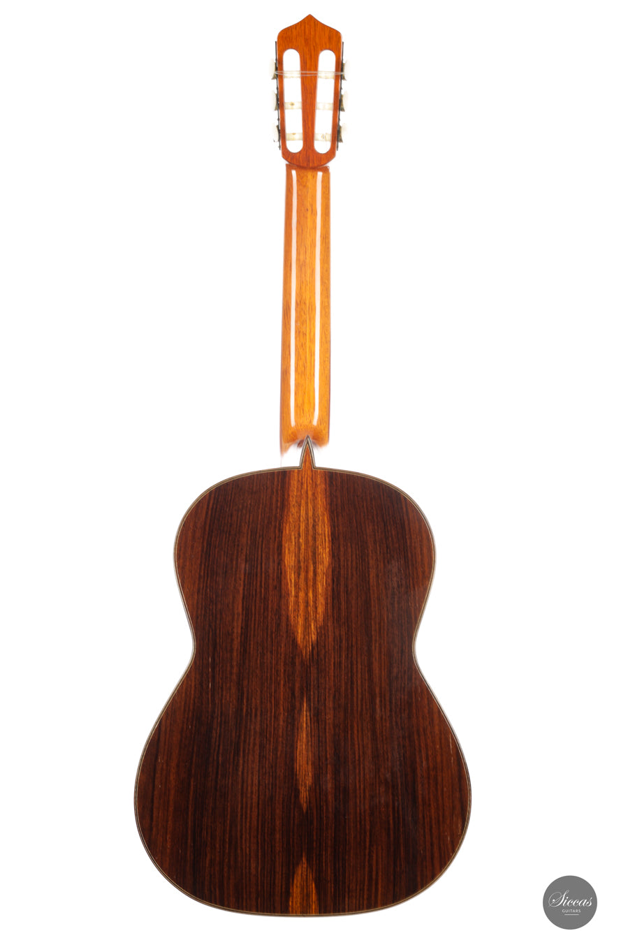 Diese wunderschöne Gitarre aus dem Jahr 1994 ist ein sehr gelungenes Beispiel des frühen Coclea-Modells von Andrea Tacchi. Schon damals zeigt sich, dass Andrea von Anfang an großen Erfolg bei der Entwicklung dieses Modells hatte. Die Gitarre weist alle typischen Merkmale seiner Instrumente auf. Durch ihr Alter ist sie hervorragend eingespielt und reagiert sehr schnell auf den Anschlag der rechten Hand. Die Höhen sind klar, gleichmäßig und haben einen samtigen Charakter. Die Zargen sind innen mit Zypresse gedoppelt, was wesentlich zur hervorragenden Projektion der Gitarre beiträgt. Die Gitarre befand sich ihr gesamtes Leben lang im Besitz einer einzigen Person, was ihren besonders gepflegten Zustand unterstreicht.Zustand