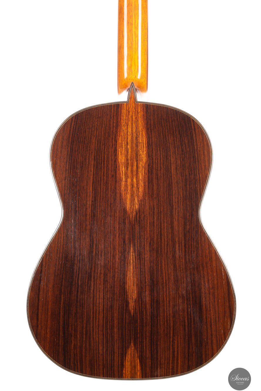 Diese wunderschöne Gitarre aus dem Jahr 1994 ist ein sehr gelungenes Beispiel des frühen Coclea-Modells von Andrea Tacchi. Schon damals zeigt sich, dass Andrea von Anfang an großen Erfolg bei der Entwicklung dieses Modells hatte. Die Gitarre weist alle typischen Merkmale seiner Instrumente auf. Durch ihr Alter ist sie hervorragend eingespielt und reagiert sehr schnell auf den Anschlag der rechten Hand. Die Höhen sind klar, gleichmäßig und haben einen samtigen Charakter. Die Zargen sind innen mit Zypresse gedoppelt, was wesentlich zur hervorragenden Projektion der Gitarre beiträgt. Die Gitarre befand sich ihr gesamtes Leben lang im Besitz einer einzigen Person, was ihren besonders gepflegten Zustand unterstreicht.