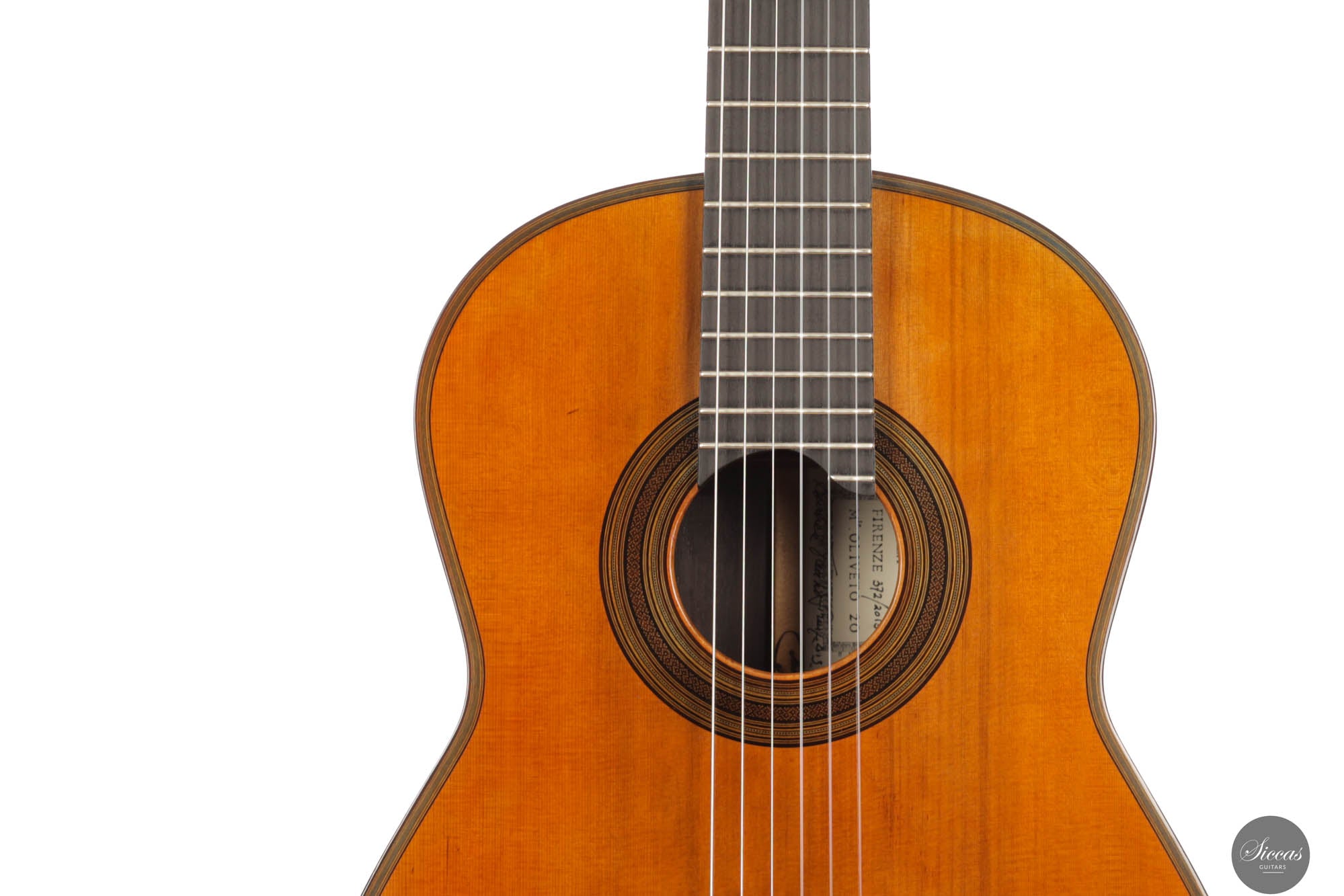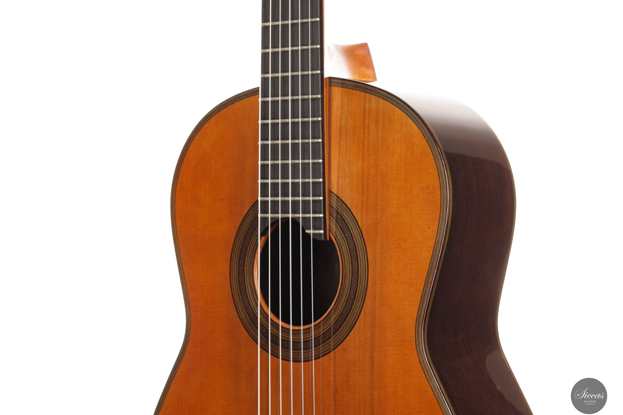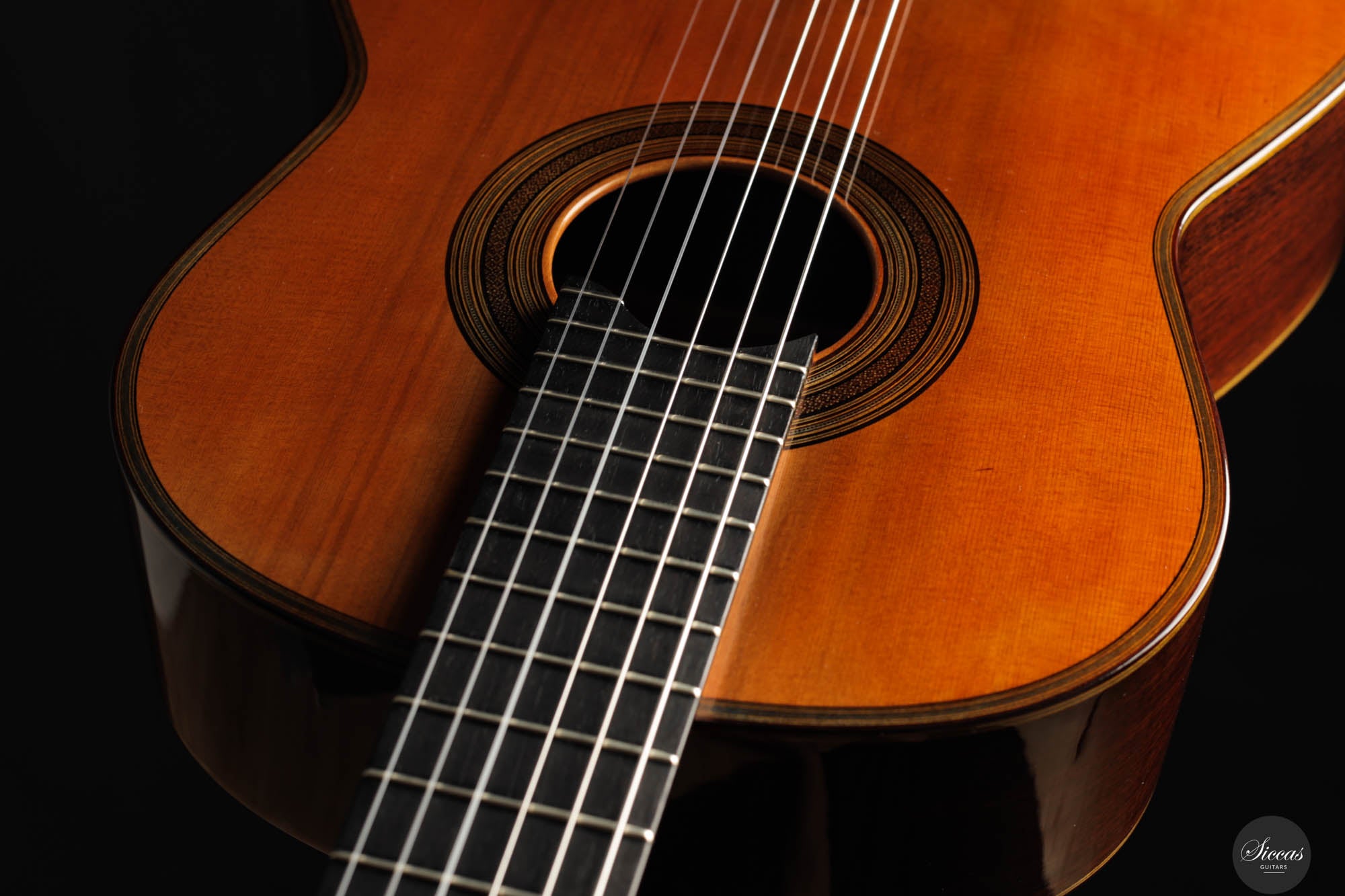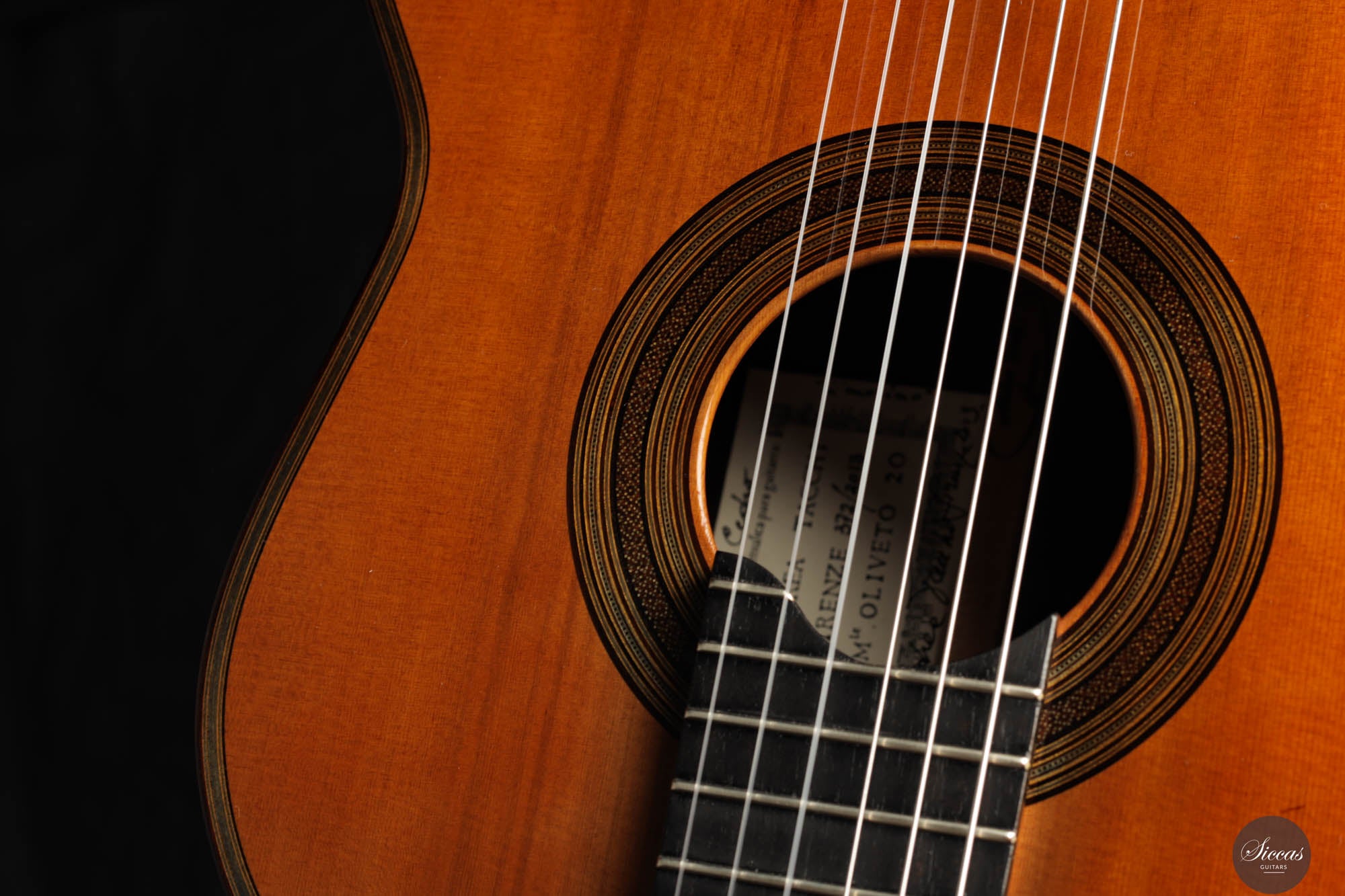 Der Ton der Tacchi Coclea Gitarre ist außergewöhnlich reich und reif, charakterisiert durch eine warme, romantische Qualität, die sowohl singend als auch fesselnd ist. Obwohl es sich um ein gebrauchtes Instrument handelt, befindet sich die Gitarre in sehr gutem Zustand und zeigt nur geringe Gebrauchsspuren. Die Decke wurde neu poliert, um die schöne Maserung der Zederndecke hervorzuheben, und ein kleiner Haarriss, der sich neben dem unteren Zargenbügel auf der rechten Seite befindet, wurde professionell repariert, um zukünftige Probleme zu vermeiden.