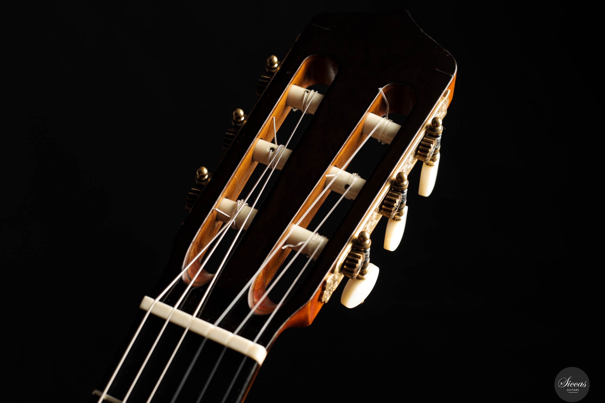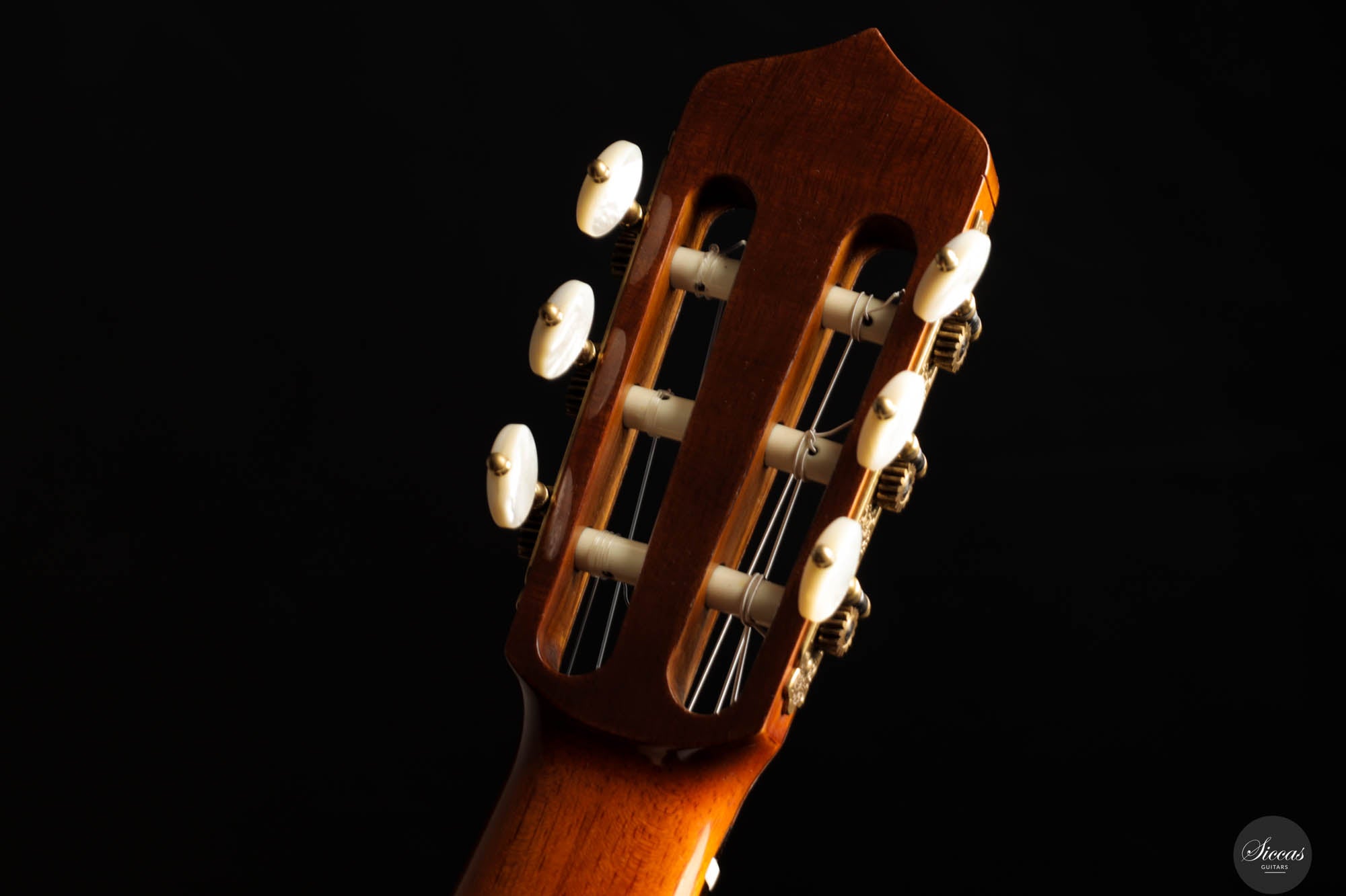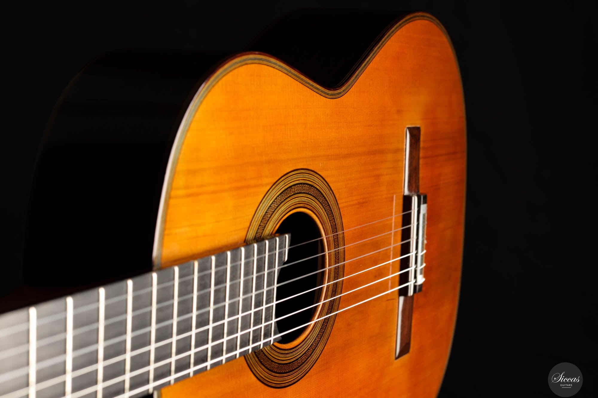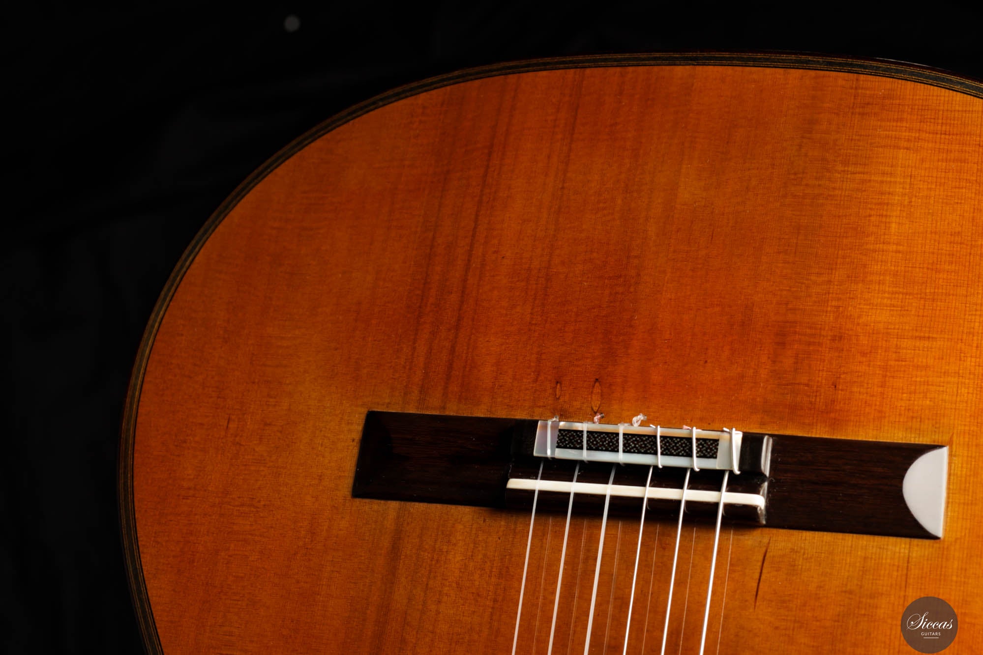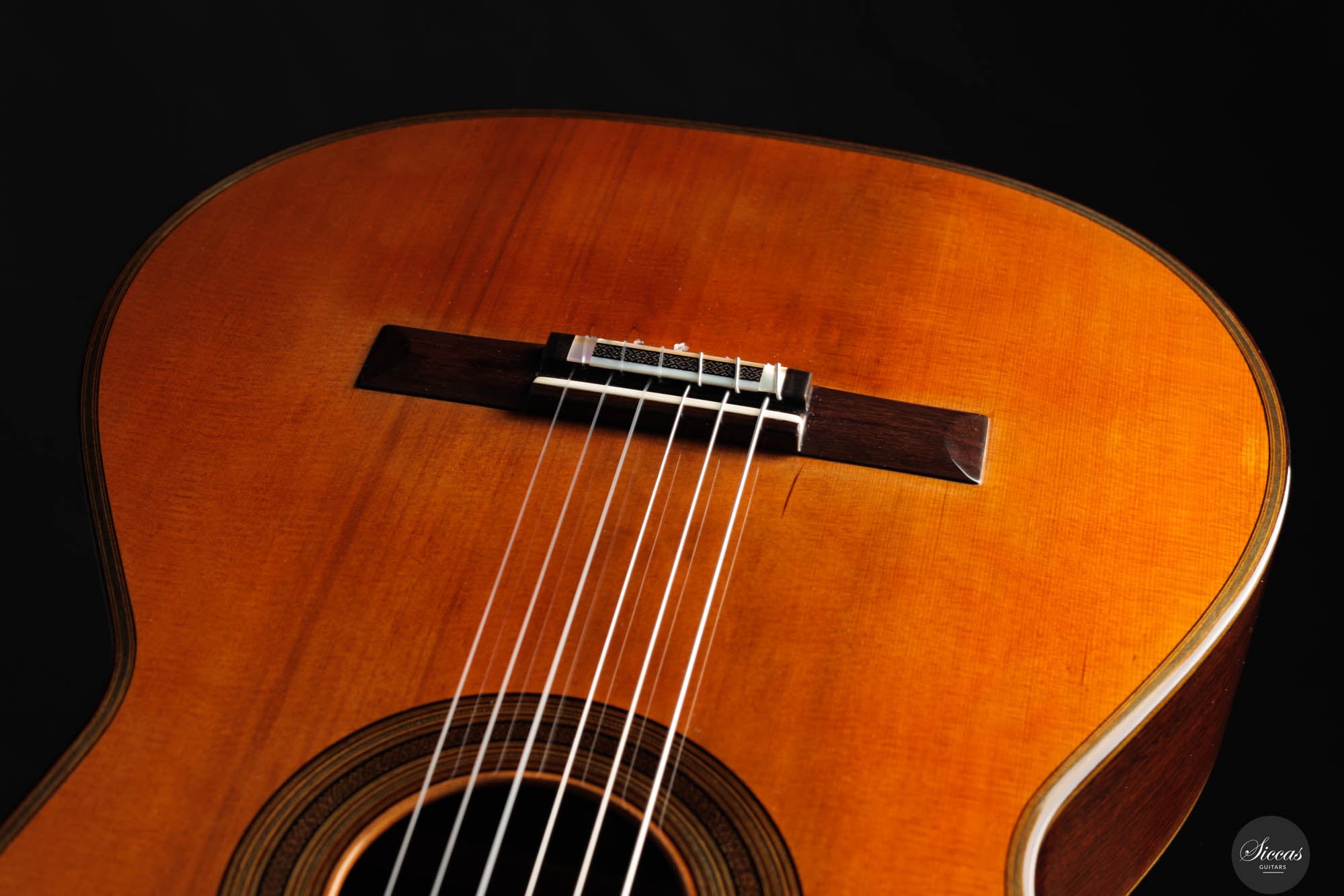 Der Ton der Tacchi Coclea Gitarre ist außergewöhnlich reich und reif, charakterisiert durch eine warme, romantische Qualität, die sowohl singend als auch fesselnd ist. Obwohl es sich um ein gebrauchtes Instrument handelt, befindet sich die Gitarre in sehr gutem Zustand und zeigt nur geringe Gebrauchsspuren. Die Decke wurde neu poliert, um die schöne Maserung der Zederndecke hervorzuheben, und ein kleiner Haarriss, der sich neben dem unteren Zargenbügel auf der rechten Seite befindet, wurde professionell repariert, um zukünftige Probleme zu vermeiden.