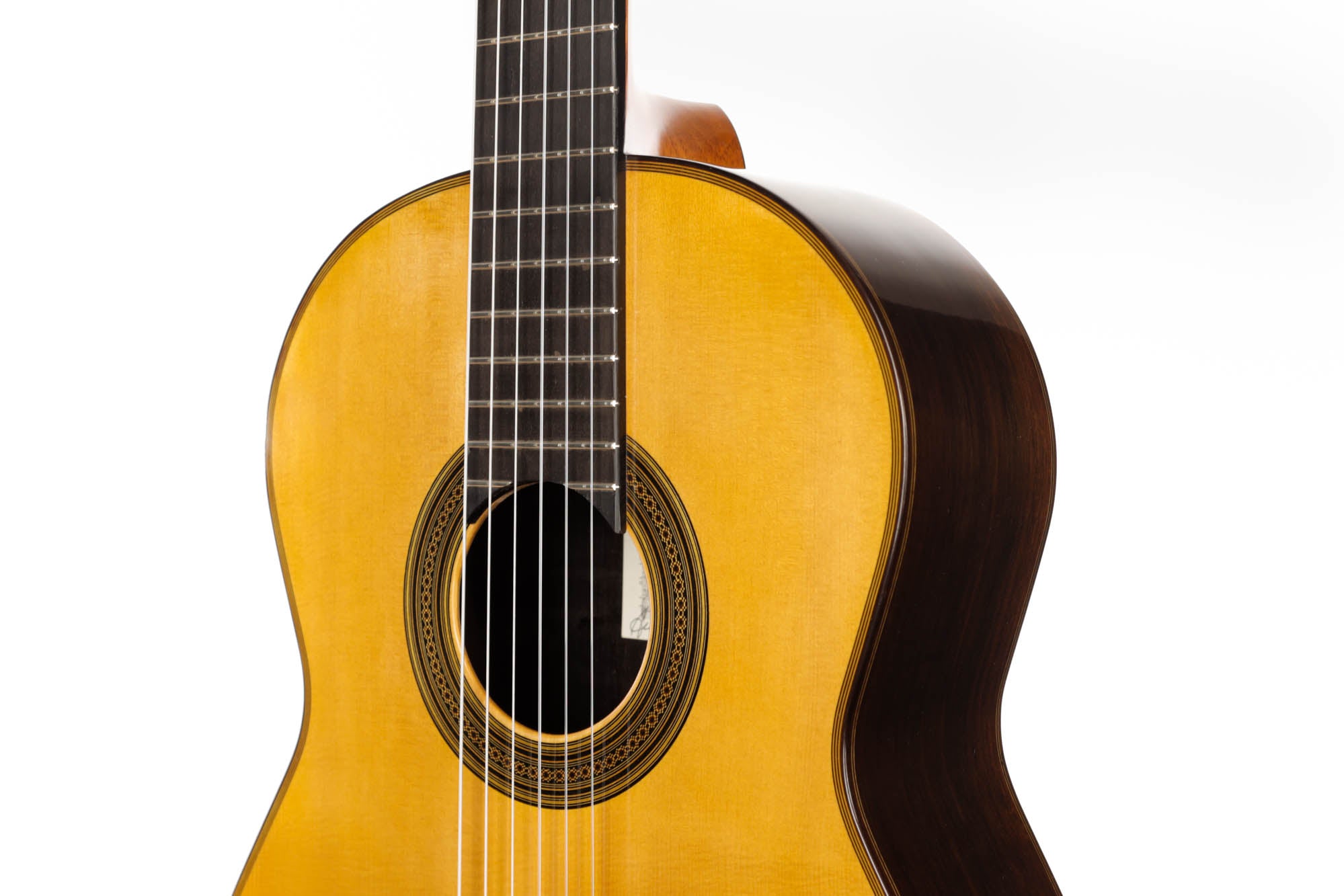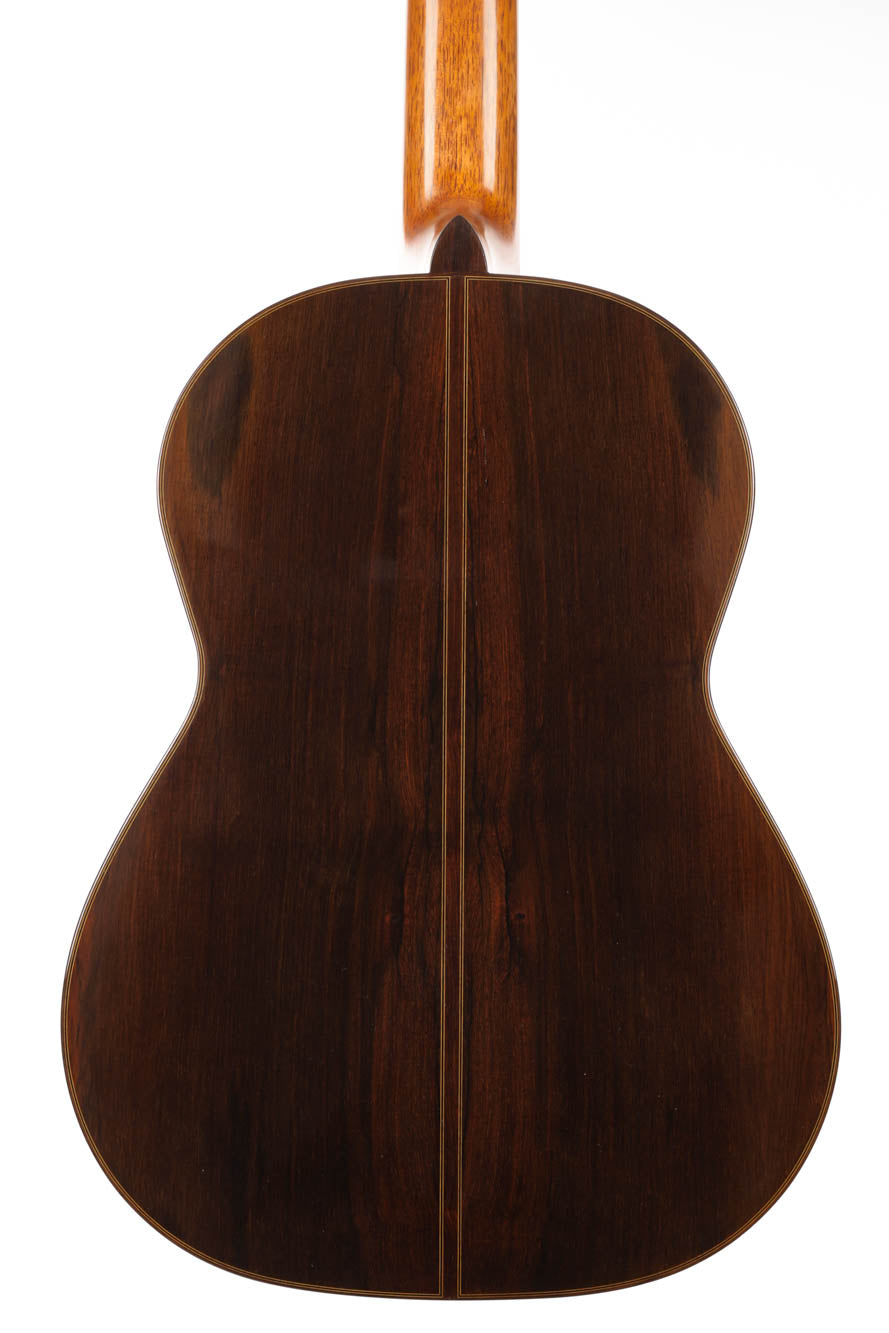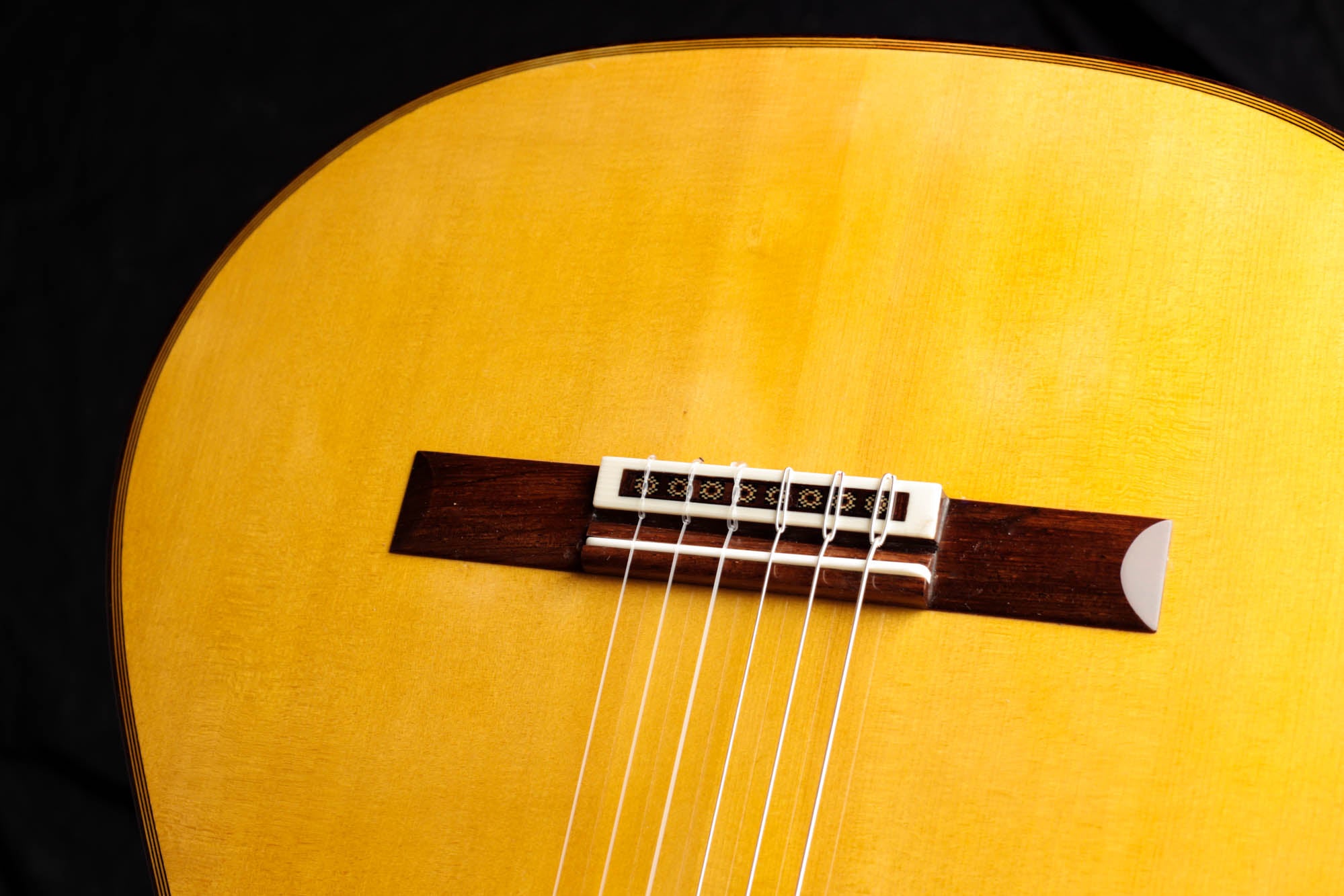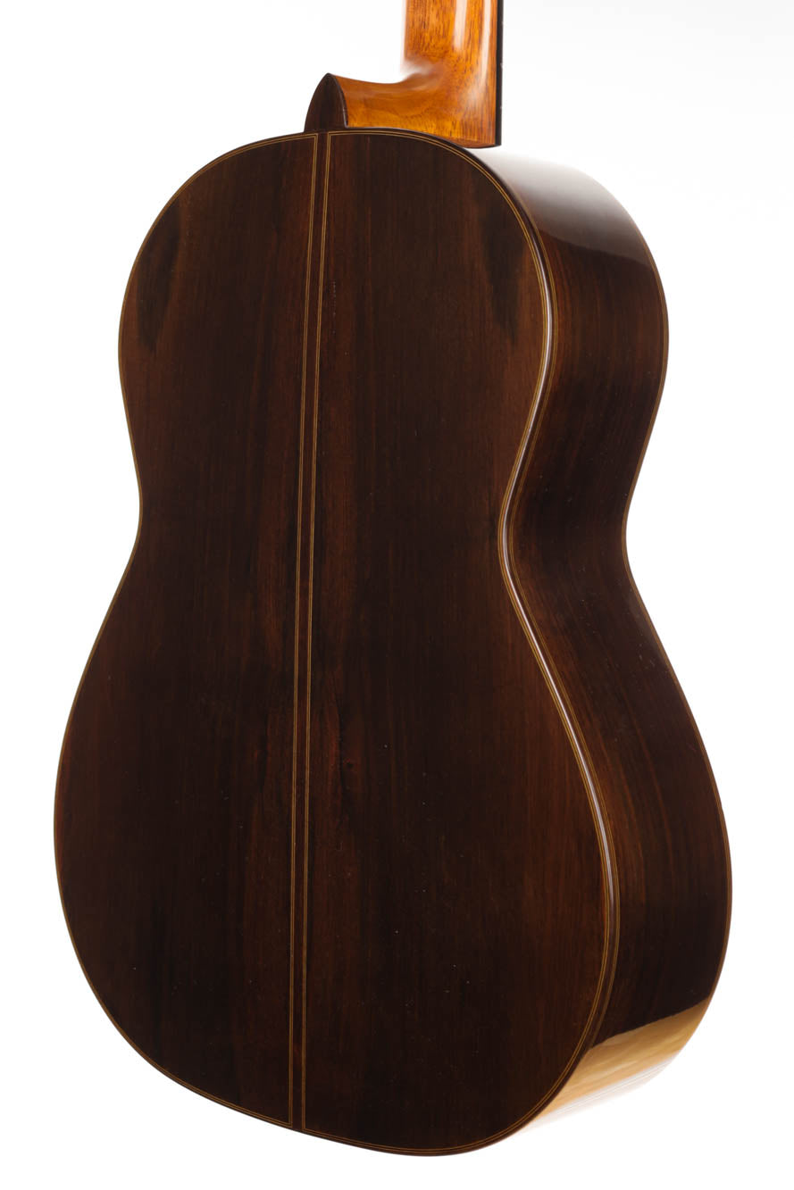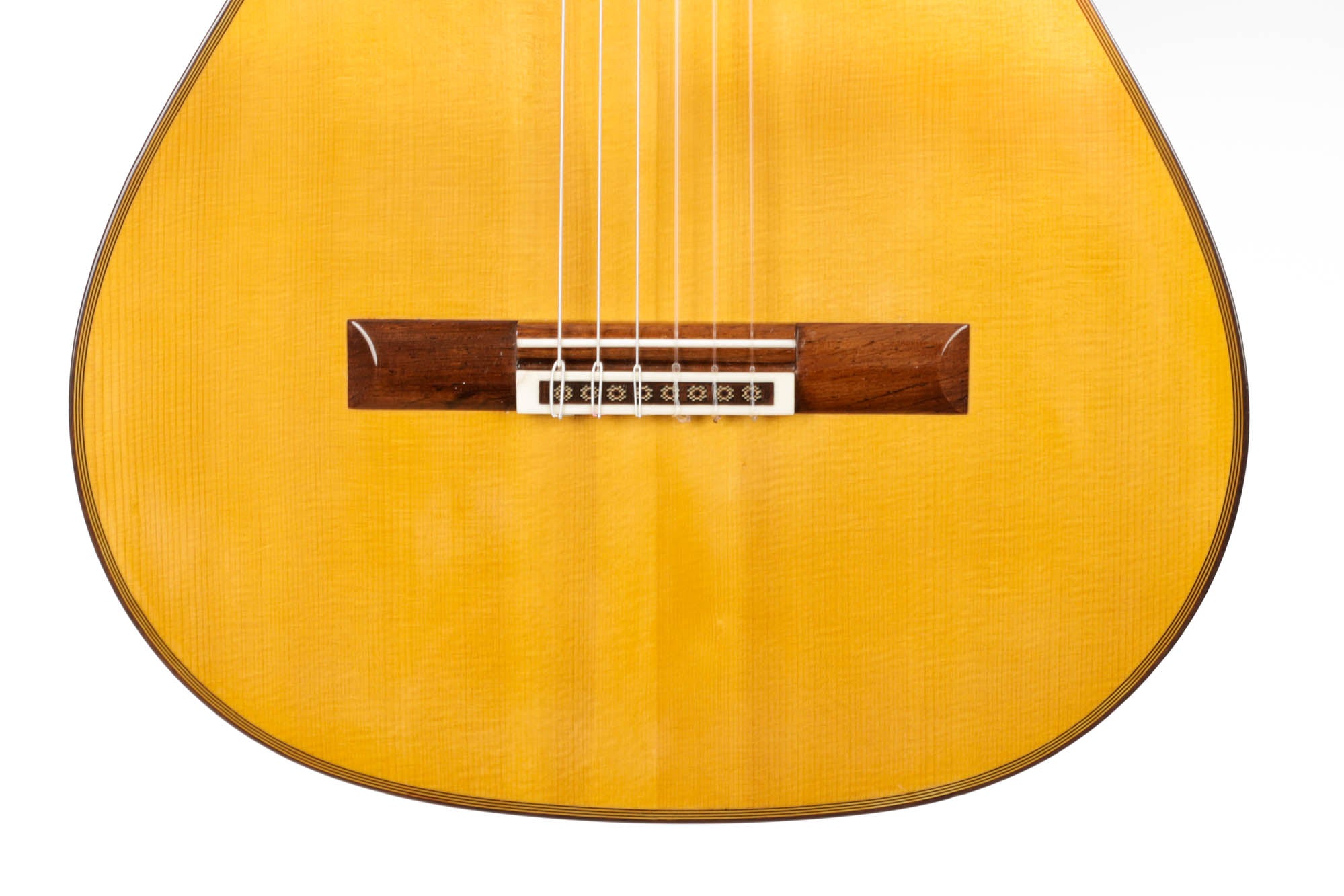 Das Modell "Omaggio a Maestro Robert Bouchet" von Andrea Tacchi, einem verehrten italienischen Meistergitarrenbauer, steht als großartige Hommage an die einzigartige Ästhetik und die klanglichen Qualitäten der ikonischen Instrumente von Robert Bouchet. Diese 2014er Kreation verkörpert Taccis außergewöhnliches Handwerk, das sofort in jedem Aspekt der Gitarre erkennbar ist. Sie zeichnet sich durch einen Schellack-Politur in warmem Farbton aus, der die schön gemaserte Fichtendecke hervorhebt, ein Zeugnis für Taccis sorgfältige Auswahl von erstklassigen Hölzern aus seinem exquisiten Bestand. Die Liebe zum Detail bei dieser Gitarre ist unvergleichlich; jeder kleine Aspekt ist akribisch gefertigt und spiegelt Andreas künstlerisches Können und seine Hingabe an sein Handwerk wider. Trotz eines oberflächlichen dünnen Risses im brasilianischen Palisander für Rücken und Seiten, einer häufigen Erscheinung bei feinen Gitarren, der fachmännisch geklebt wurde und rein ästhetisch bleibt, befindet sich die Gitarre in einem großartigen Zustand und zeigt nur minimale Gebrauchsspuren.