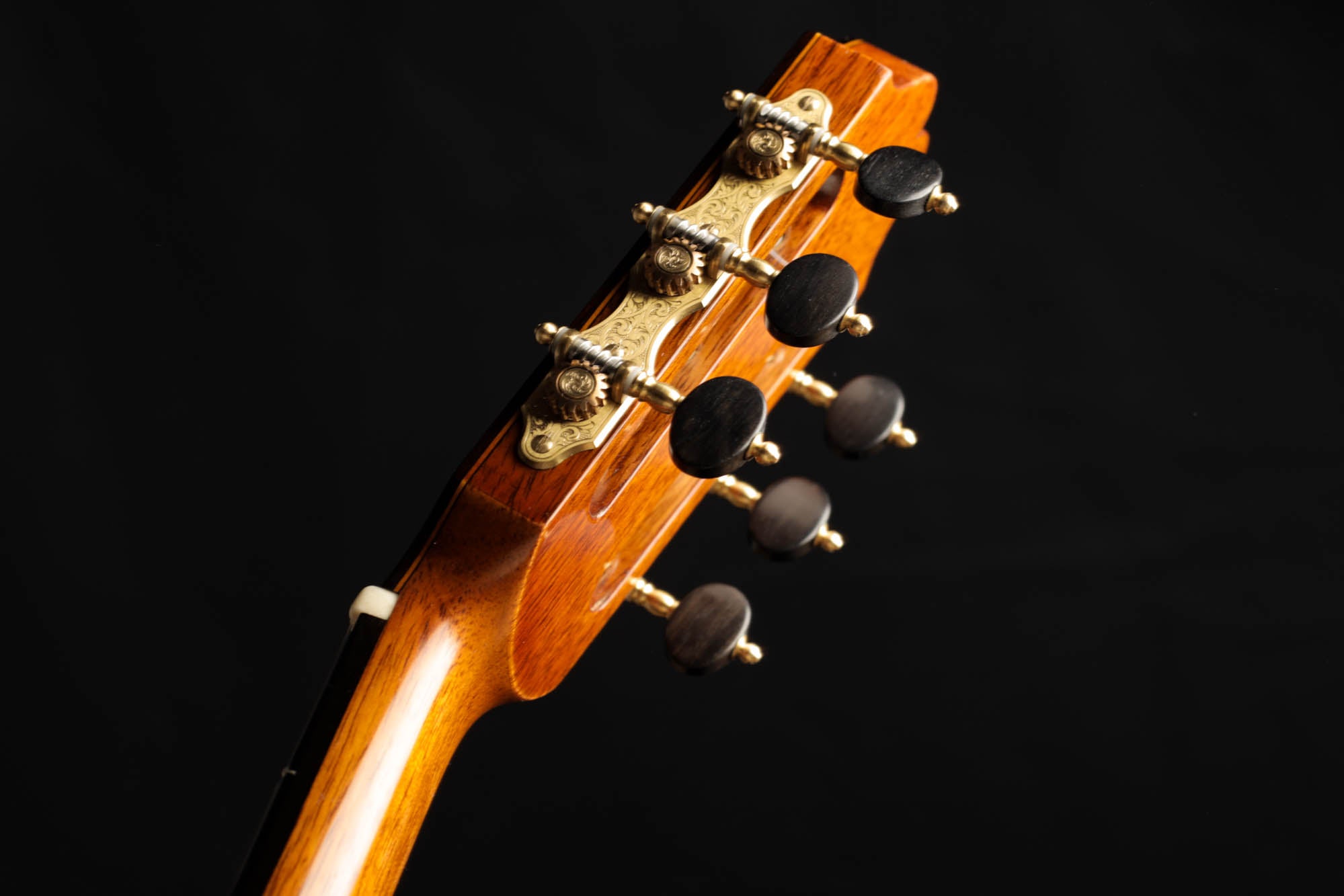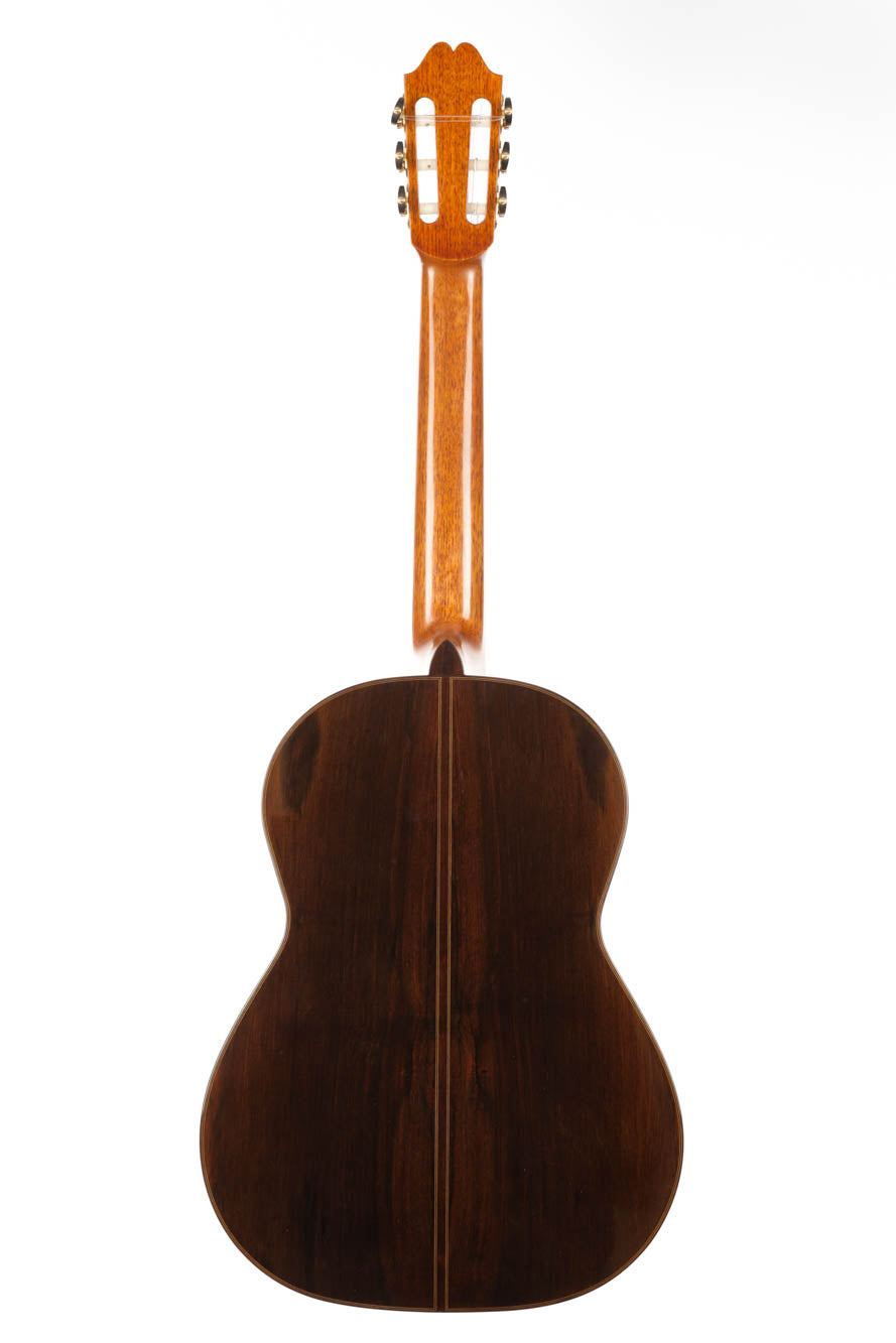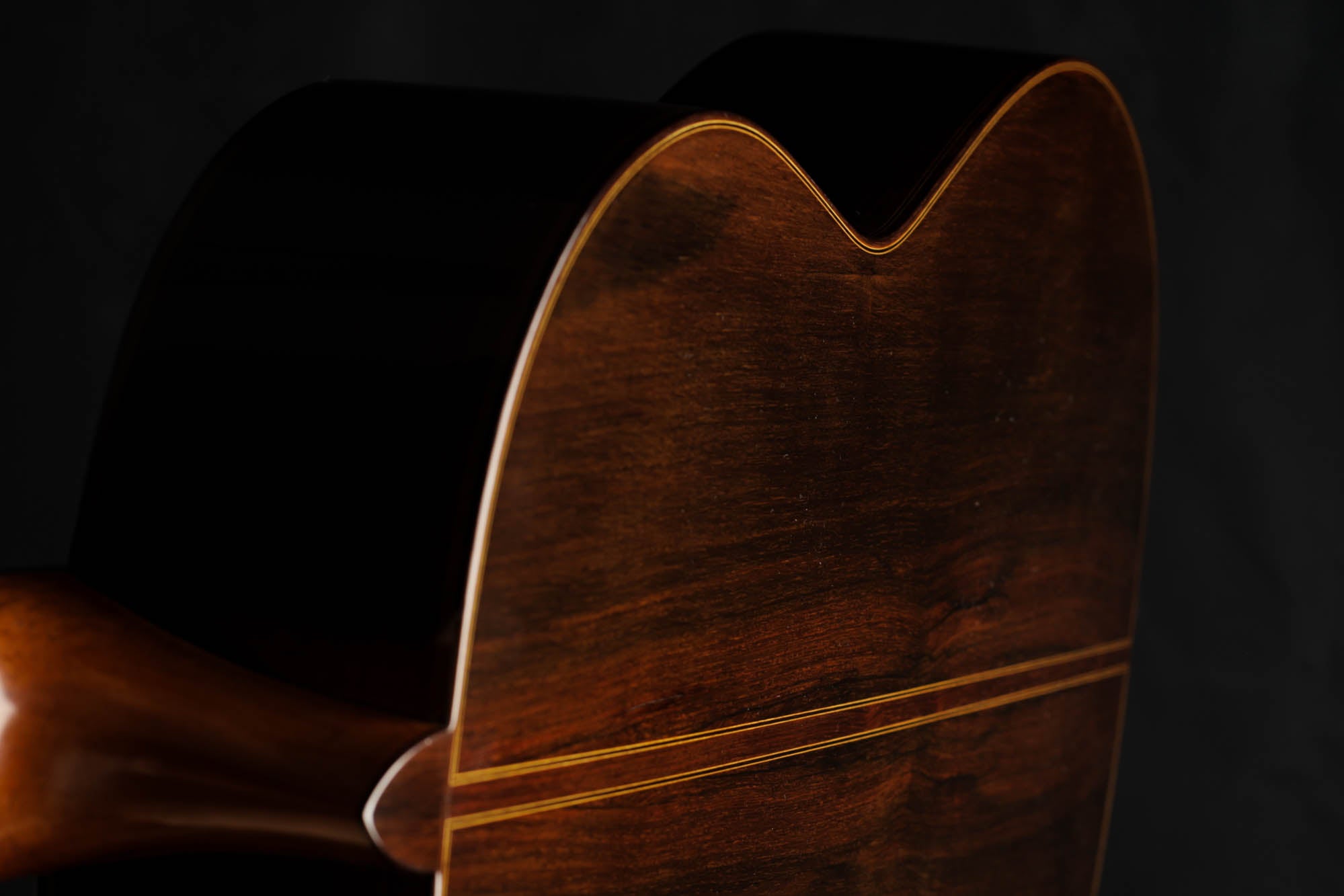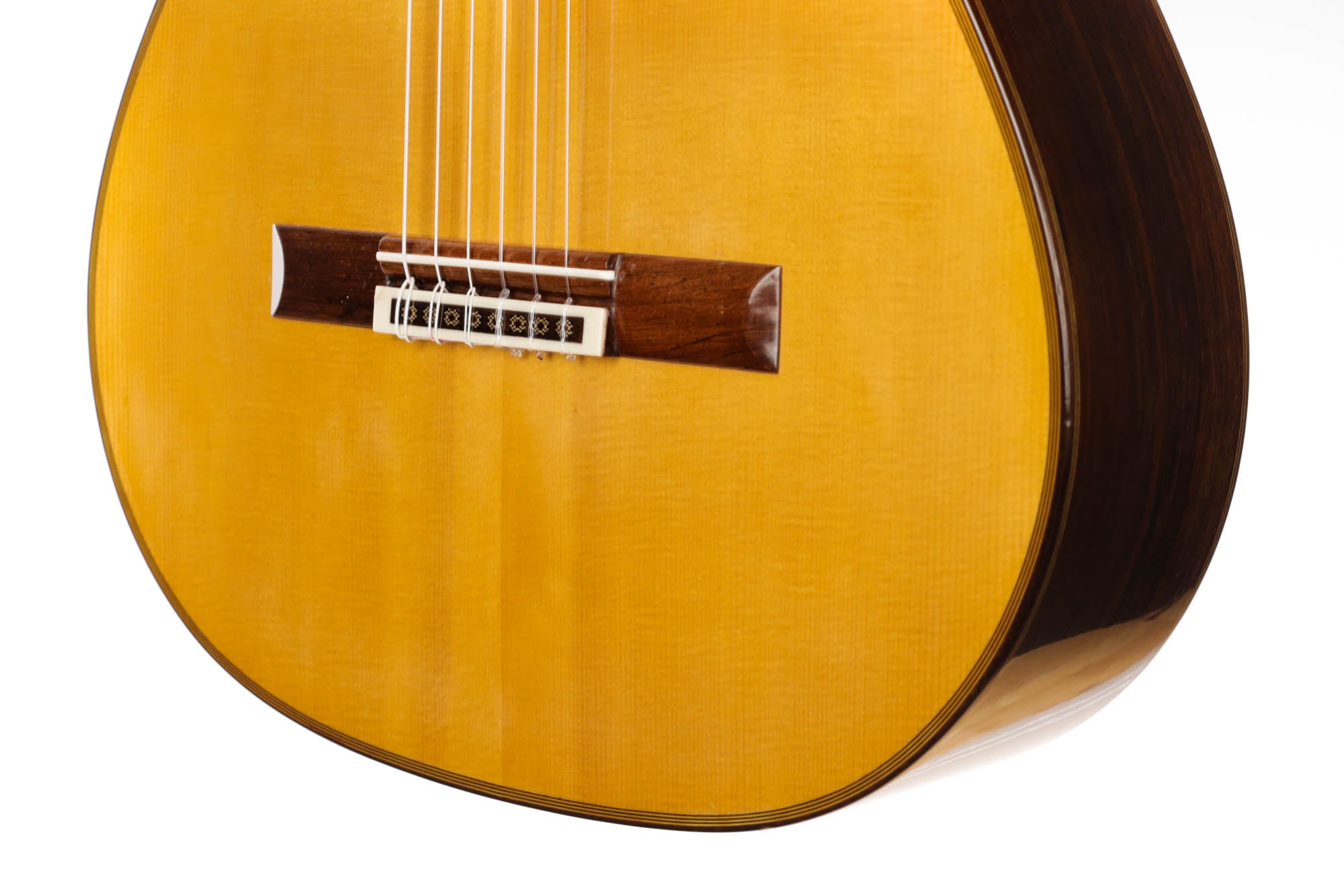 Das Modell "Omaggio a Maestro Robert Bouchet" von Andrea Tacchi, einem verehrten italienischen Meistergitarrenbauer, steht als großartige Hommage an die einzigartige Ästhetik und die klanglichen Qualitäten der ikonischen Instrumente von Robert Bouchet. Diese 2014er Kreation verkörpert Taccis außergewöhnliches Handwerk, das sofort in jedem Aspekt der Gitarre erkennbar ist. Sie zeichnet sich durch einen Schellack-Politur in warmem Farbton aus, der die schön gemaserte Fichtendecke hervorhebt, ein Zeugnis für Taccis sorgfältige Auswahl von erstklassigen Hölzern aus seinem exquisiten Bestand. Die Liebe zum Detail bei dieser Gitarre ist unvergleichlich; jeder kleine Aspekt ist akribisch gefertigt und spiegelt Andreas künstlerisches Können und seine Hingabe an sein Handwerk wider. Trotz eines oberflächlichen dünnen Risses im brasilianischen Palisander für Rücken und Seiten, einer häufigen Erscheinung bei feinen Gitarren, der fachmännisch geklebt wurde und rein ästhetisch bleibt, befindet sich die Gitarre in einem großartigen Zustand und zeigt nur minimale Gebrauchsspuren.