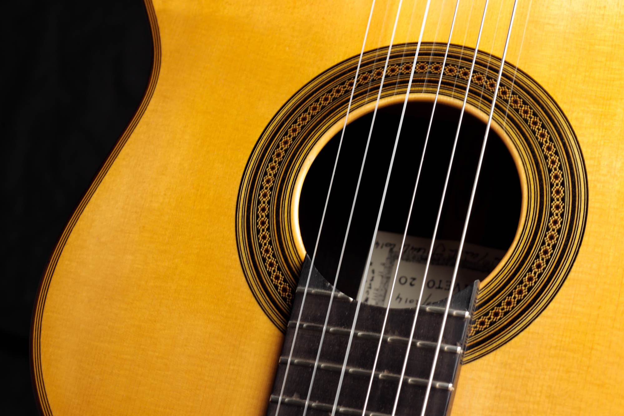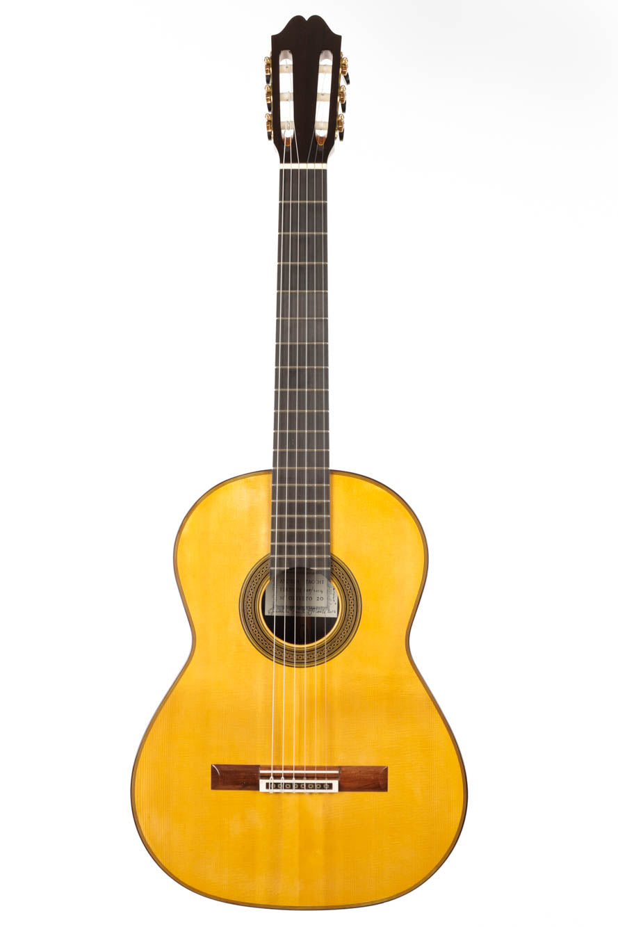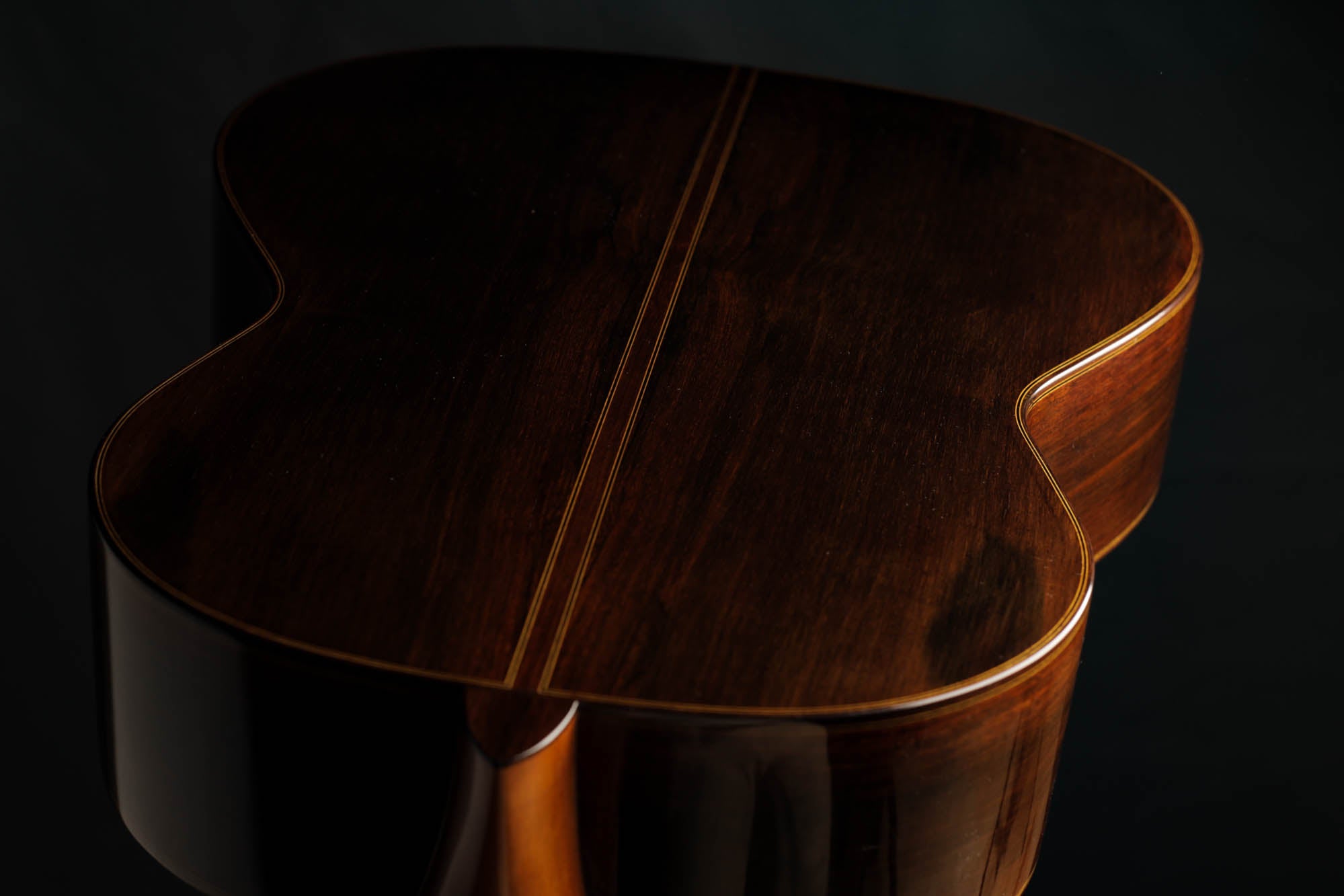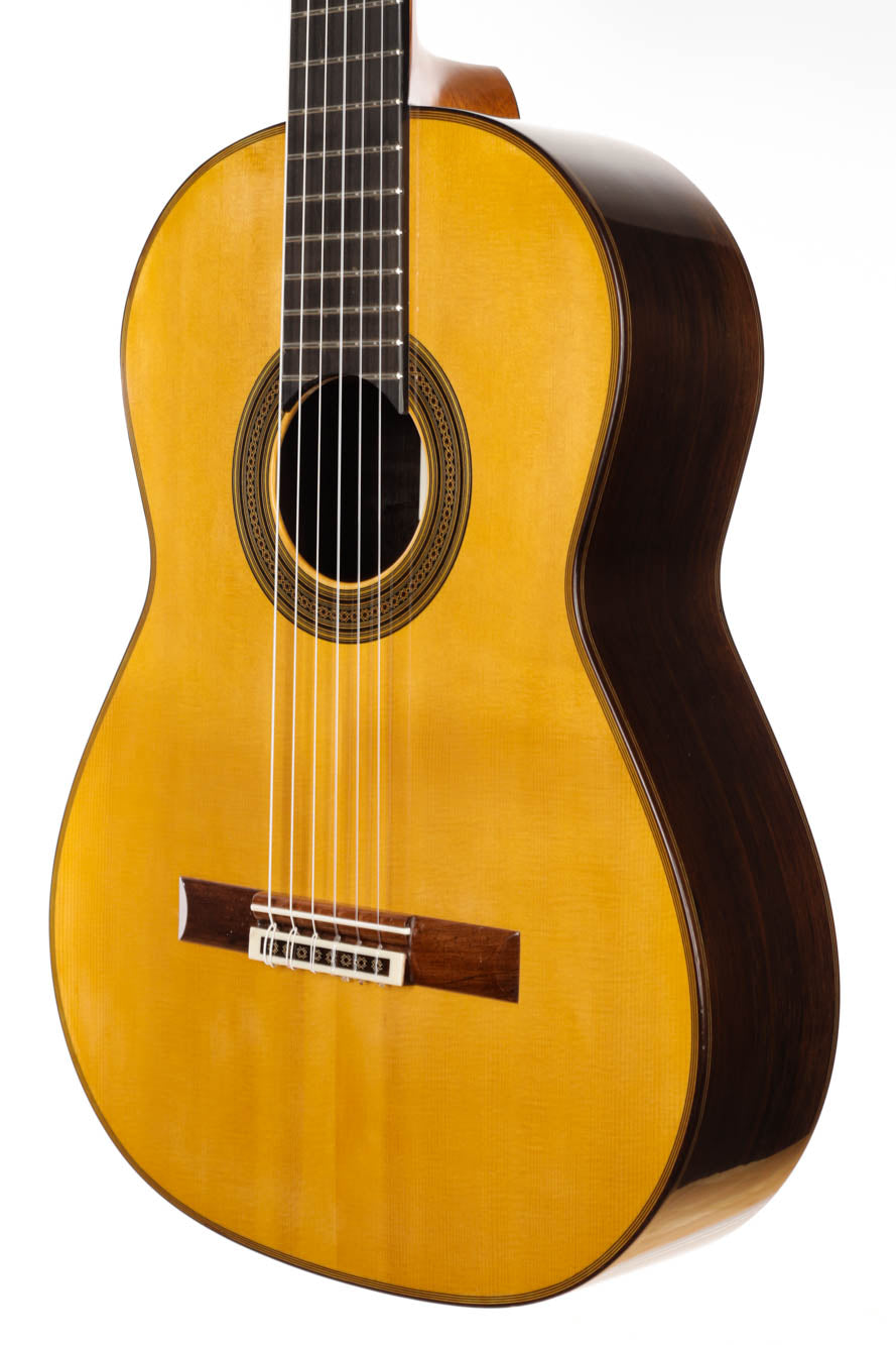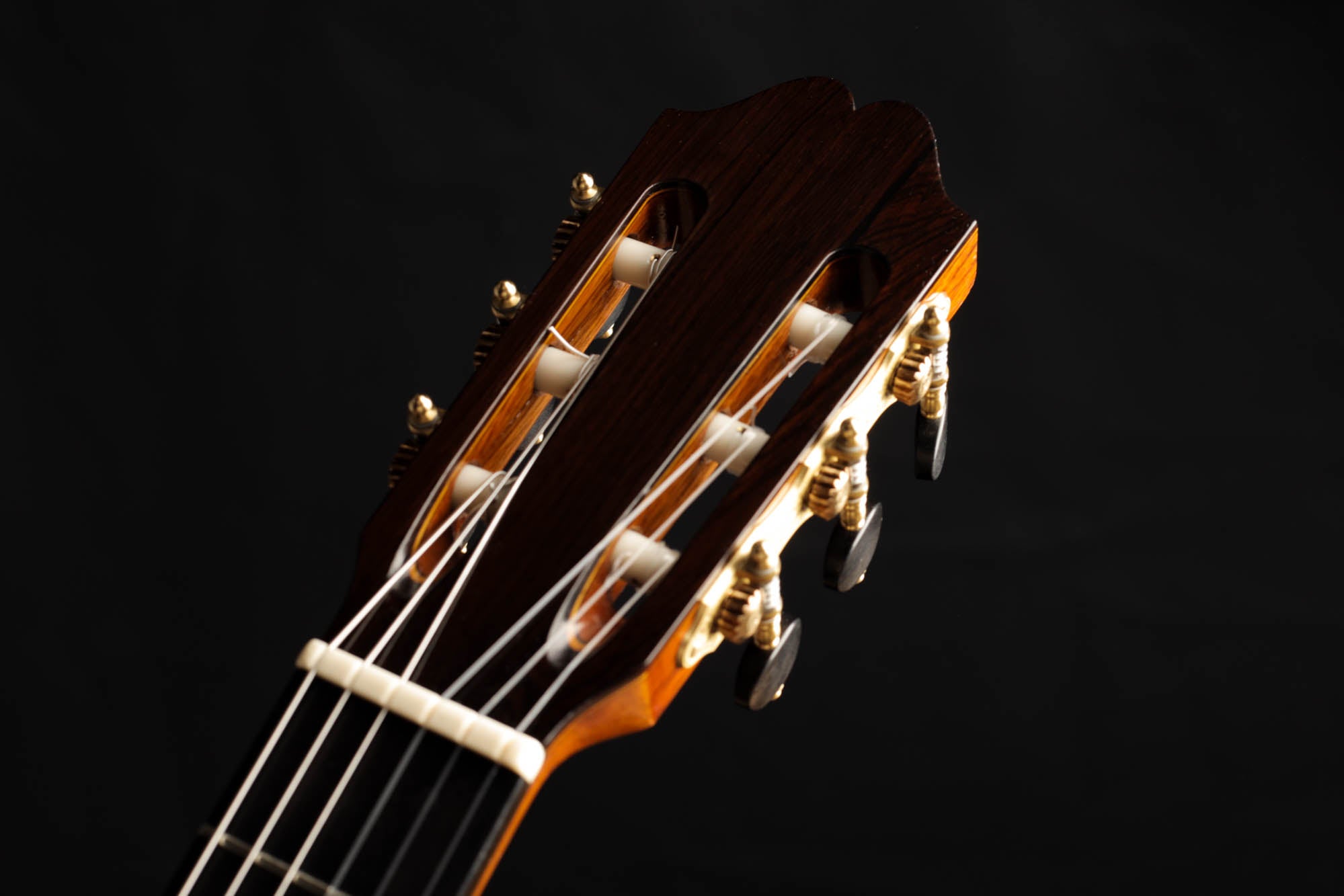 Das Modell "Omaggio a Maestro Robert Bouchet" von Andrea Tacchi, einem verehrten italienischen Meistergitarrenbauer, steht als großartige Hommage an die einzigartige Ästhetik und die klanglichen Qualitäten der ikonischen Instrumente von Robert Bouchet. Diese 2014er Kreation verkörpert Taccis außergewöhnliches Handwerk, das sofort in jedem Aspekt der Gitarre erkennbar ist. Sie zeichnet sich durch einen Schellack-Politur in warmem Farbton aus, der die schön gemaserte Fichtendecke hervorhebt, ein Zeugnis für Taccis sorgfältige Auswahl von erstklassigen Hölzern aus seinem exquisiten Bestand. Die Liebe zum Detail bei dieser Gitarre ist unvergleichlich; jeder kleine Aspekt ist akribisch gefertigt und spiegelt Andreas künstlerisches Können und seine Hingabe an sein Handwerk wider. Trotz eines oberflächlichen dünnen Risses im brasilianischen Palisander für Rücken und Seiten, einer häufigen Erscheinung bei feinen Gitarren, der fachmännisch geklebt wurde und rein ästhetisch bleibt, befindet sich die Gitarre in einem großartigen Zustand und zeigt nur minimale Gebrauchsspuren.