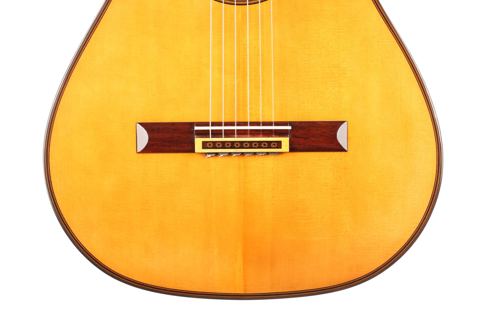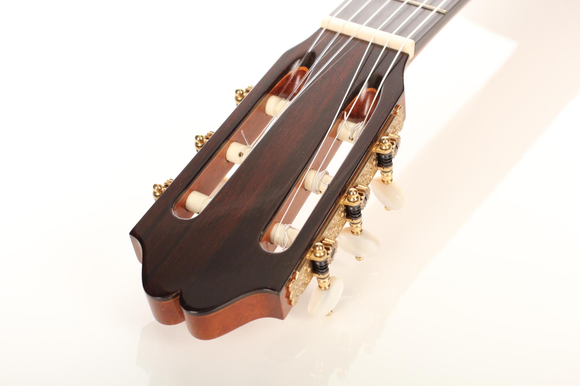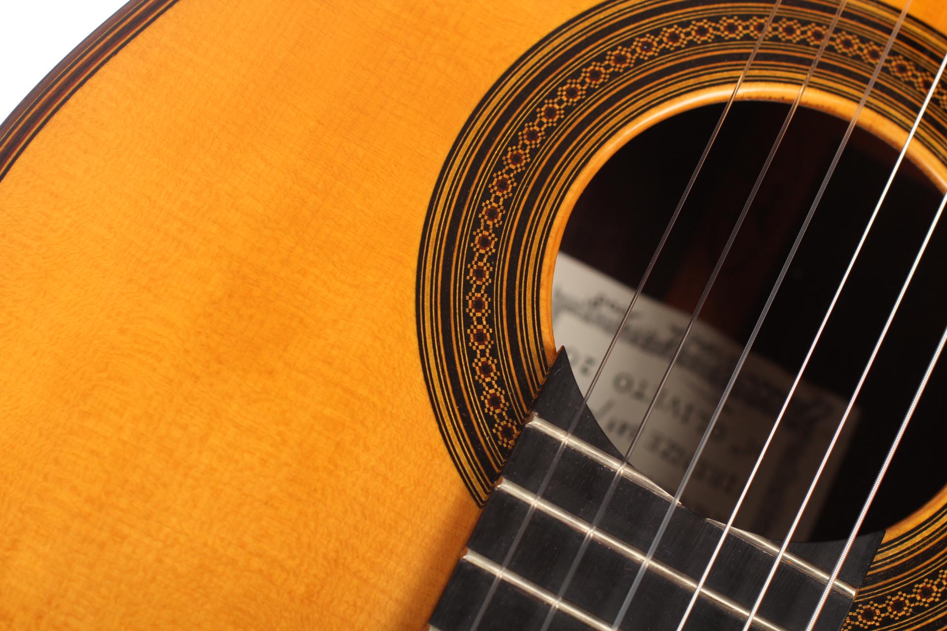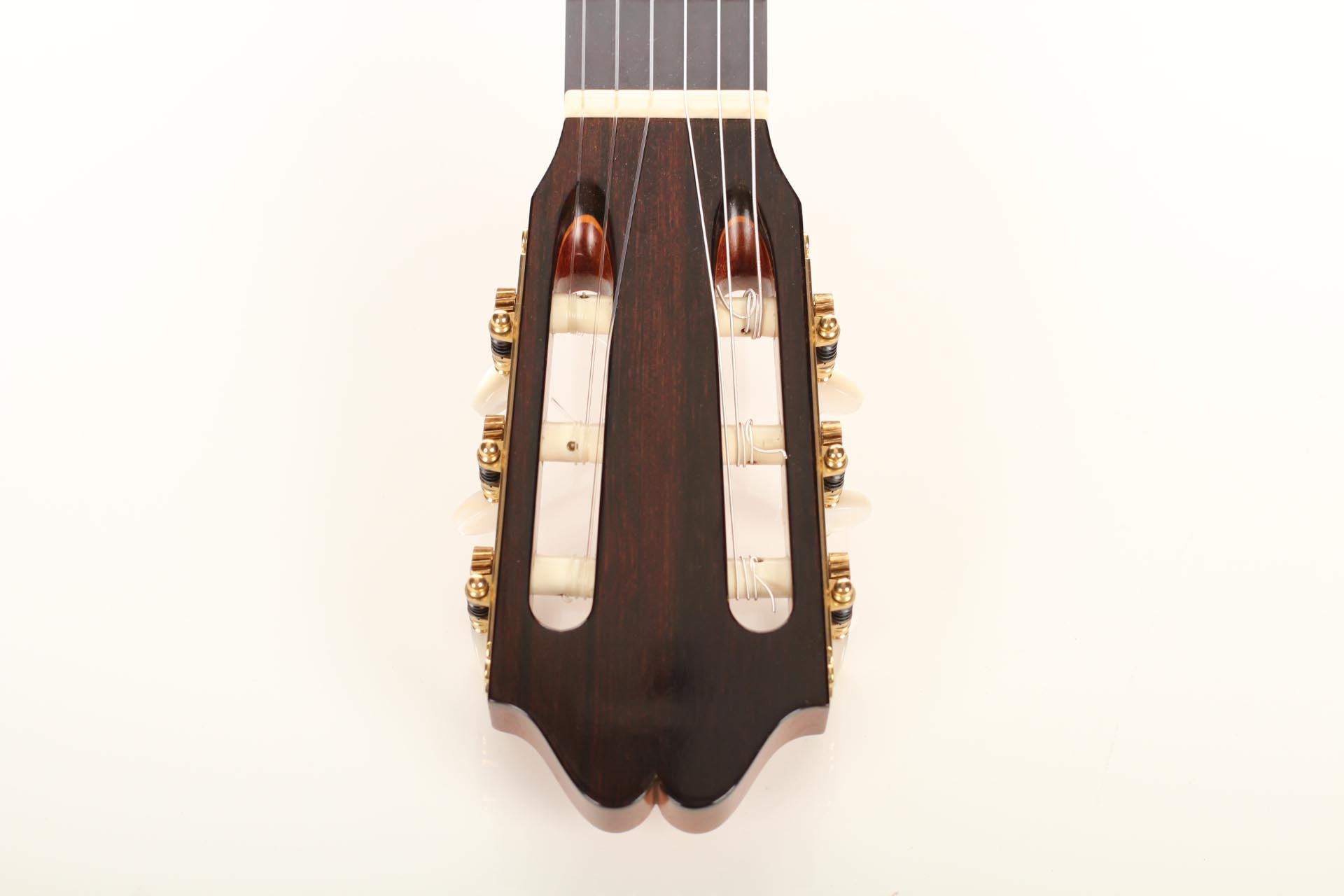 This particular guitar expresses with success both aesthetic and sound qualities that characterise Robert Bouchet’s priceless instruments. It is a light weighted concert guitar with the finest CITES-certified Brazilian rosewood quality and perfectly quarter saw spruce. It is worth pointing out that nowadays, such a beautiful dark and beautiful Brazilian rosewood log is very hard to find. The table is French-varnished with original warm-coloured shellac. It is equipped of very high-quality Rogers tuners. The guitar has only a very few playing marks and no structural issue. As the mid-century guitars of Robert Bouchet, it is a very responsive instrument with great tone contrast possibilities. The charming sound is very refined, rich and delicate. It is a very complete guitar with a very high level on every aspect expected from a concert guitar: quality of tone, sustain, sympathetic resonances, contrast and balance and power. This is a rare and outstanding instrument in every aspect of sound and aesthetics. A hard-shell case is included.