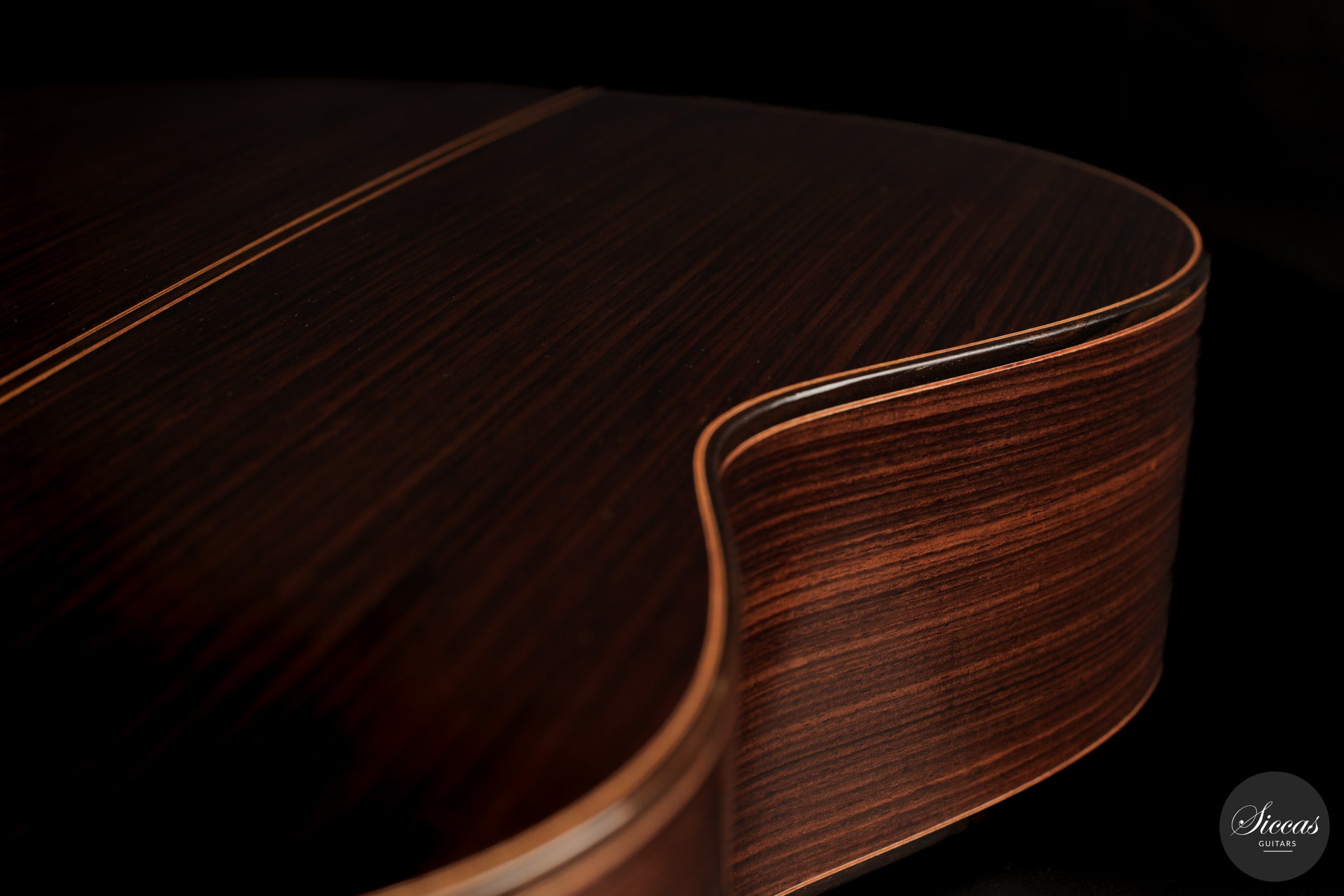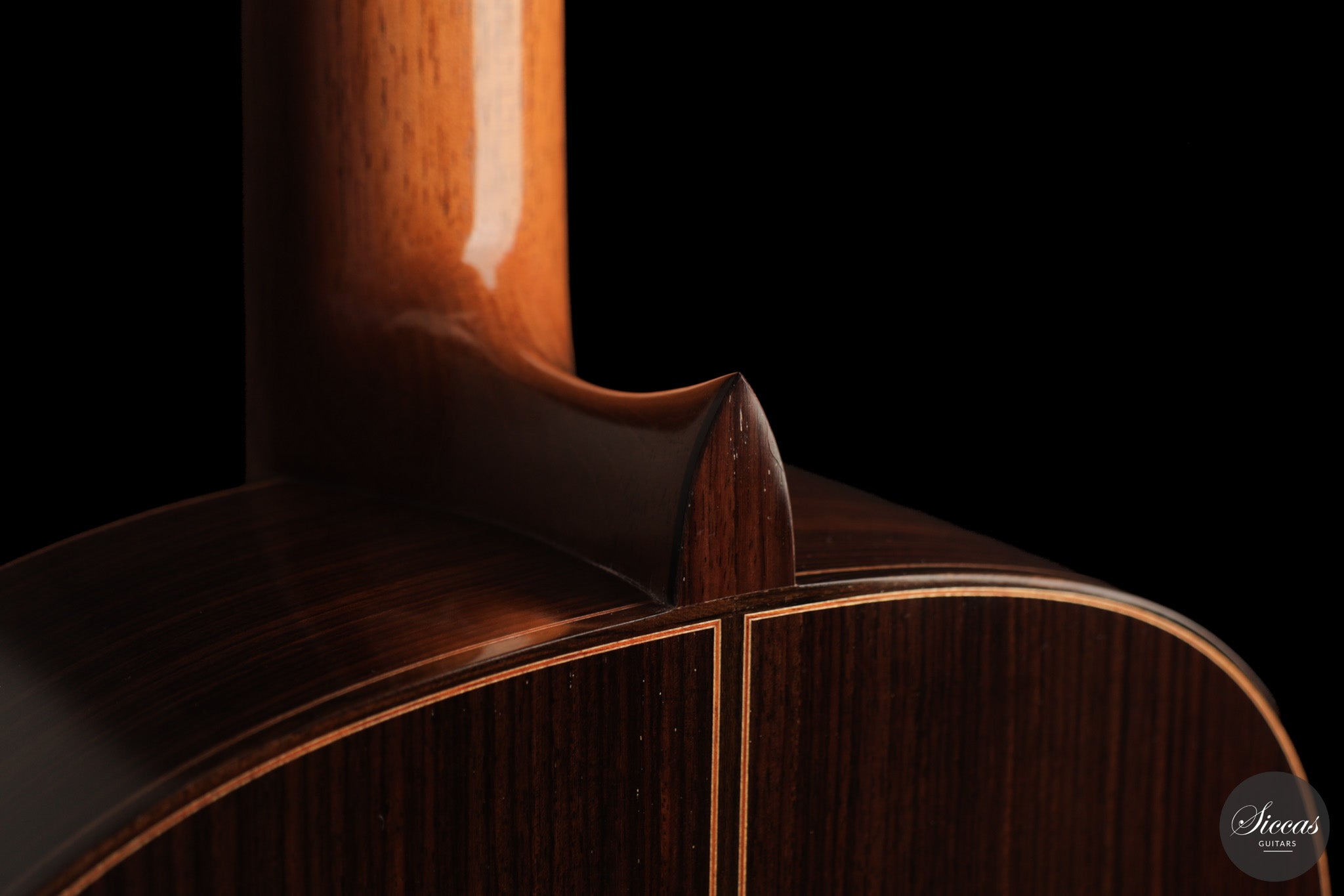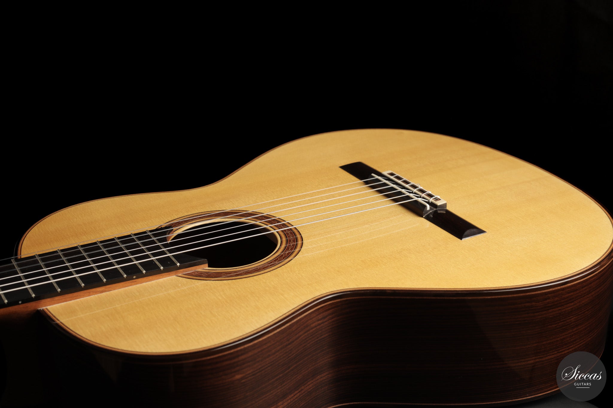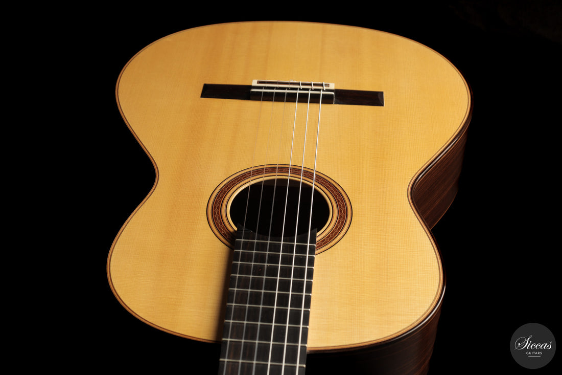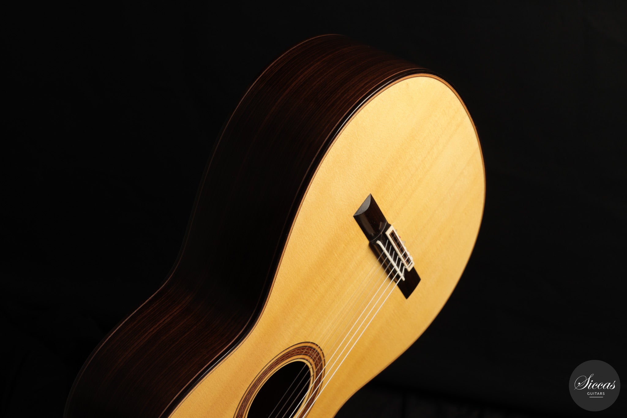 Die Kombination aus Fichtendecke und Korpus aus indischem Palisander sorgt für ein ausgewogenes Klangbild über alle Register hinweg, mit sehr gutem Sustain und einer schönen Transparenz sowohl im Akkordspiel als auch in einlinigen Passagen. Die Gitarre bietet Projektion und Unmittelbarkeit, bleibt dabei jedoch stets kontrolliert. Besonders auffällig ist, wie klar die einzelnen Töne in jeder Lage des Griffbretts erhalten bleiben, wodurch sich ein breites Farbspektrum eröffnet, ohne dass die klangliche Geschlossenheit verloren geht.