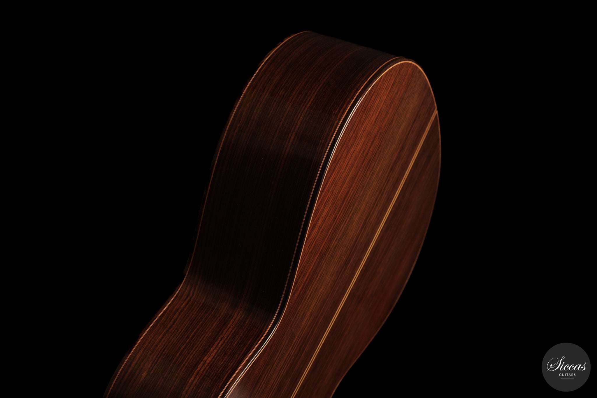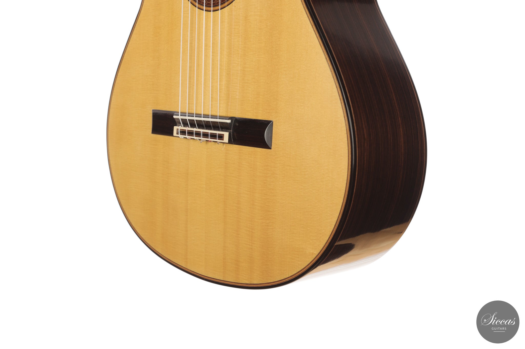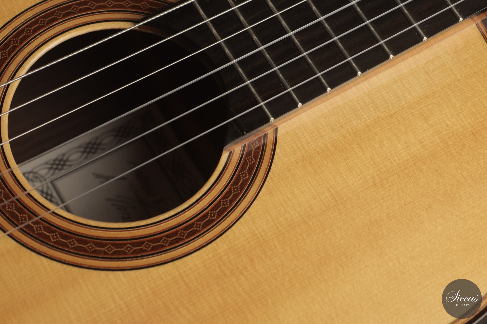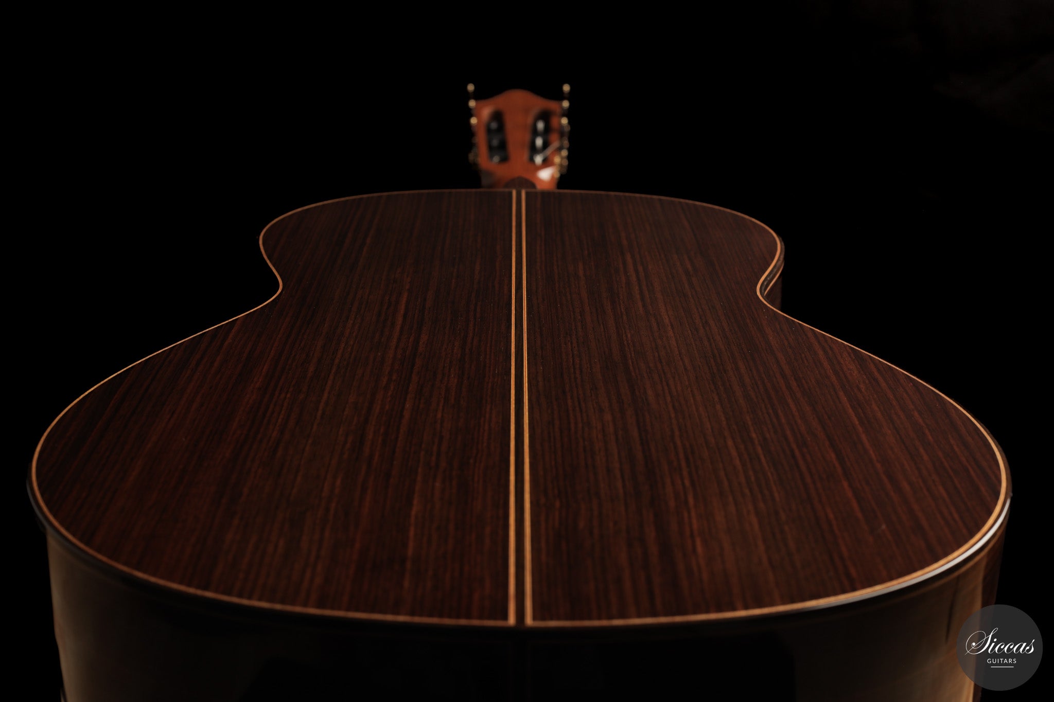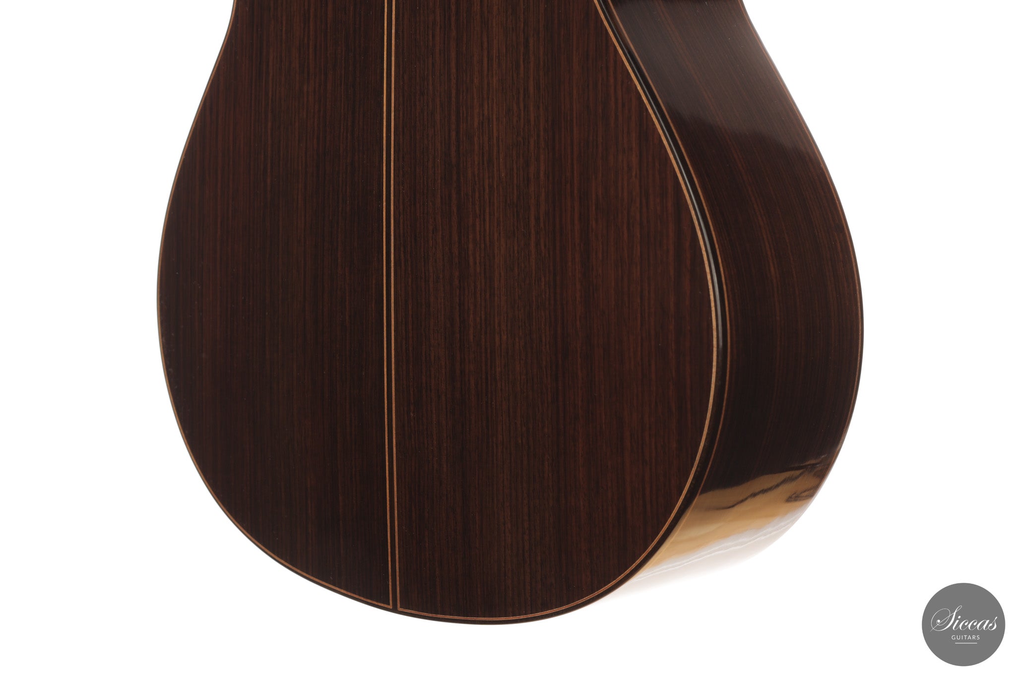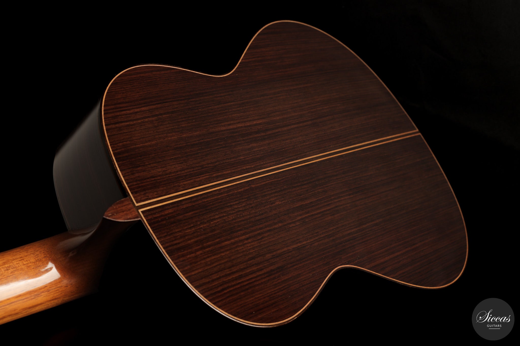 Die Kombination aus Fichtendecke und Korpus aus indischem Palisander sorgt für ein ausgewogenes Klangbild über alle Register hinweg, mit sehr gutem Sustain und einer schönen Transparenz sowohl im Akkordspiel als auch in einlinigen Passagen. Die Gitarre bietet Projektion und Unmittelbarkeit, bleibt dabei jedoch stets kontrolliert. Besonders auffällig ist, wie klar die einzelnen Töne in jeder Lage des Griffbretts erhalten bleiben, wodurch sich ein breites Farbspektrum eröffnet, ohne dass die klangliche Geschlossenheit verloren geht.
