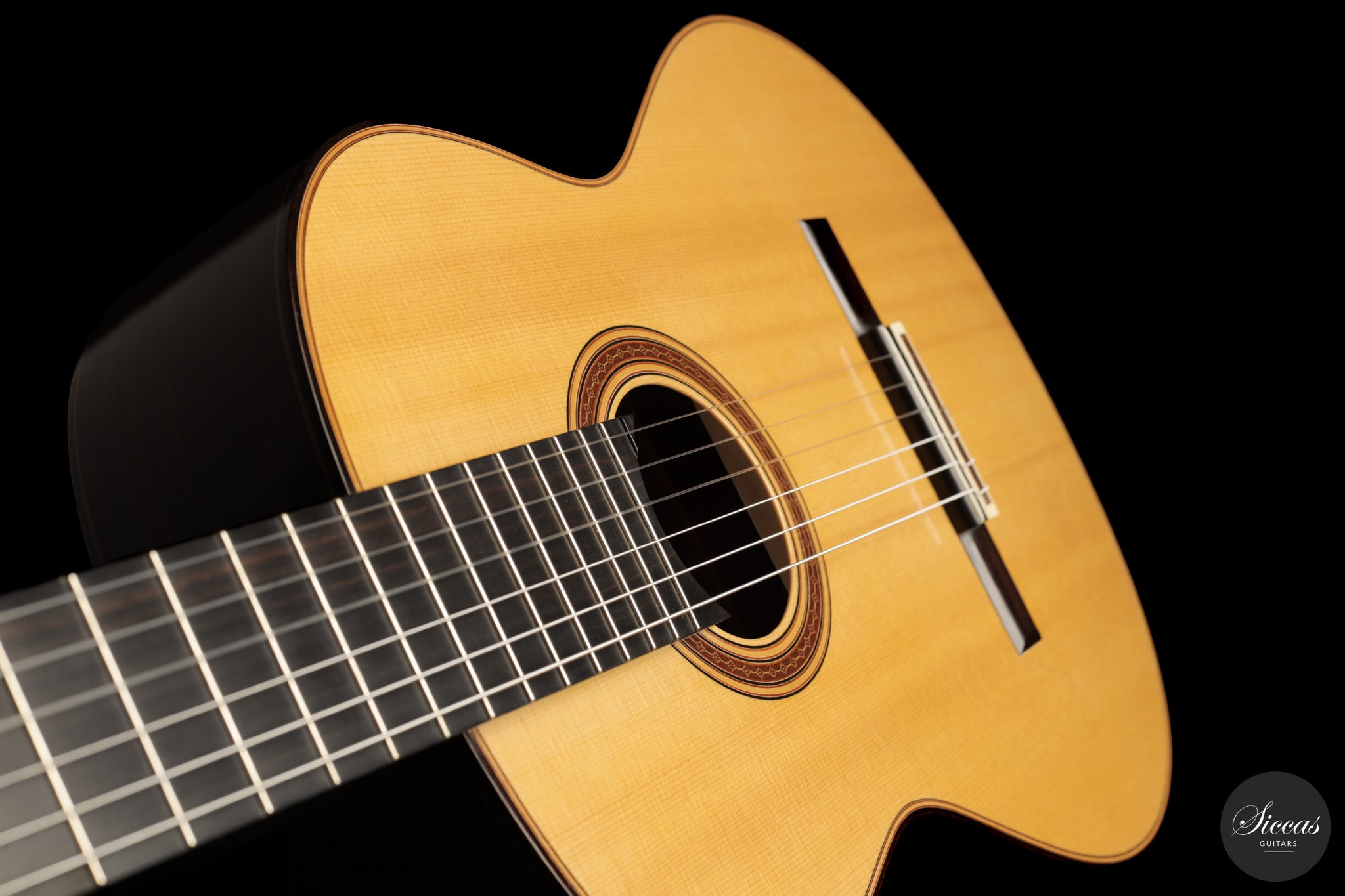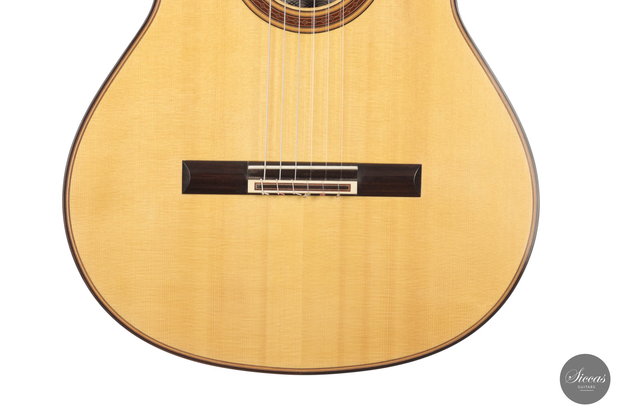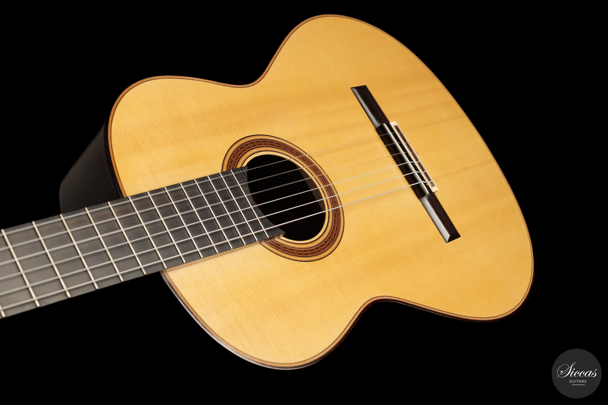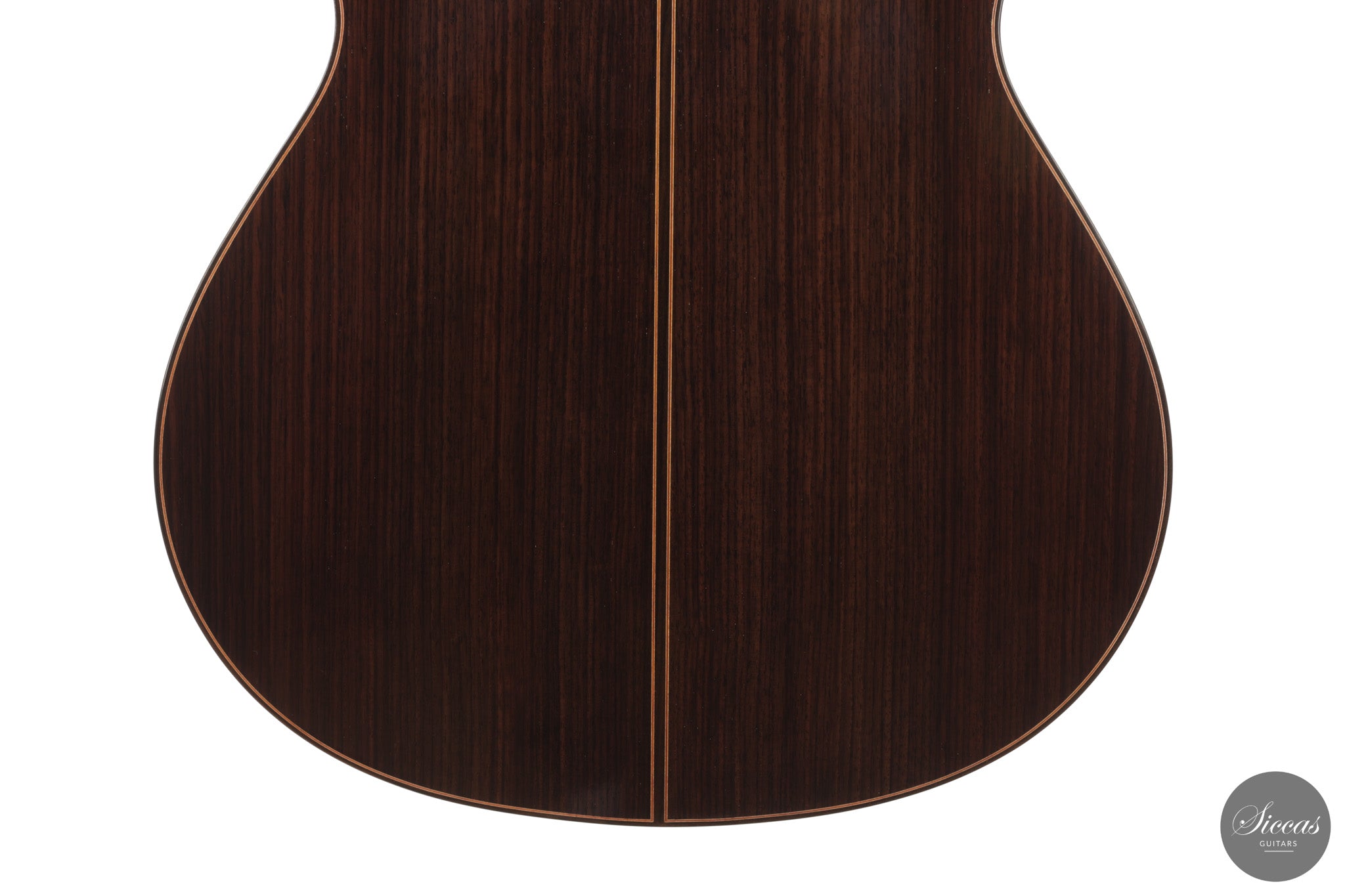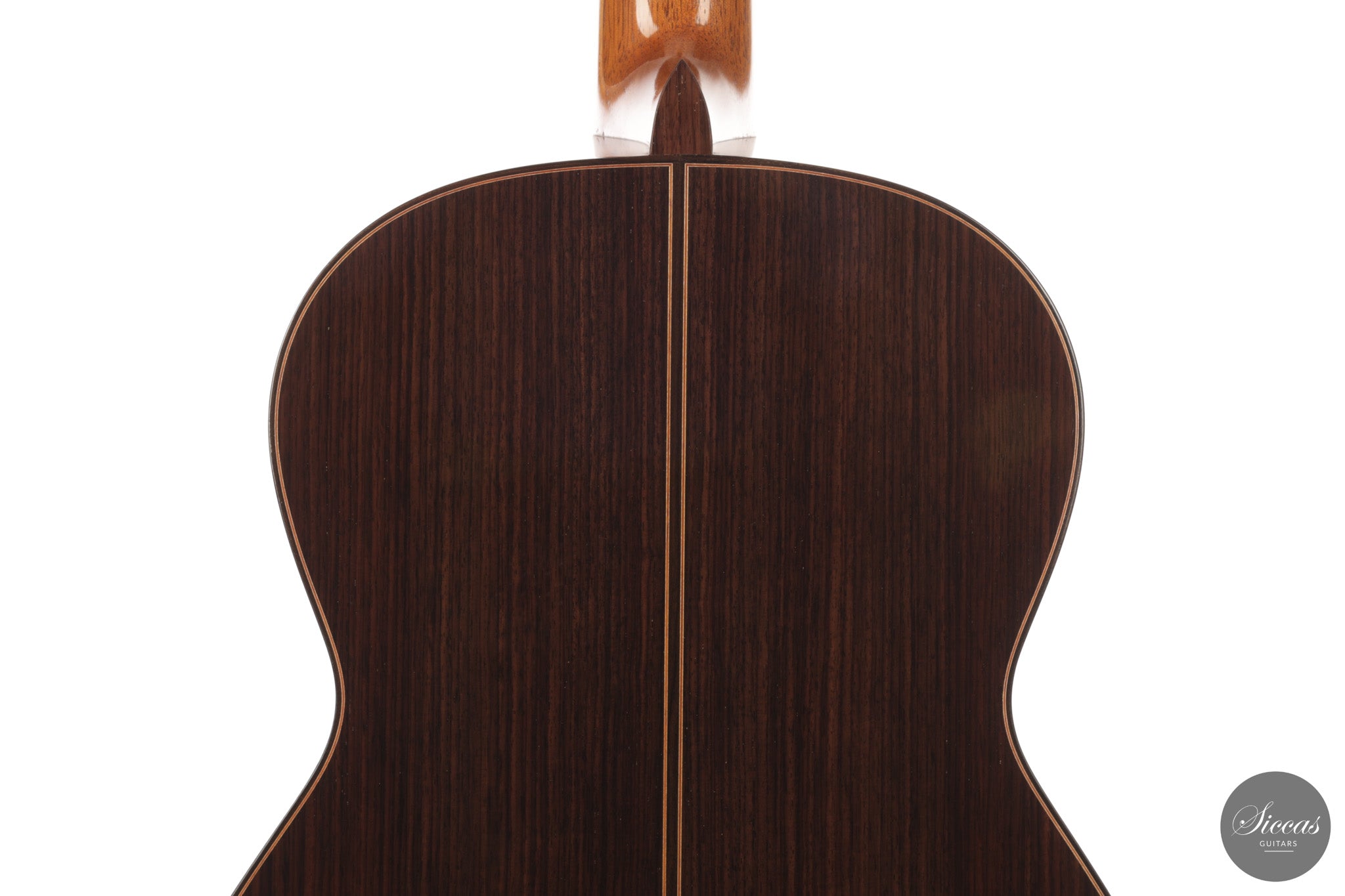 Die Kombination aus Fichtendecke und Korpus aus indischem Palisander sorgt für ein ausgewogenes Klangbild über alle Register hinweg, mit sehr gutem Sustain und einer schönen Transparenz sowohl im Akkordspiel als auch in einlinigen Passagen. Die Gitarre bietet Projektion und Unmittelbarkeit, bleibt dabei jedoch stets kontrolliert. Besonders auffällig ist, wie klar die einzelnen Töne in jeder Lage des Griffbretts erhalten bleiben, wodurch sich ein breites Farbspektrum eröffnet, ohne dass die klangliche Geschlossenheit verloren geht.