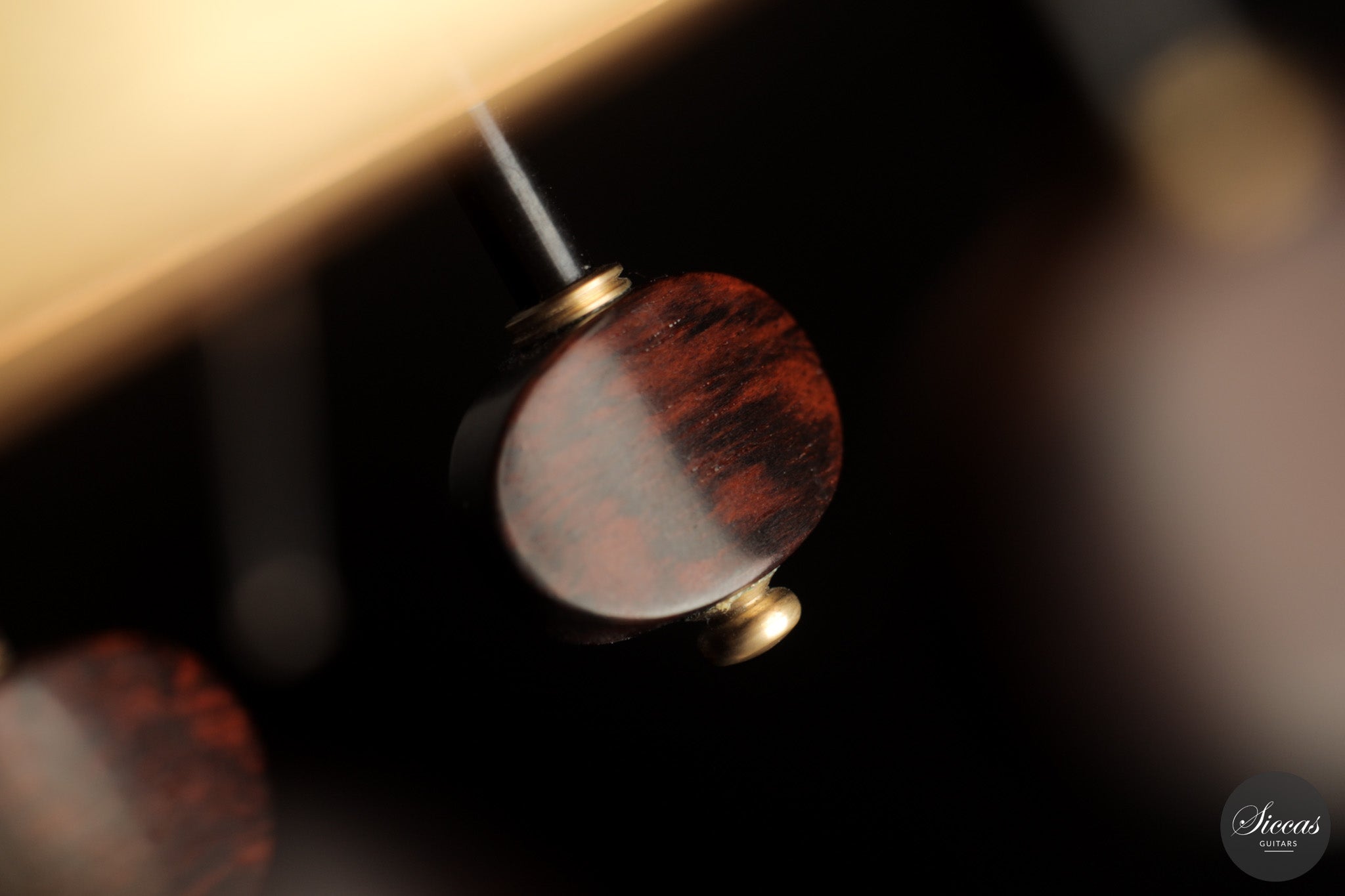 Die Ansprache ist schnell, der Tonansatz sauber und das Spielgefühl ausgesprochen komfortabel. Konstruktive Details wie das leicht erhöhte Griffbrett unterstützen diese angenehme Handhabung, während die hochwertigen Klaus Scheller Mechaniken das Instrument zusätzlich veredeln. So verbindet diese Gitarre Klarheit, Sustain und Flexibilität auf eine Weise, die gleichermaßen differenziert und musikalisch großzügig wirkt.