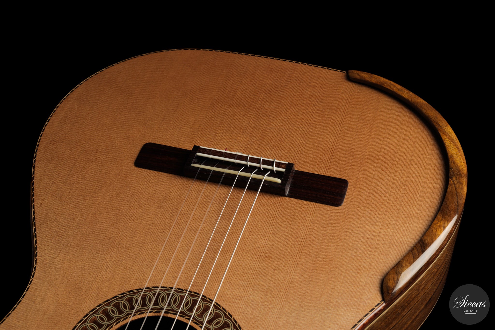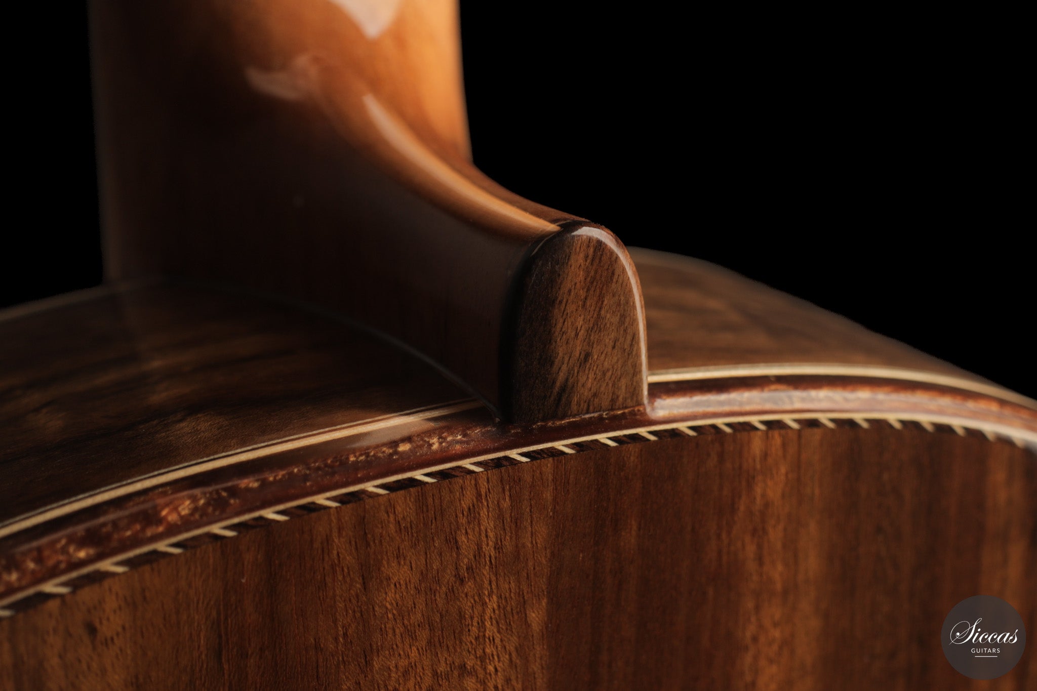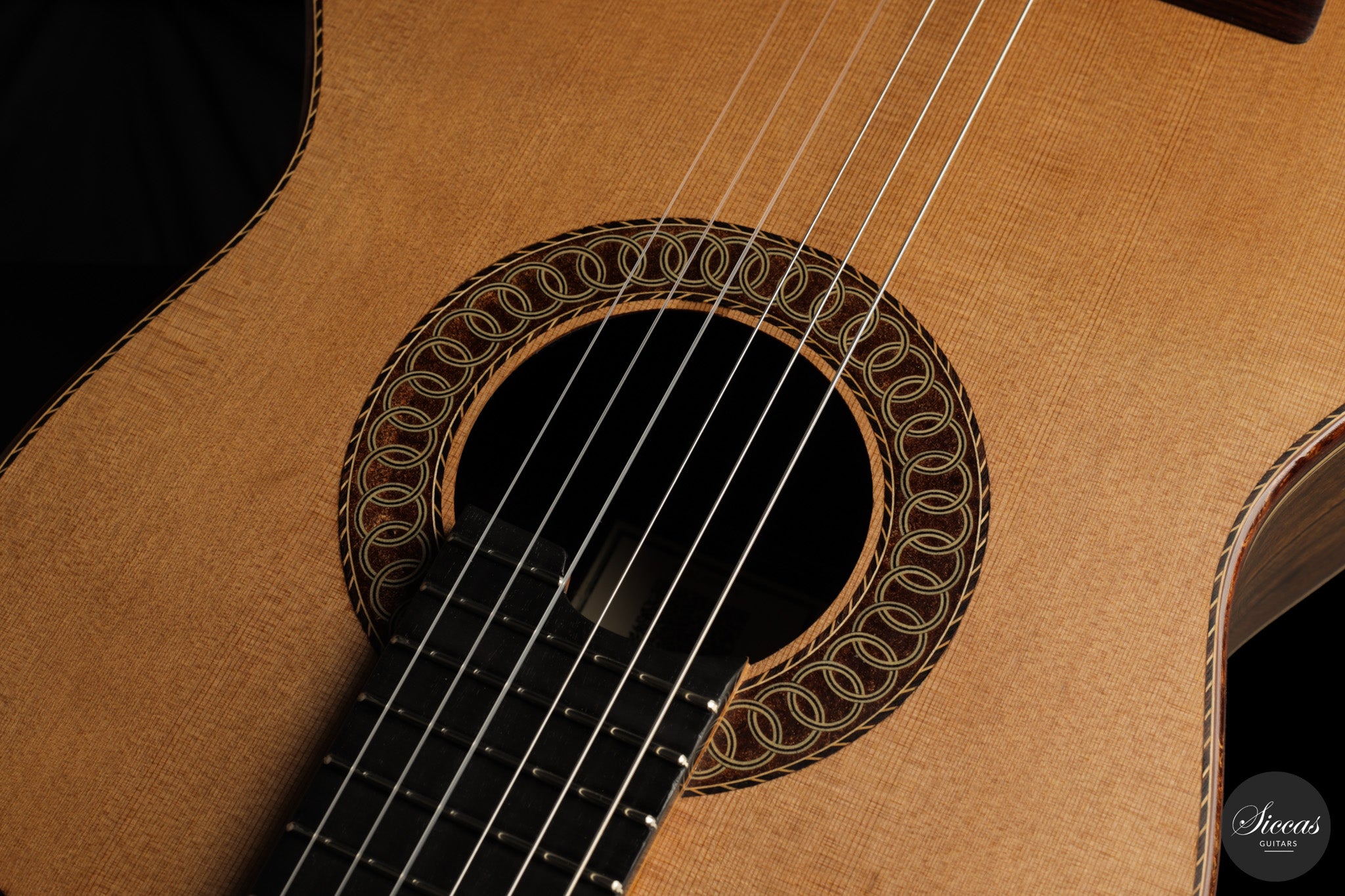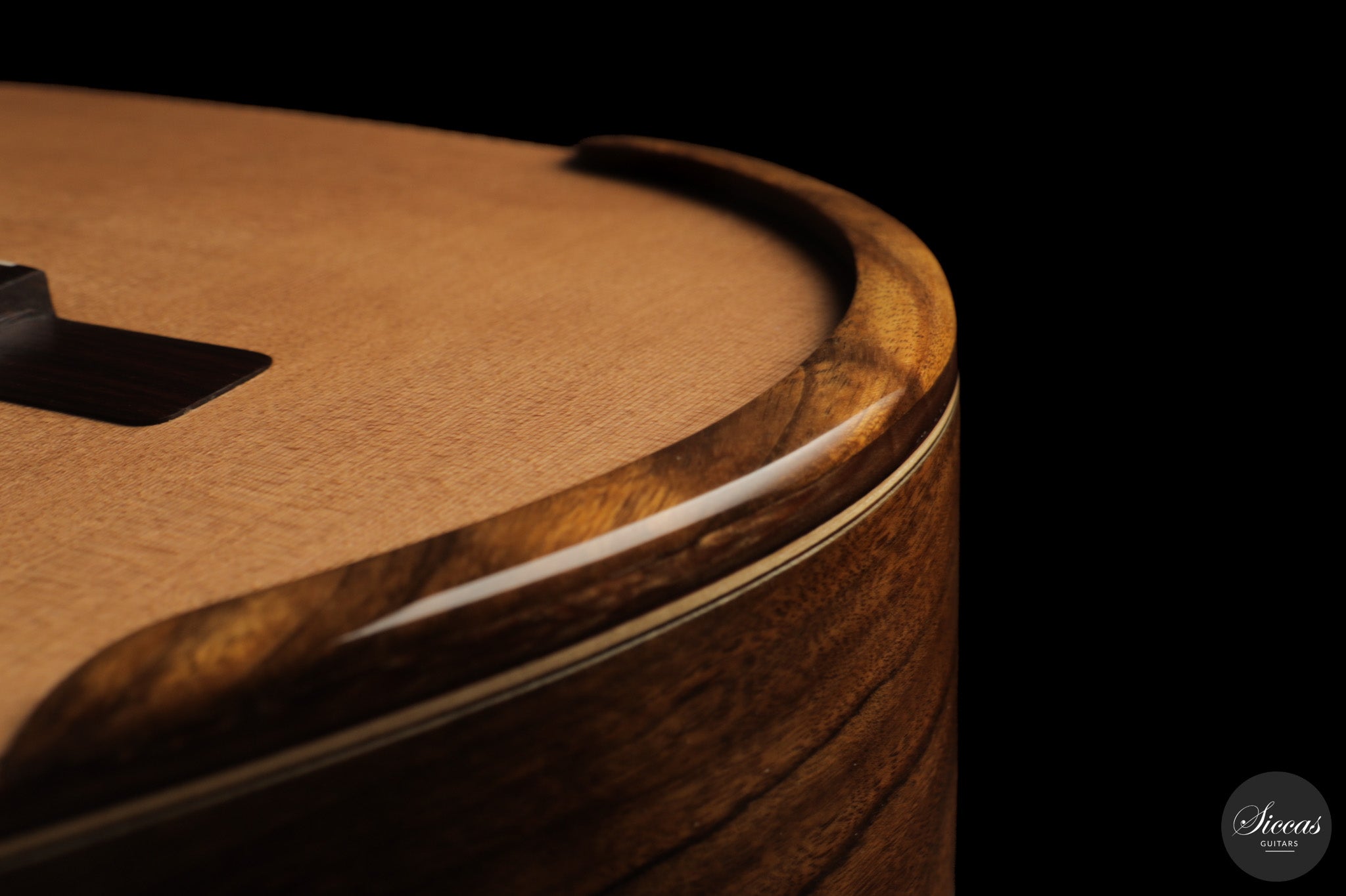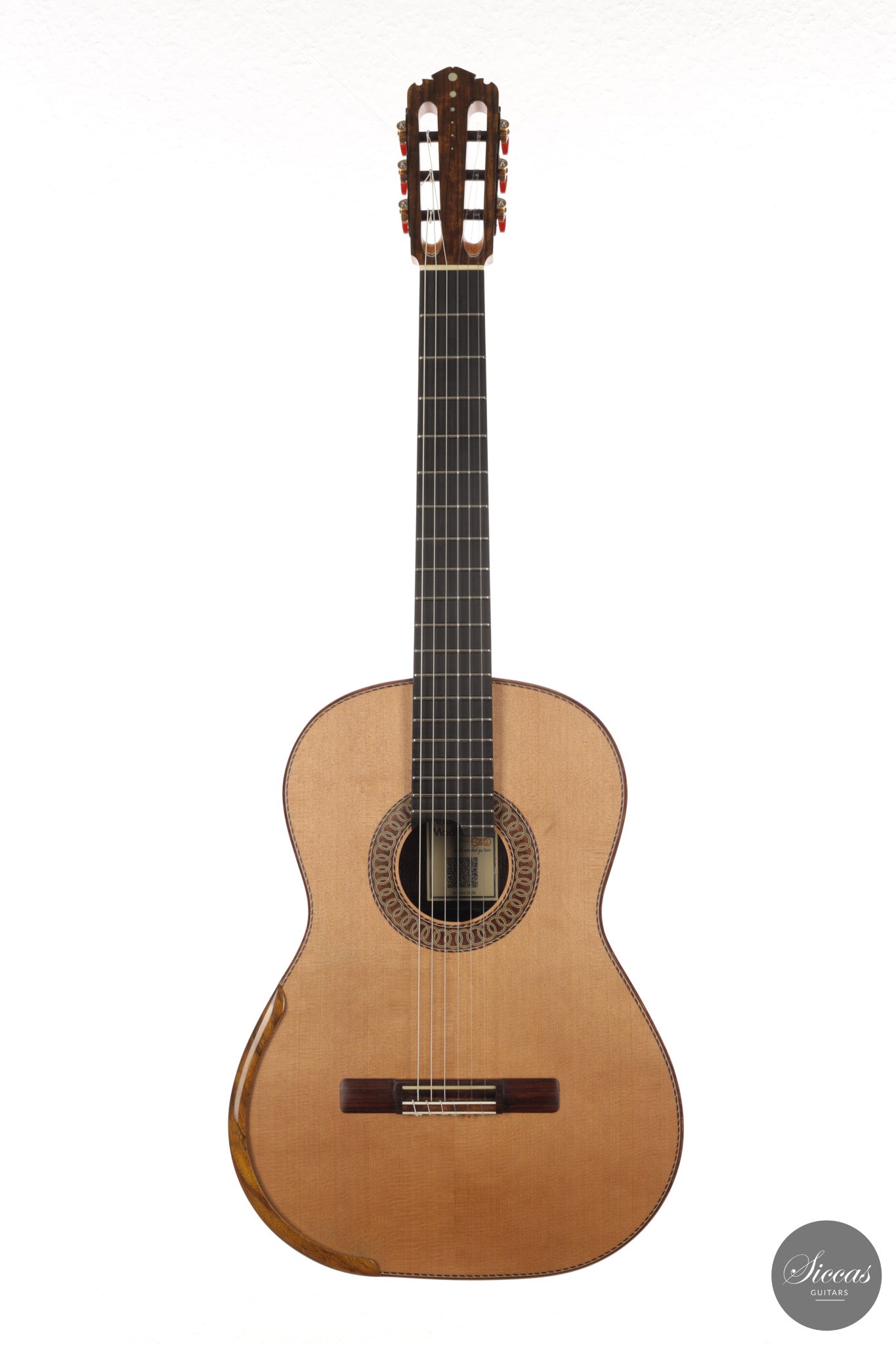 Auch die visuelle Gestaltung folgt einem durchdachten Konzept. Die indische Palisanderbrücke, die Bindings und die Rosette sind farblich und formal aufeinander abgestimmt und verleihen dem Instrument ein geschlossenes Erscheinungsbild. Die Bindings aus Epoxidharz werden direkt auf den Korpus gegossen und tragen zu einer eigenständigen ästhetischen Identität bei, während die ergonomische Armauflage den Spielkomfort erhöht. Von Hand gefertigte Pagos-Mechaniken vervollständigen ein Instrument, dessen Gestaltung funktional geprägt ist, ohne auf gestalterische Sorgfalt zu verzichten.