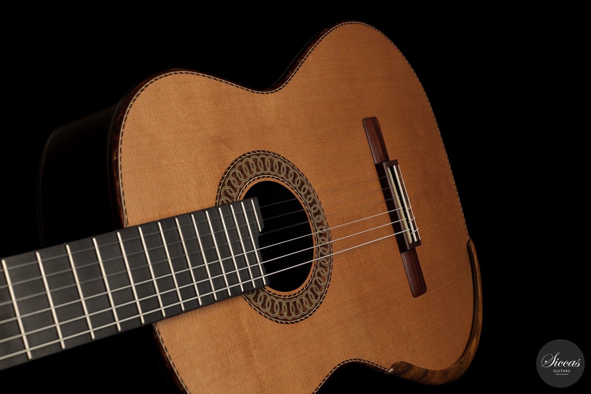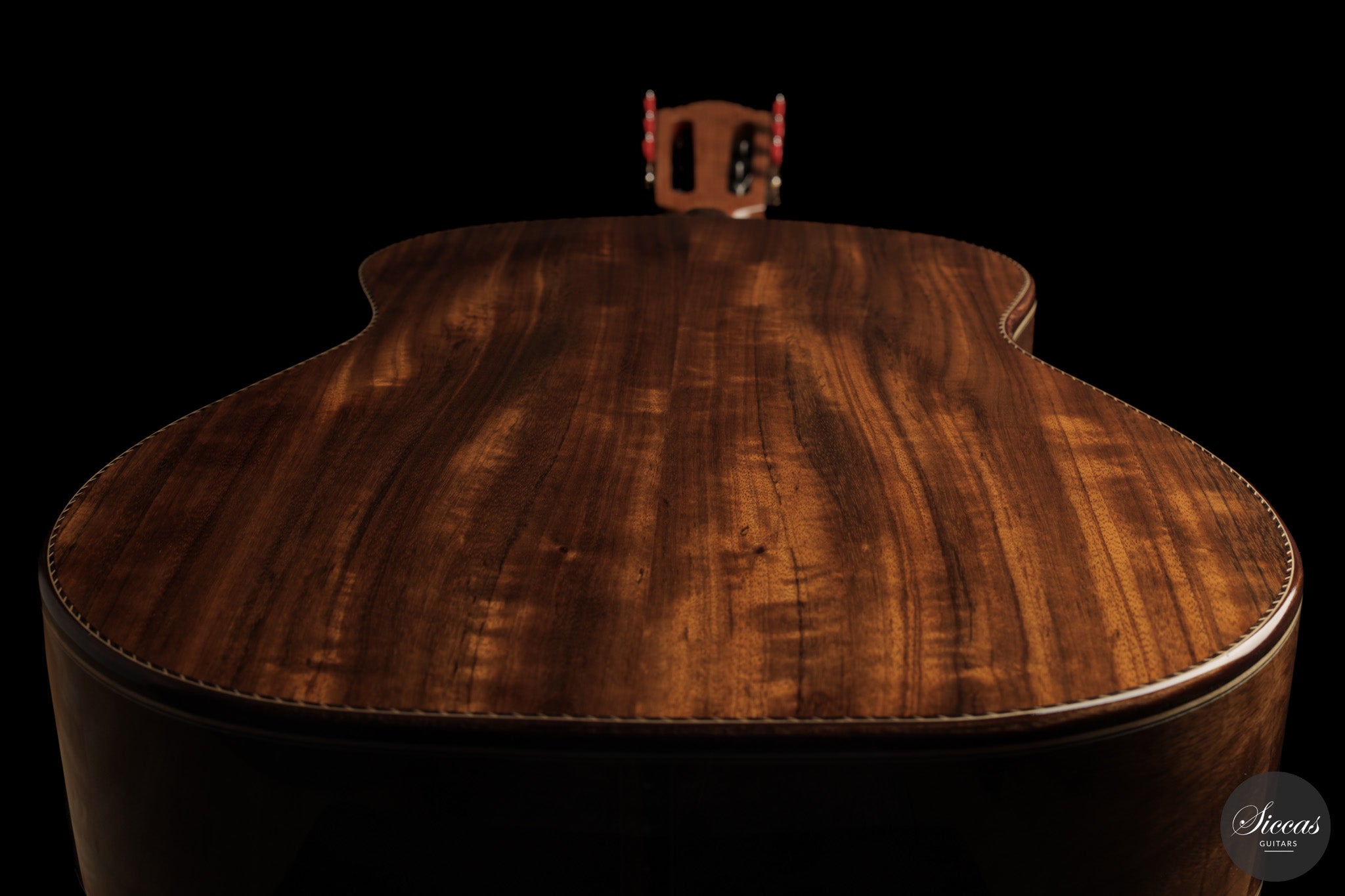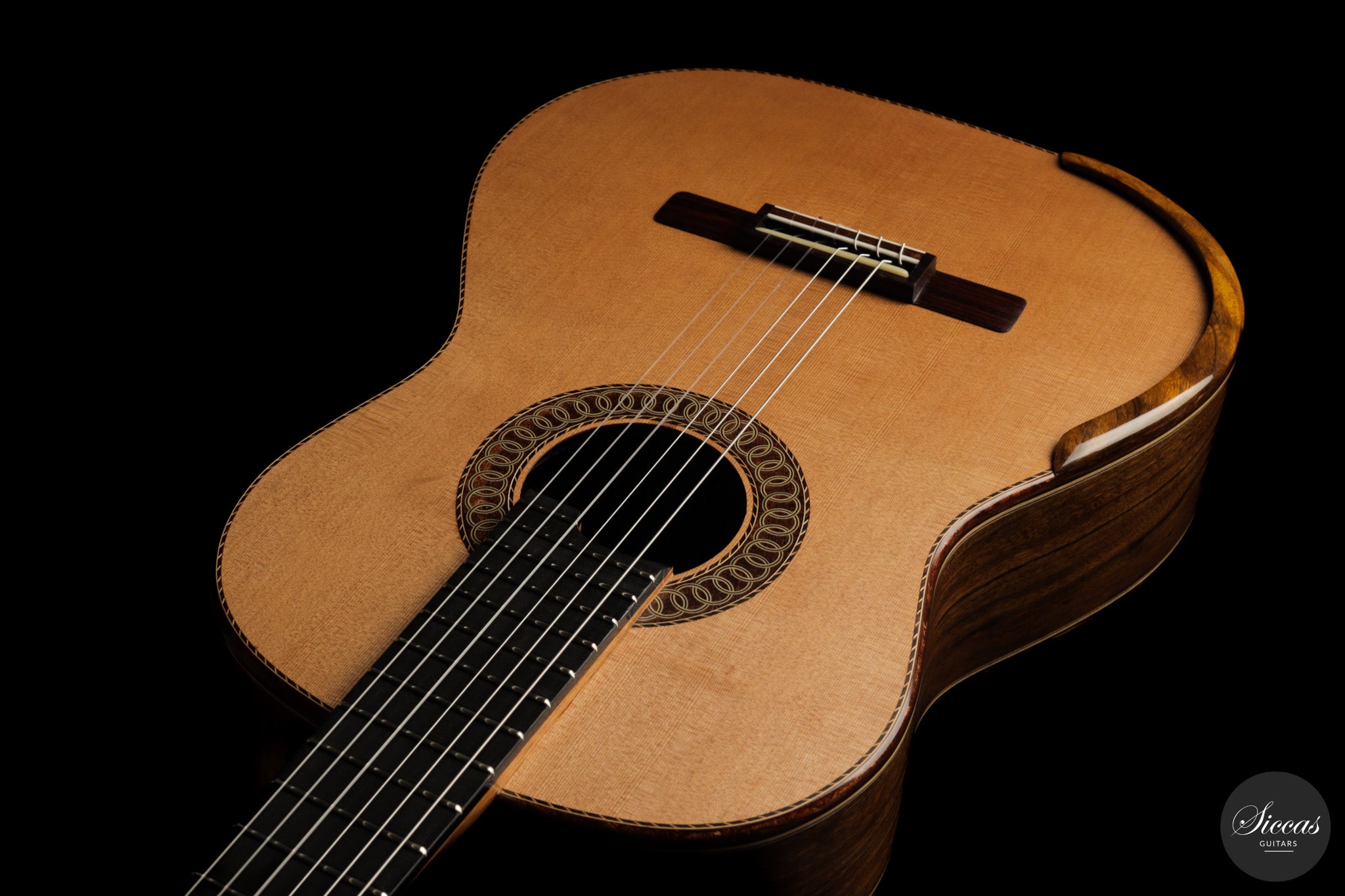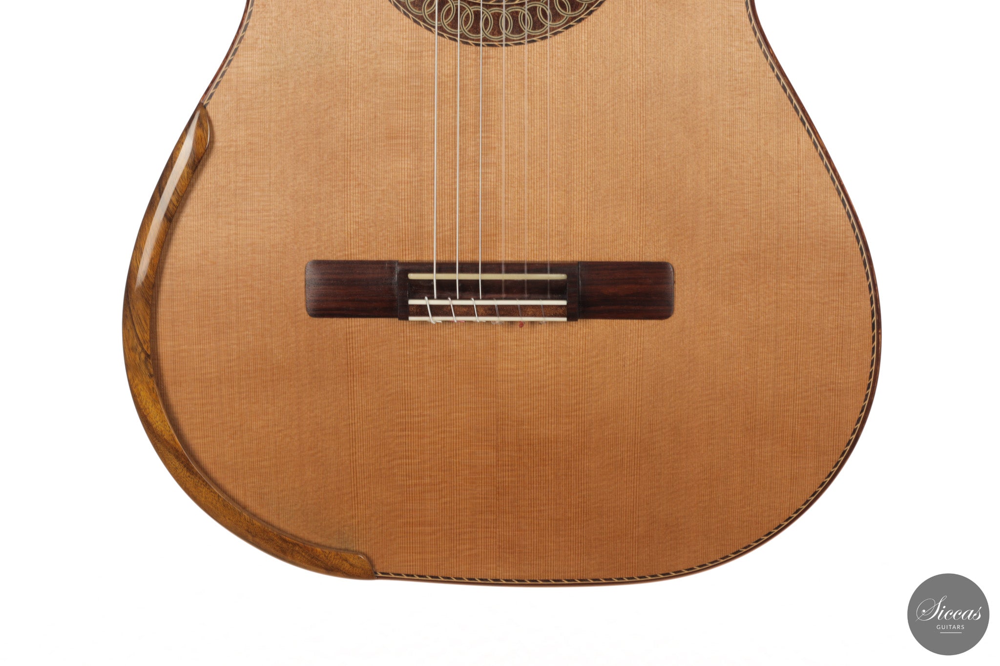 Auch die visuelle Gestaltung folgt einem durchdachten Konzept. Die indische Palisanderbrücke, die Bindings und die Rosette sind farblich und formal aufeinander abgestimmt und verleihen dem Instrument ein geschlossenes Erscheinungsbild. Die Bindings aus Epoxidharz werden direkt auf den Korpus gegossen und tragen zu einer eigenständigen ästhetischen Identität bei, während die ergonomische Armauflage den Spielkomfort erhöht. Von Hand gefertigte Pagos-Mechaniken vervollständigen ein Instrument, dessen Gestaltung funktional geprägt ist, ohne auf gestalterische Sorgfalt zu verzichten.