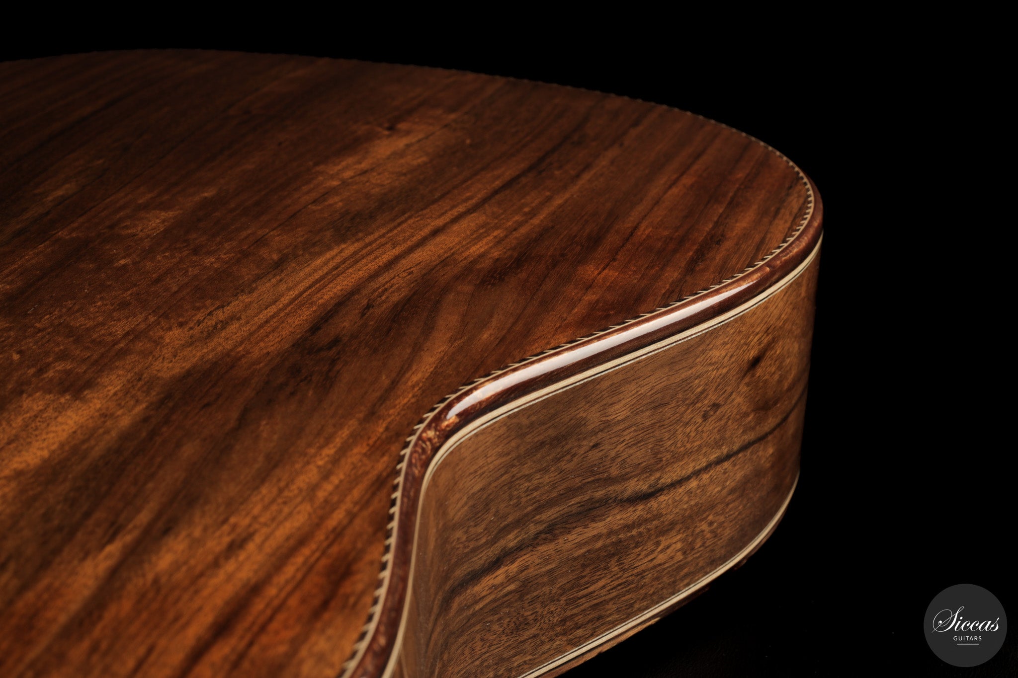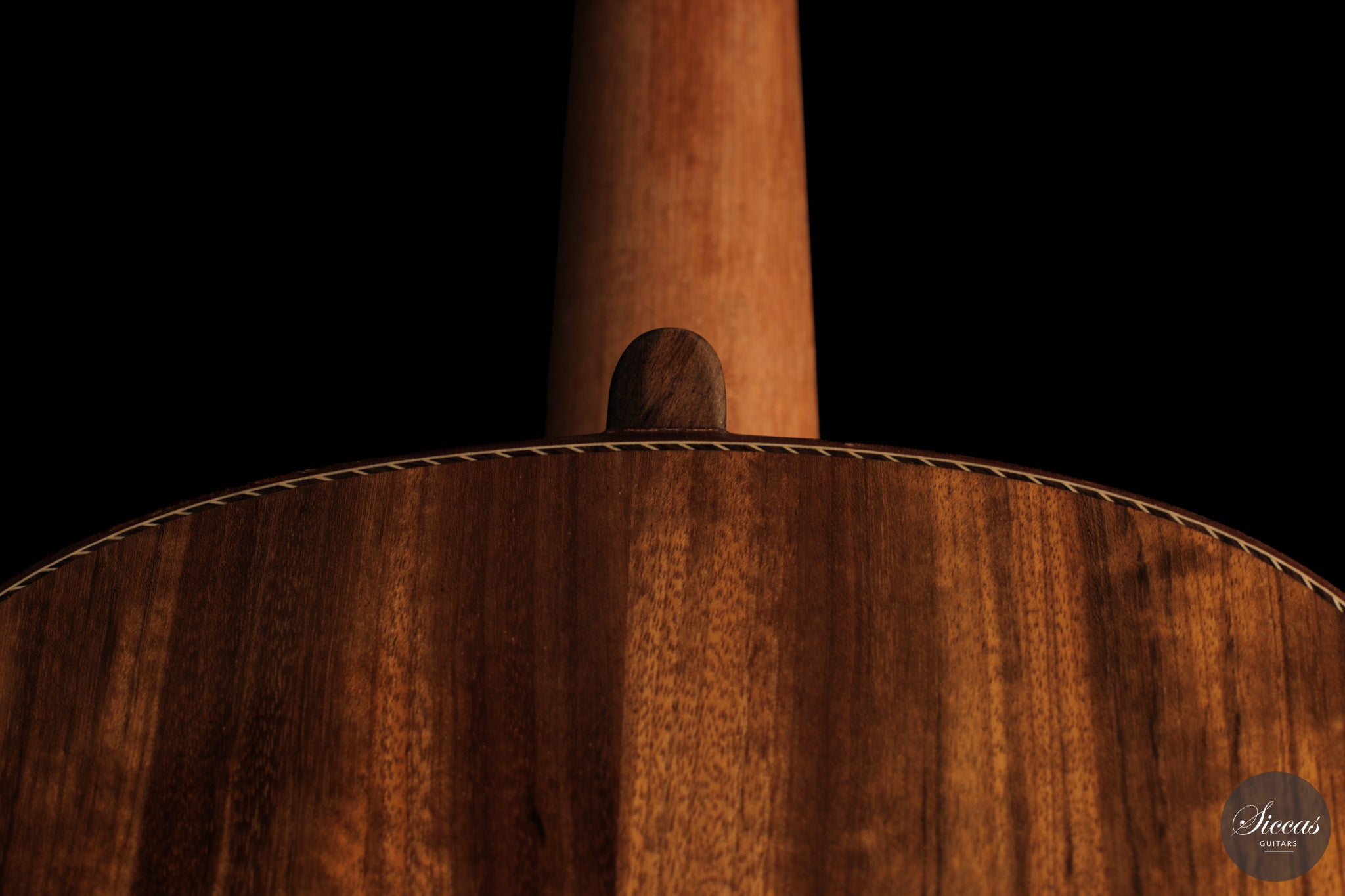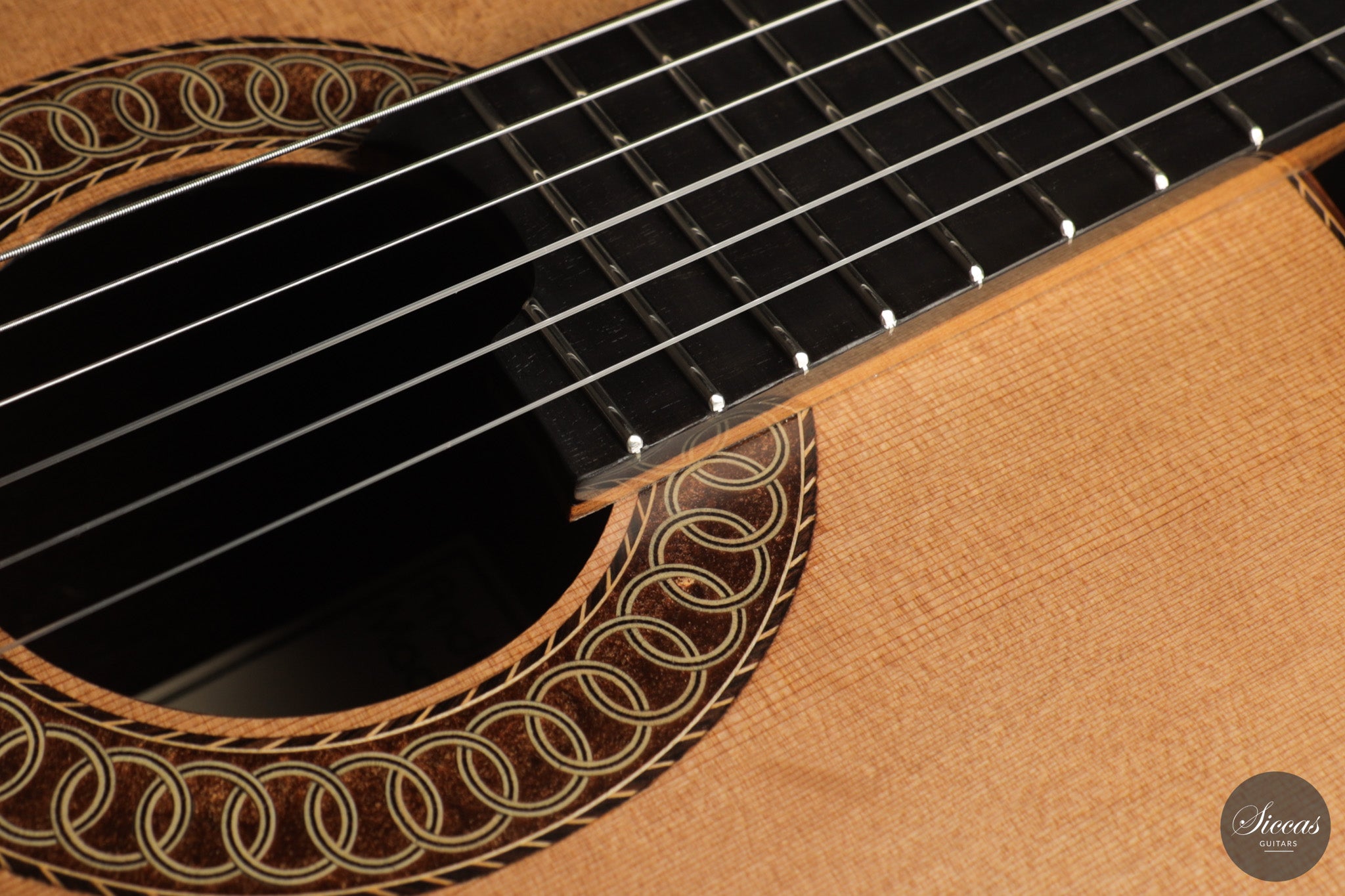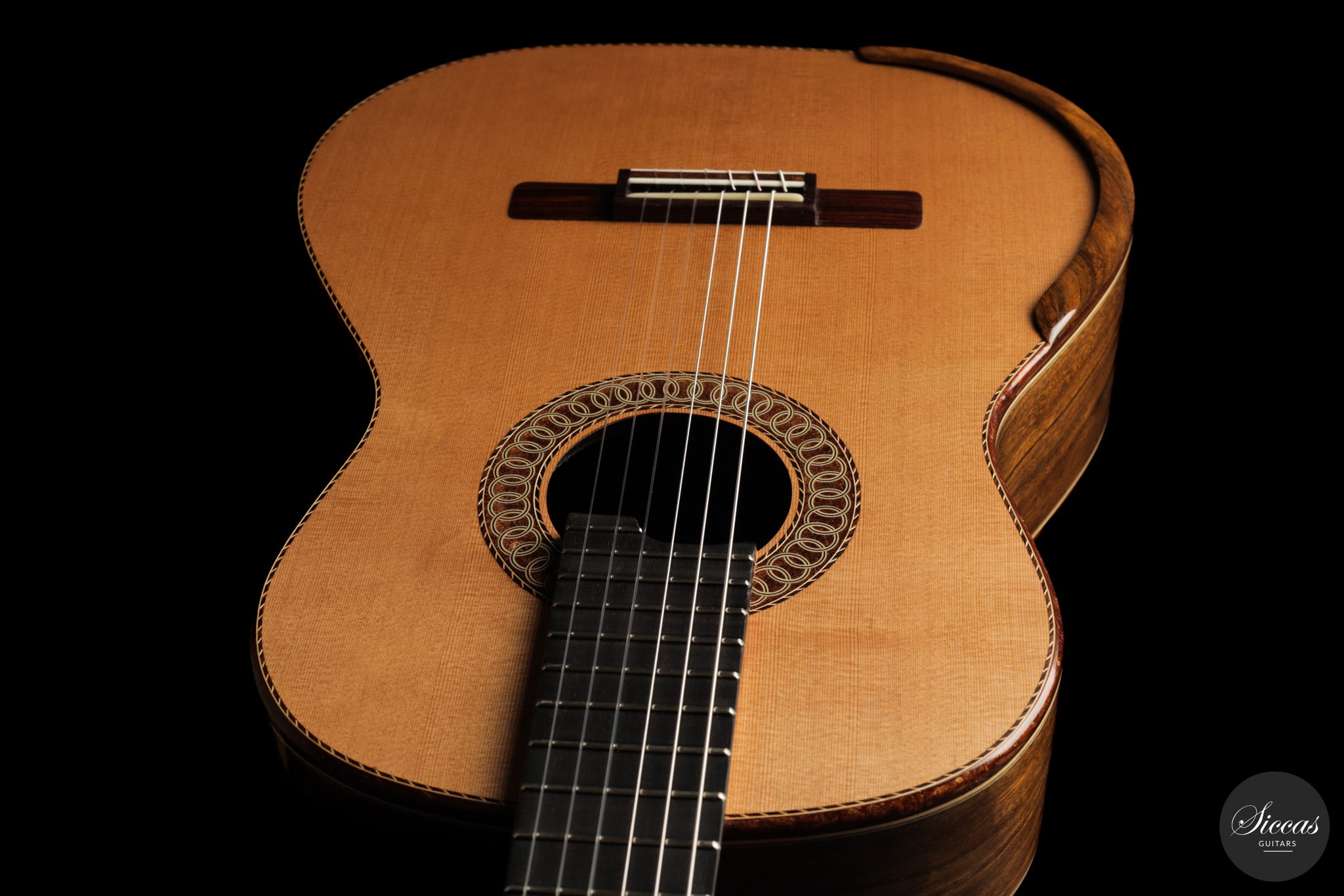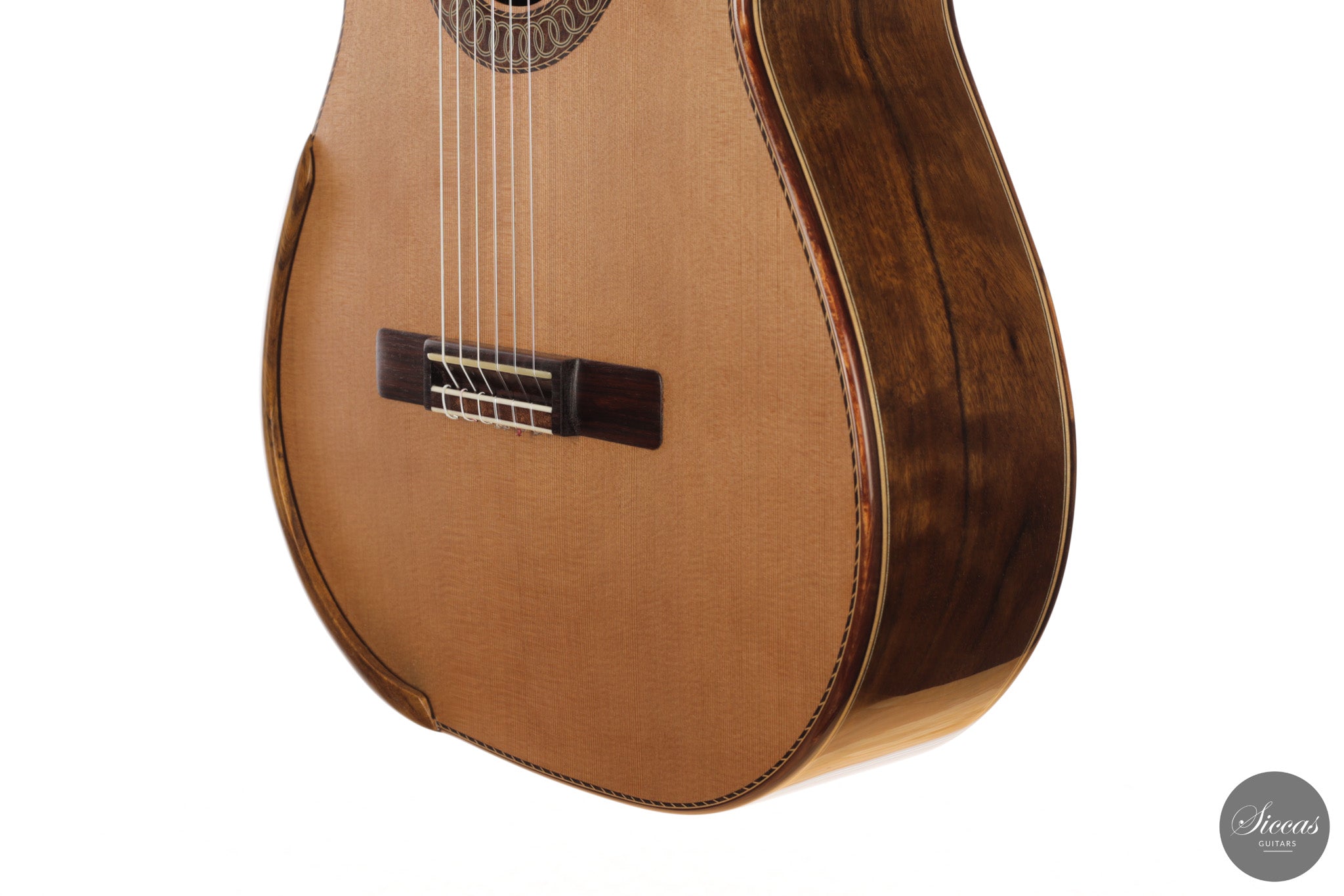 Auch die visuelle Gestaltung folgt einem durchdachten Konzept. Die indische Palisanderbrücke, die Bindings und die Rosette sind farblich und formal aufeinander abgestimmt und verleihen dem Instrument ein geschlossenes Erscheinungsbild. Die Bindings aus Epoxidharz werden direkt auf den Korpus gegossen und tragen zu einer eigenständigen ästhetischen Identität bei, während die ergonomische Armauflage den Spielkomfort erhöht. Von Hand gefertigte Pagos-Mechaniken vervollständigen ein Instrument, dessen Gestaltung funktional geprägt ist, ohne auf gestalterische Sorgfalt zu verzichten.