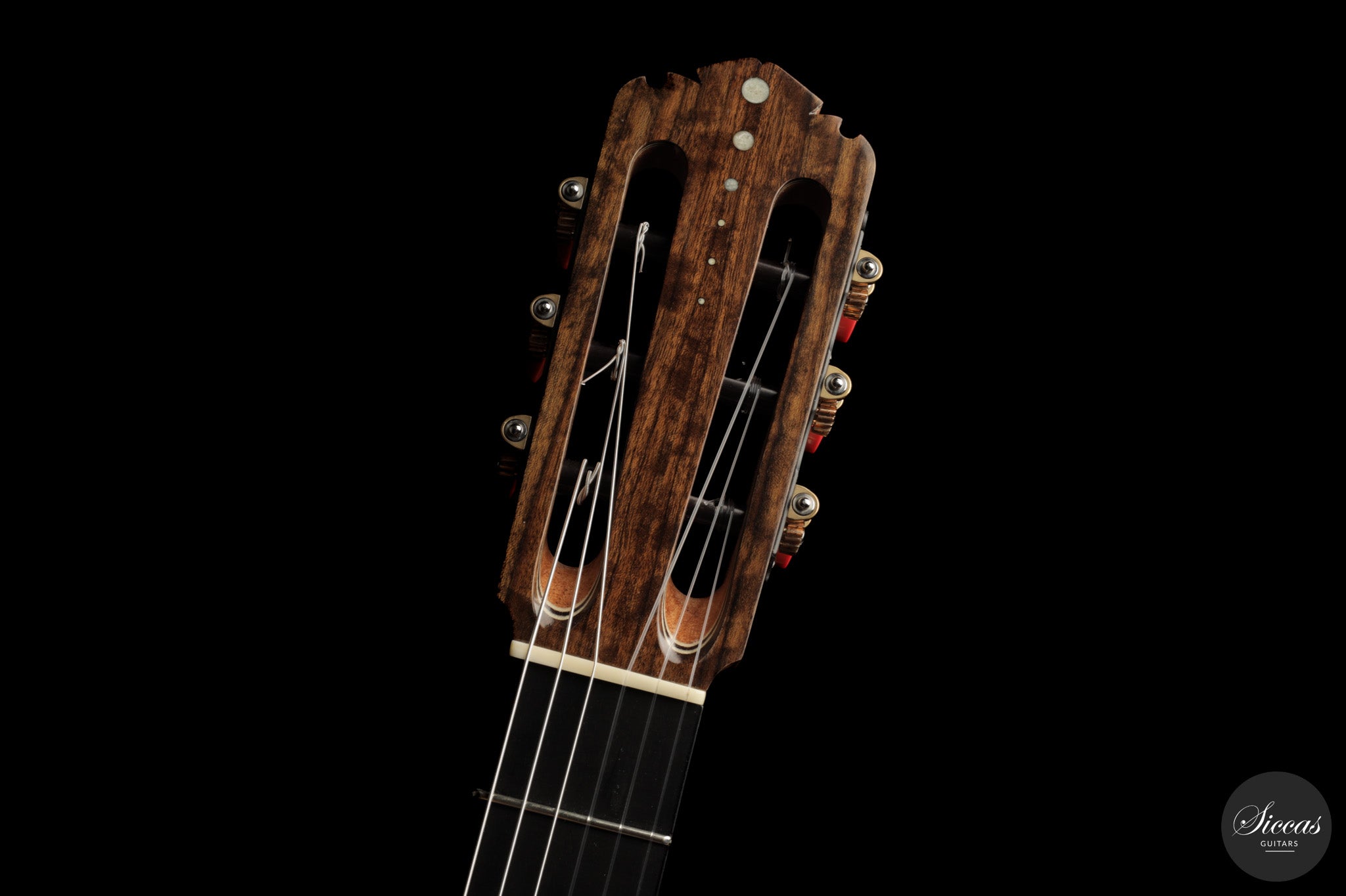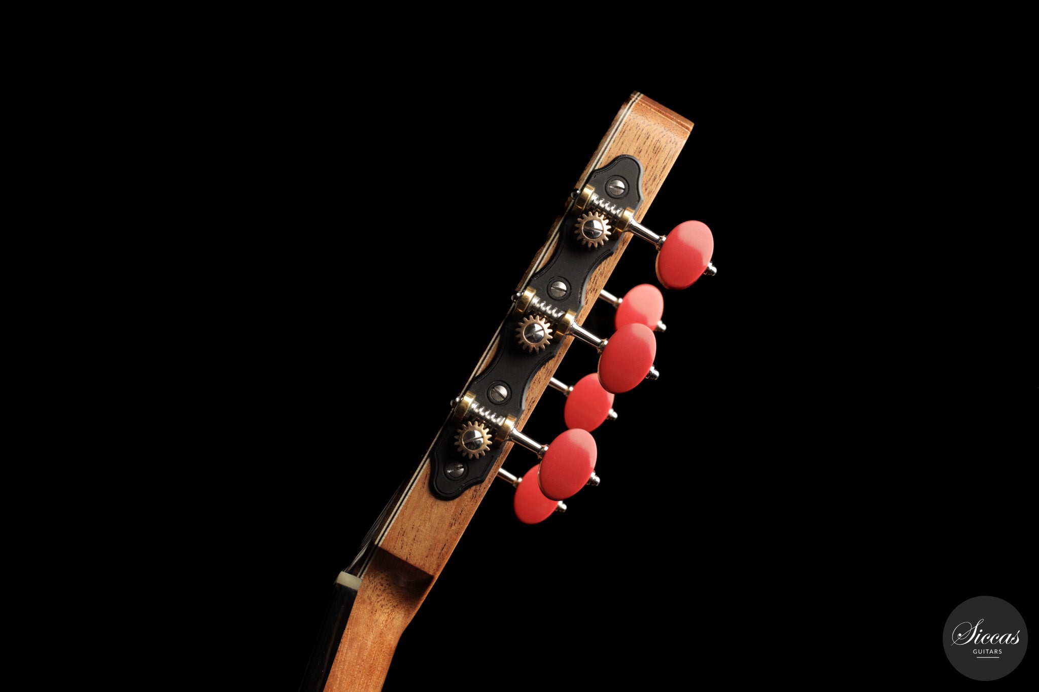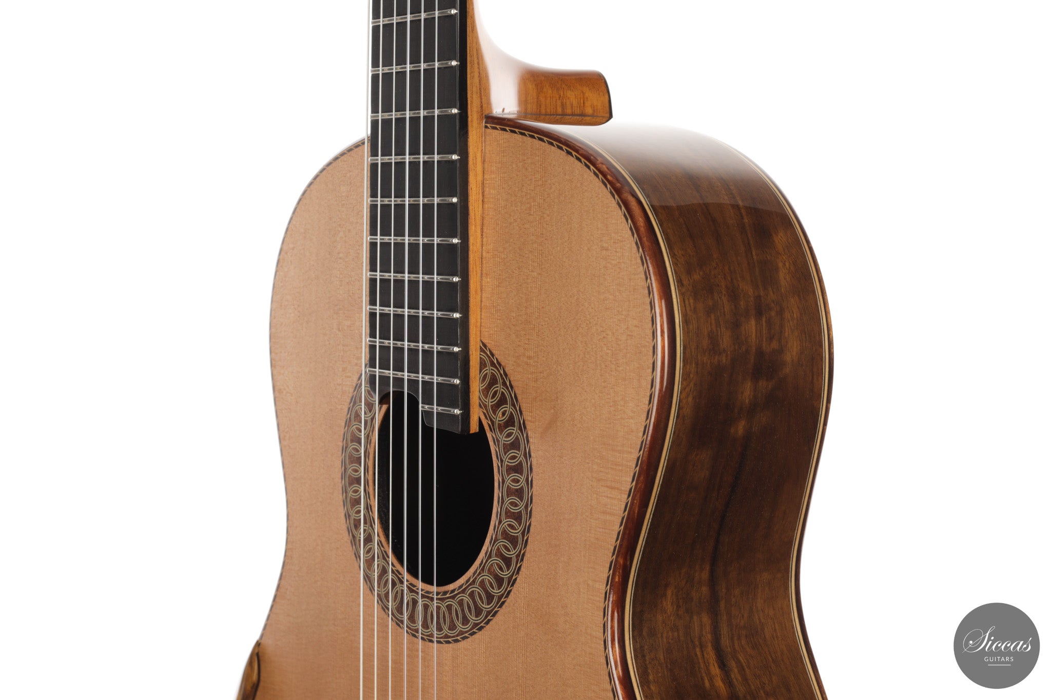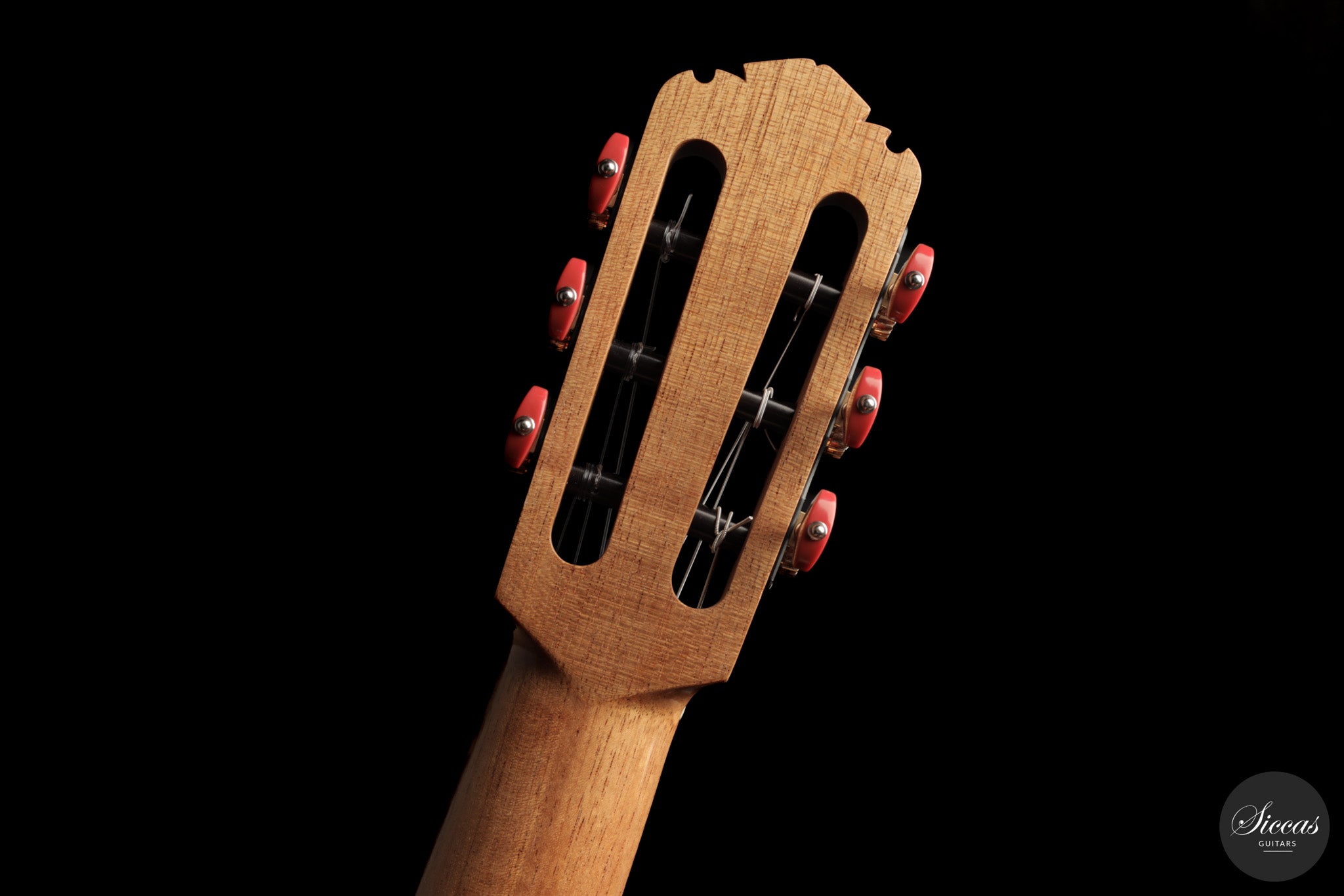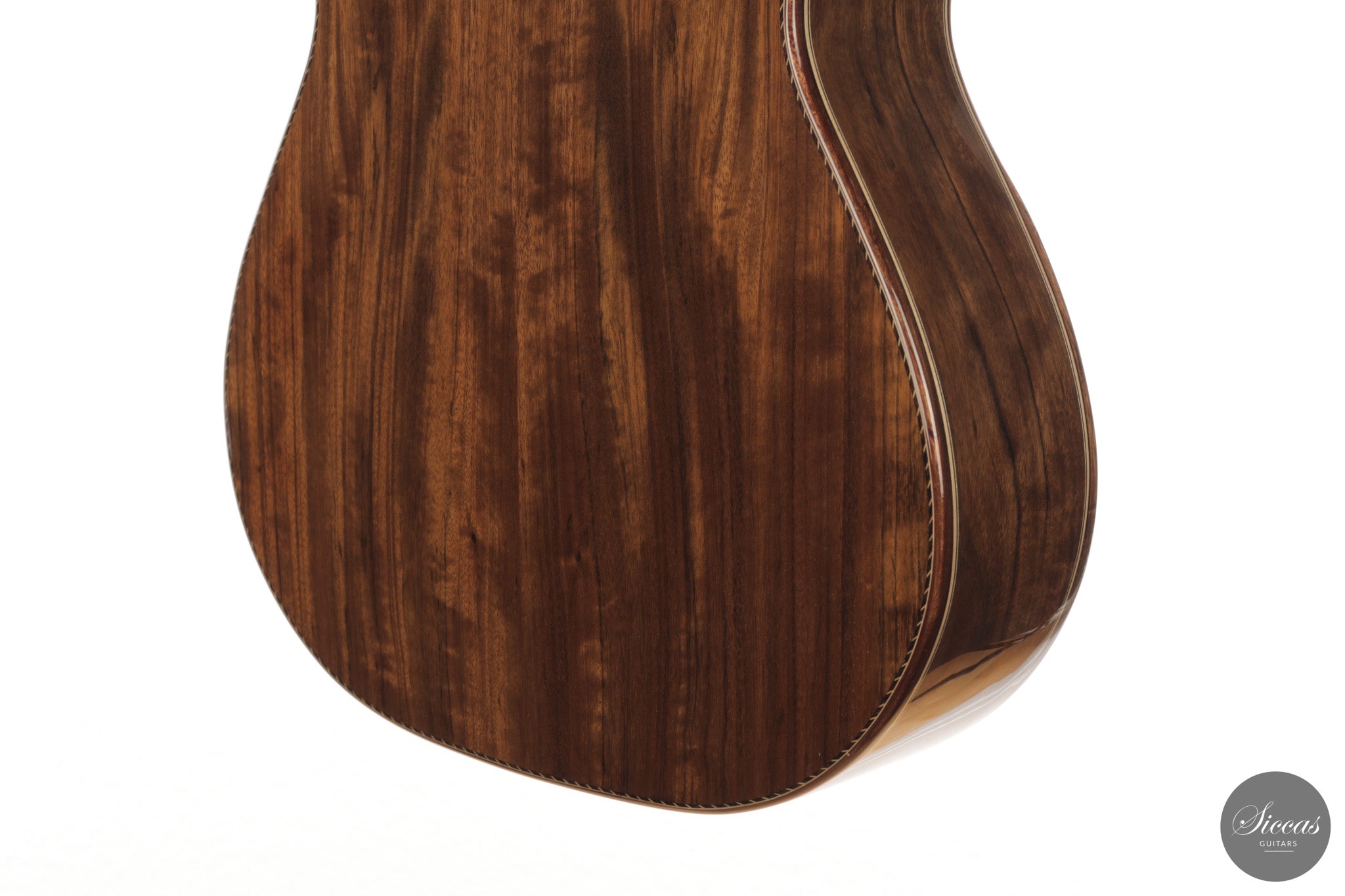 Auch die visuelle Gestaltung folgt einem durchdachten Konzept. Die indische Palisanderbrücke, die Bindings und die Rosette sind farblich und formal aufeinander abgestimmt und verleihen dem Instrument ein geschlossenes Erscheinungsbild. Die Bindings aus Epoxidharz werden direkt auf den Korpus gegossen und tragen zu einer eigenständigen ästhetischen Identität bei, während die ergonomische Armauflage den Spielkomfort erhöht. Von Hand gefertigte Pagos-Mechaniken vervollständigen ein Instrument, dessen Gestaltung funktional geprägt ist, ohne auf gestalterische Sorgfalt zu verzichten.