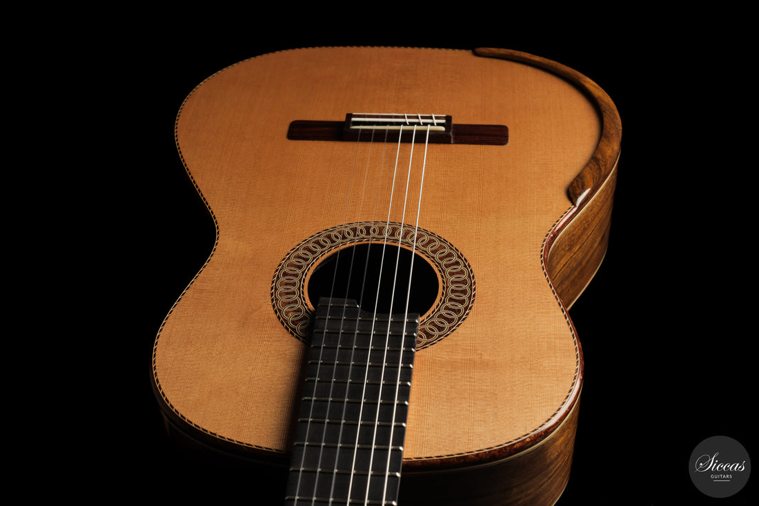 Ein zentrales Element der Konstruktion ist der gemeinsam mit Charalampos Koumridis entwickelte Innenrahmen. Nach Angaben des Gitarrenbauers dient dieses patentgeschützte System dazu, Projektion, Sustain und die Tieftonansprache zu stärken. In der Praxis zeigt sich ein Instrument mit schneller Ansprache, klarer Tragfähigkeit und stabiler Klangkontrolle auch bei differenzierter Dynamik. Die Gitarre erlaubt ein breites dynamisches Spektrum, ohne an Klarheit zu verlieren, und eignet sich damit sowohl für das Konzertrepertoire als auch für moderne Spielweisen, die eine direkte Ansprache und präzise Kontrolle erfordern.