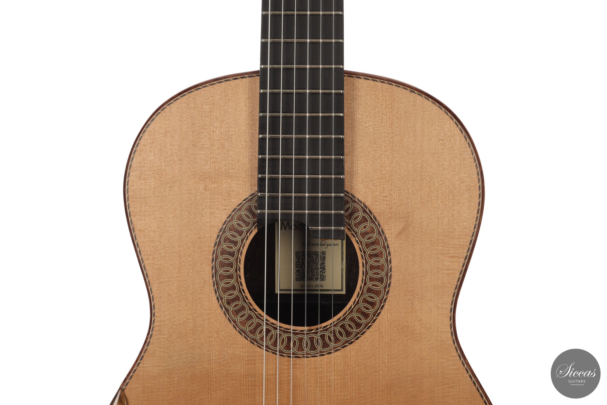 Diese Gitarre aus dem Jahr 2026, gebaut als Nr. 78, zeigt den aktuellen Ansatz von Andreas Madimenos im Umgang mit dem Lattice-Prinzip, dessen Gestaltung an die australische Schule erinnert. Die Zederndecke wird mit doppelt ausgeführten Ovangkol-Böden und -Zargen kombiniert, was eine tragfähige und weit gefächerte Klangentwicklung unterstützt. Die Bässe erscheinen tief und präsent, während sich ein reiches Obertonspektrum entfaltet. Die Diskantsaiten tragen klar und behalten zugleich Substanz, wodurch sich ein ausgeglichenes Verhältnis über alle Register ergibt.