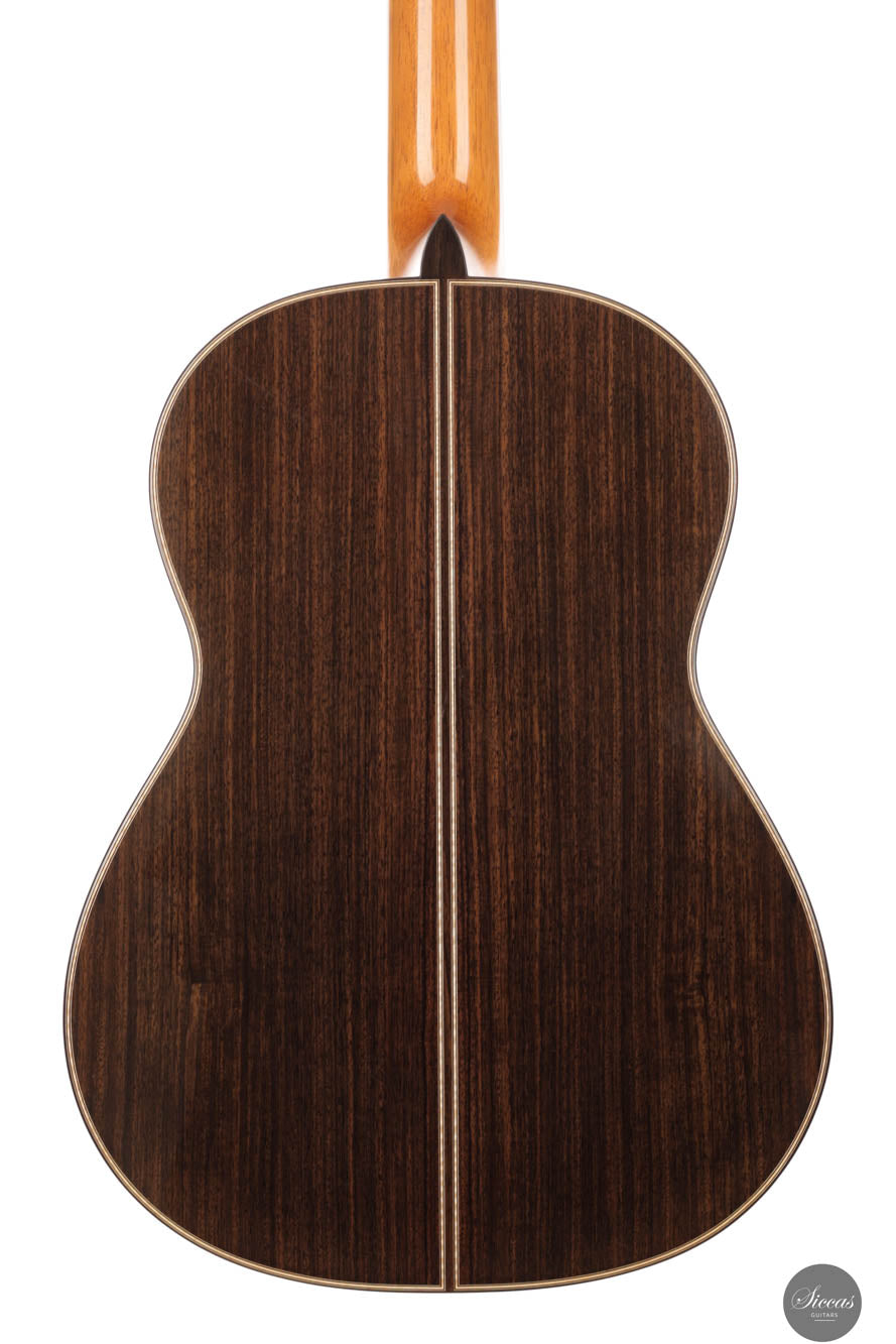 Die Angelo Vailati 2024 ist eine außergewöhnliche Konzertgitarre im Granada-Stil, die vom Gitarrenbauer mit größter Sorgfalt handgefertigt wurde und mit originellen Designelementen sowohl visuell als auch akustisch beeindruckt. Die Decke besteht aus der feinsten Schweizer Fichte, während Rücken und Zargen aus indischem Palisander gefertigt sind, was nicht nur die Ästhetik, sondern auch die Klangqualität des Modells erheblich steigert. Akustisch bietet die Gitarre eine markante Klarheit, indem sie straffe, gut definierte Bässe mit süßen, melodischen Höhen kombiniert, die harmonisch miteinander verschmelzen und mit feinen klanglichen Nuancen resonieren, was sie äußerst ausdrucksstark und angenehm zu spielen macht. Das Ergebnis ist ein Zeugnis hervorragender Handwerkskunst. Ihre atemberaubende visuelle Anziehungskraft und das dynamische Klangspektrum machen sie zur idealen Wahl für Konzertmusiker und anspruchsvolle Enthusiasten gleichermaßen.